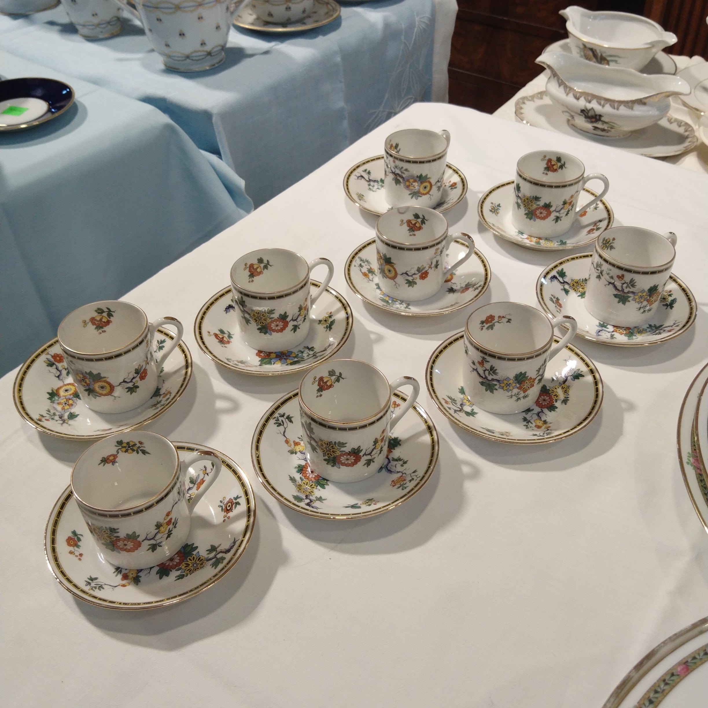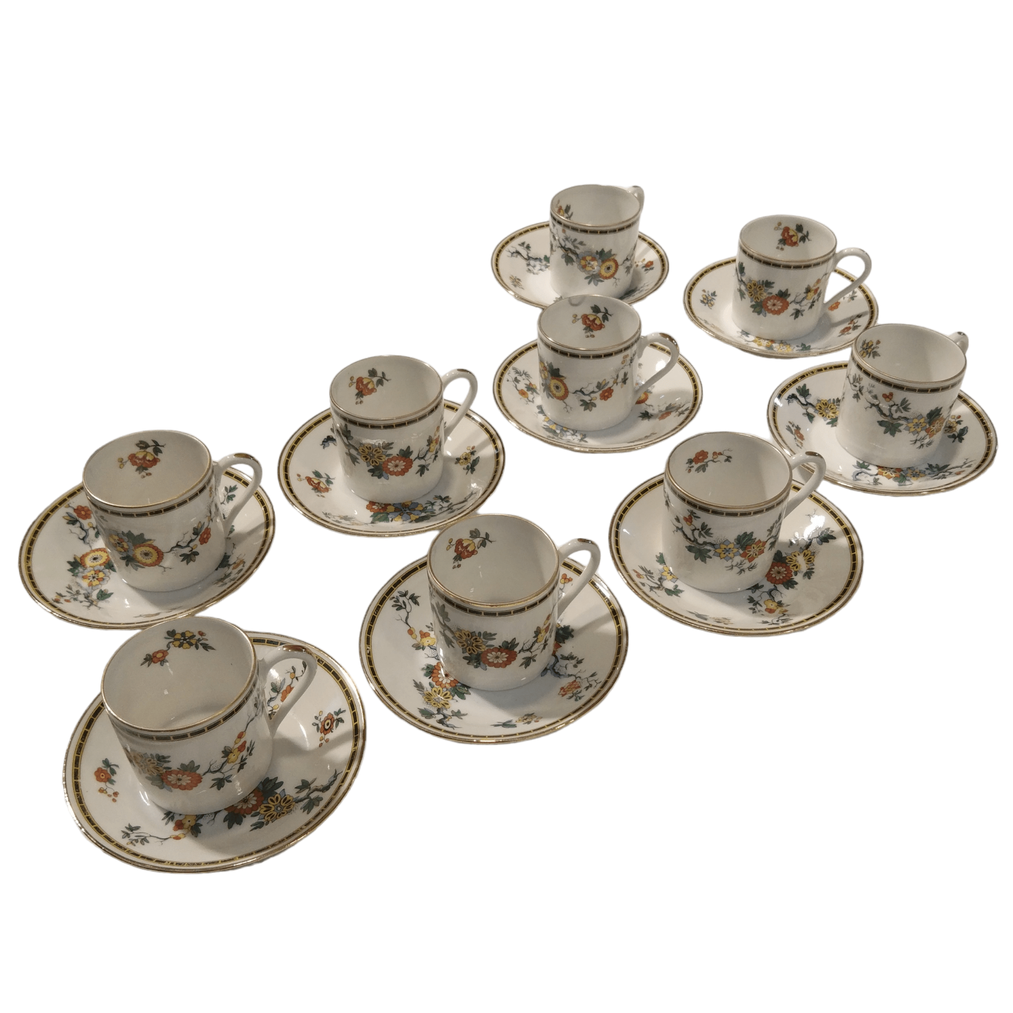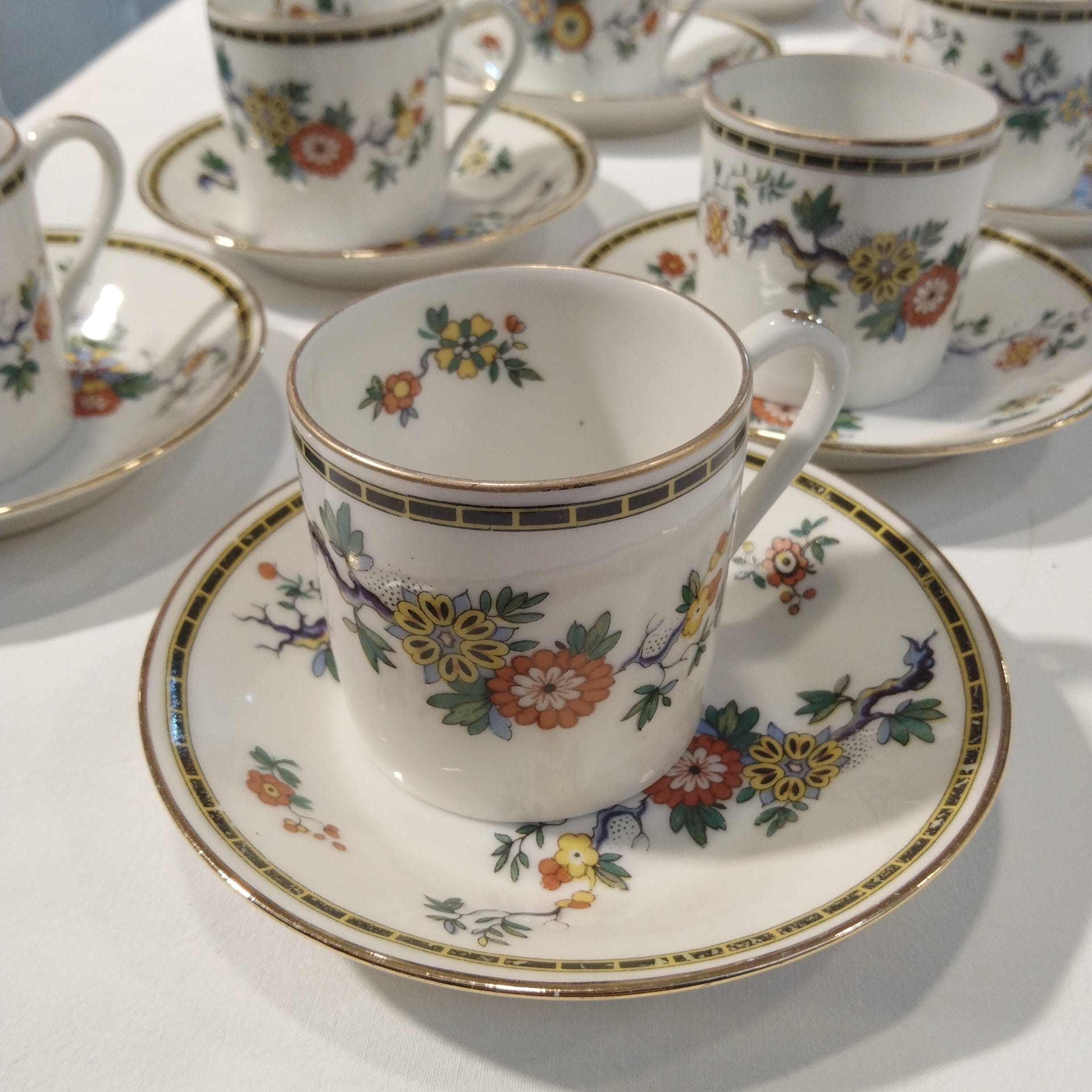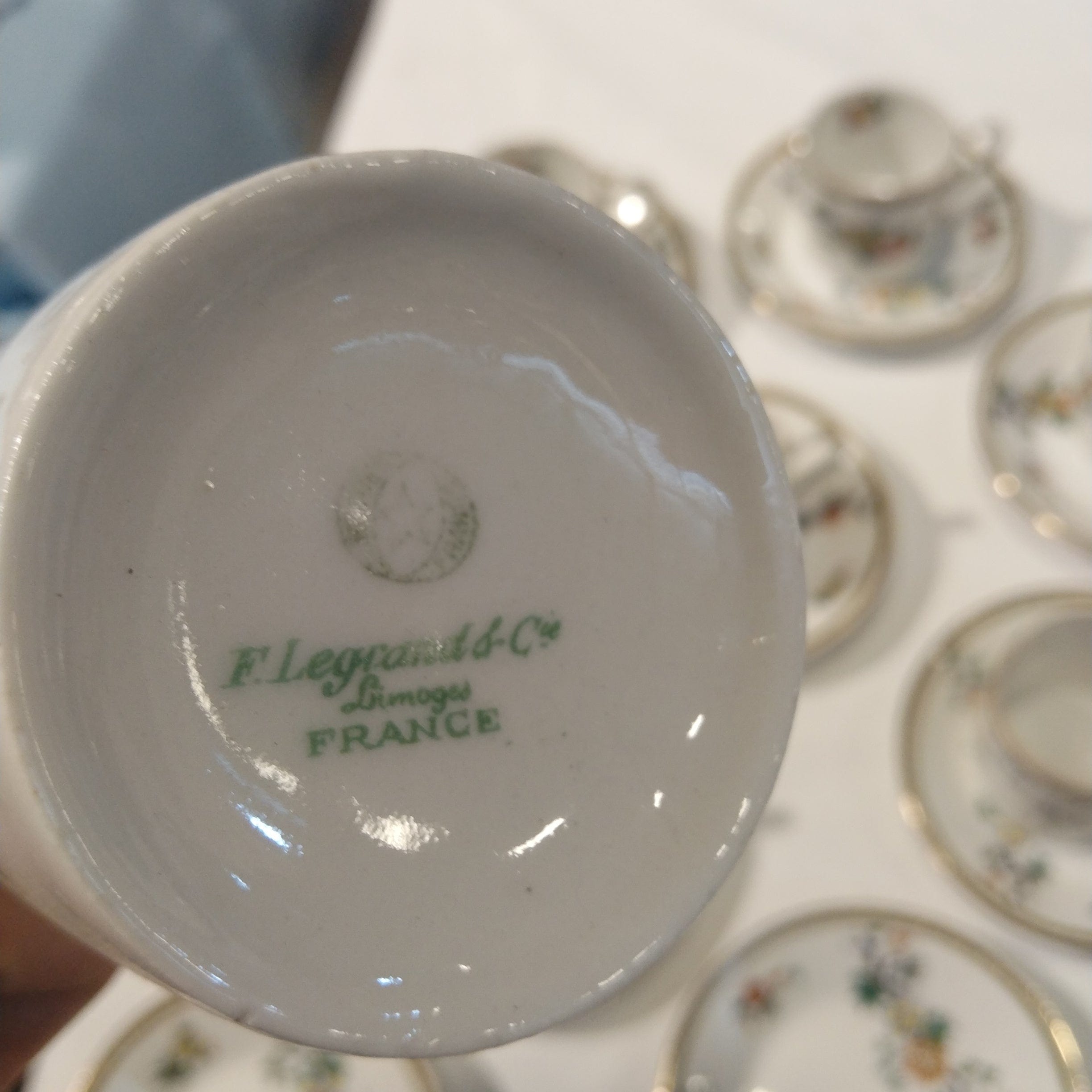 Bello juego de tacitas de porcelana francesa Limoges de café para 9 personas, con un delicado dibujo de ramas, flores y un elegante detalle negro con dorado en sus bordes.