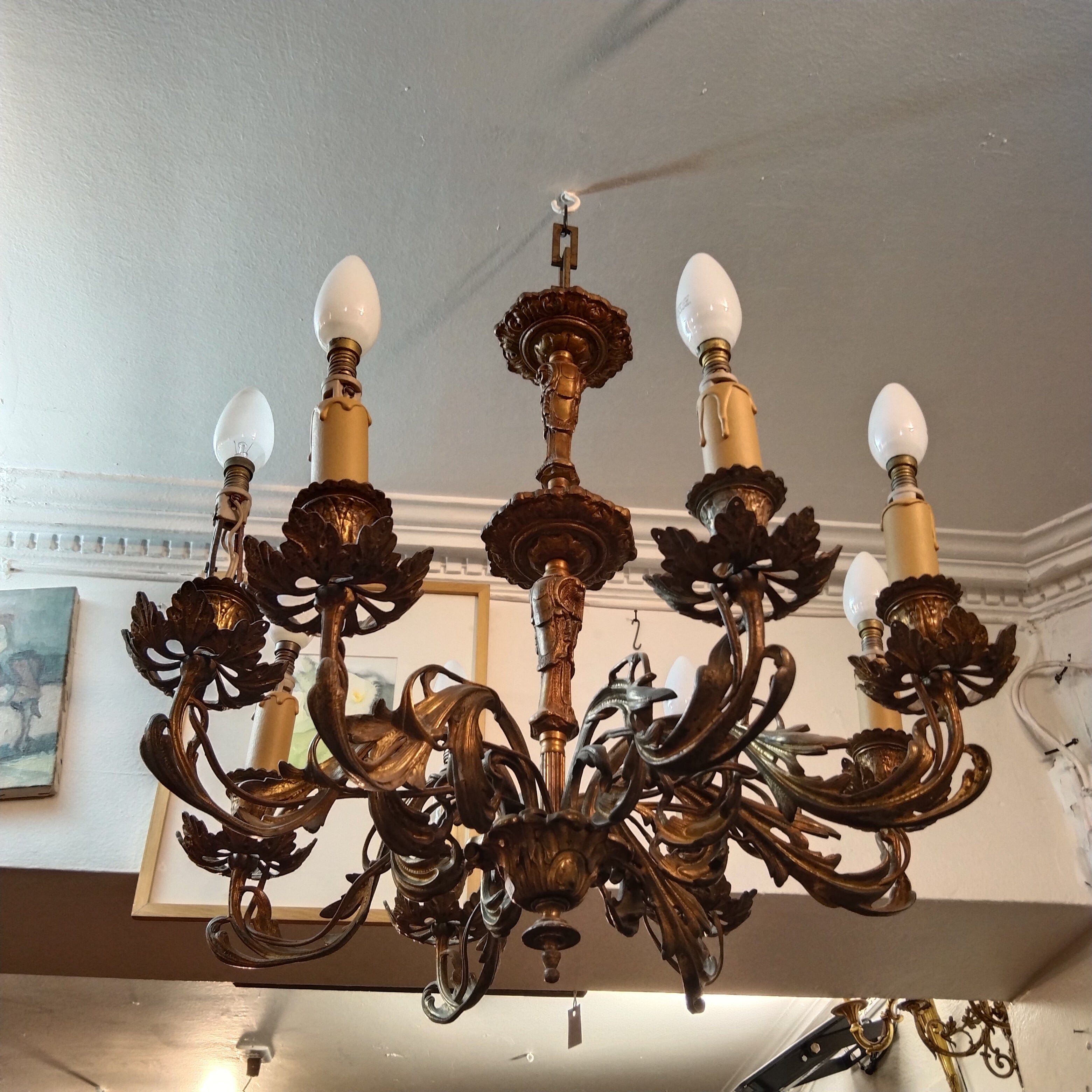 Lámpara de techo francesa antigua. Con estructura de bronce dorado y llamativos diseños curvos. La pieza tiene 8 luces reacondicionadas en su sistema eléctrico.