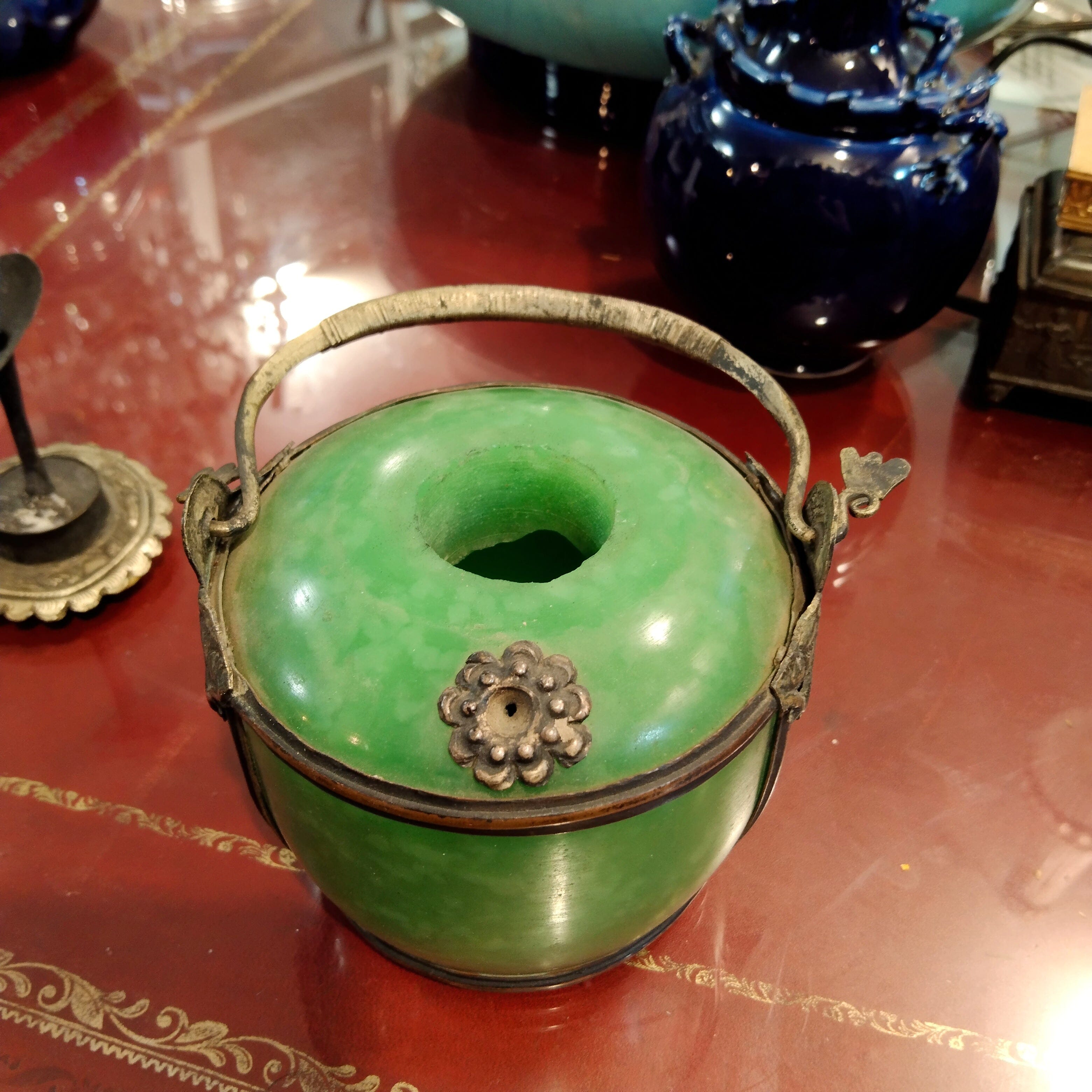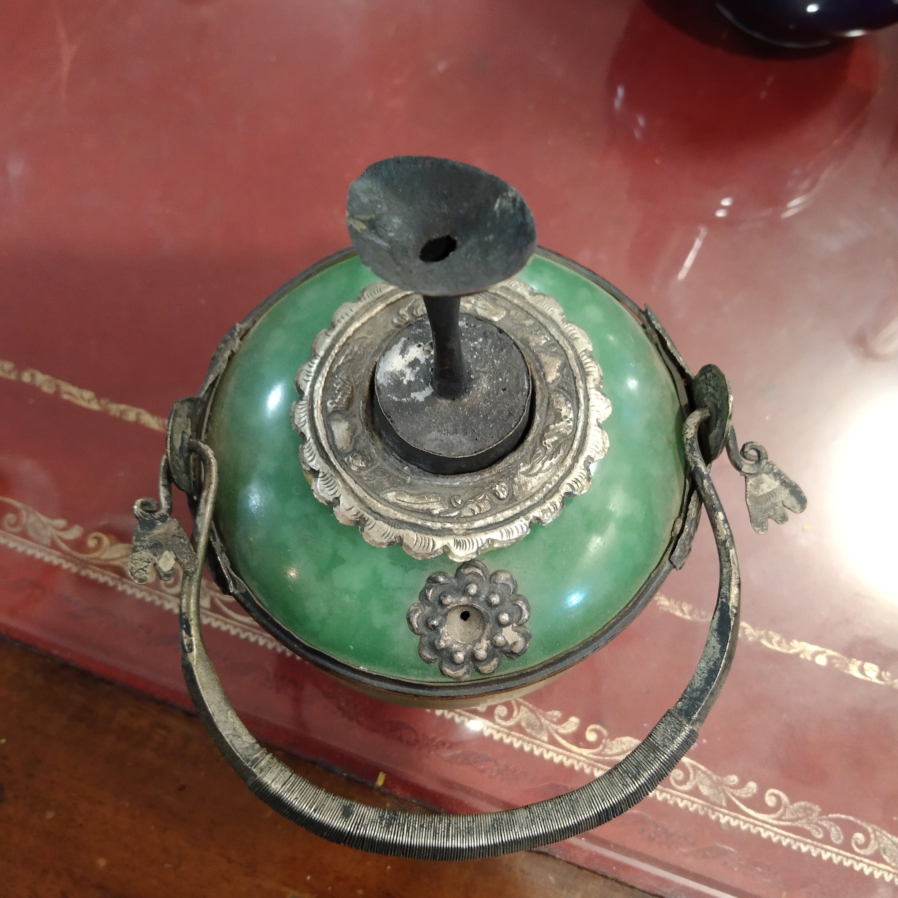 Llamativa lámpara de aceite antigua, de origen chino, hecha de resina de un verde similar al jade oscuro y decorados en cobre, con bellos diseños a mano.