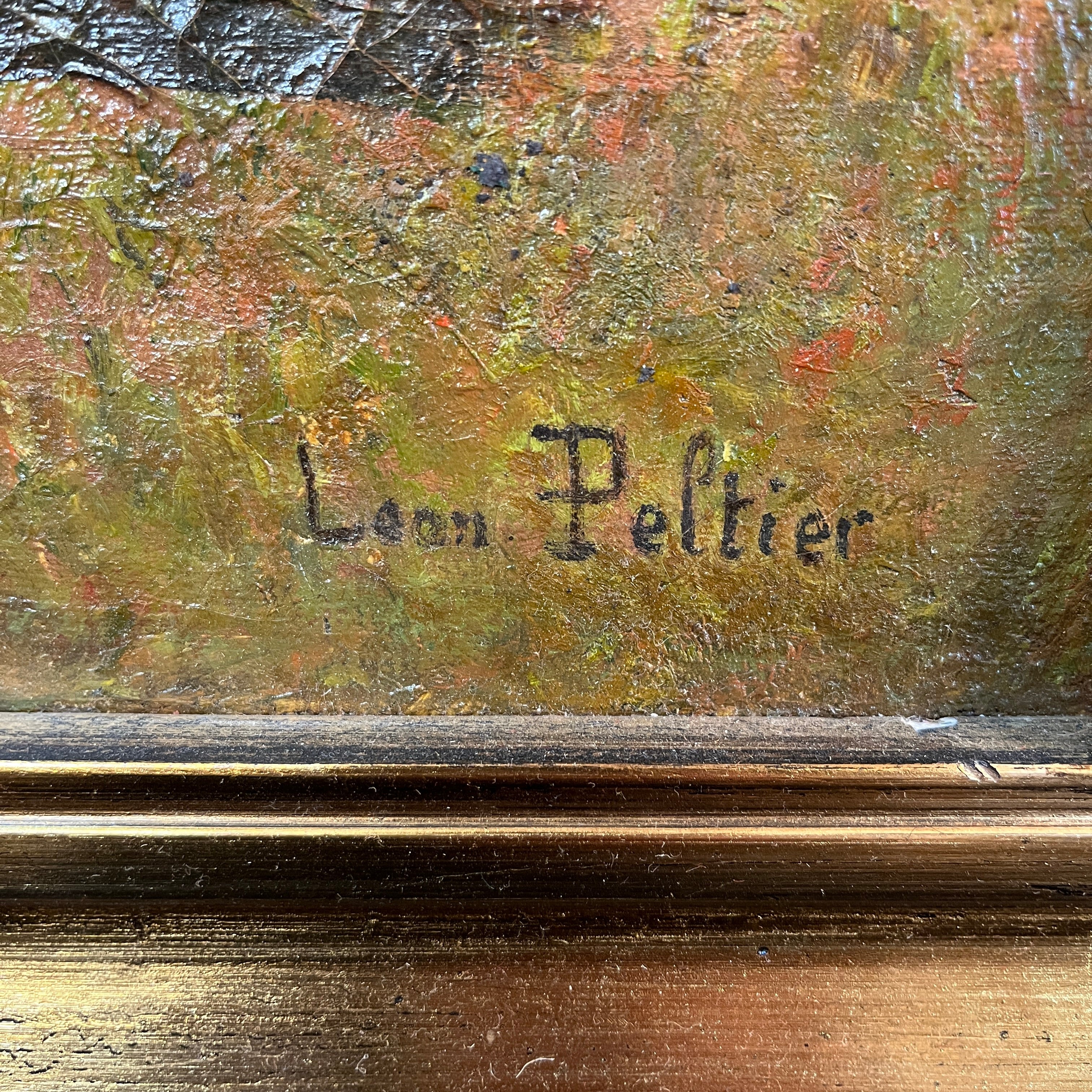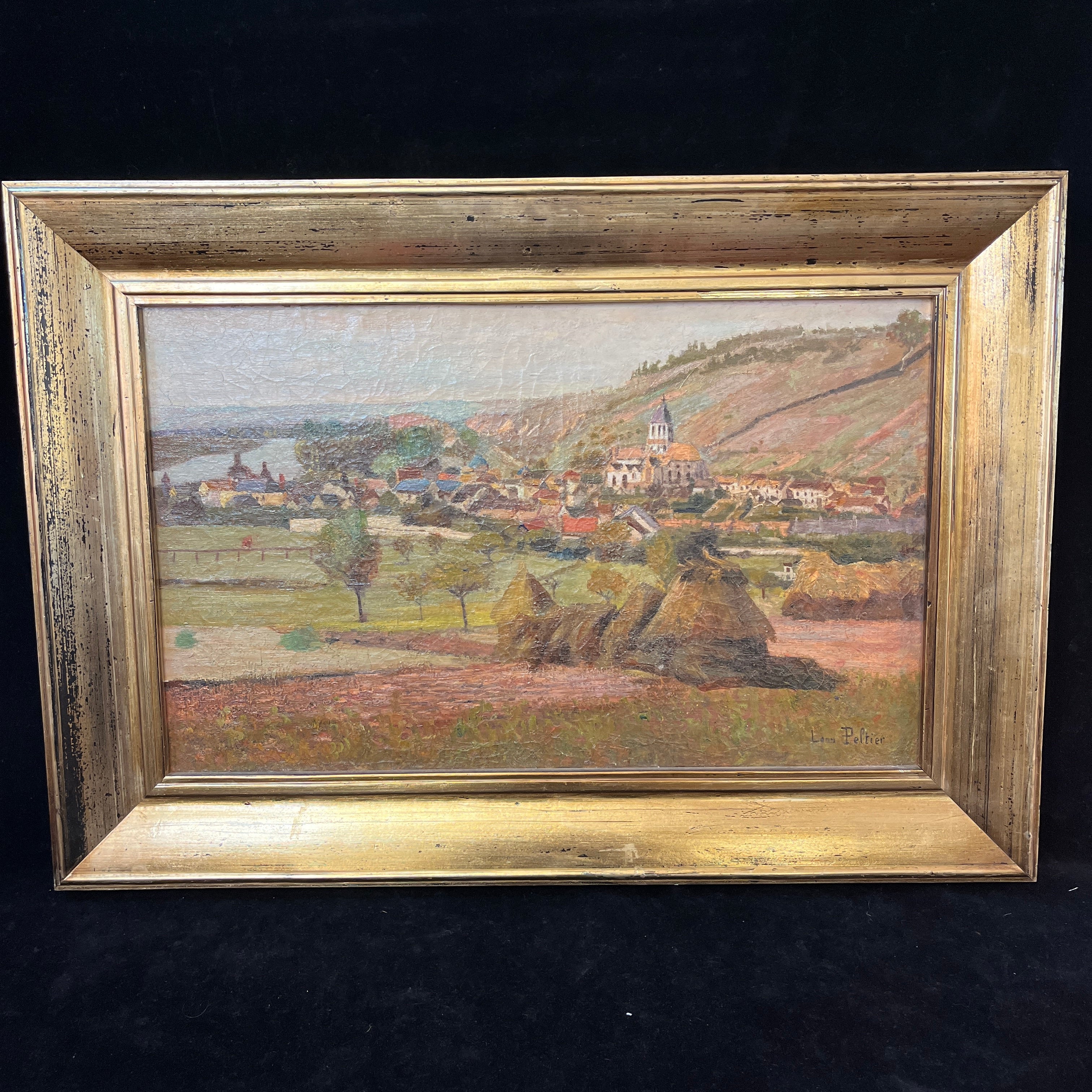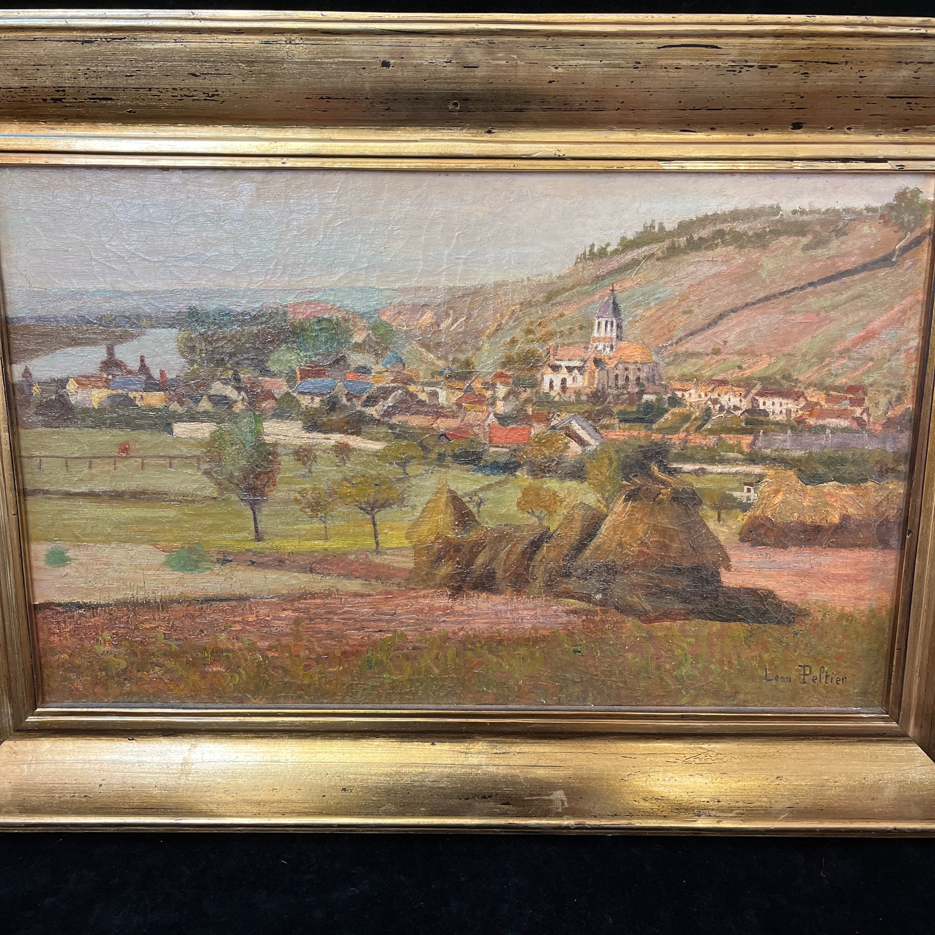 Leon Peltier(1843- 1912) Oleo 'Paisaje de pueblo al borde de un río'