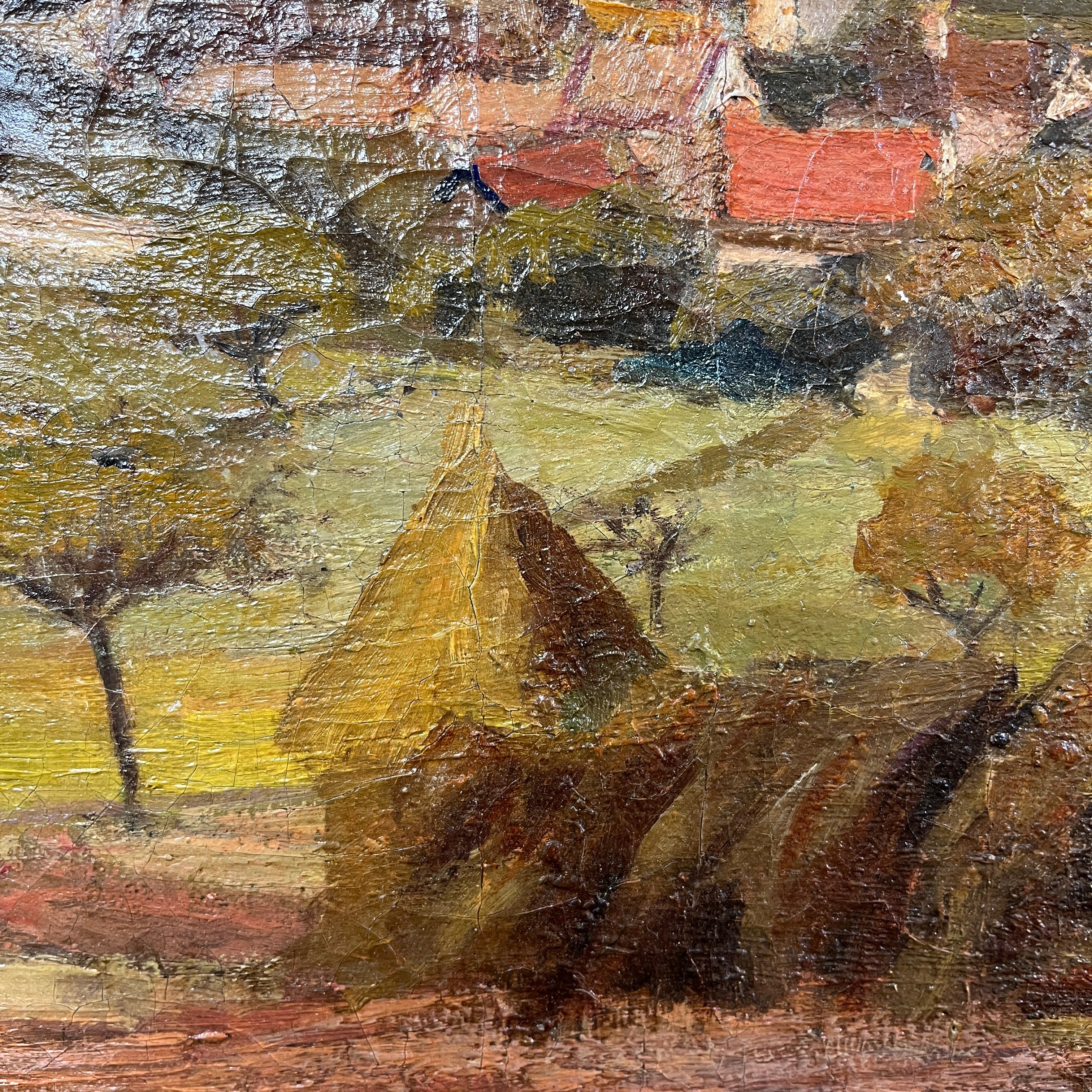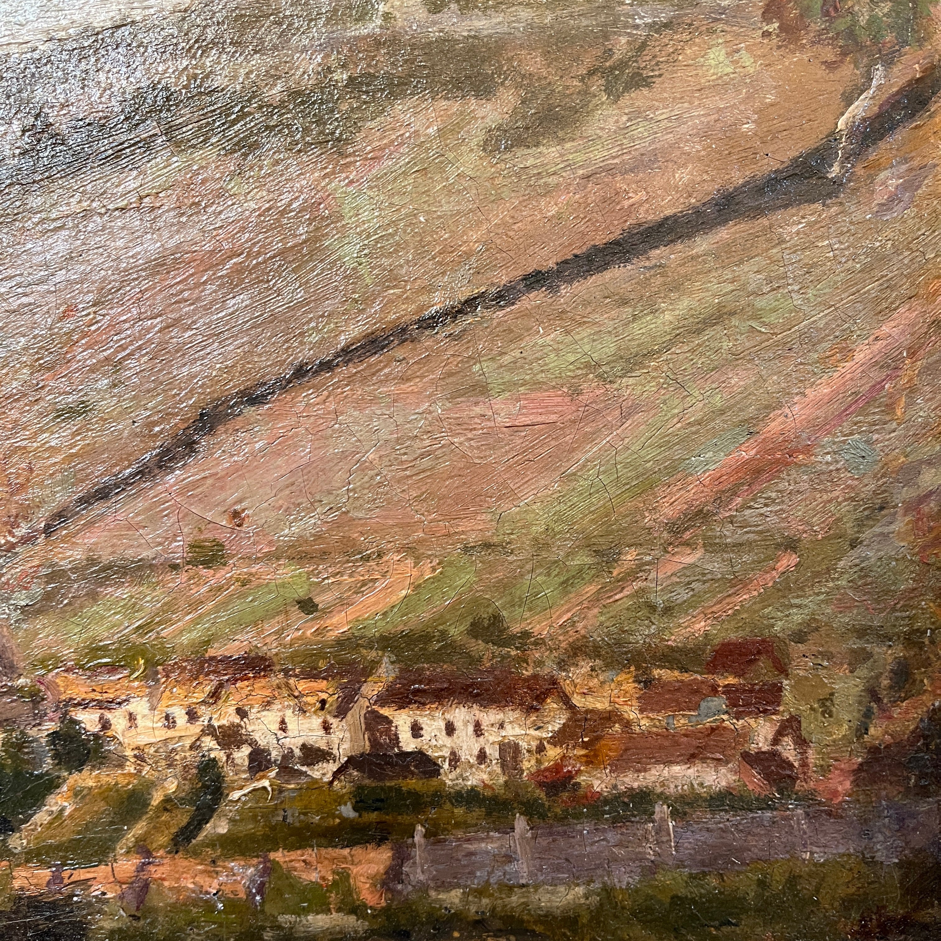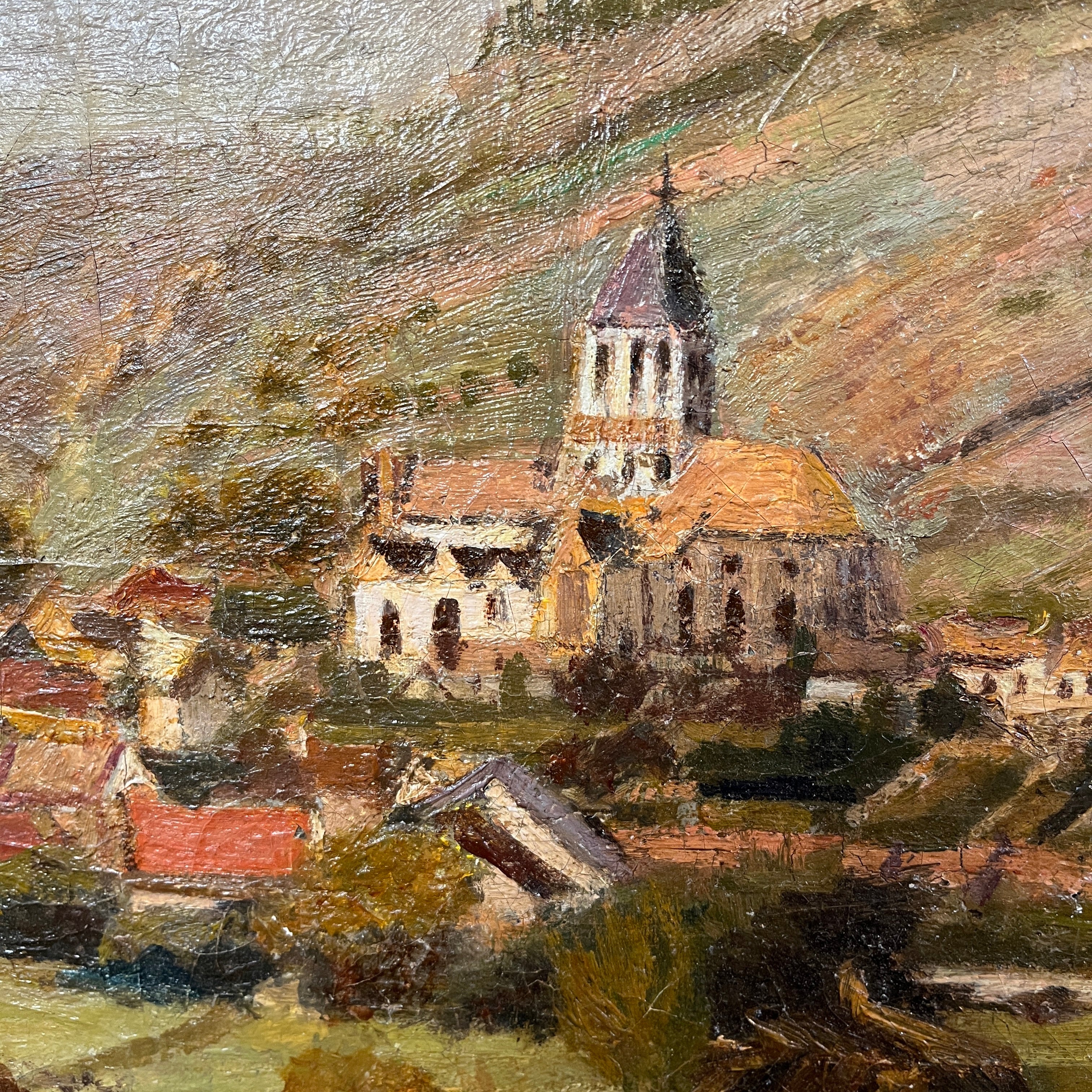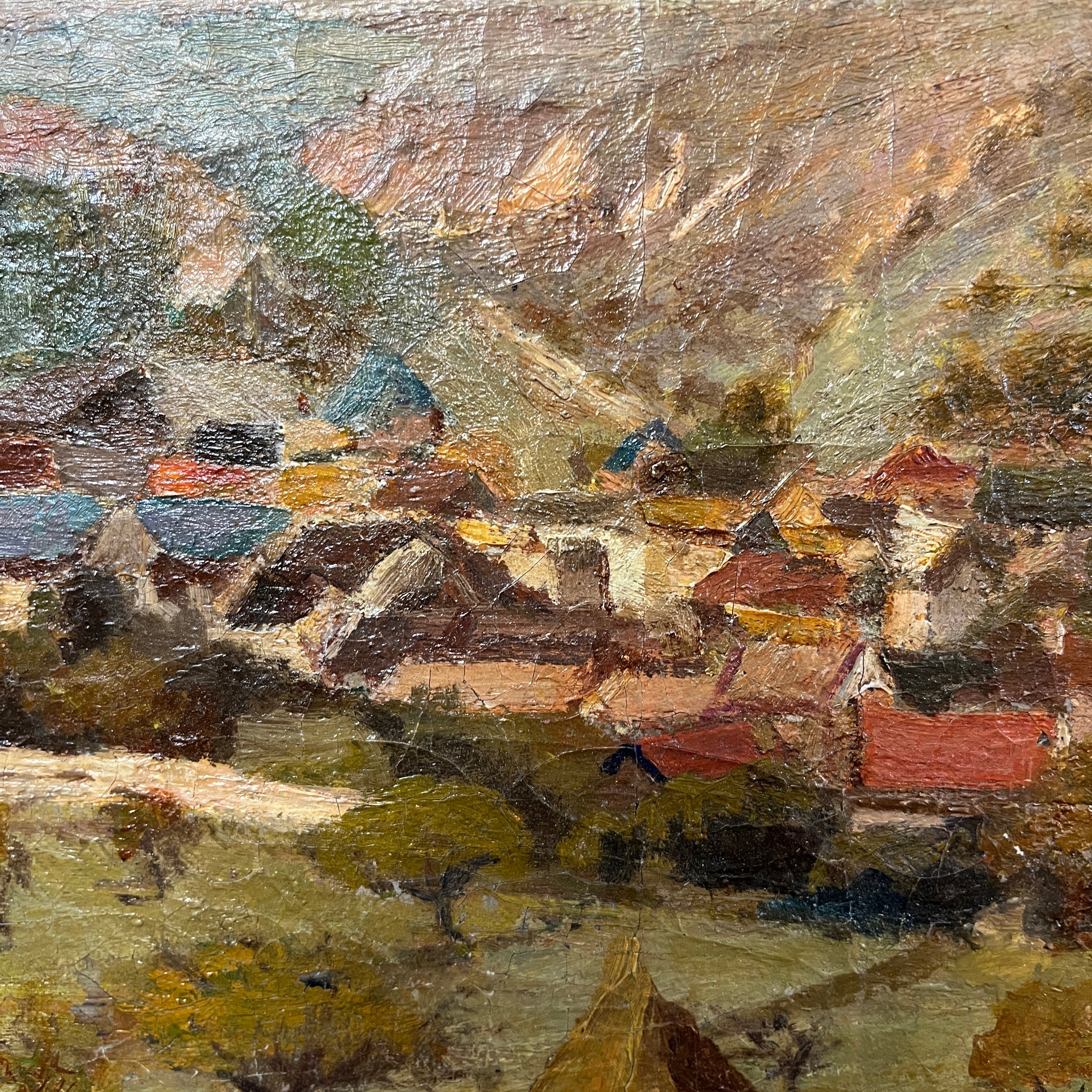 Leon Peltier(1843- 1912) Oleo 'Paisaje de pueblo al borde de un río'