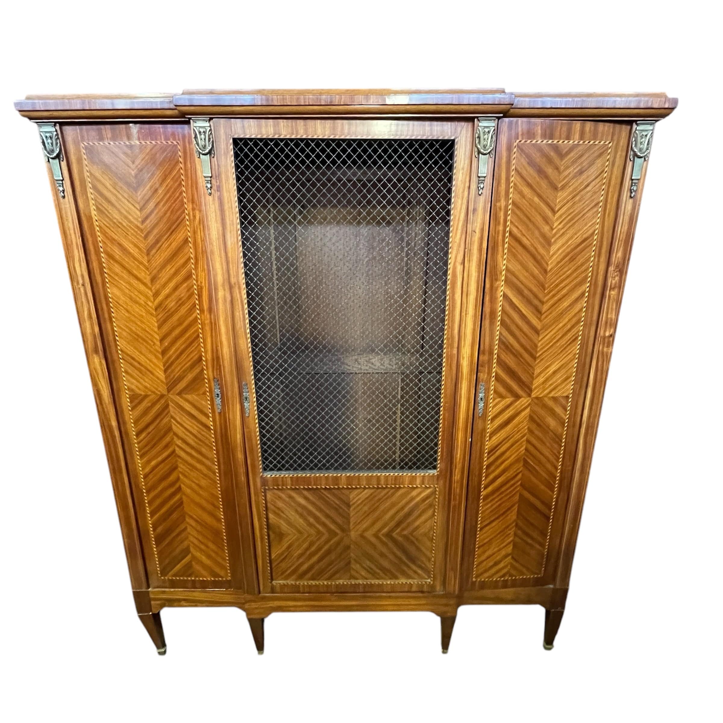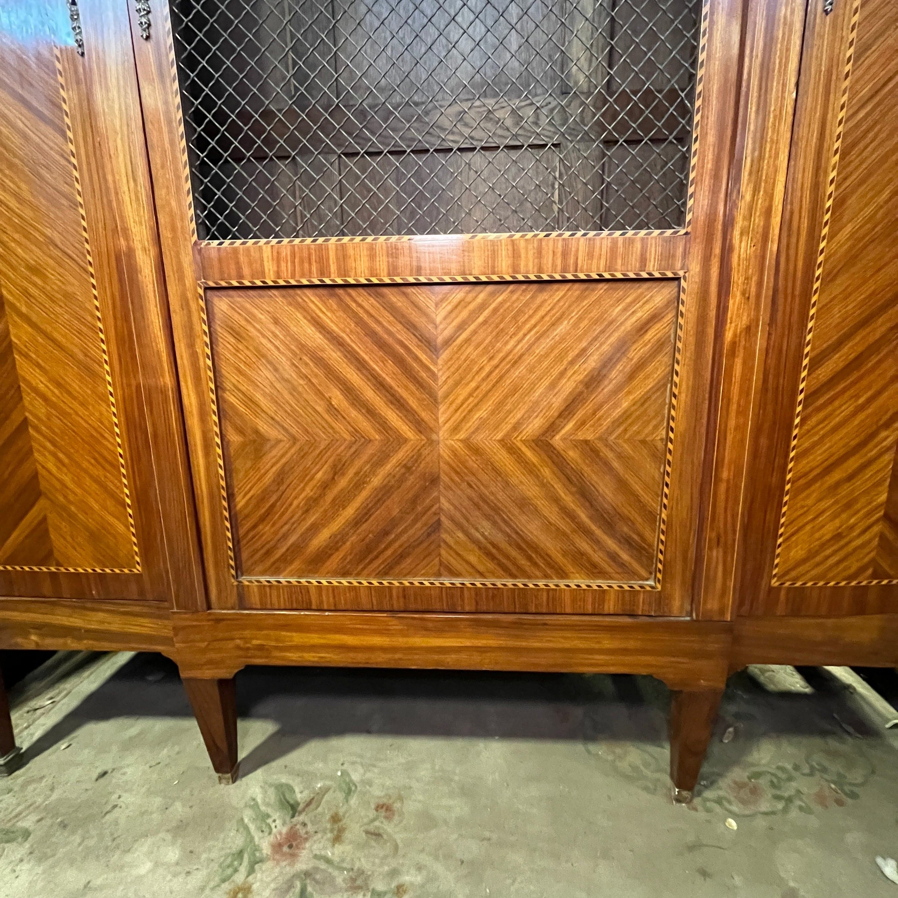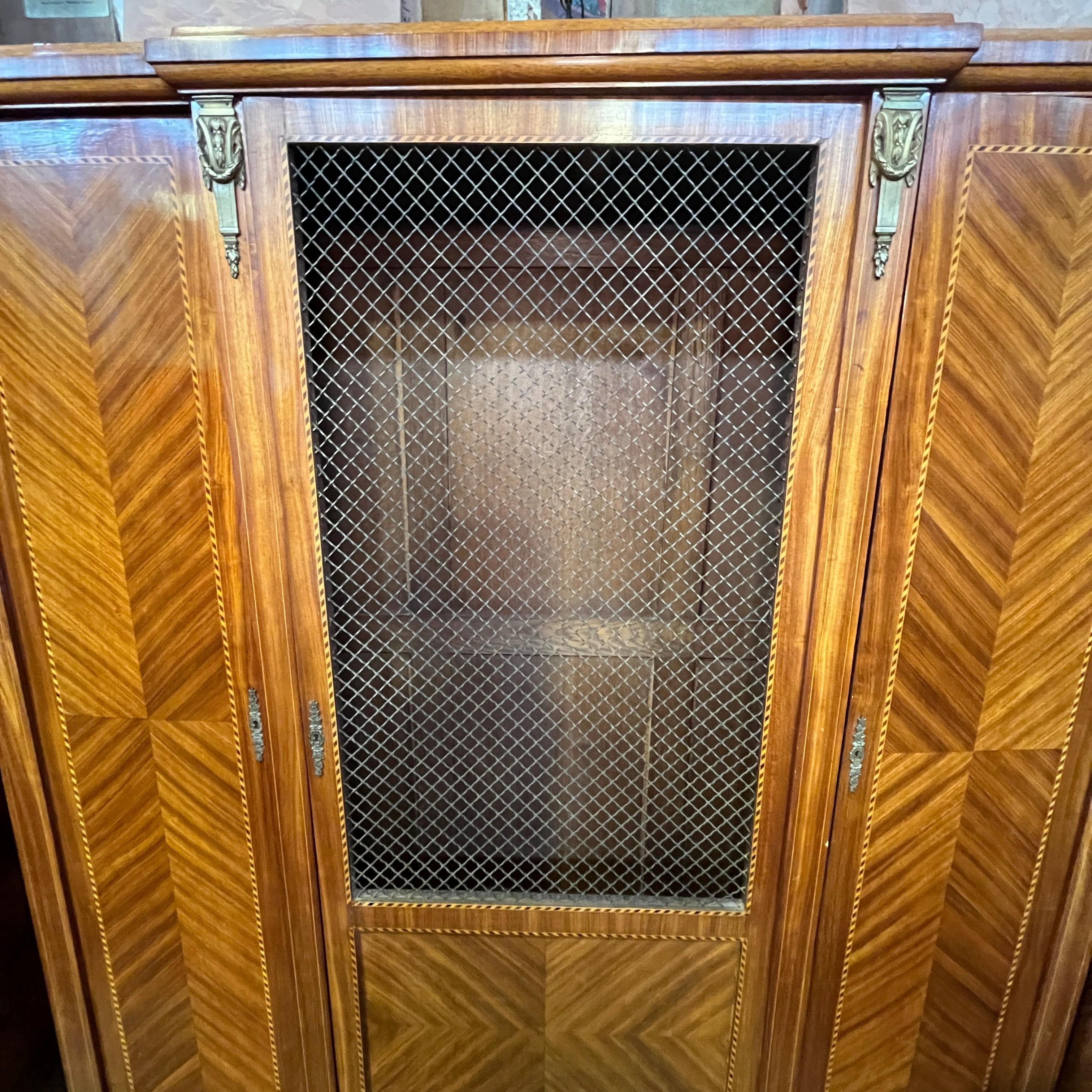 Gran librero francés en madera de palo rosa, estilo transición. Cuenta con tres puertas, la central con rejilla de bronce.