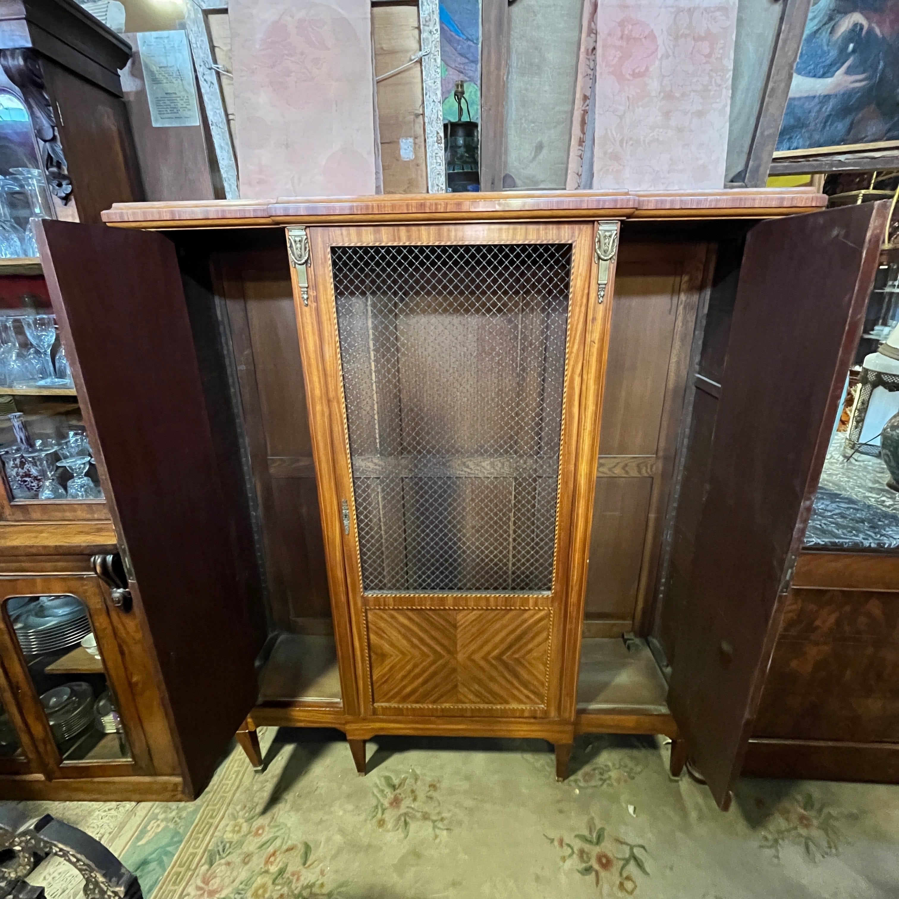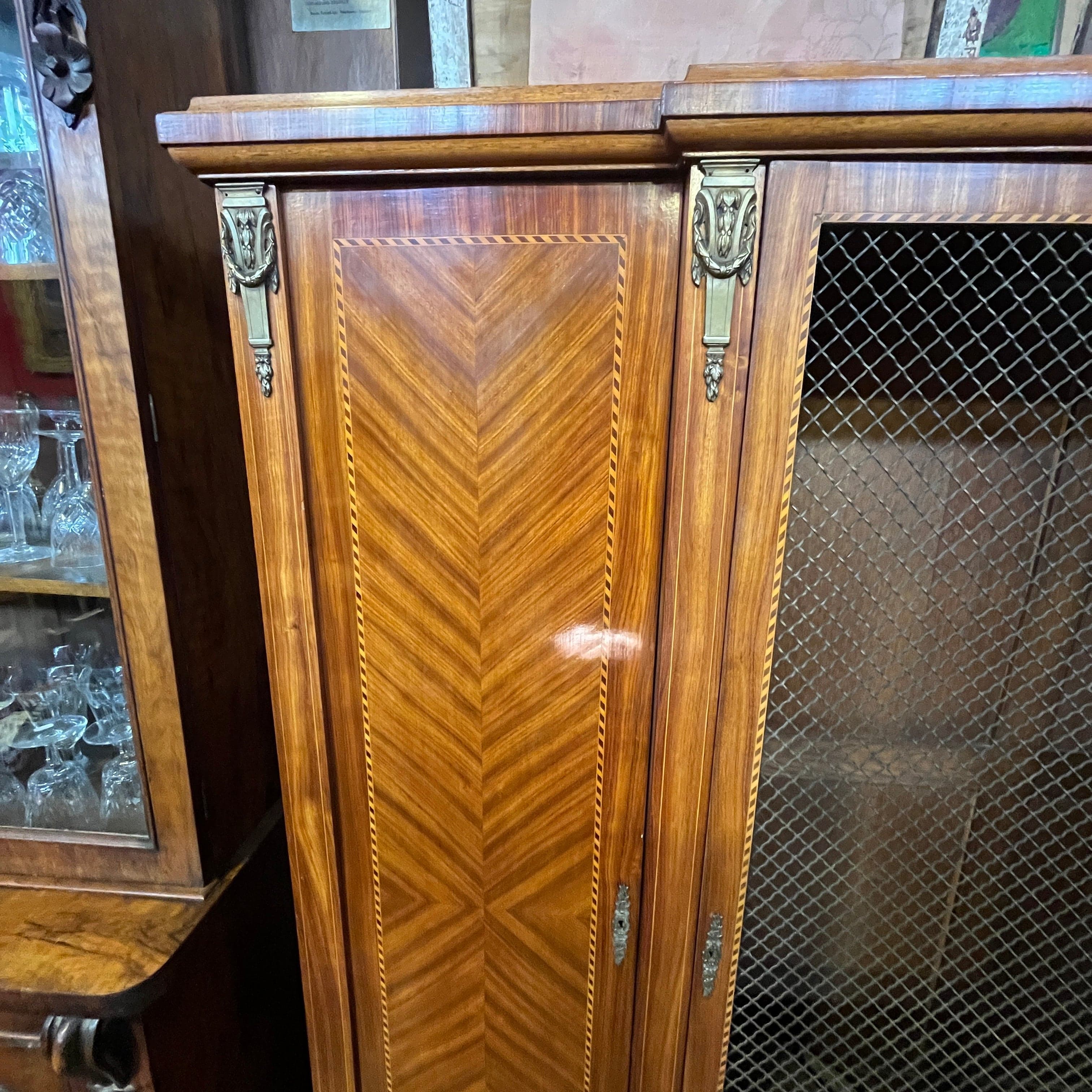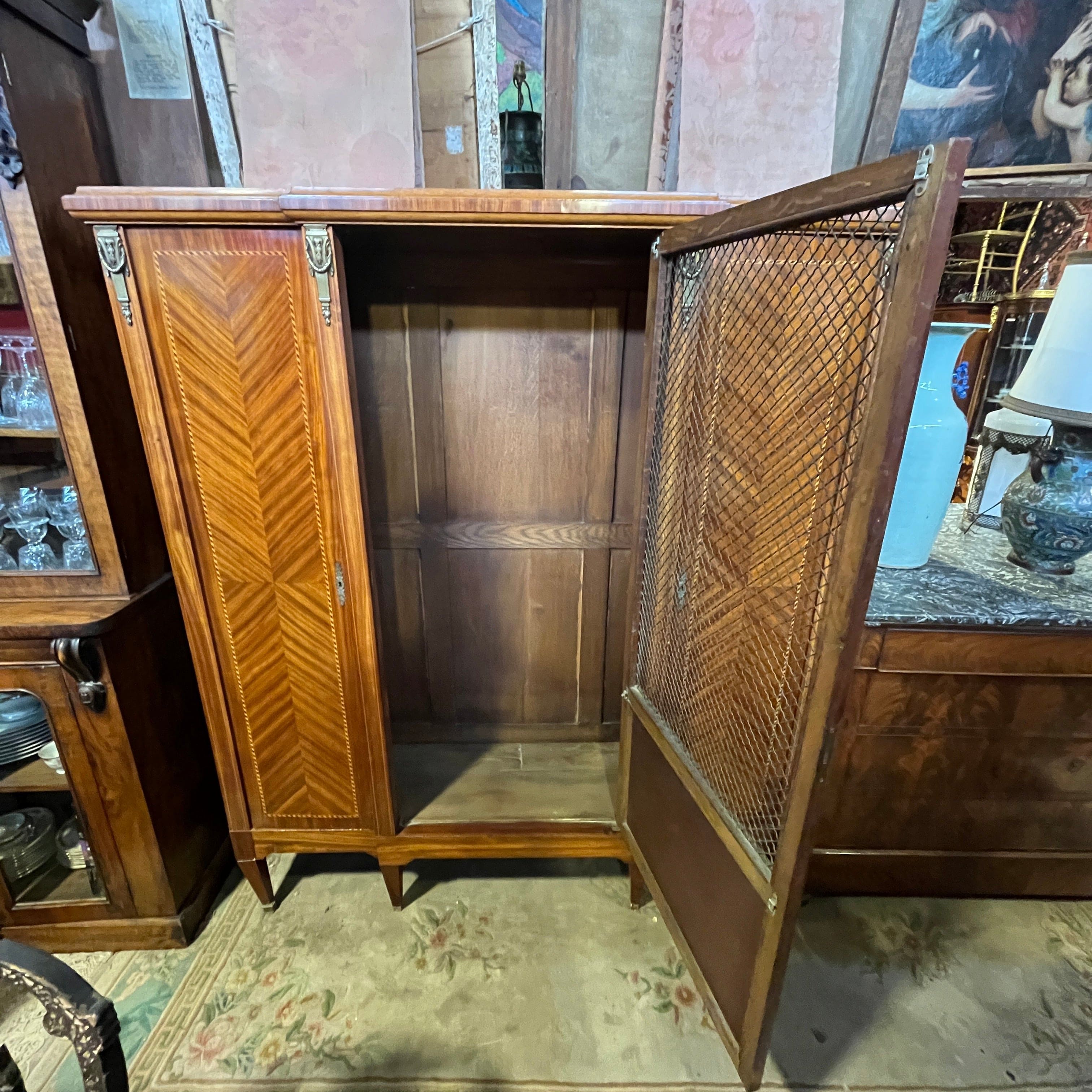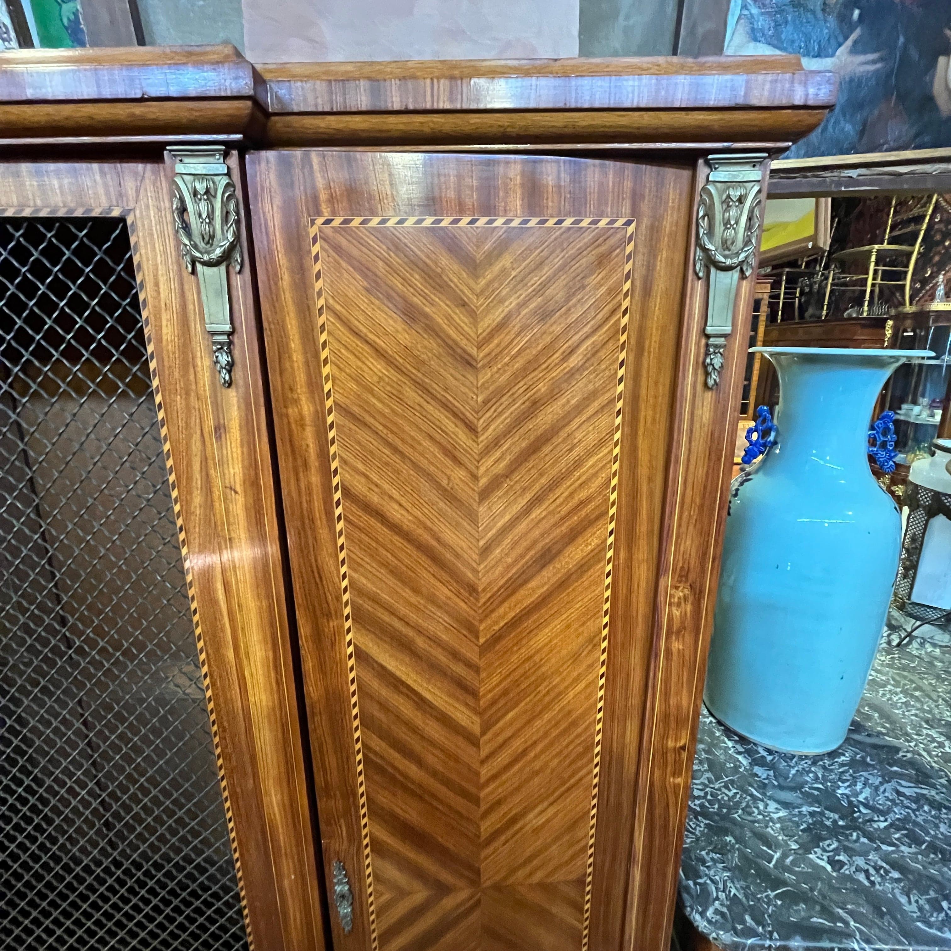 Gran librero francés en madera de palo rosa, estilo transición. Cuenta con tres puertas, la central con rejilla de bronce.