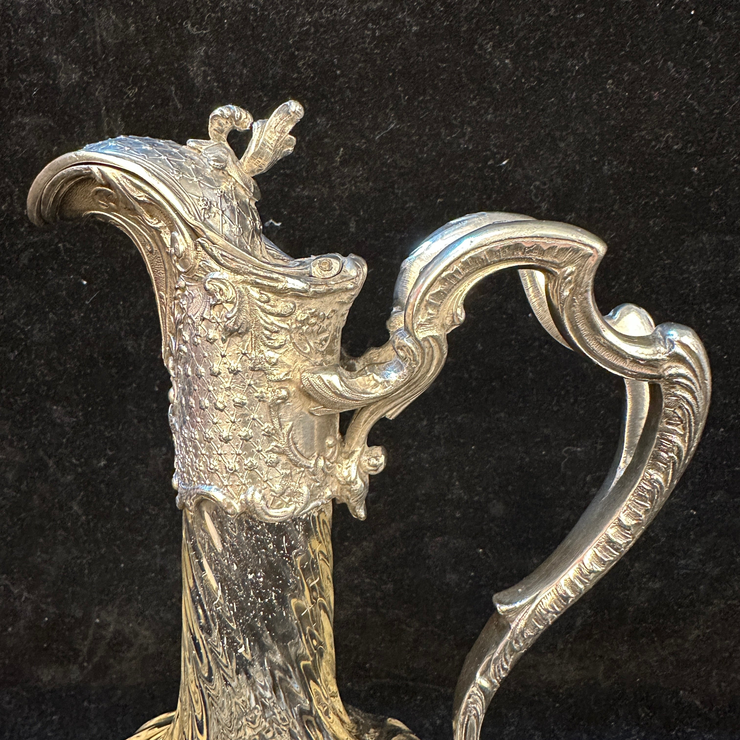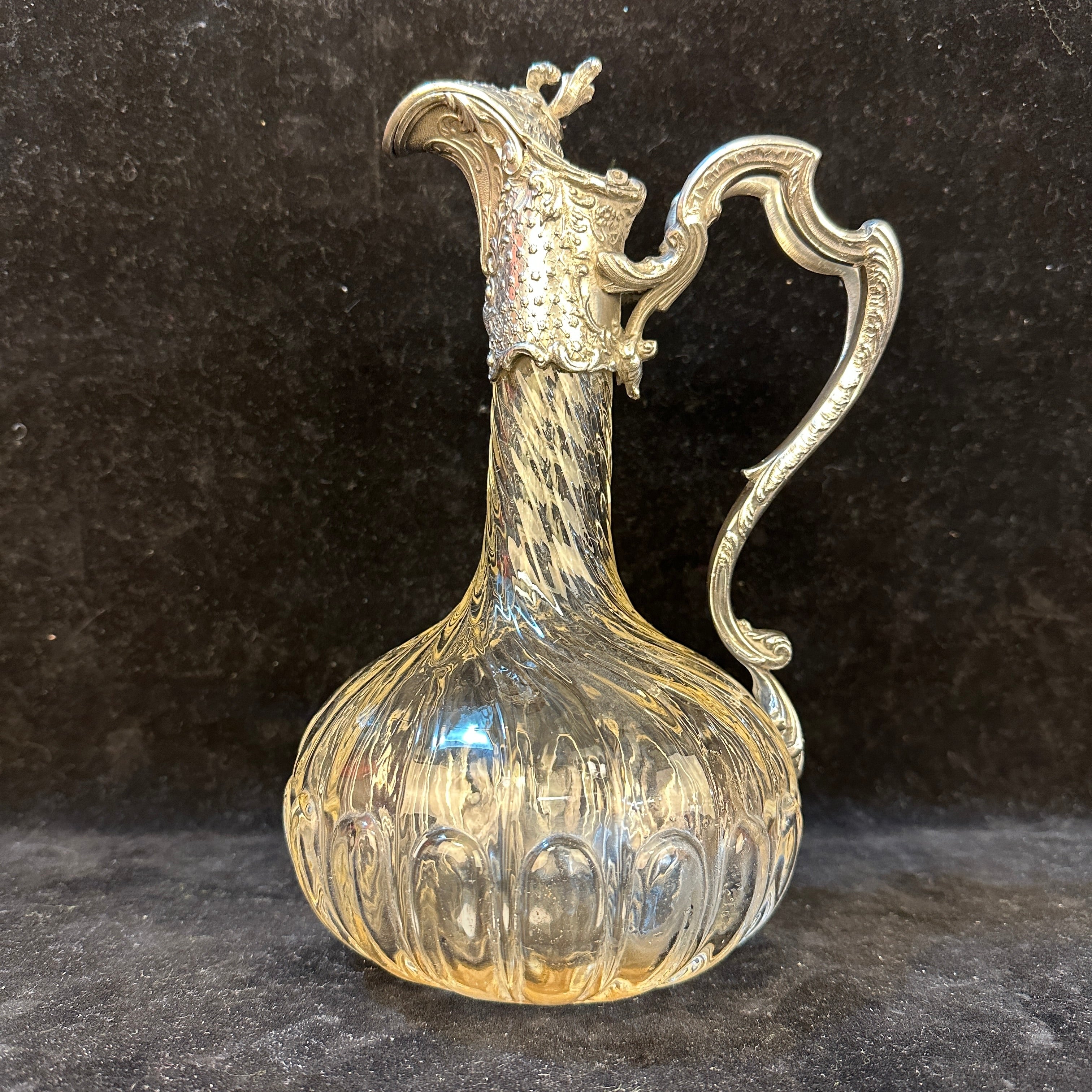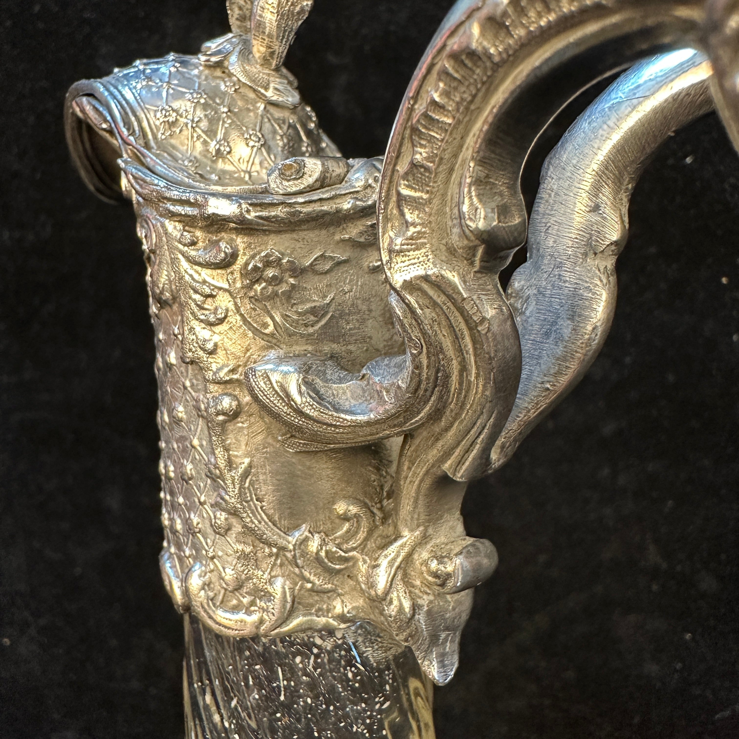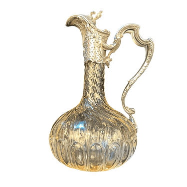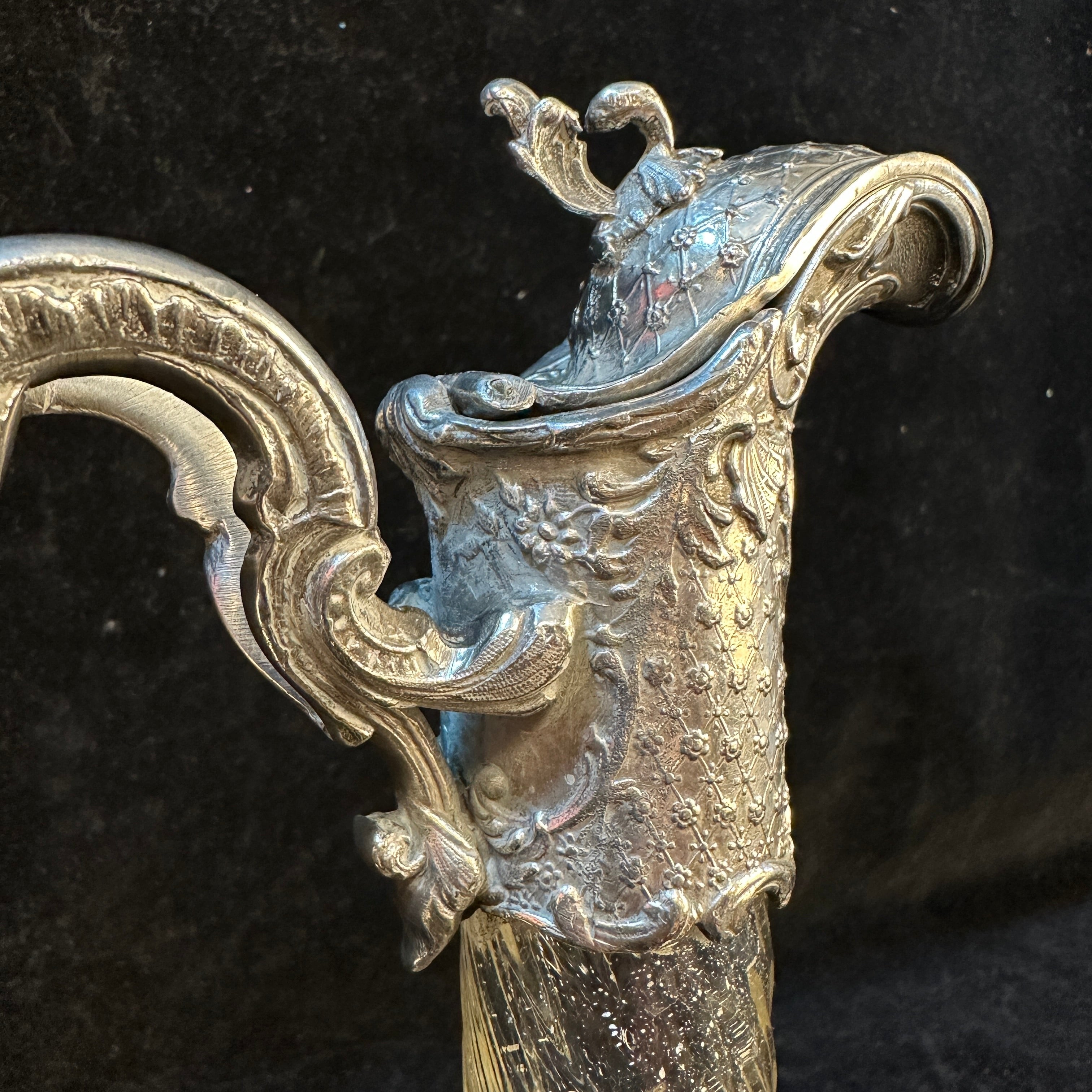 Bella jarra de vidrio para miel con cuello y mango de metal plateado tallado con diversos diseños. Principios del s. XX