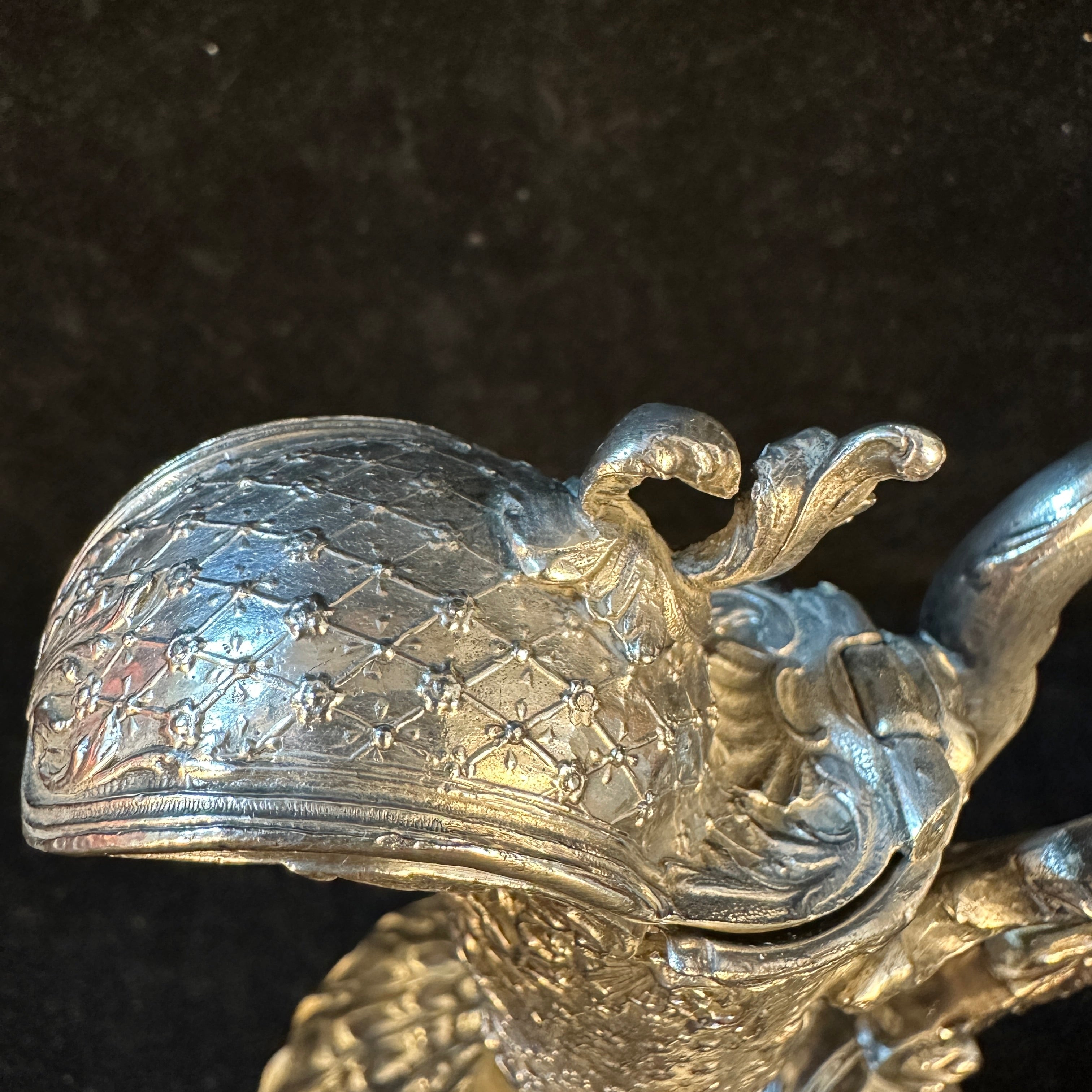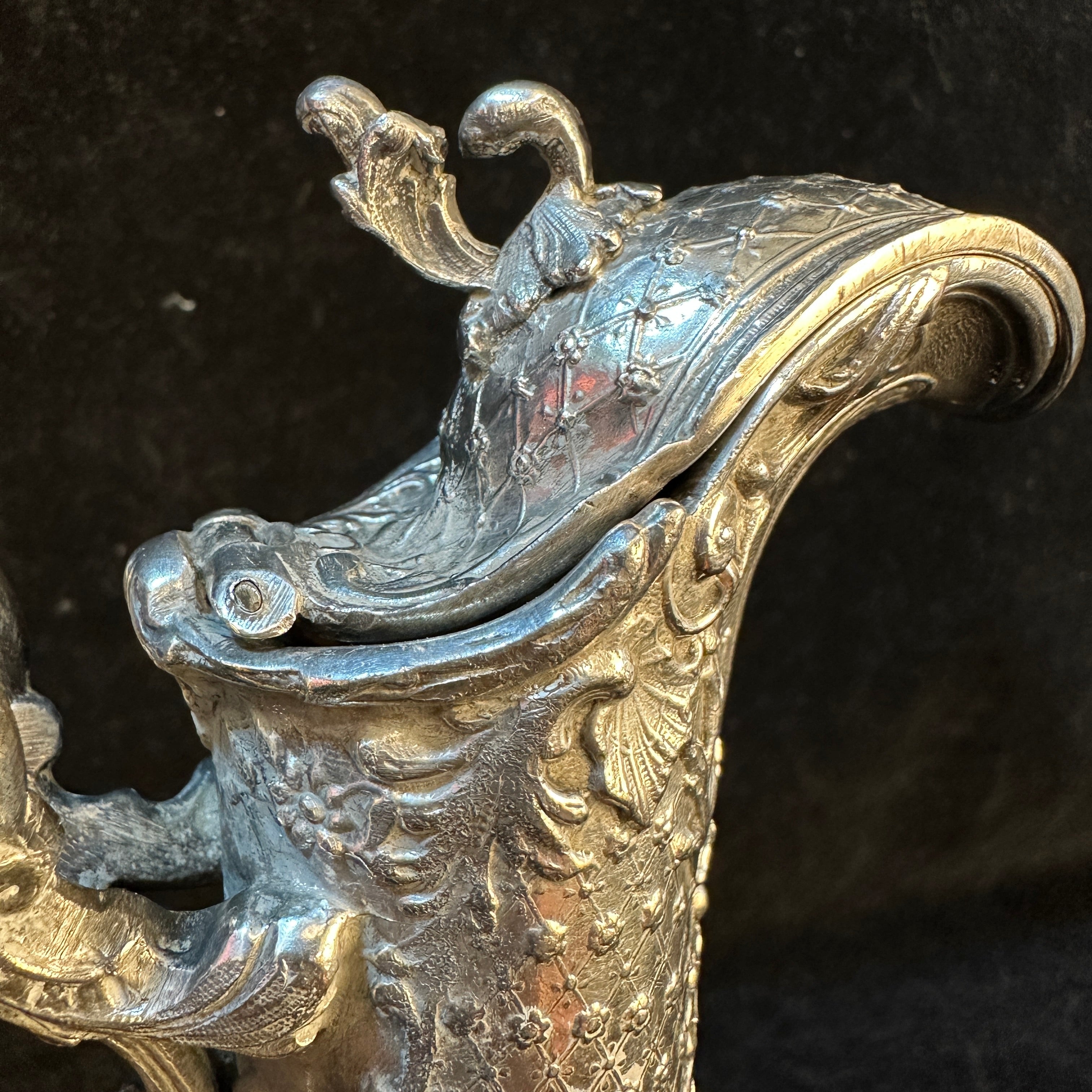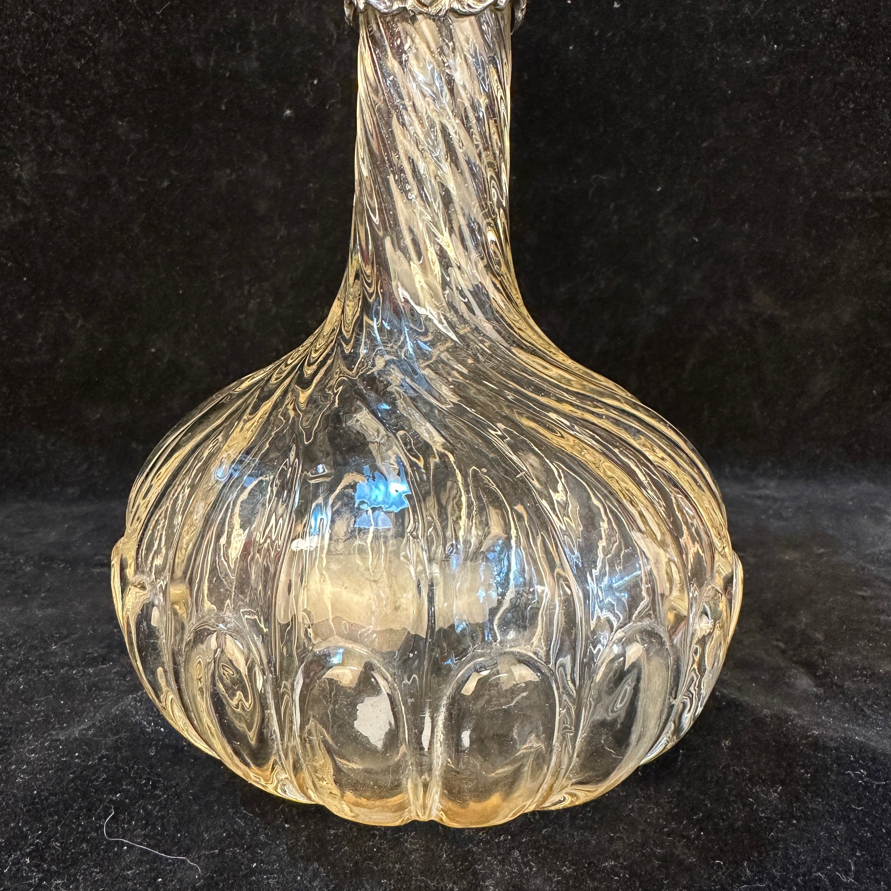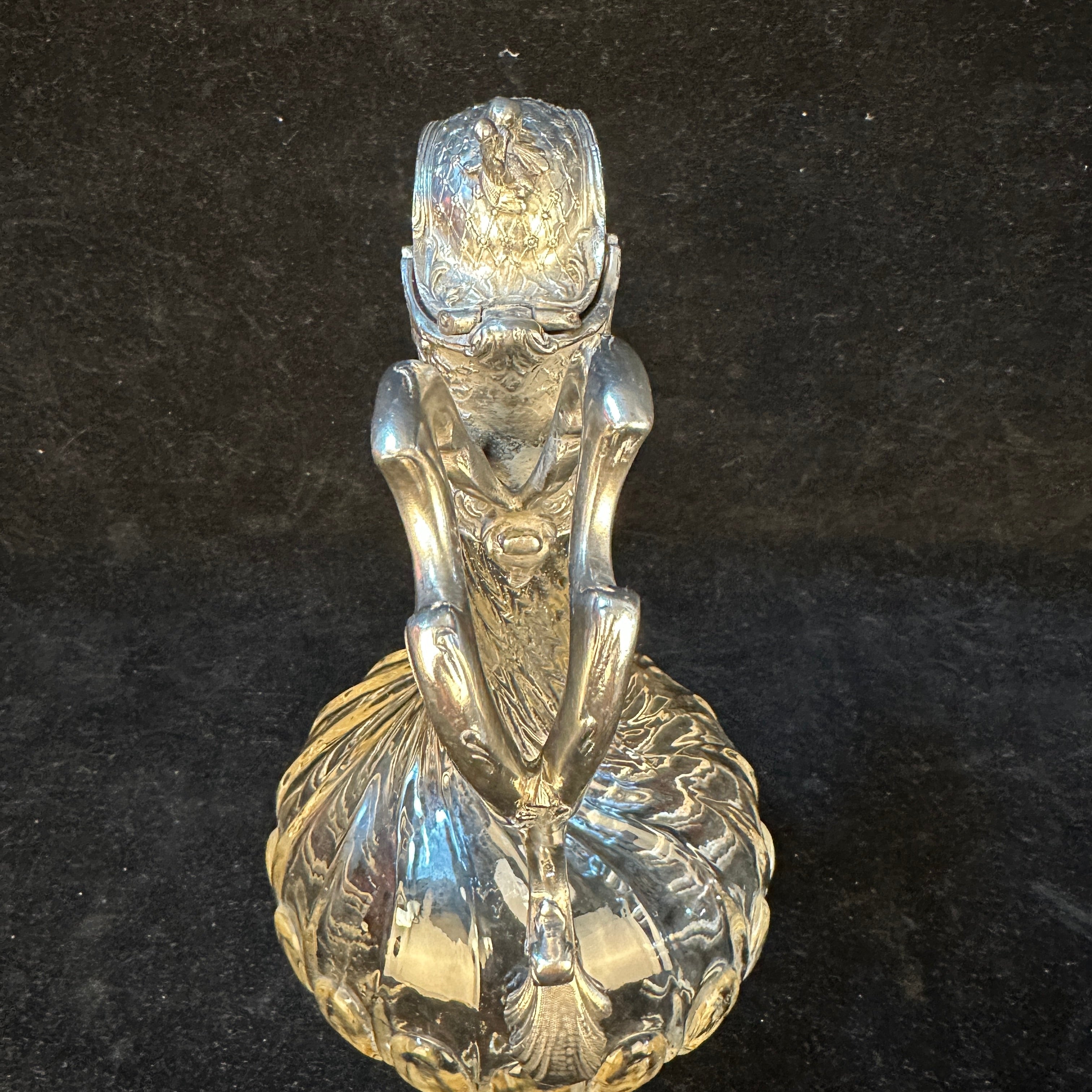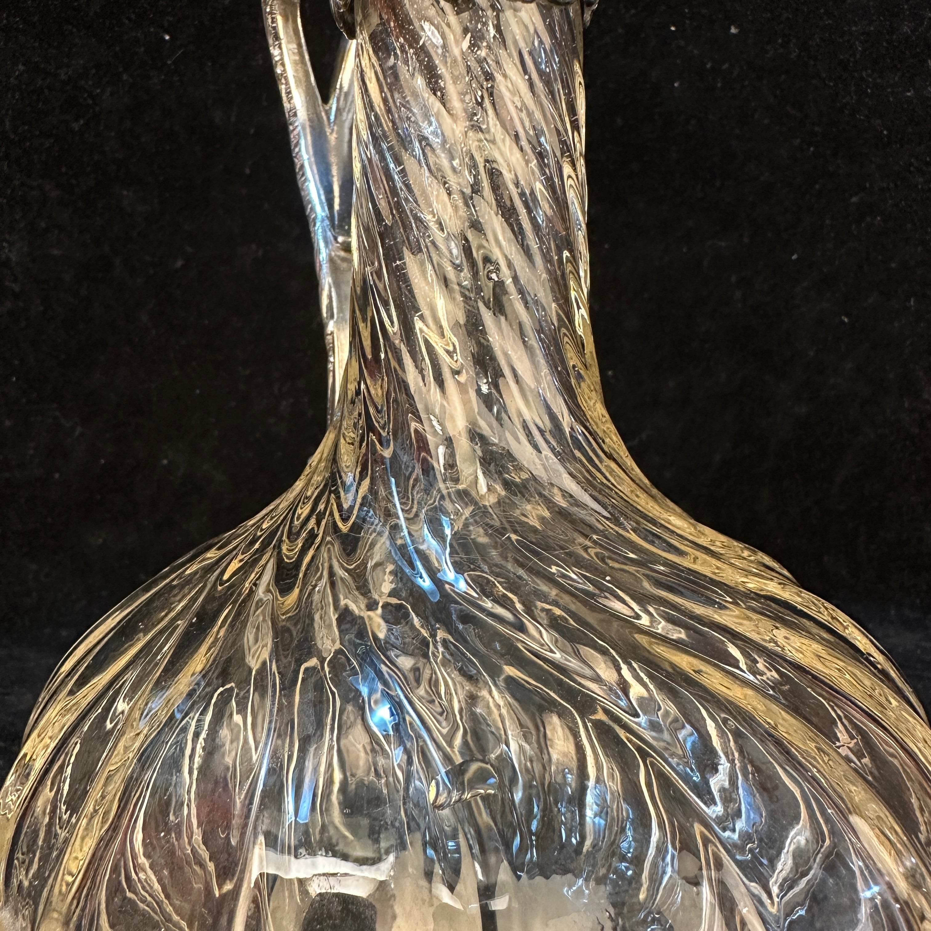 Bella jarra de vidrio para miel con cuello y mango de metal plateado tallado con diversos diseños. Principios del s. XX
