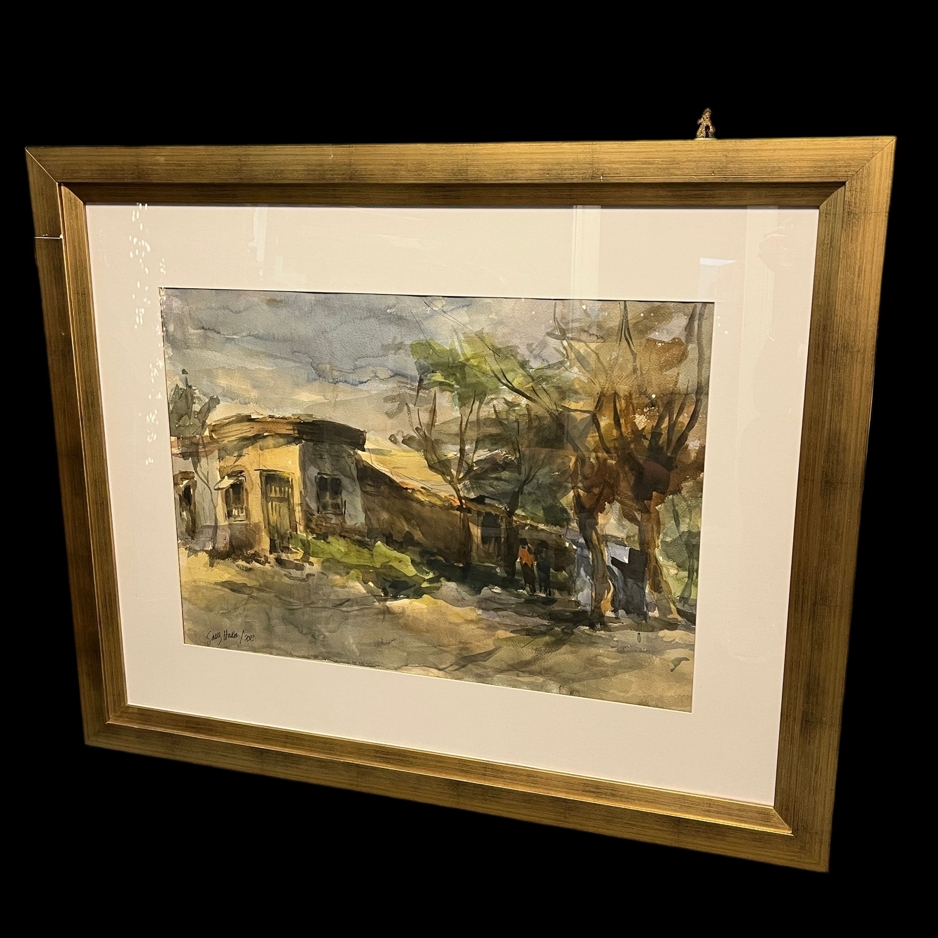 Acuarela sobre papel del artista chileno Manuel Gómez Hassan (1924), representando la vista de una calle con casas de fachada continua y una pequeña plaza con un quiosco azul, en la que dos personas caminan protegidas por la sombra de los árboles. Se trata, seguramente, de un barrio de Santiago como Quilicura, lugar que el artista retrató bastante durante su carrera.