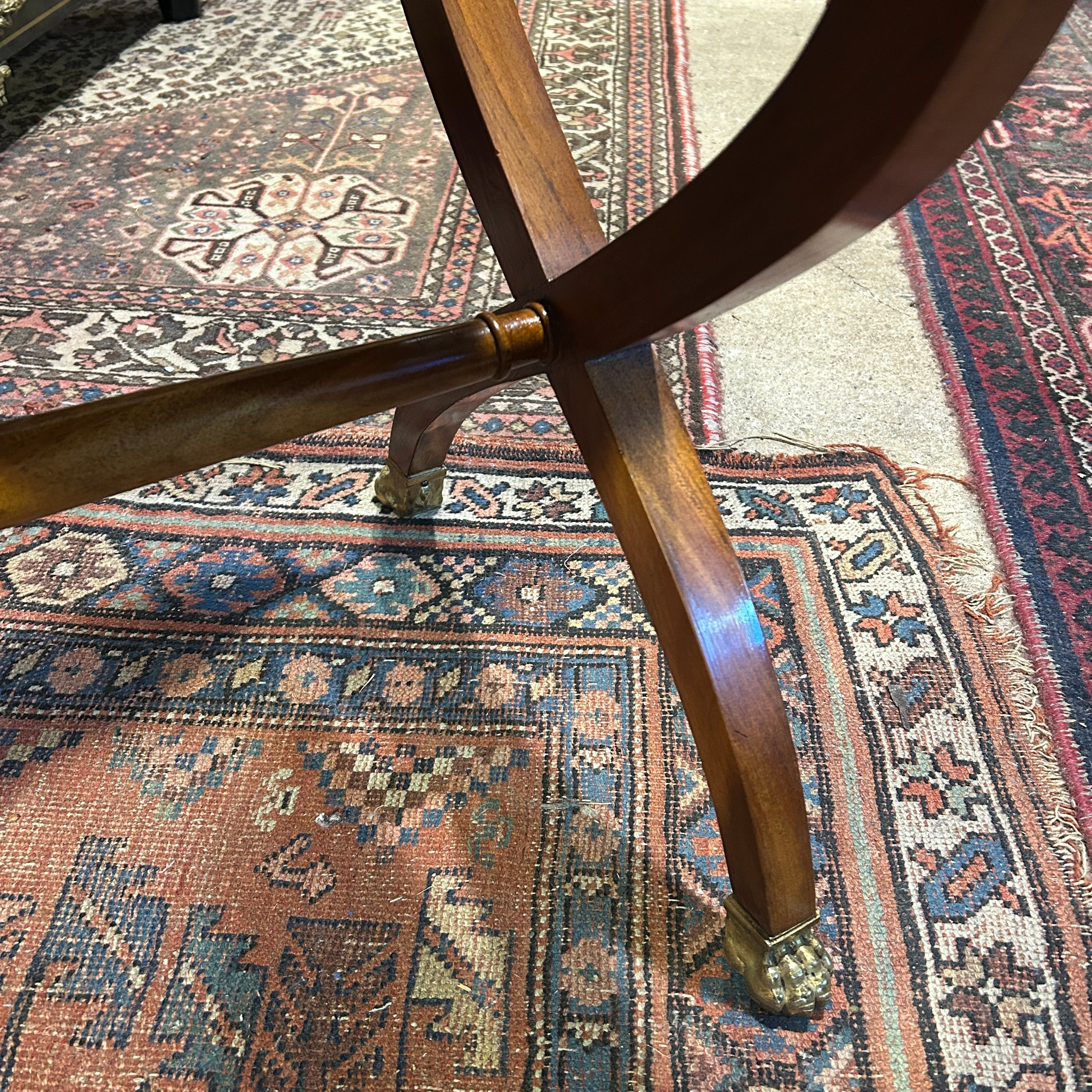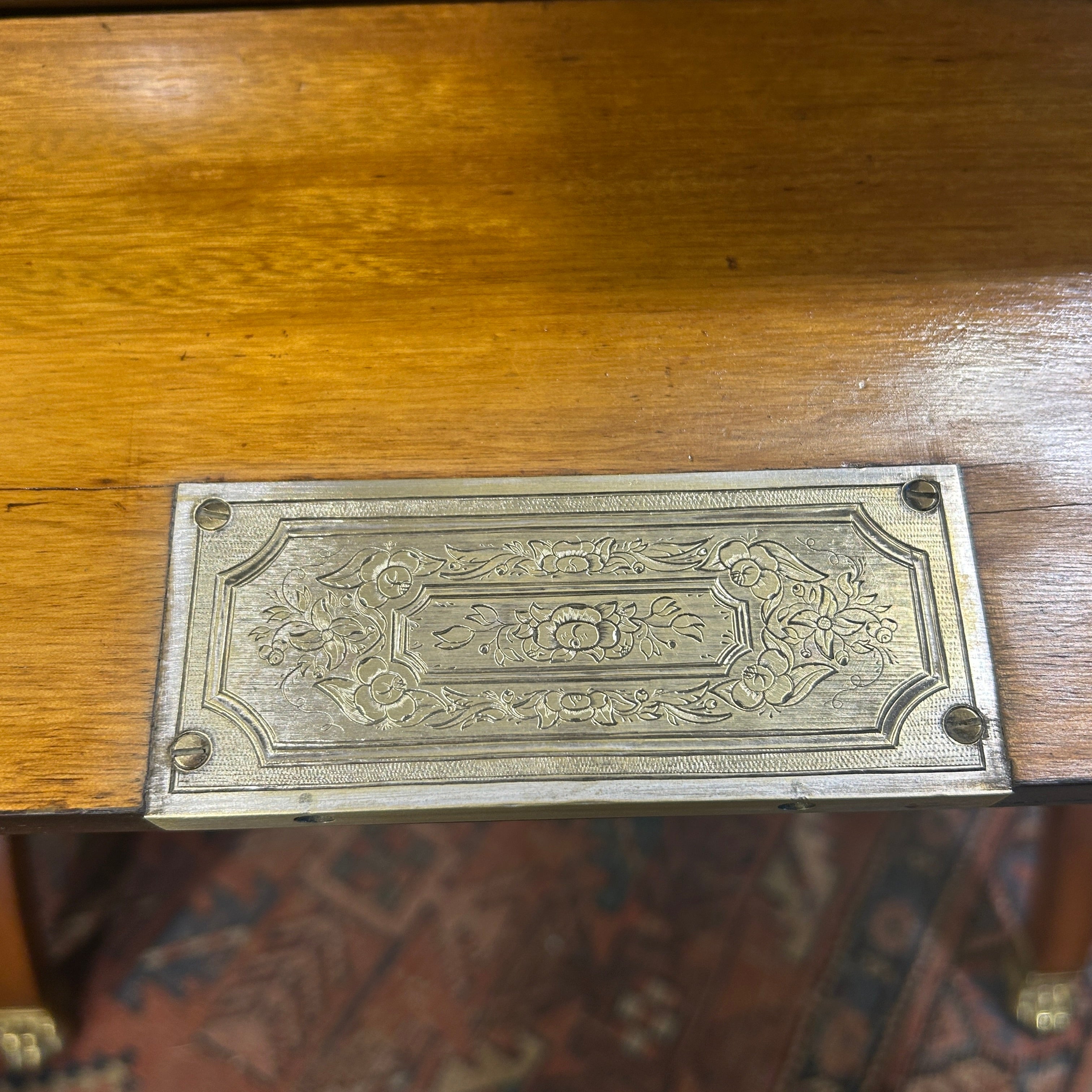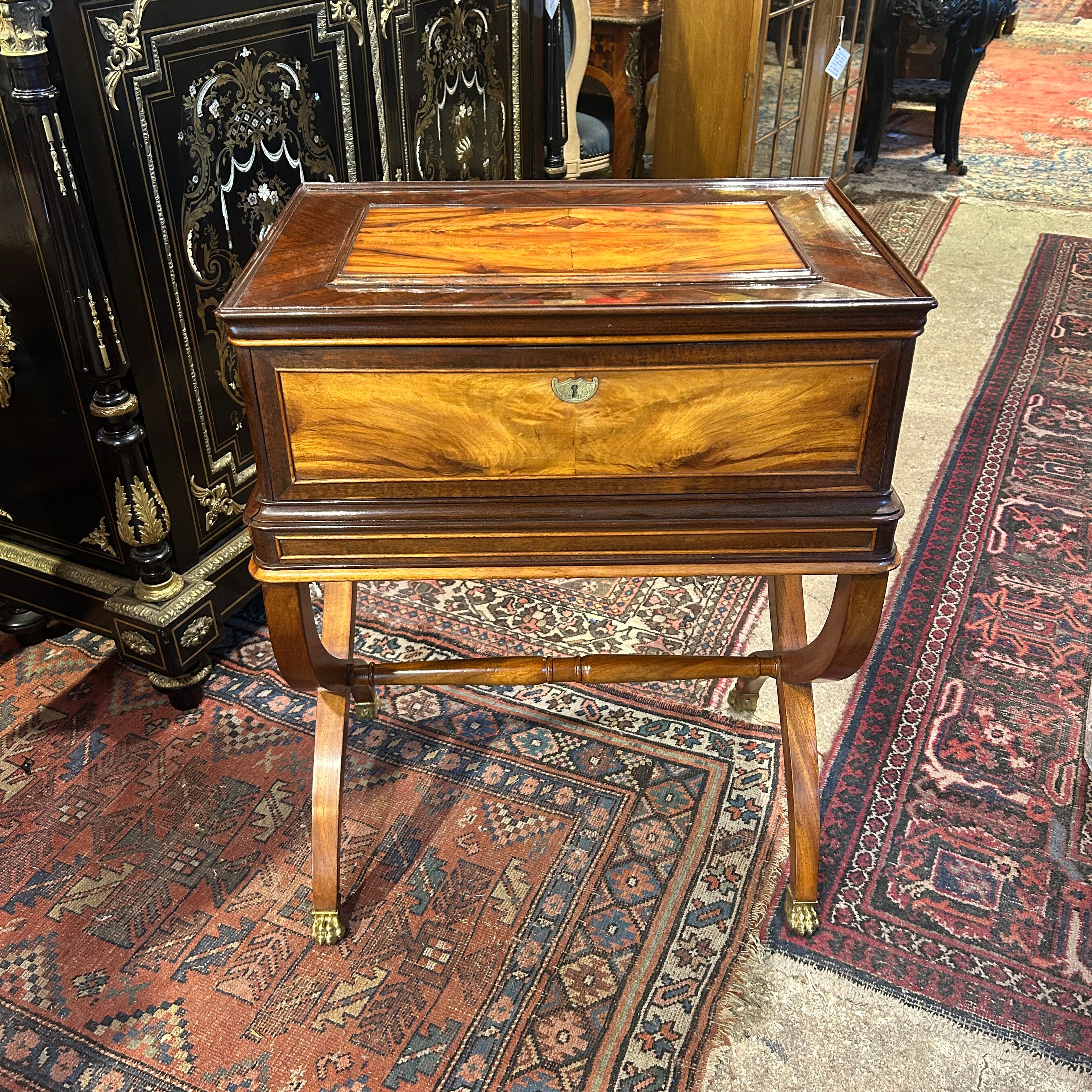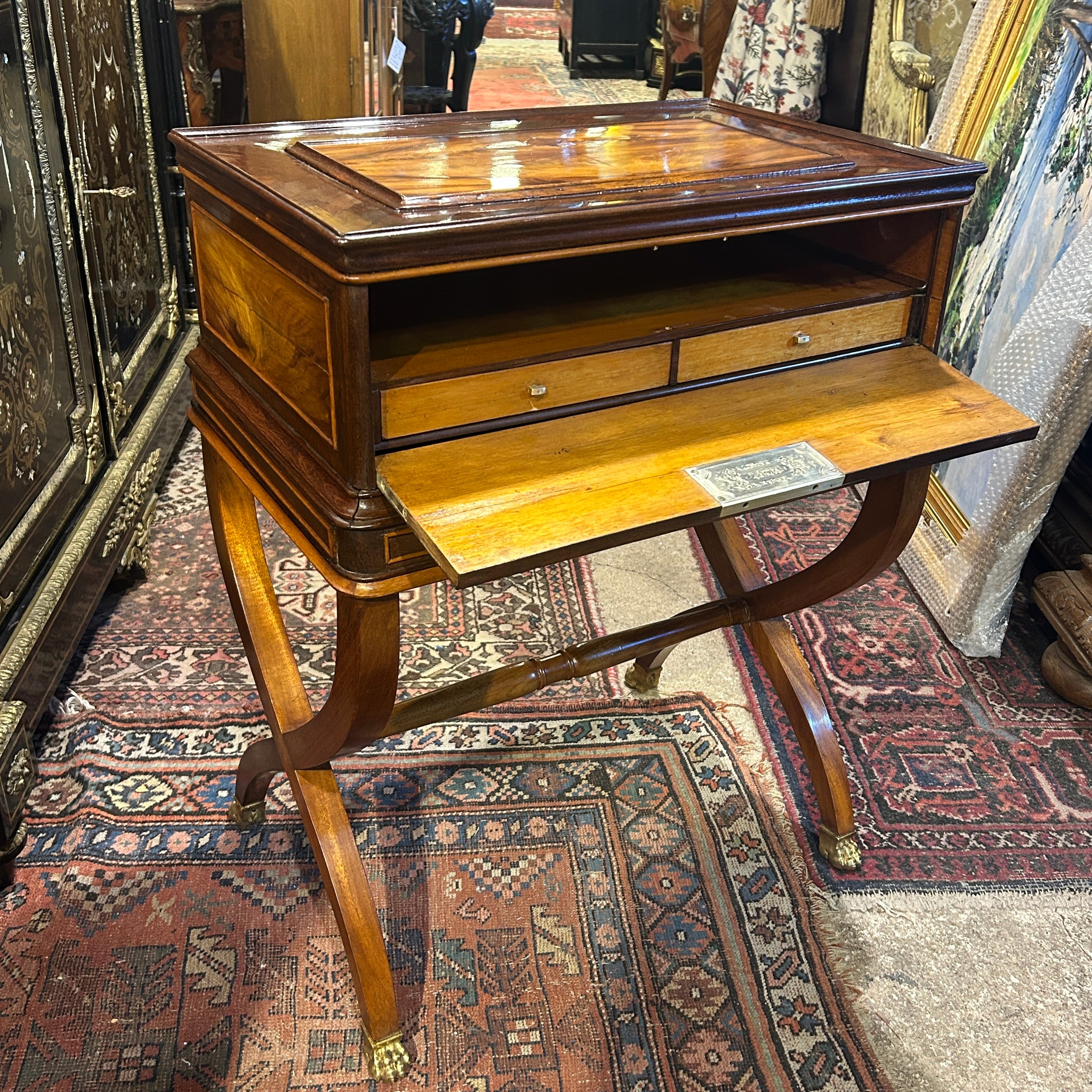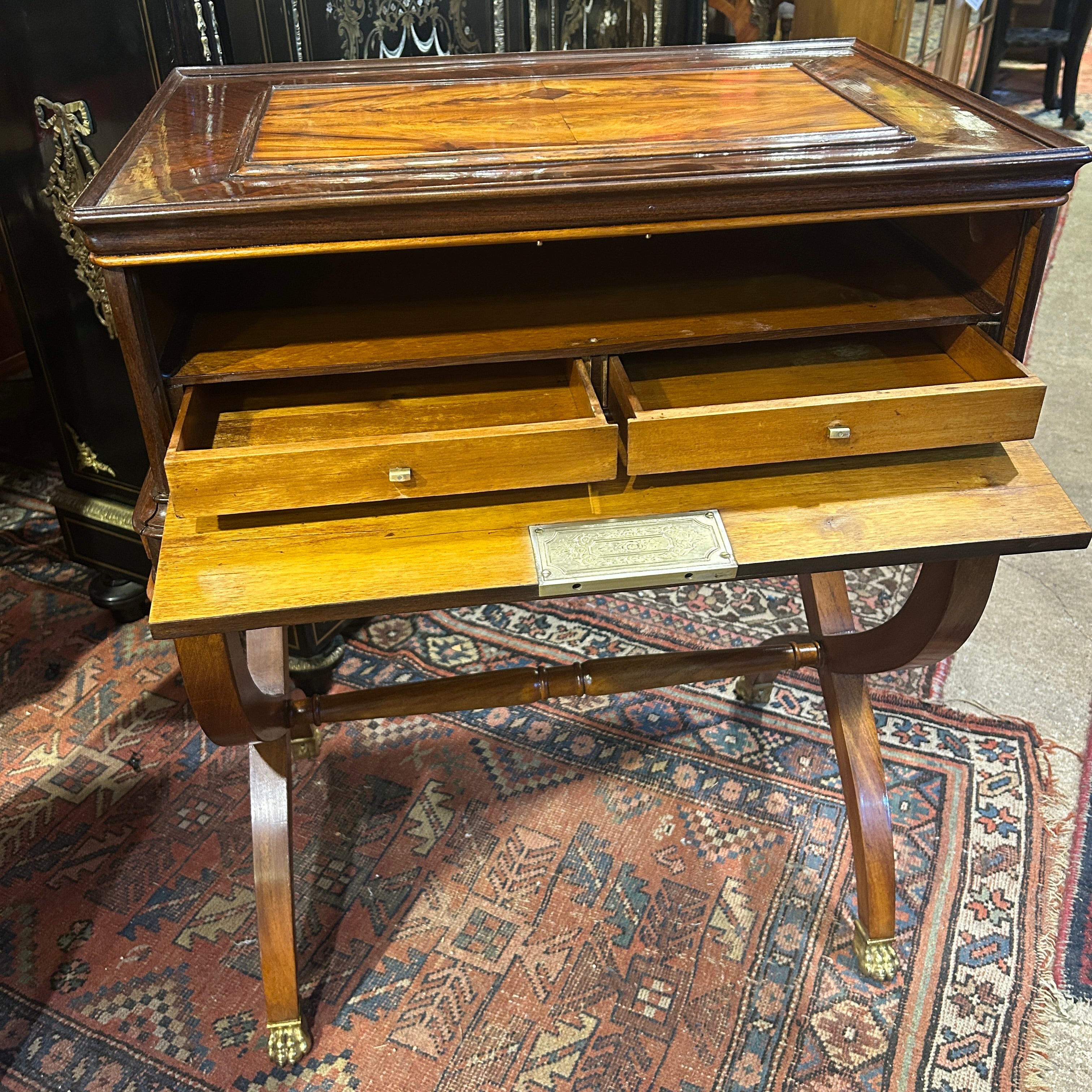 Elegante mesa costurero, de origen francés estilo Louis Philippe. La pieza tiene un fino trabajo de marquetería en amaranto y caoba, con tapa abatible, casillero, dos cajones centrales, patas en X unidas por entrepaño y remates en bronce en forma de garra.