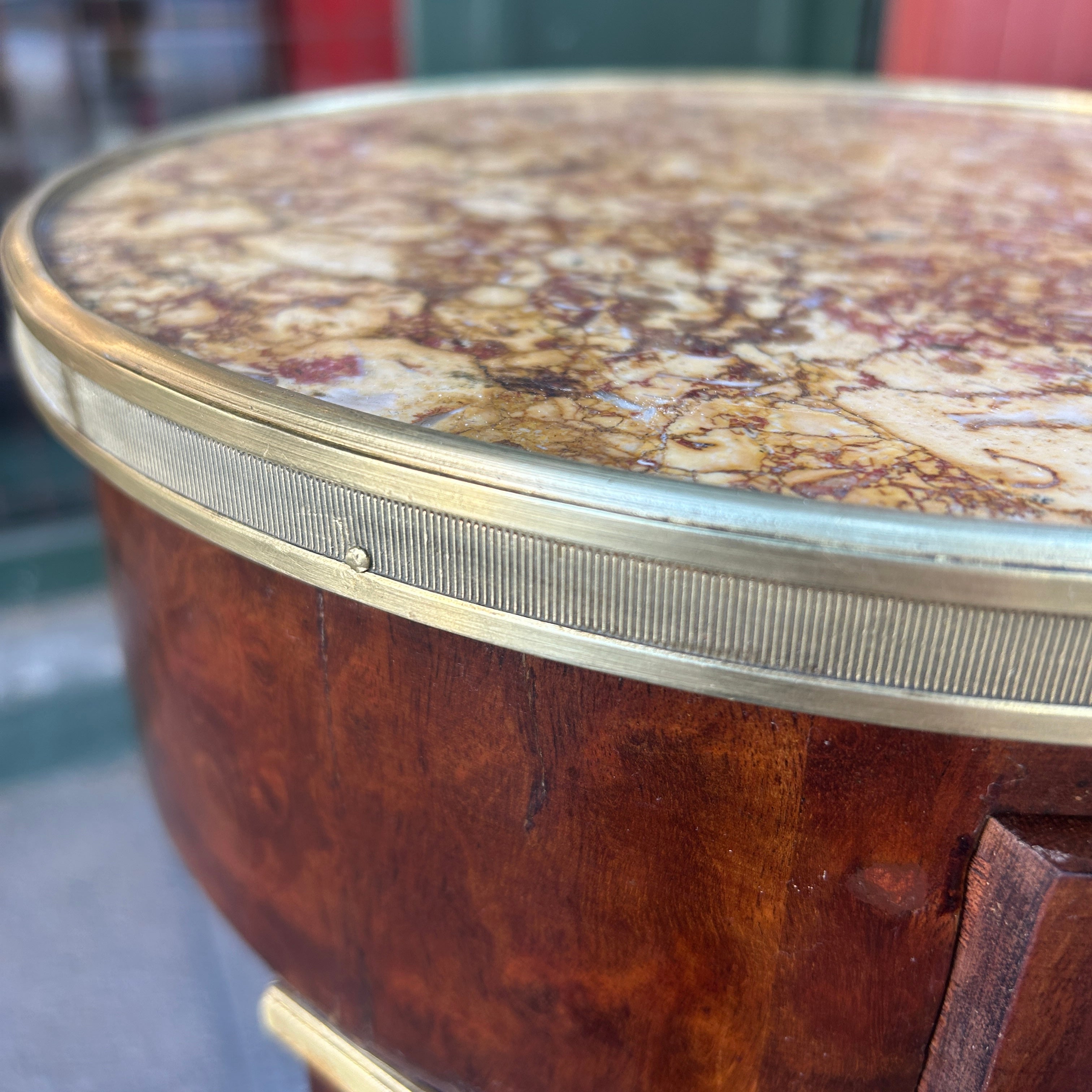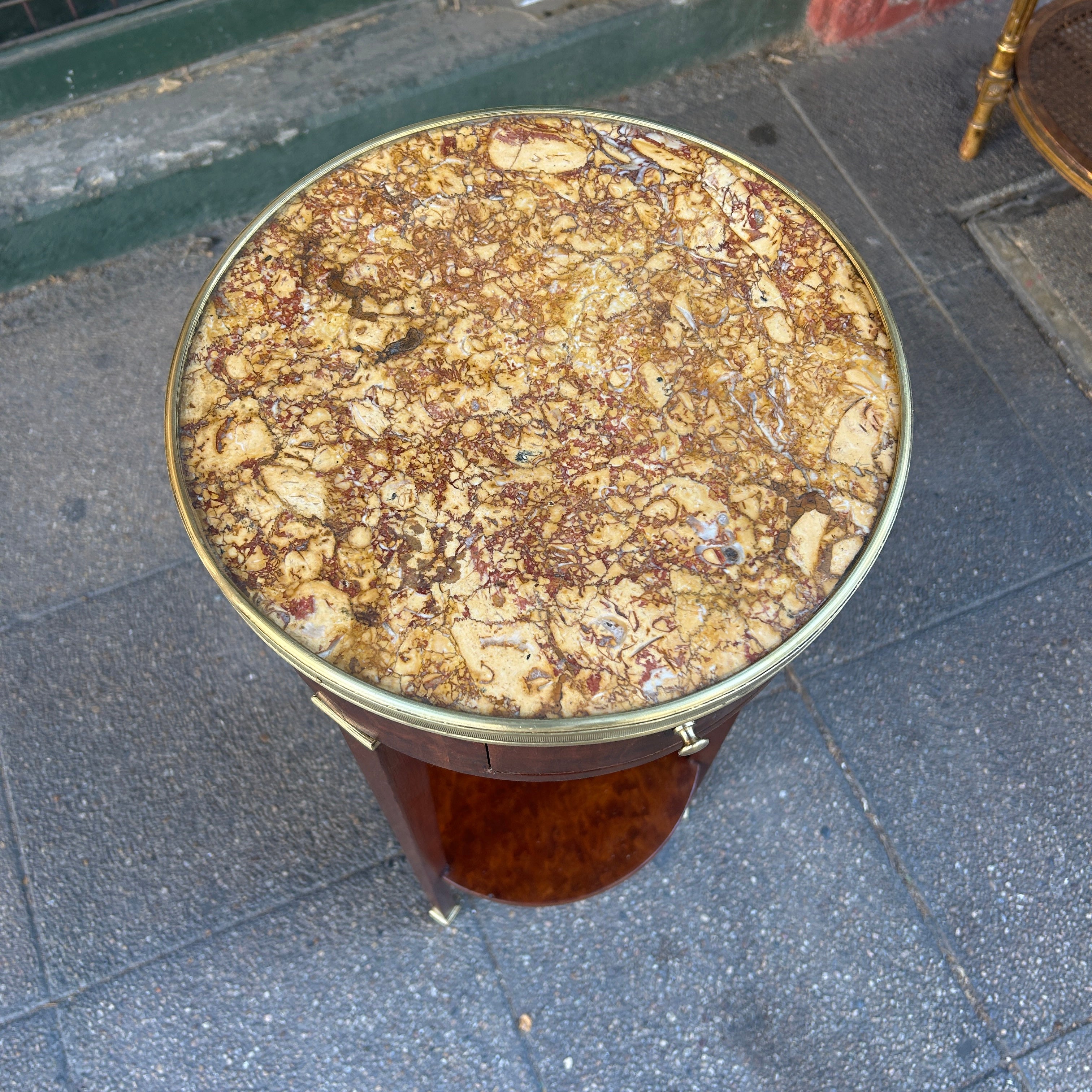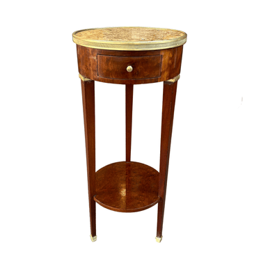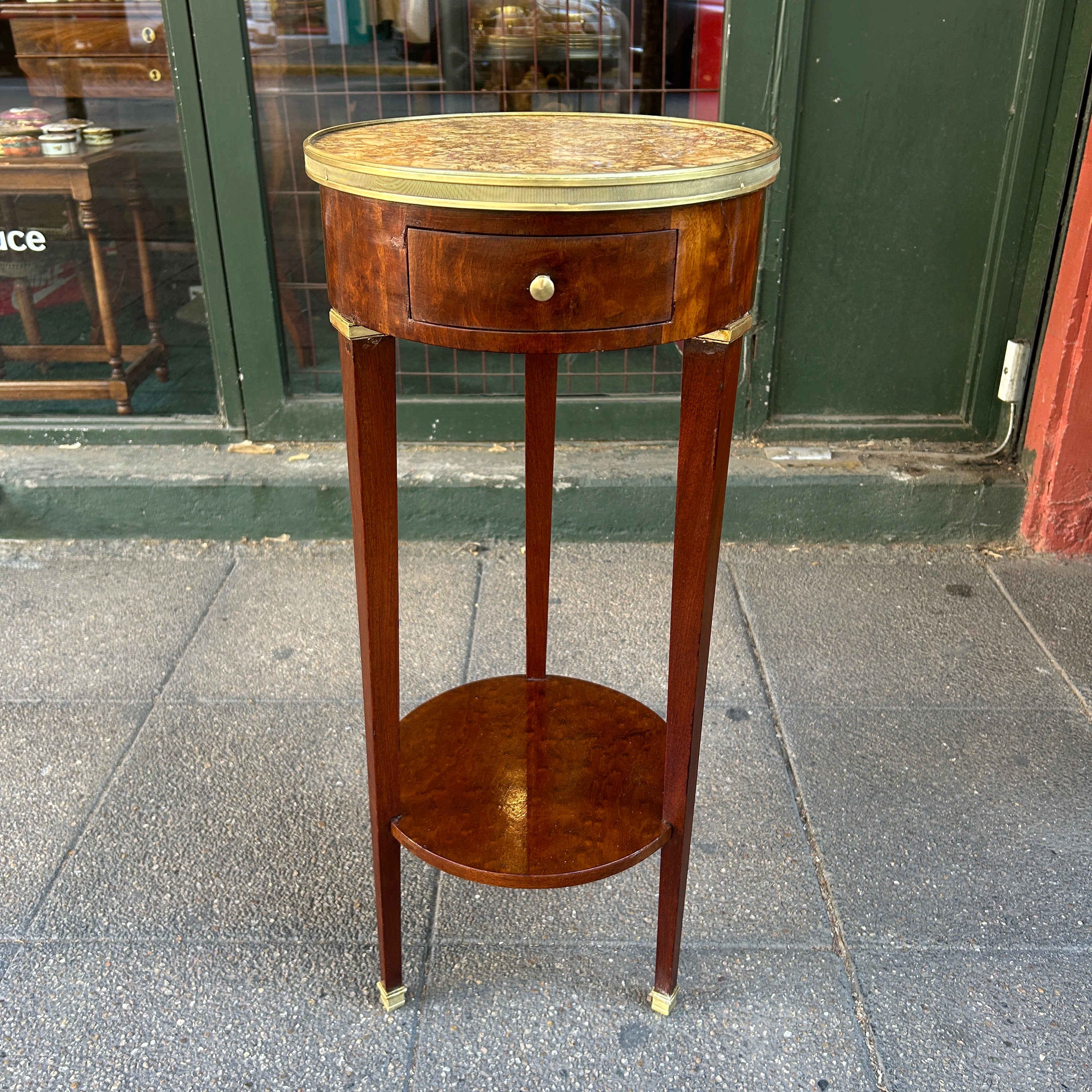 Elegante mesa de apoyo circular estilo Luis XVI proveniente de Francia, trabaja en madera enchapada y con una cubierta de mármol brèche. Cuenta con un pequeño cajón y patas rectas con entrepaño.