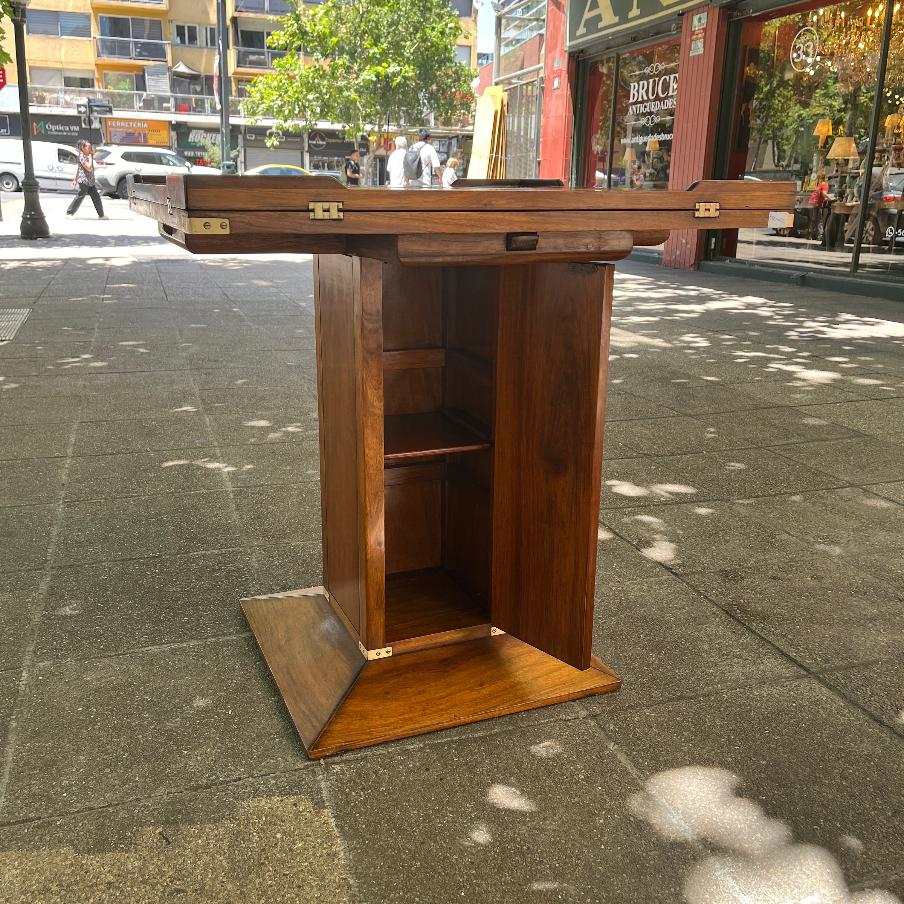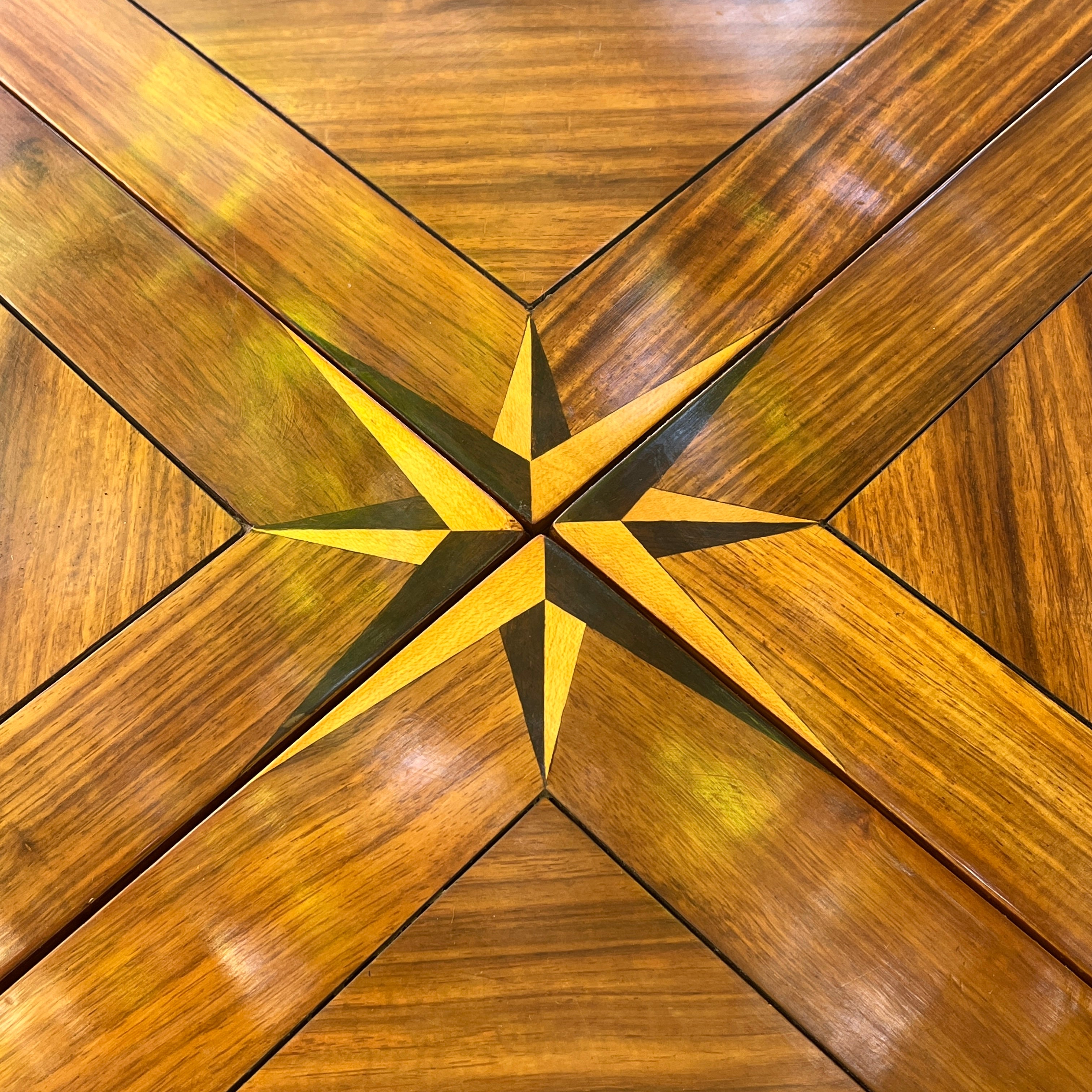 Bella mesa inglesa de la marca Starbay, de estilo marítimo, con estrella de madera clara y oscura, base rectangular con puerta y repisas. Inspirada en mueble naval. La mesa se despliega con un sistema de 4 puntas, aumentando sus dimensiones.