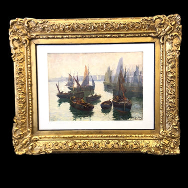 Oleo del pintor Marc Saint-Saëns (Toulouse 1903- 1979) fue un decorador mural, pintor, cartonista de tapices y grabador francés. En este cuadro vemos un conjunto de barcos a velas placidamanete sobre las aguas, enmarcado en un espectacular marco dorado de madera tallada. Francia.