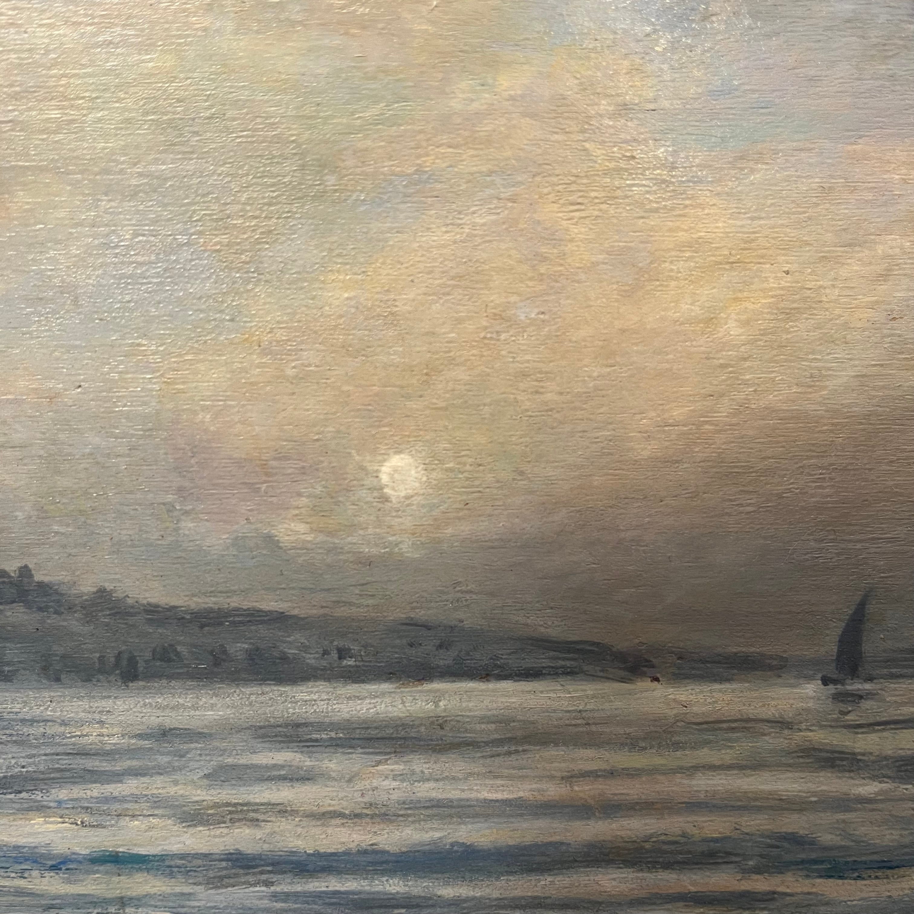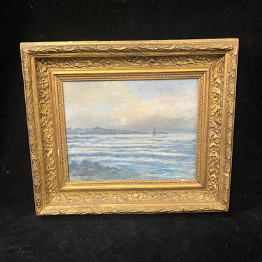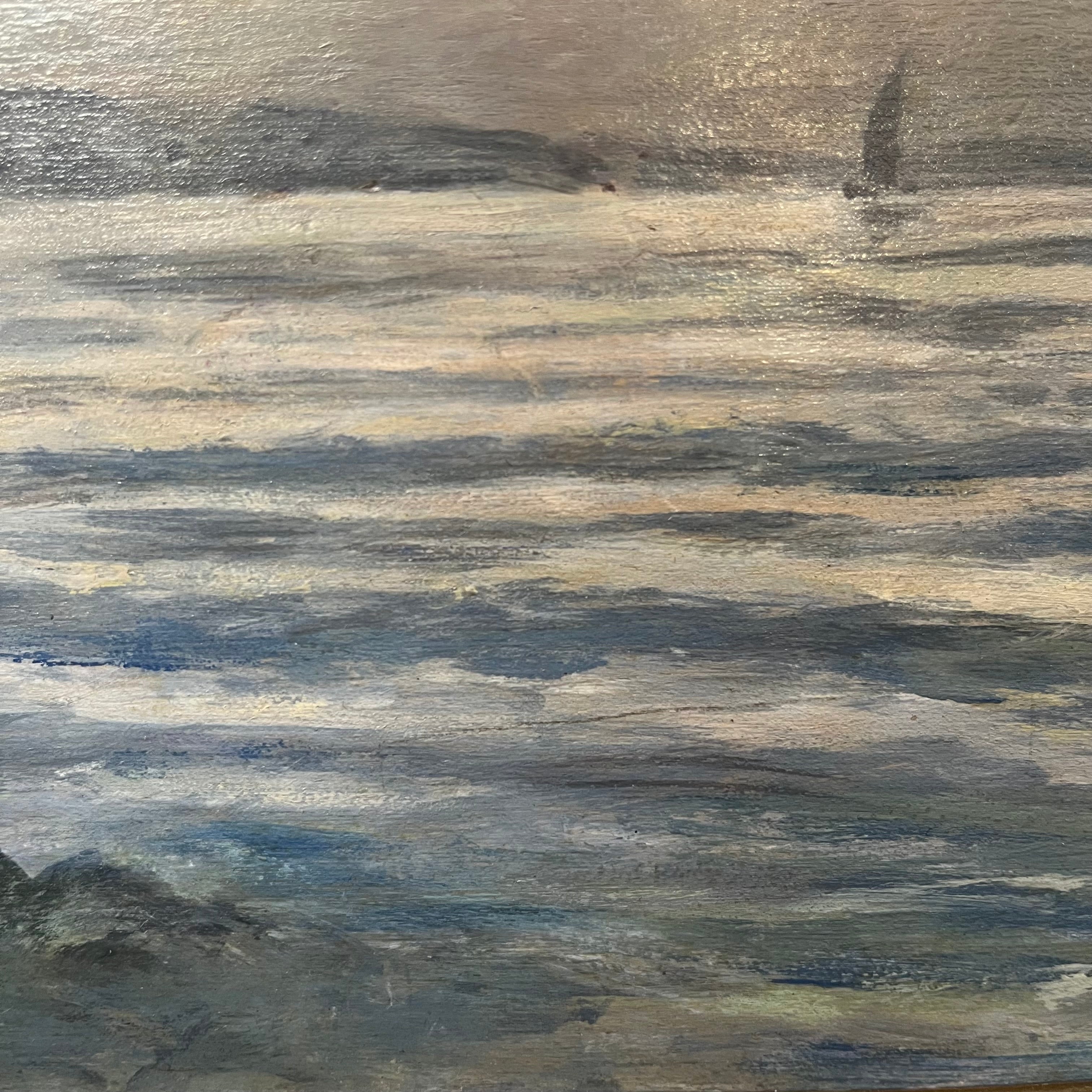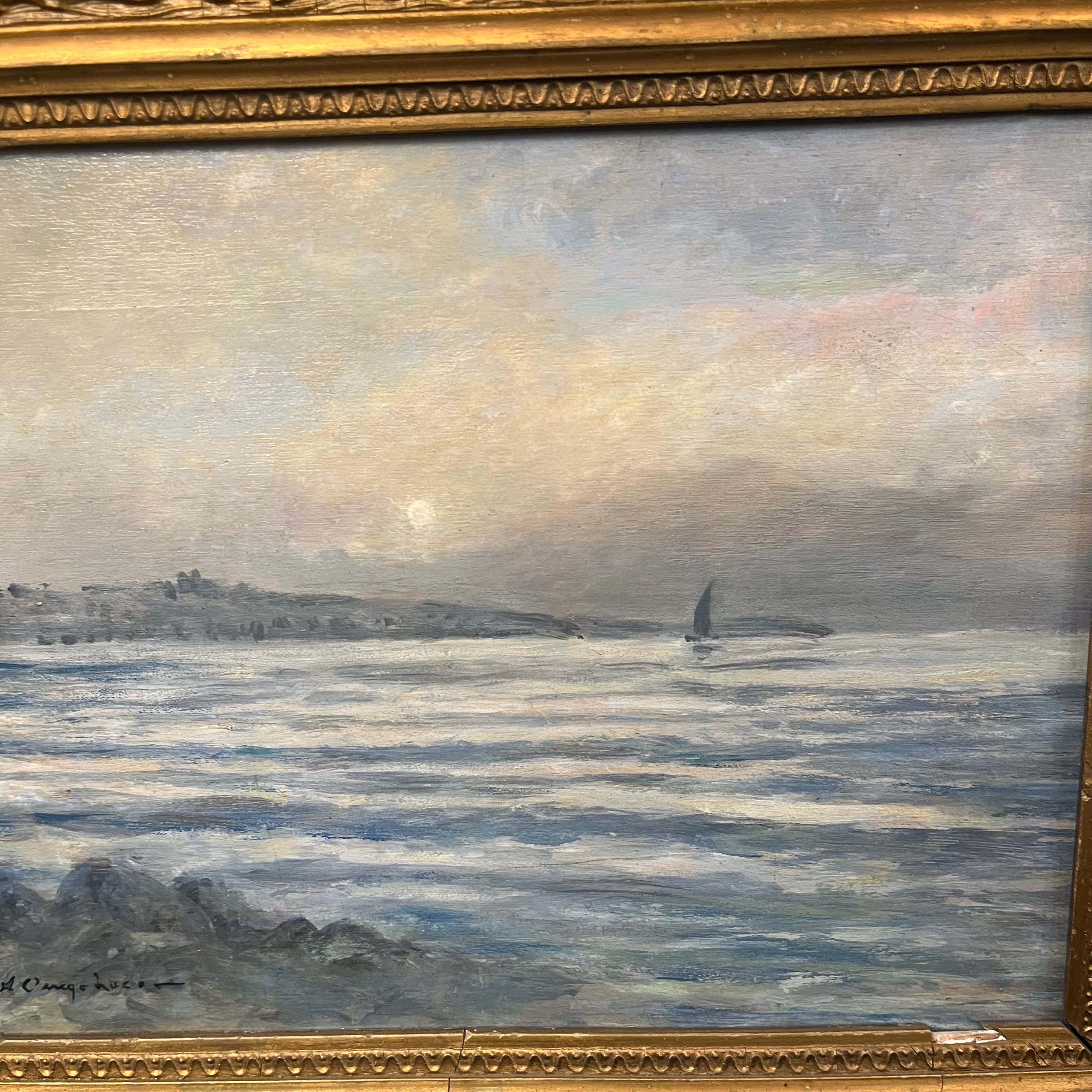 Óleo sobre madera del reconocido pintor chileno Alberto Orrego Luco (1854-1933), representando un paisaje de costa en el que el horizonte toma protagonismo. A lo lejos se ve un velero, el sol detrás de algunas nubes y el viento moviendo las olas. Se trata de un cuadro que deja ver la maestría del artista para retratar paisajes, su especialidad, incluso en pequeños formatos como este. El cuadro tiene un marco de madera tallada en relieves y terminada de elegante dorado.