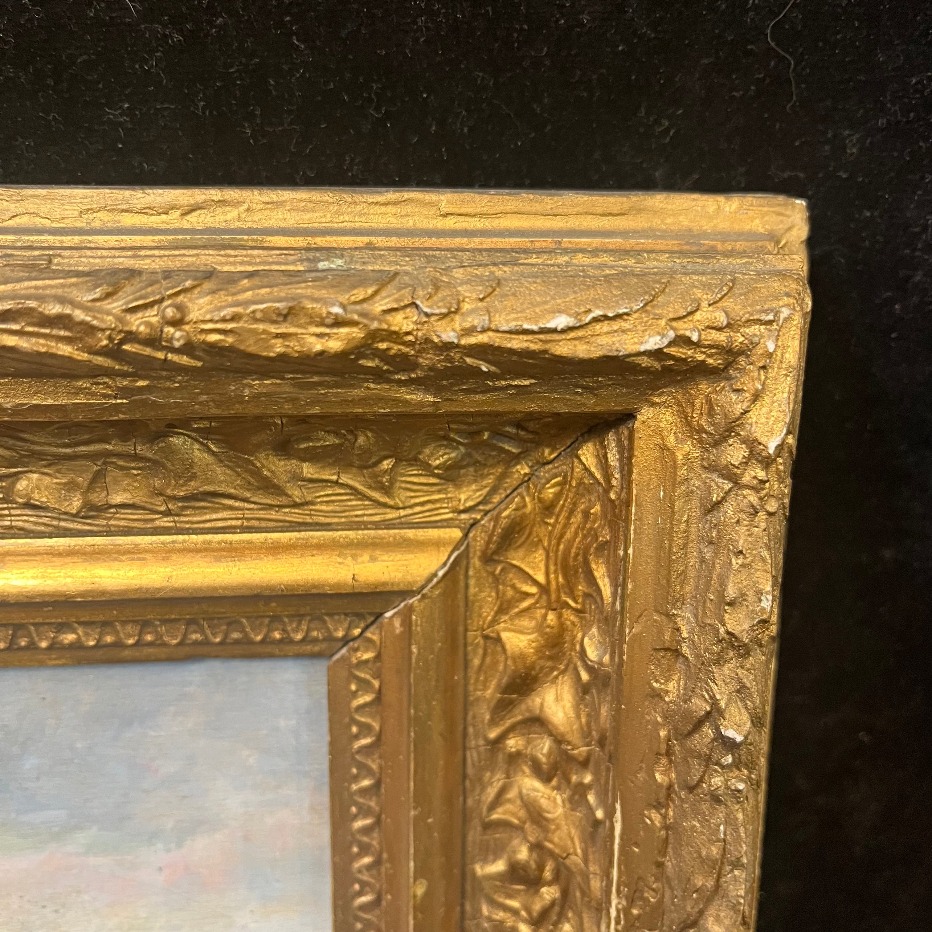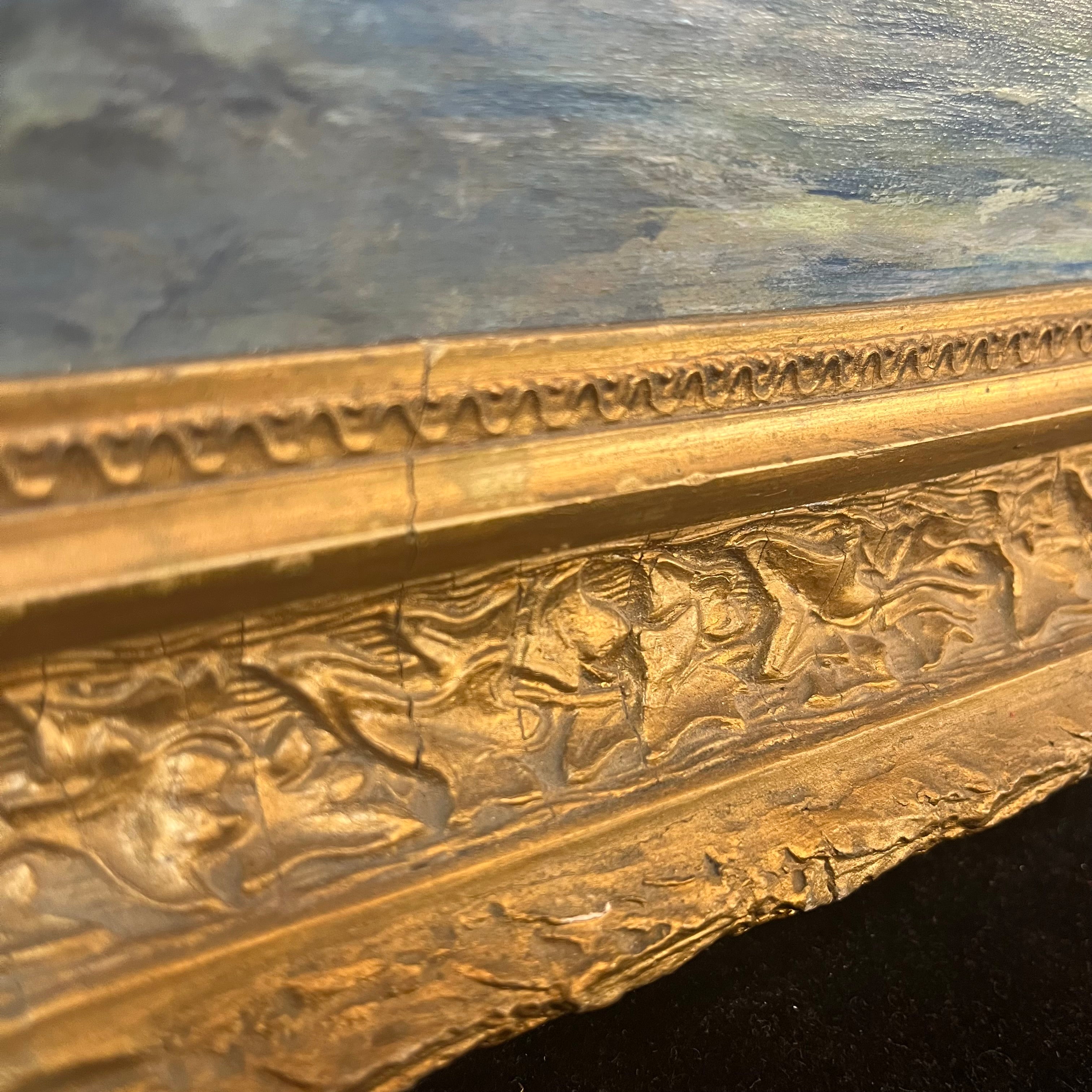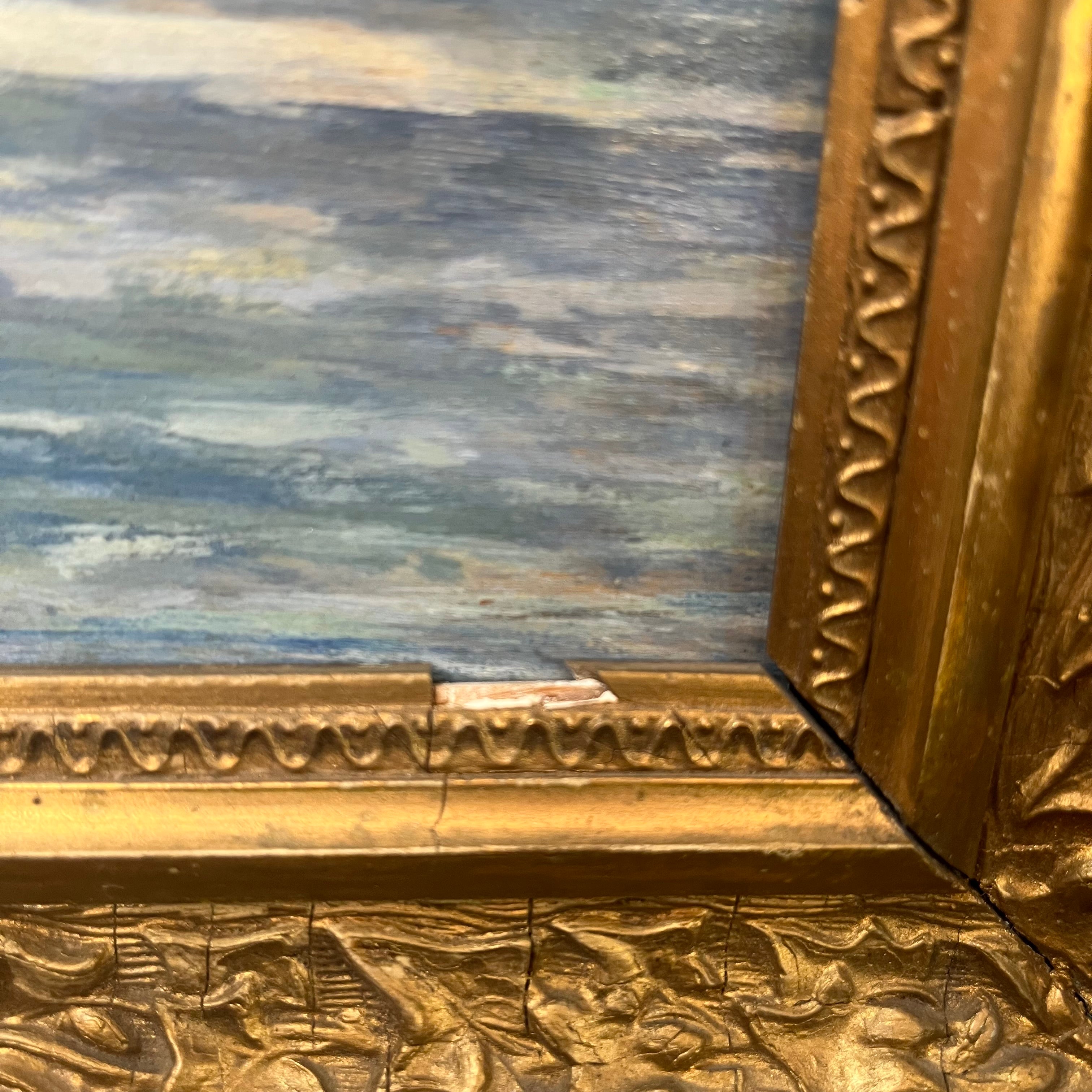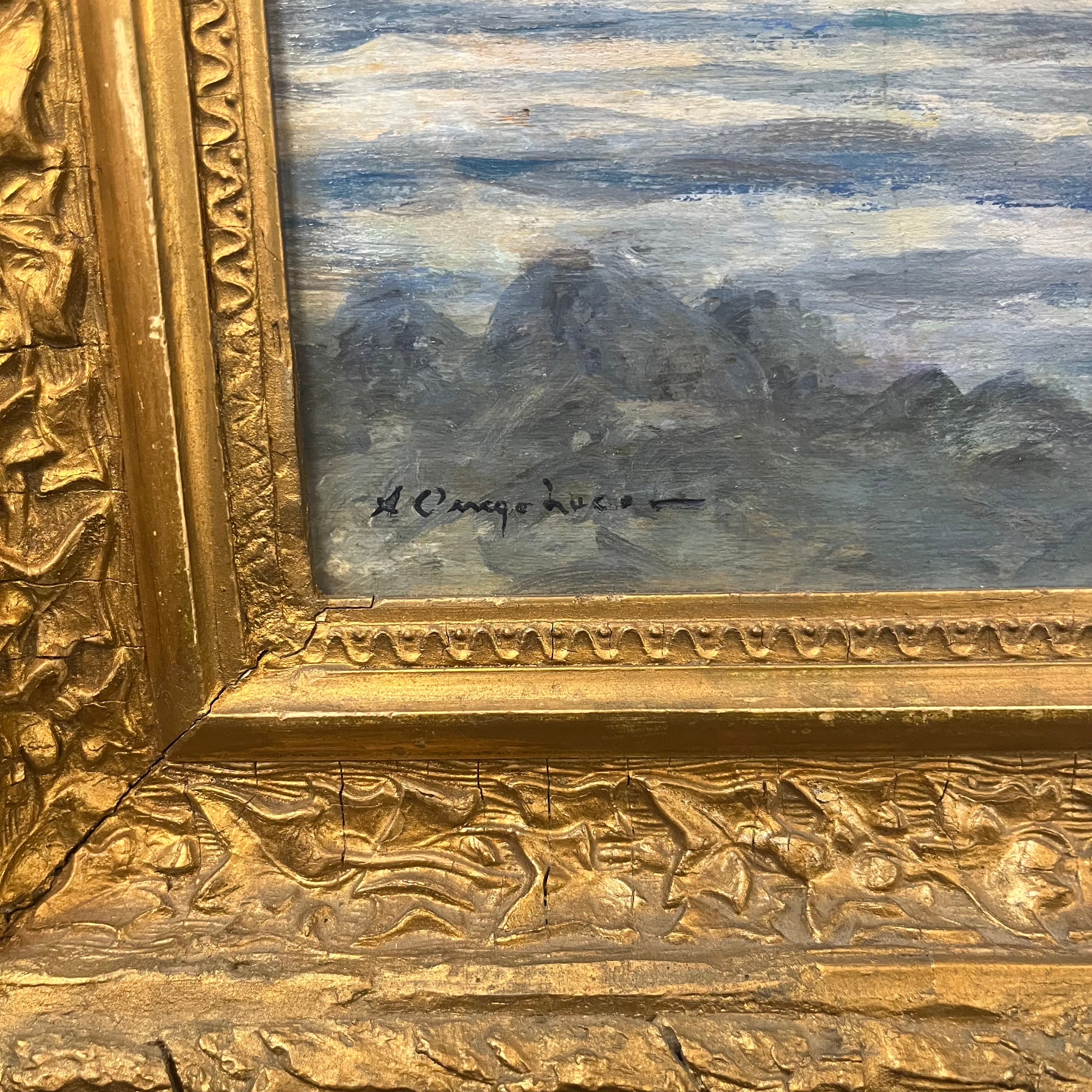 Óleo sobre madera del reconocido pintor chileno Alberto Orrego Luco (1854-1933), representando un paisaje de costa en el que el horizonte toma protagonismo. A lo lejos se ve un velero, el sol detrás de algunas nubes y el viento moviendo las olas. Se trata de un cuadro que deja ver la maestría del artista para retratar paisajes, su especialidad, incluso en pequeños formatos como este. El cuadro tiene un marco de madera tallada en relieves y terminada de elegante dorado.