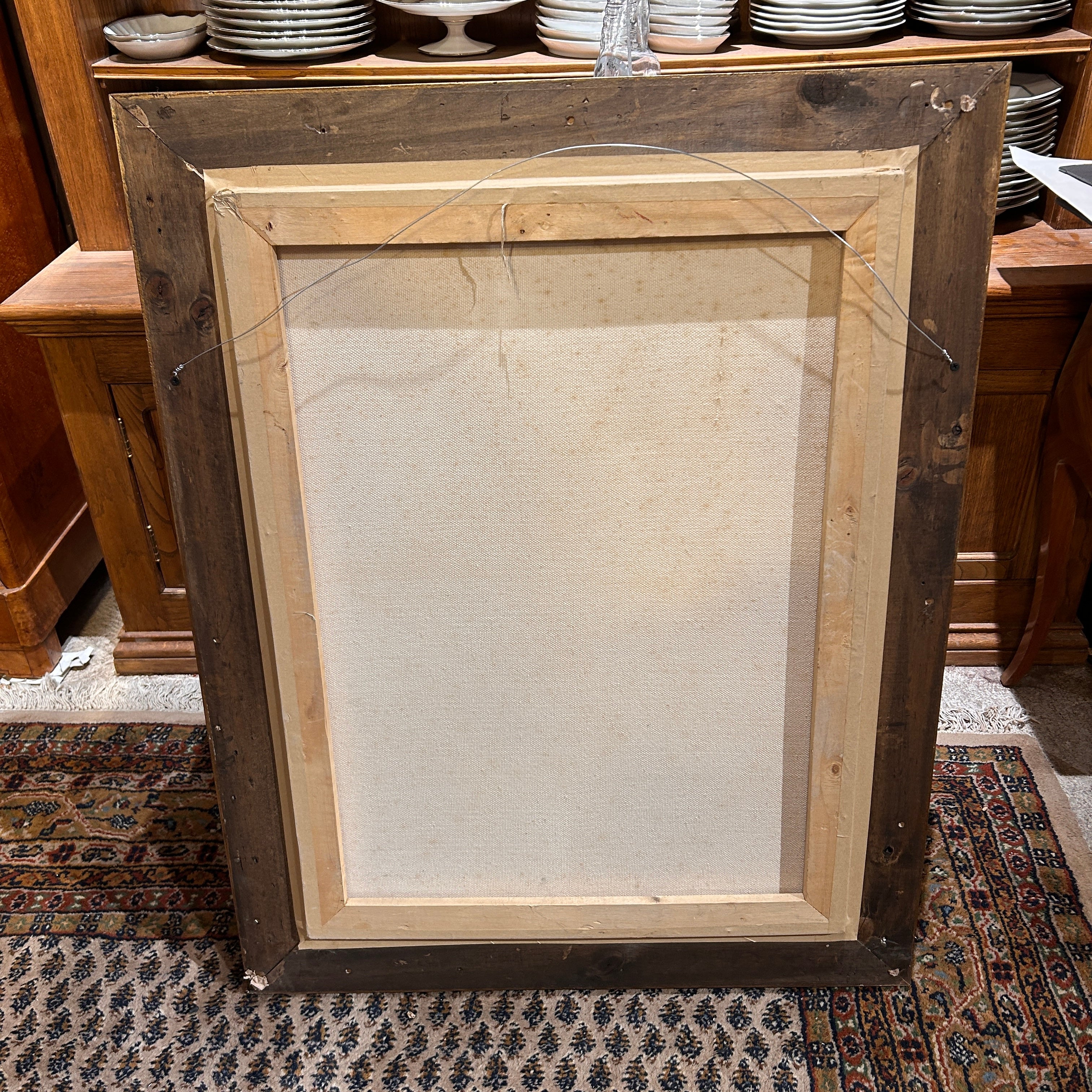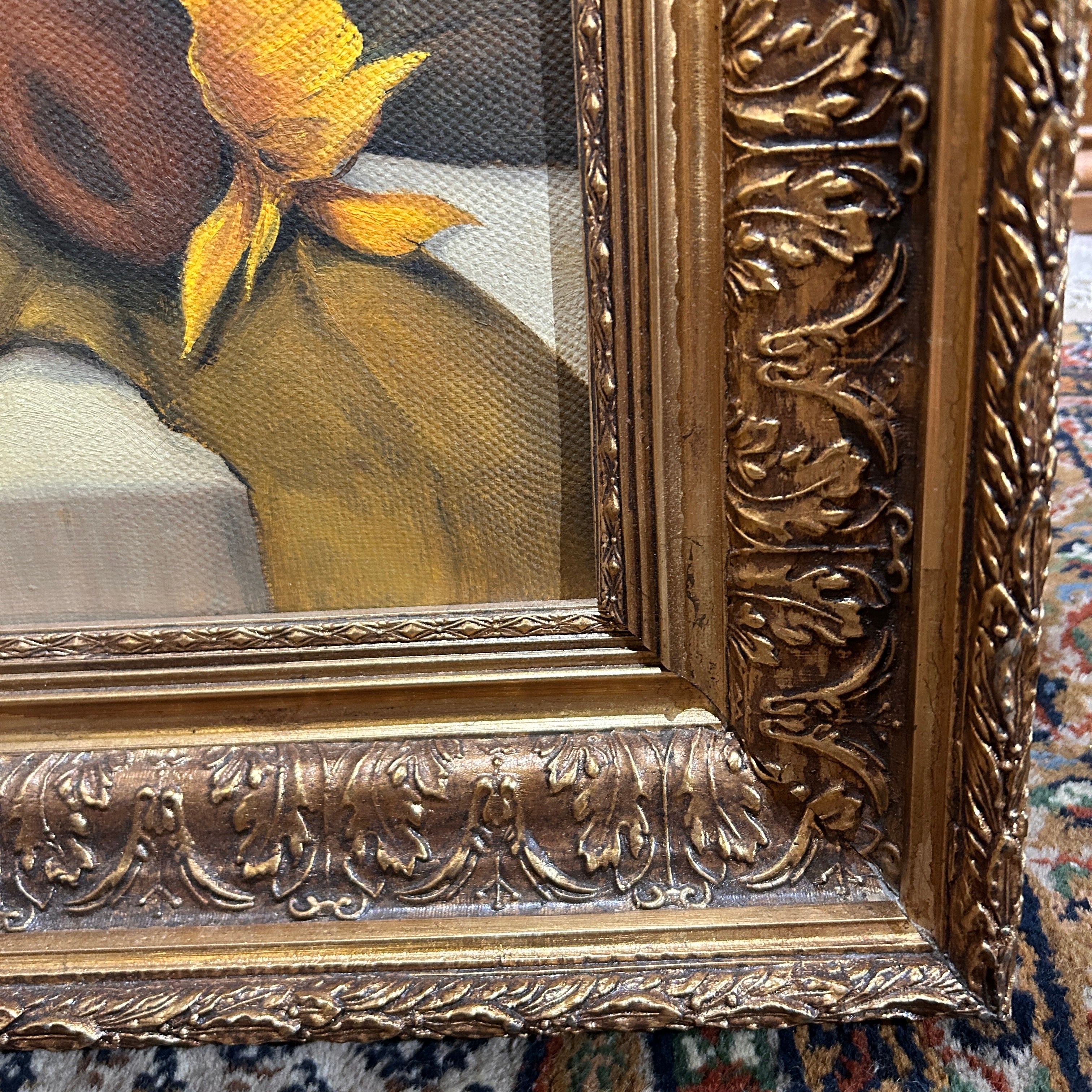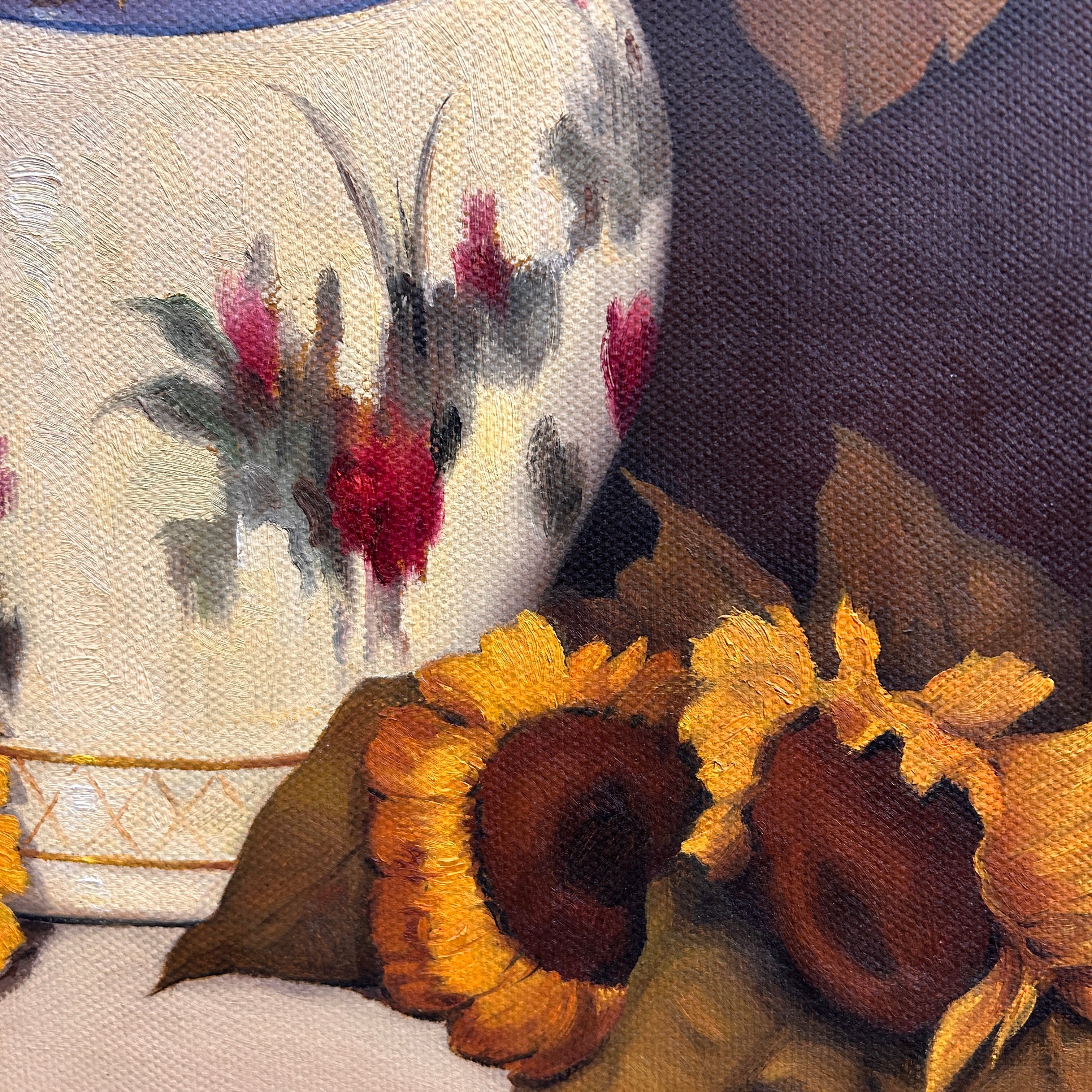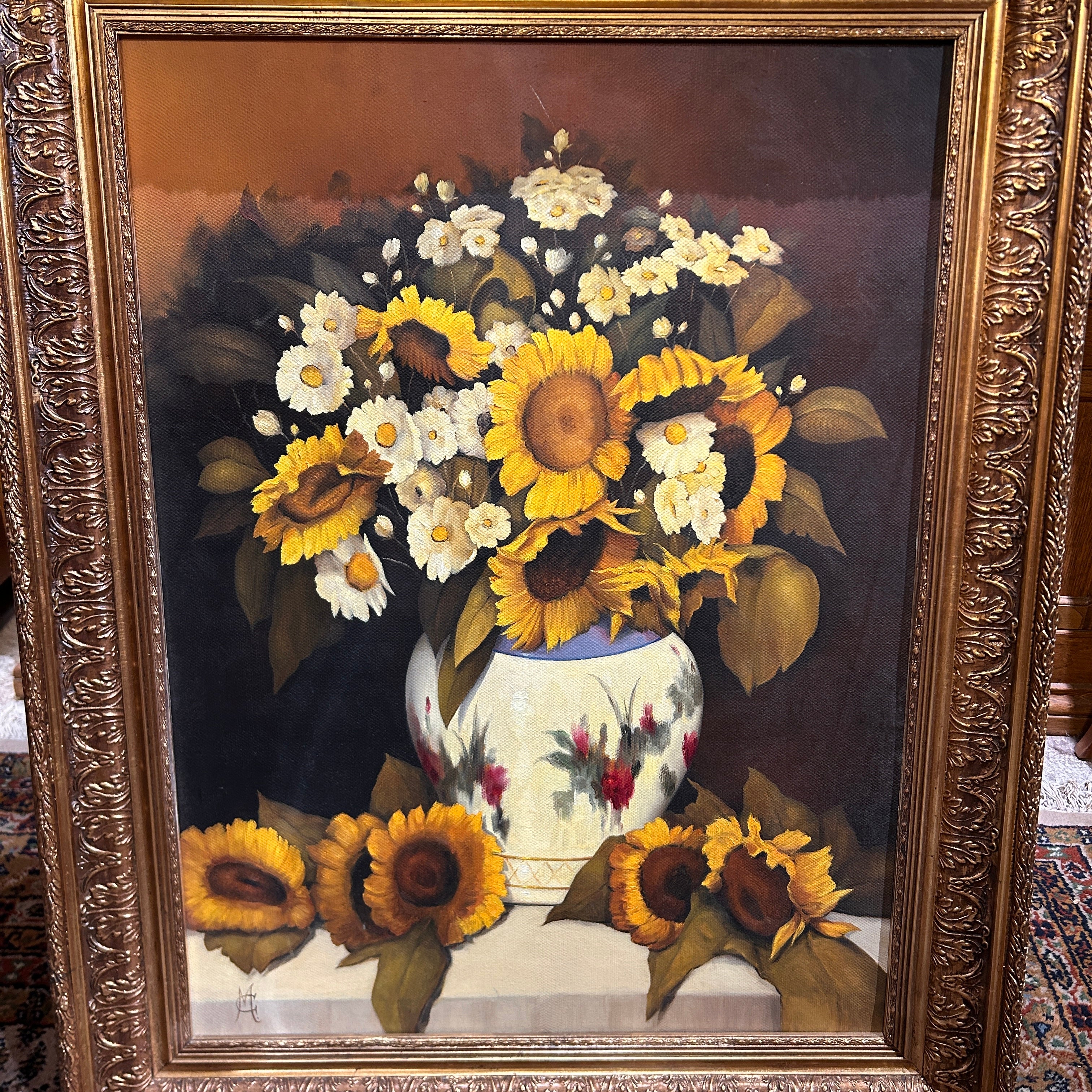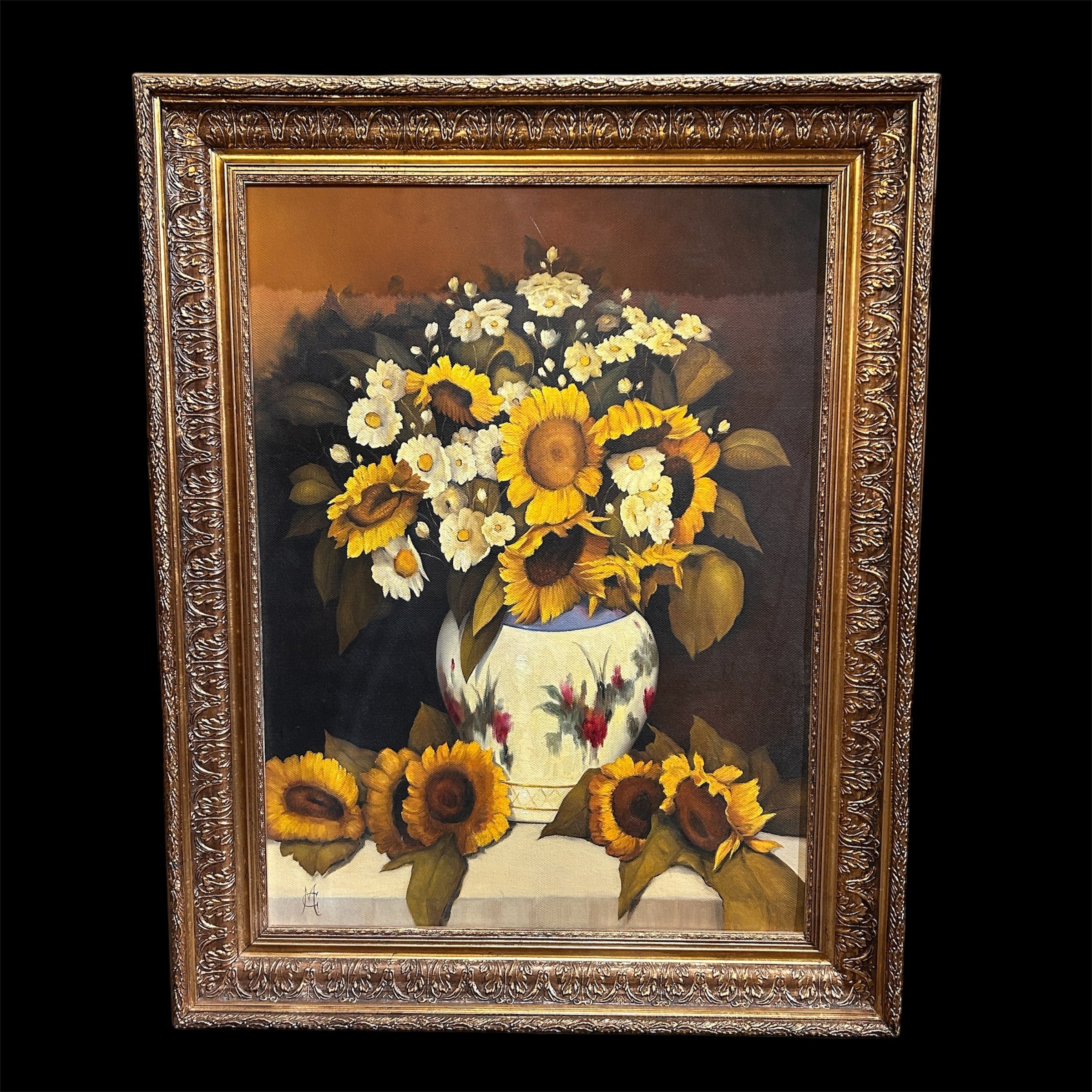 Óleo sobre tela del pintor chileno Marcelo Cuevas, representando un bello bodegón con un florero de porcelana blanca lleno de margaritas y frondosos girasoles. La obra tiene un marco de madera tallada y terminada en elegante dorado. En buen estado.