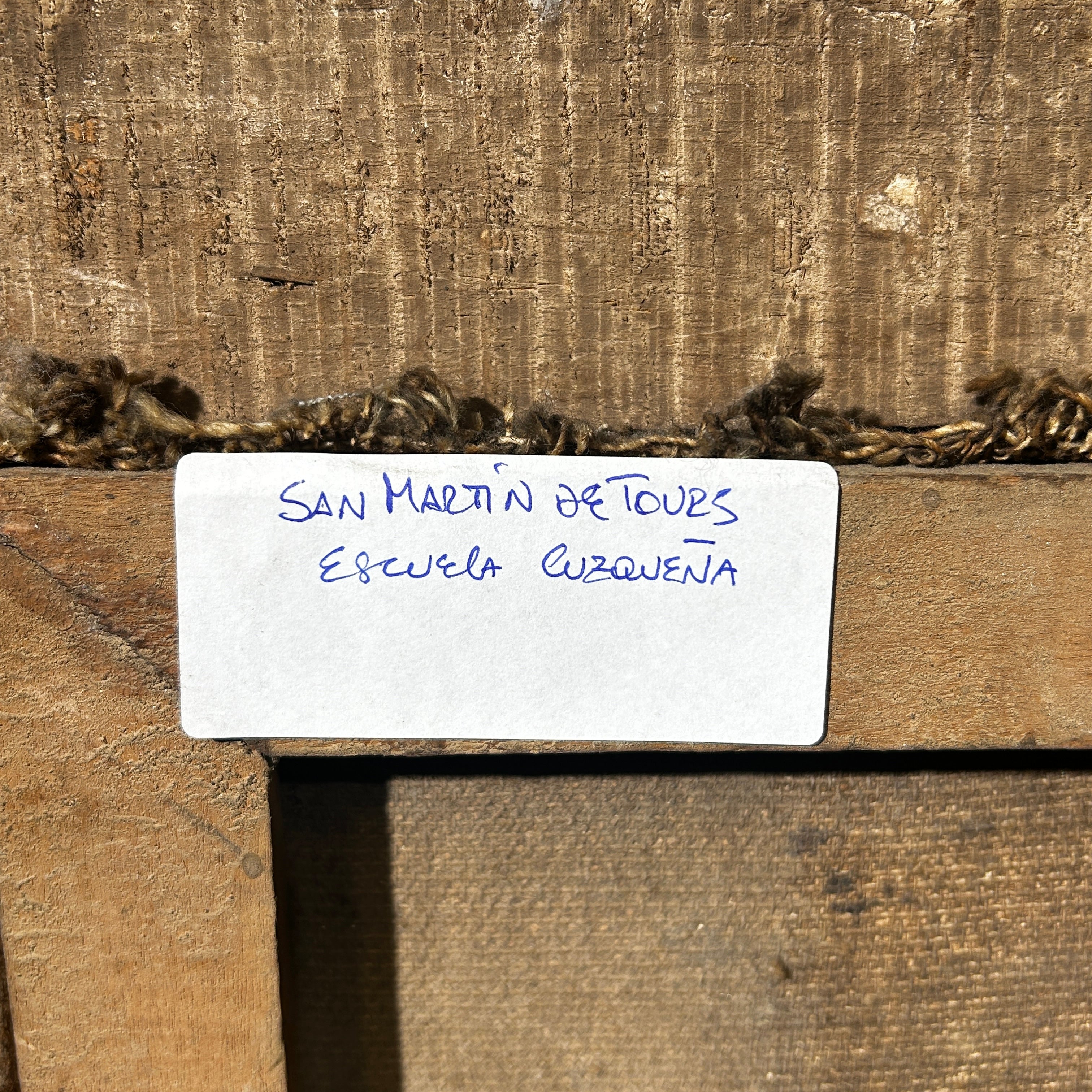 Óleo sobre tela de la escuela cuzqueña, representando a San Martín De Tours, obispo católico elevado a santo y patrono de diferentes localidades en Francia. la obra tiene un elegante marco de madera tallada y pintada de luminoso dorado.