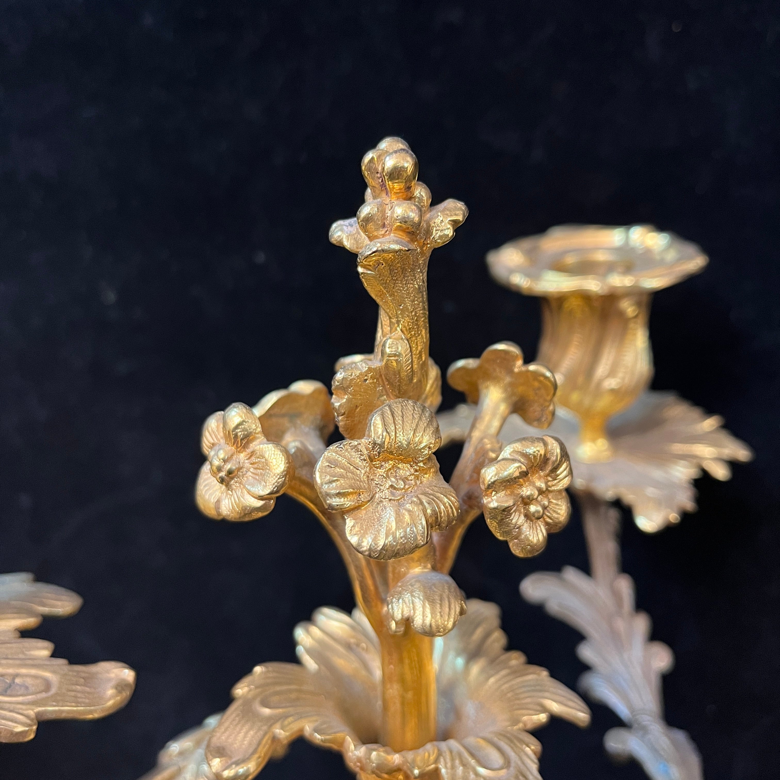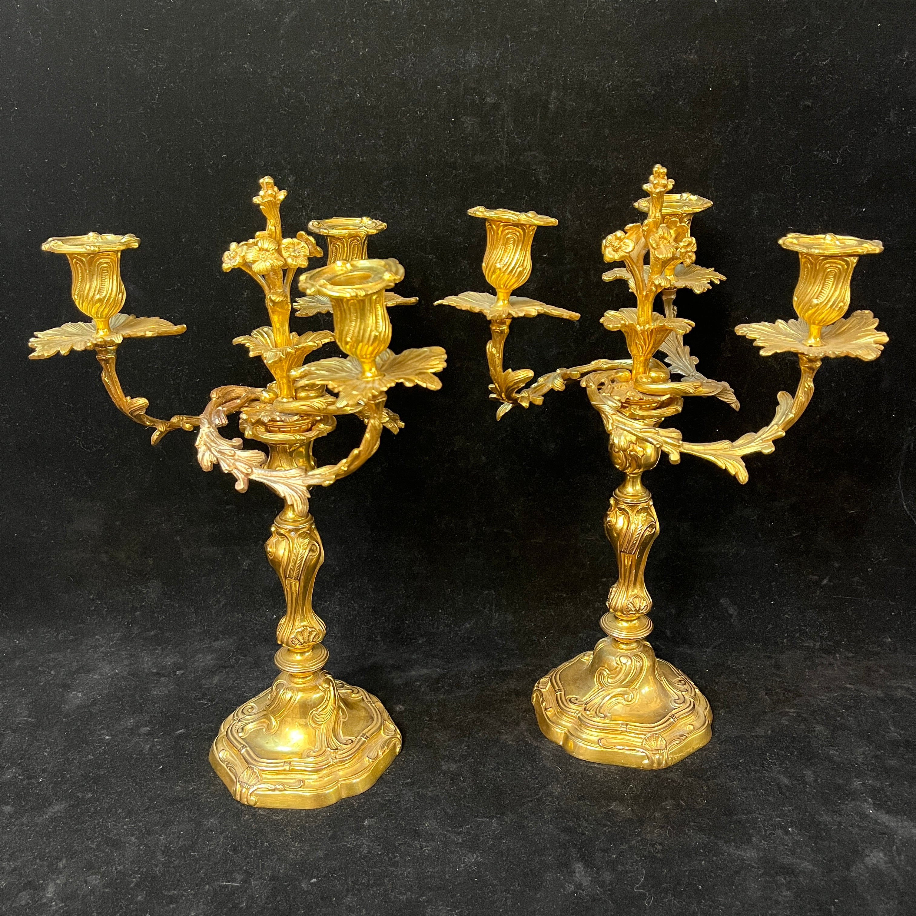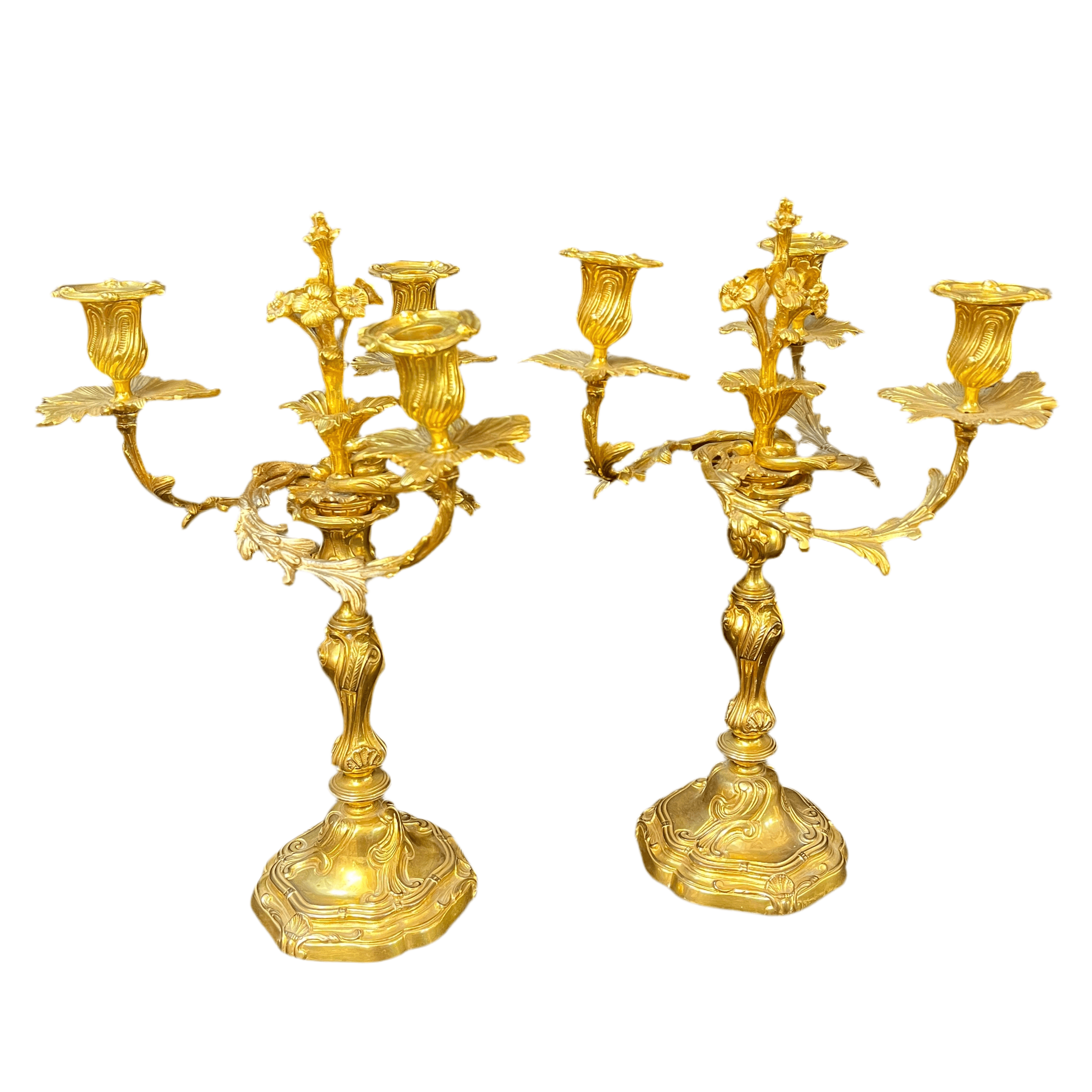 Par de candelabros en bronce ormolú estilo rococó de tres luces s.XIX