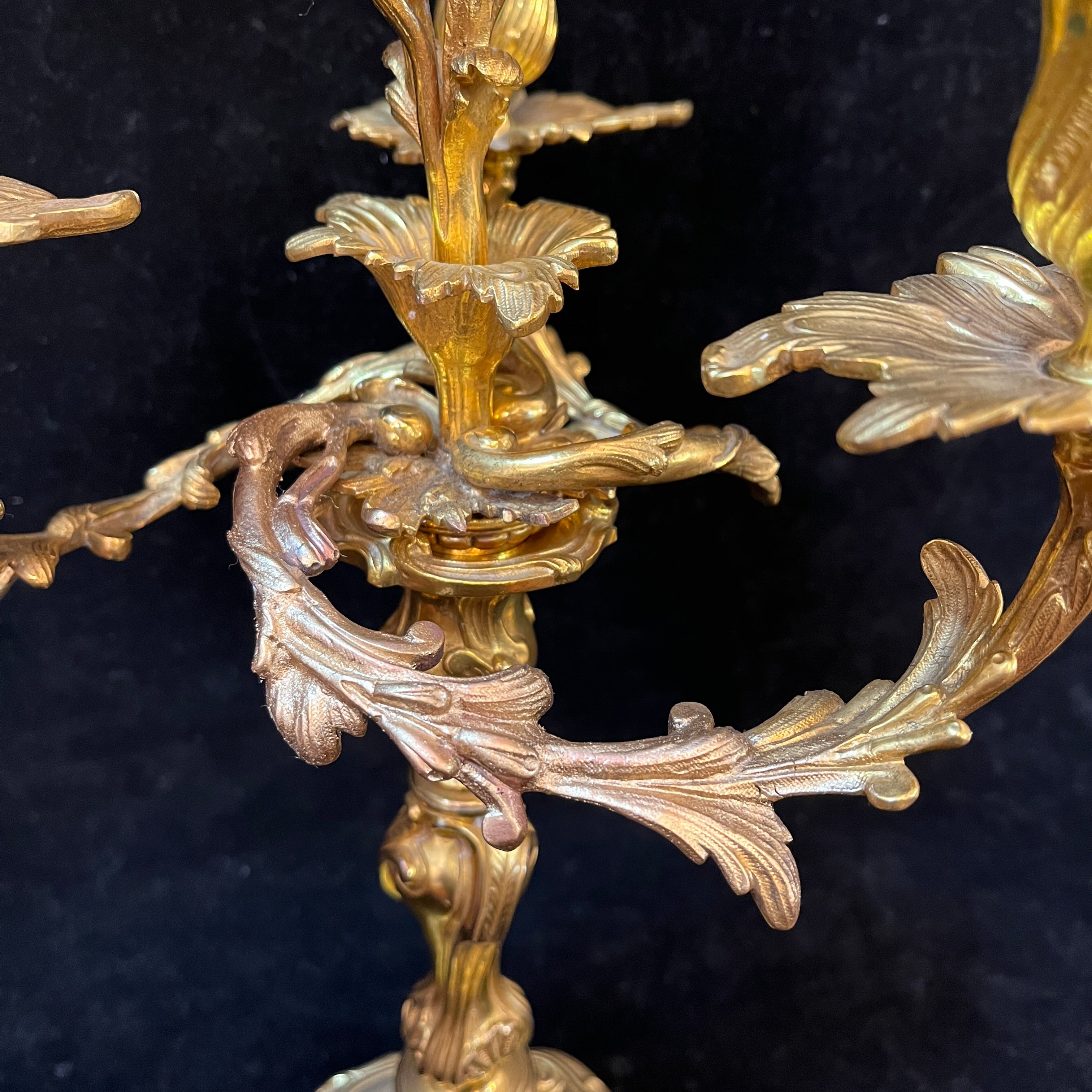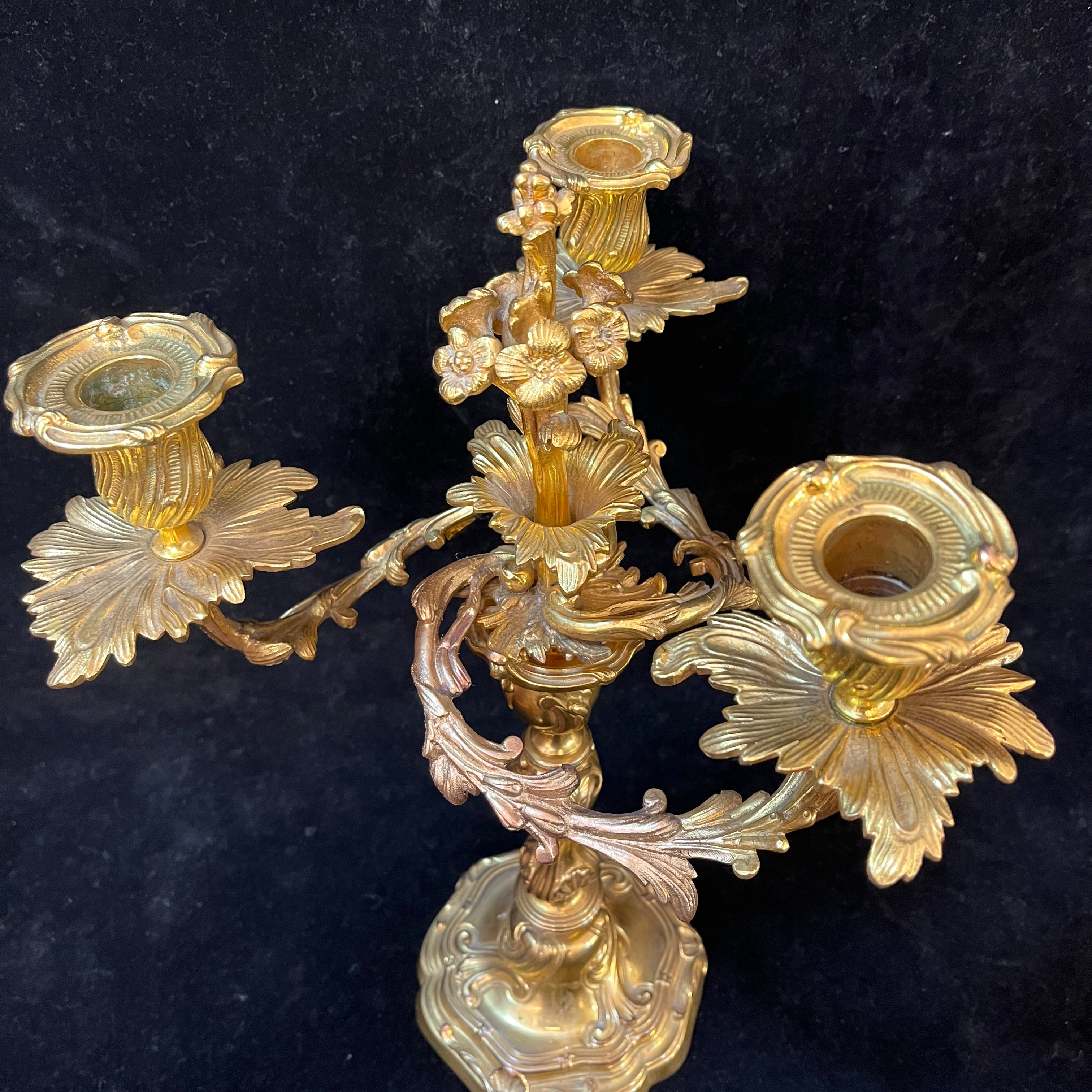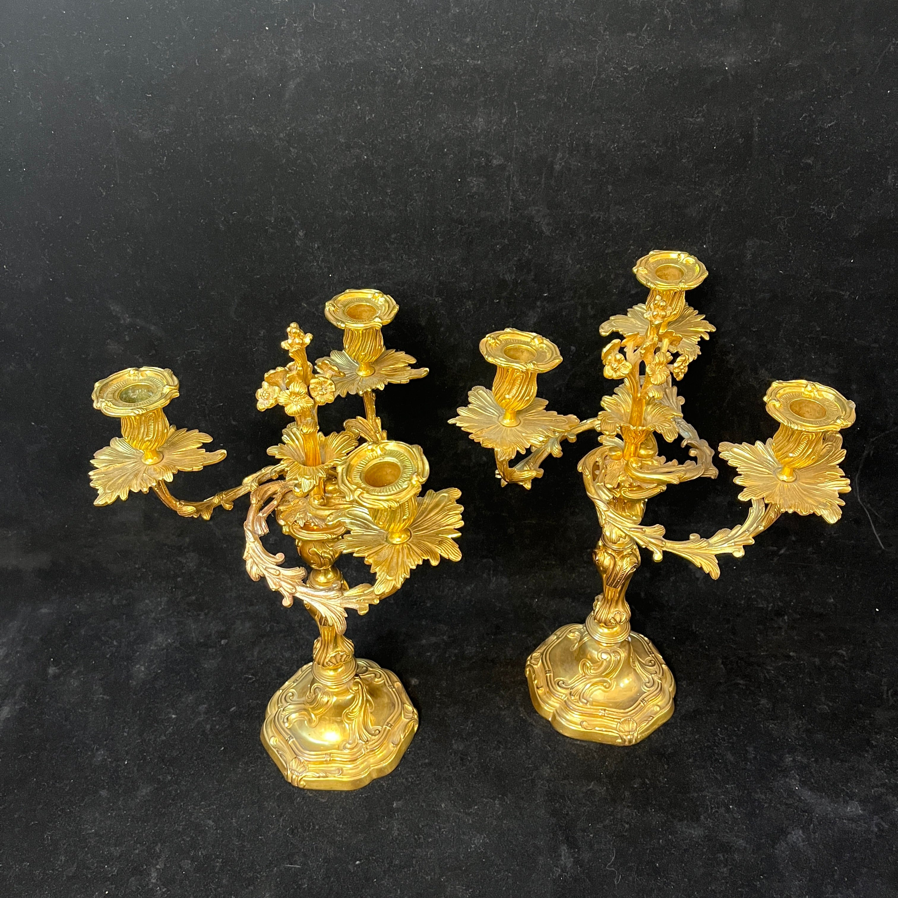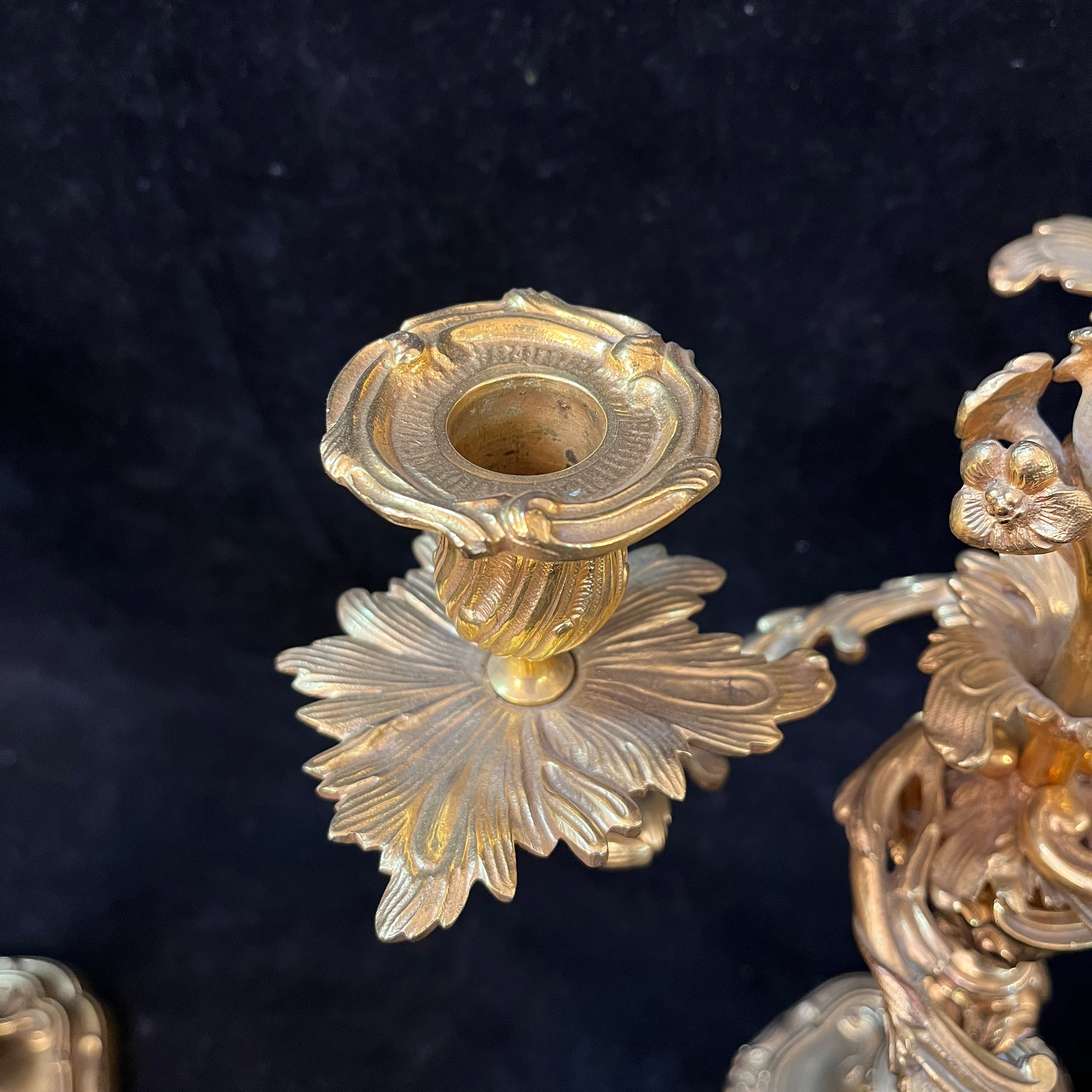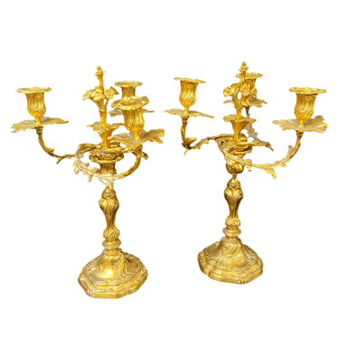 Bellísimo juego de dos candelabros de bronce ormolú, de origen francés de fines del siglo XIX. Cada pieza tiene un diseño de tres luces con elegantes decorados en relieve en su superficie. Las piezas tienen una increíble terminación en su parte superior, con motivos florales en recargado estilo rococó, dándole un punto focal al centro del candelabro.