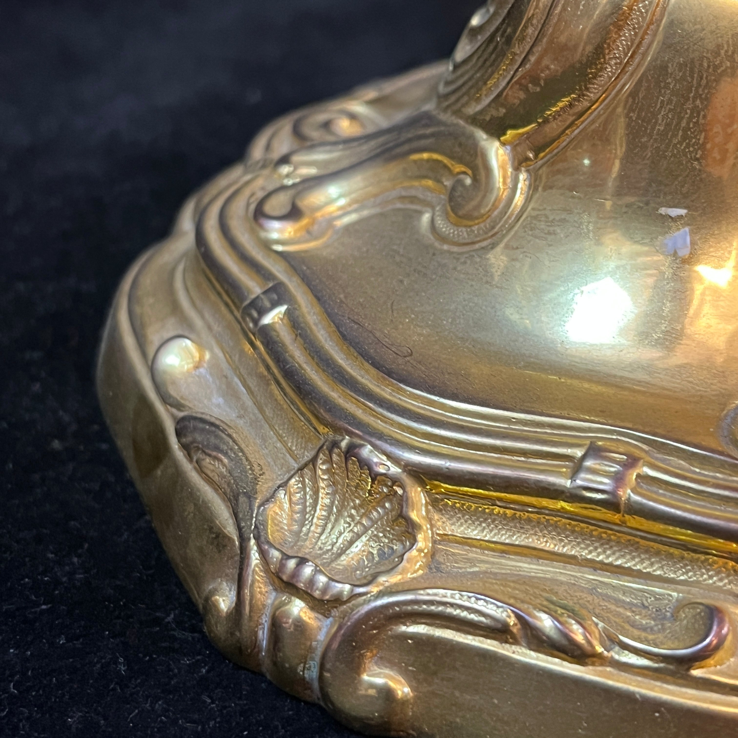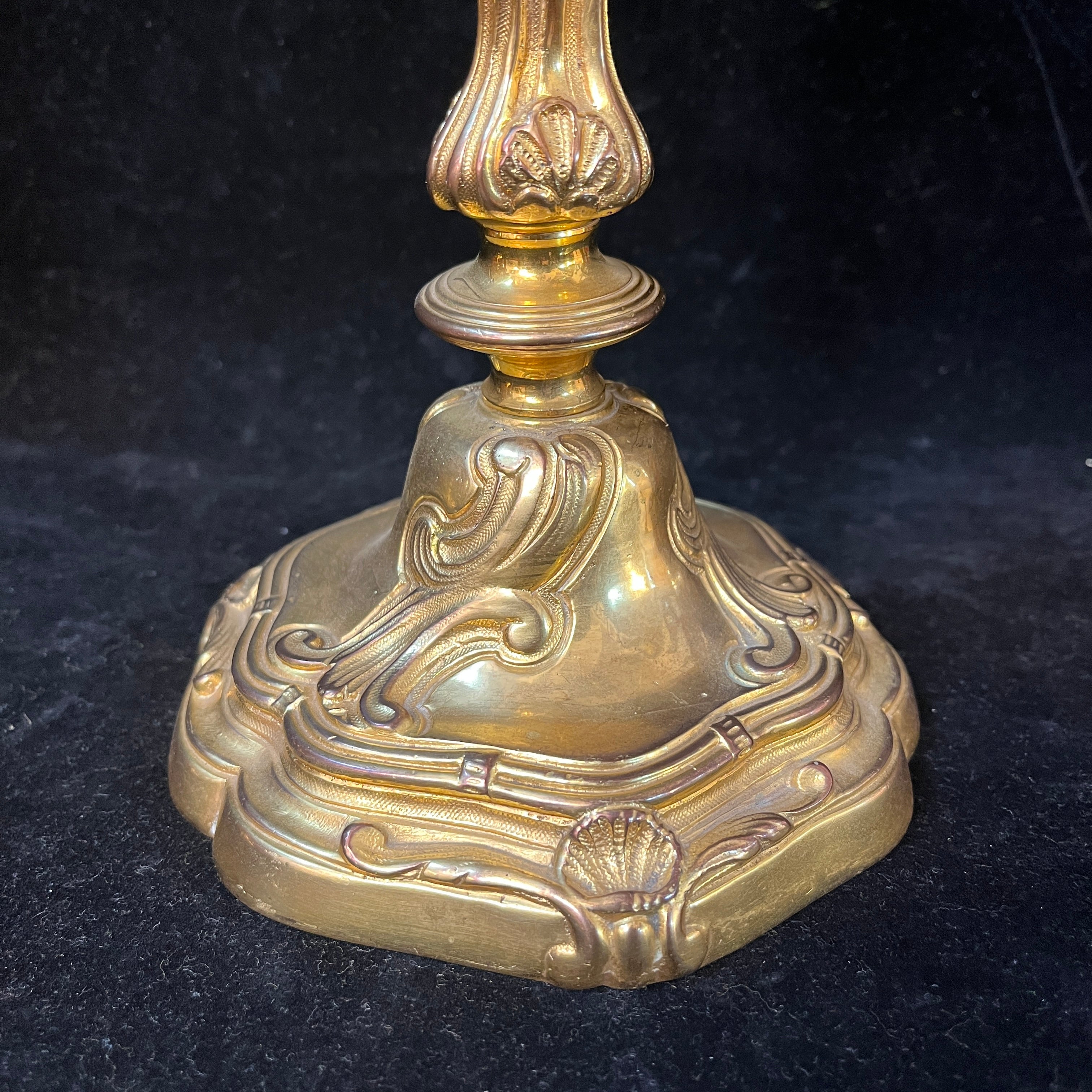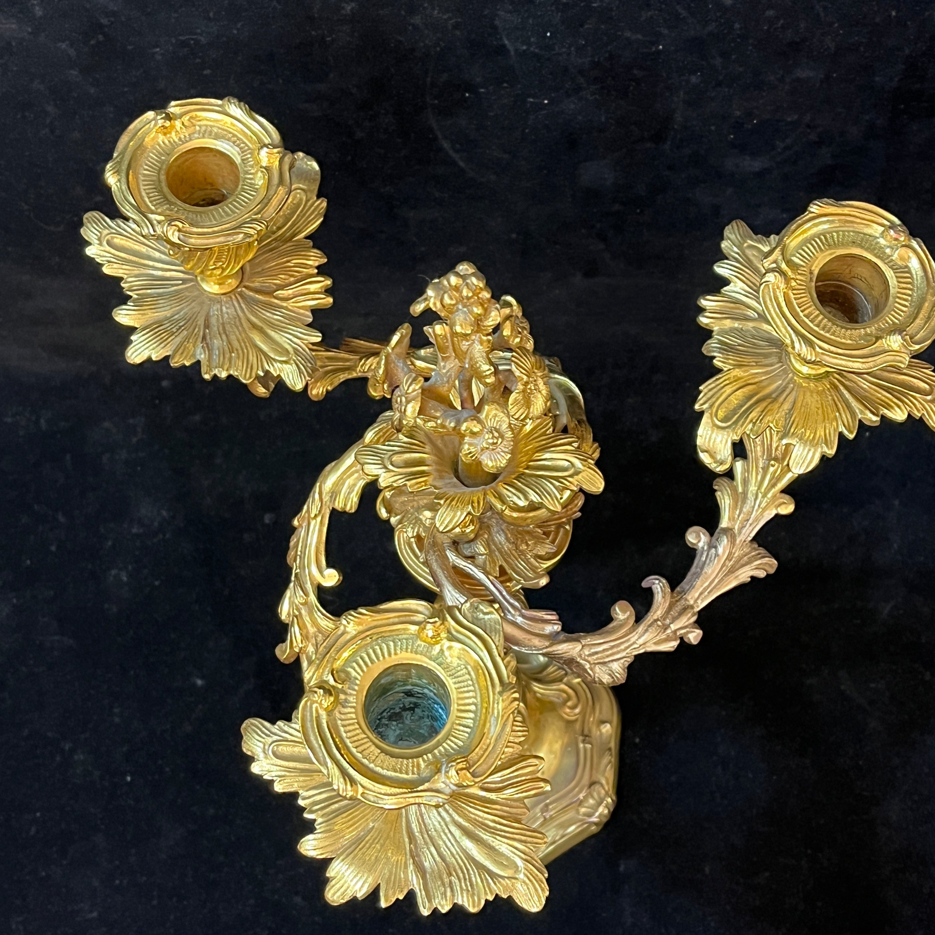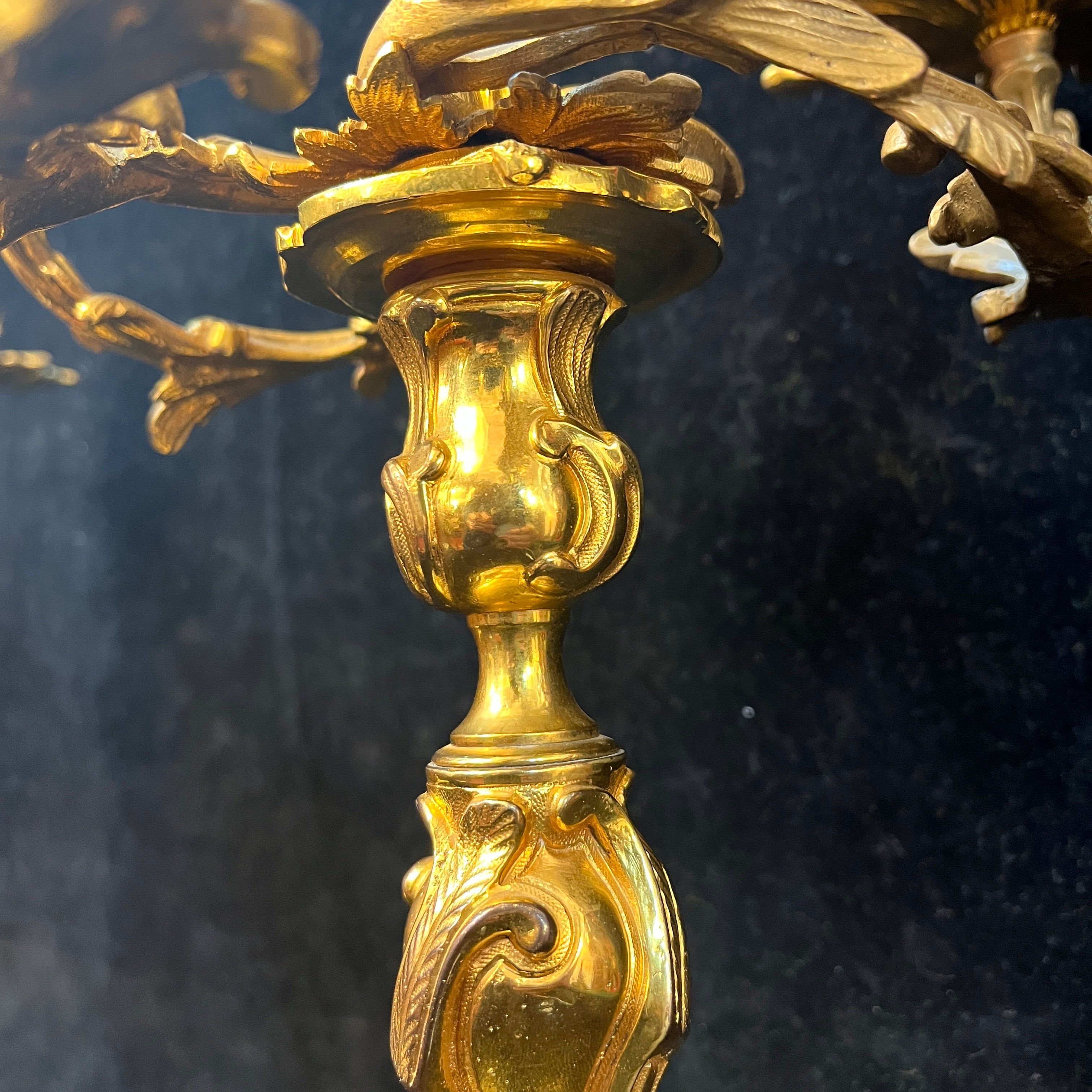 Bellísimo juego de dos candelabros de bronce ormolú, de origen francés de fines del siglo XIX. Cada pieza tiene un diseño de tres luces con elegantes decorados en relieve en su superficie. Las piezas tienen una increíble terminación en su parte superior, con motivos florales en recargado estilo rococó, dándole un punto focal al centro del candelabro.