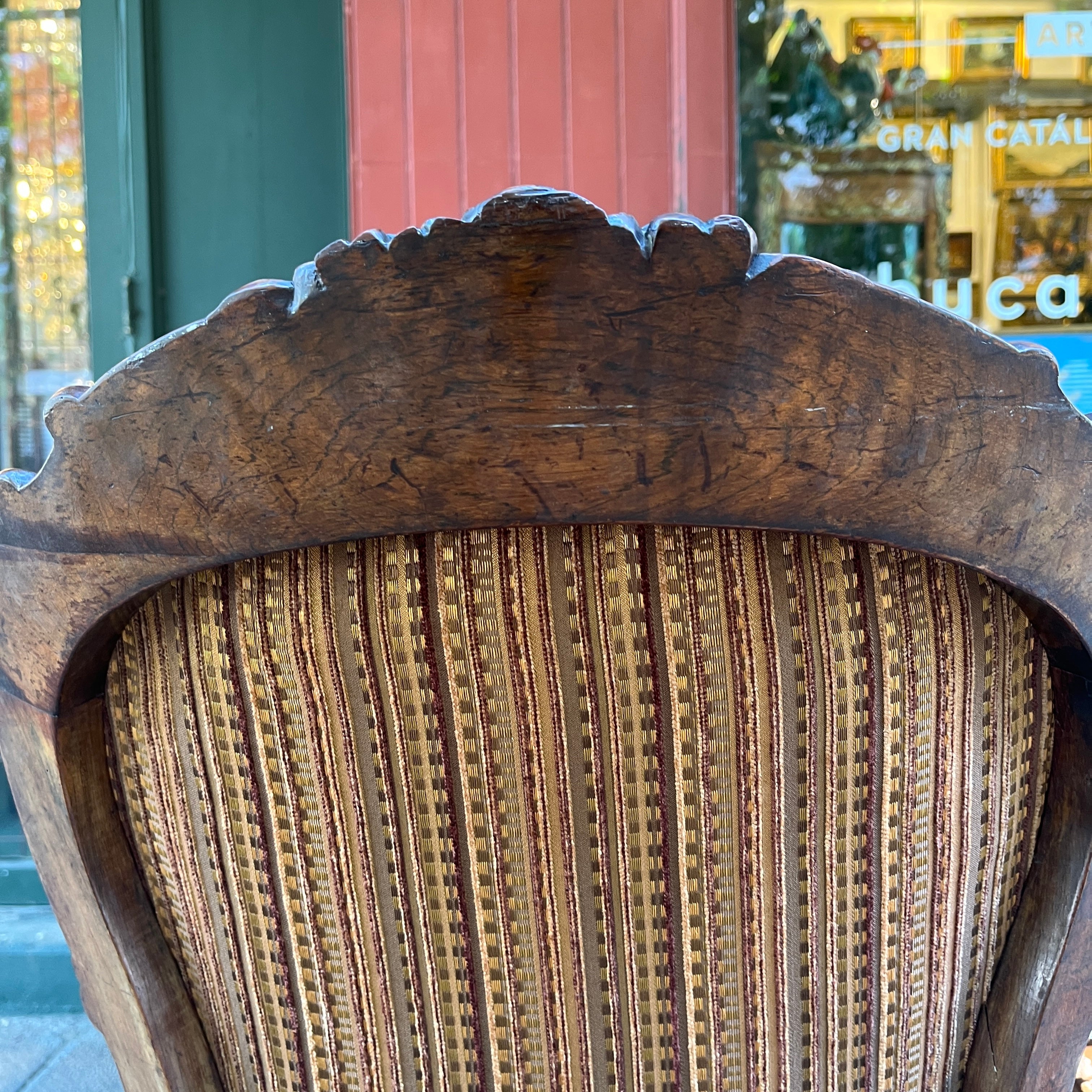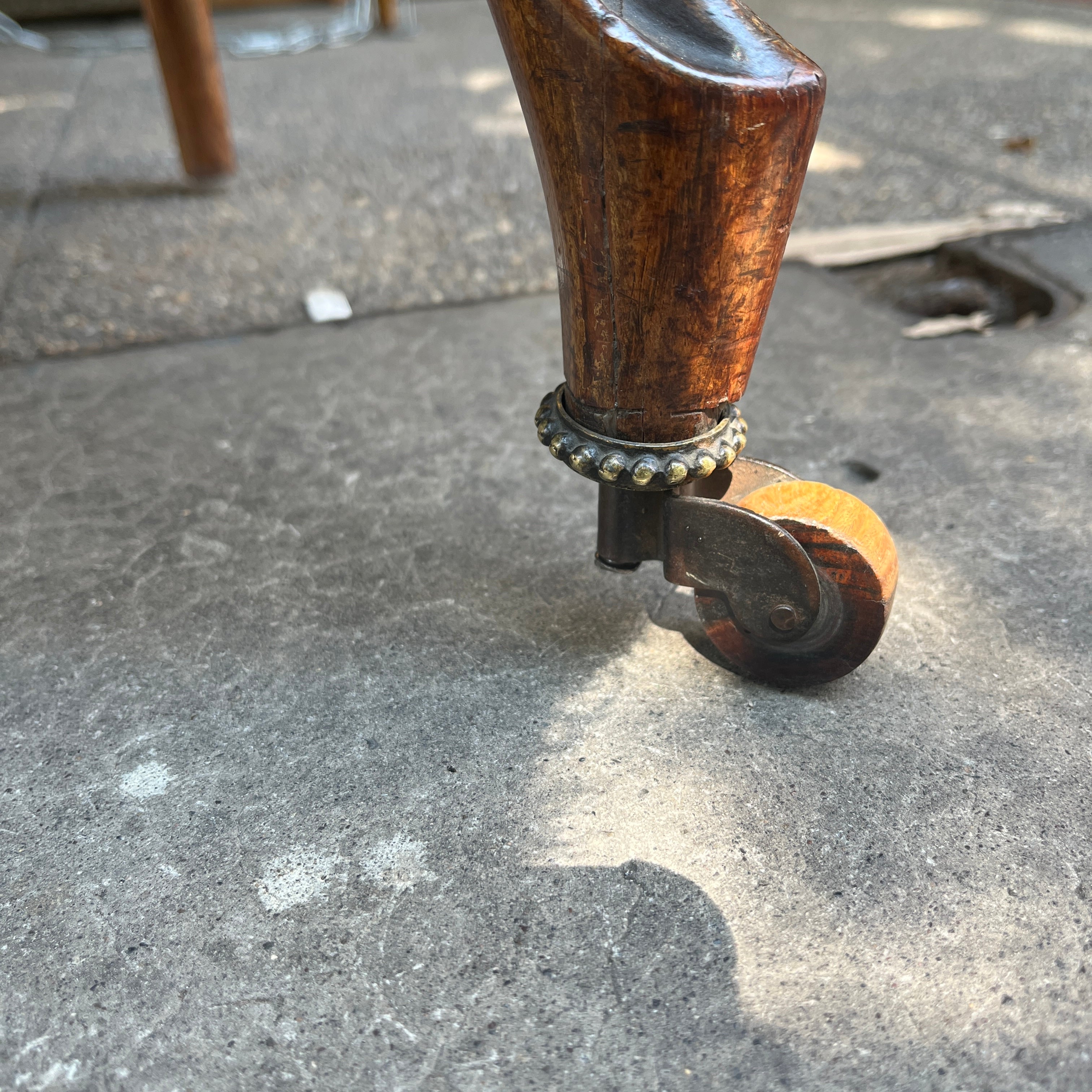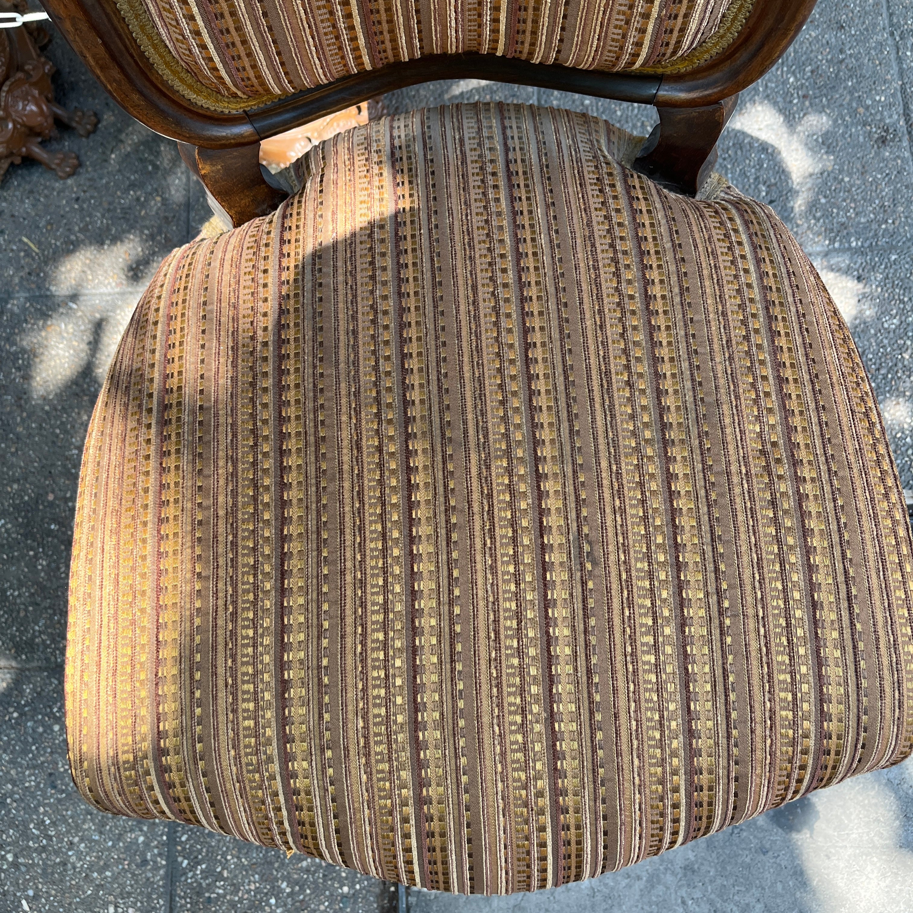 Finísimas sillas francesas estilo victoriano en madera jacarandá, con un delicado tallado floral en su respaldo que realza la belleza de la madera sin recargarla. Tiene dos hermosas ruedas de madera en sus patas delanteras con una sutil corona de bronce, que facilitan su desplazamiento y otorgan un detalle especial en su confección. El tapiz es contemporáneo, sin embargo no altera el estilo de las sillas.