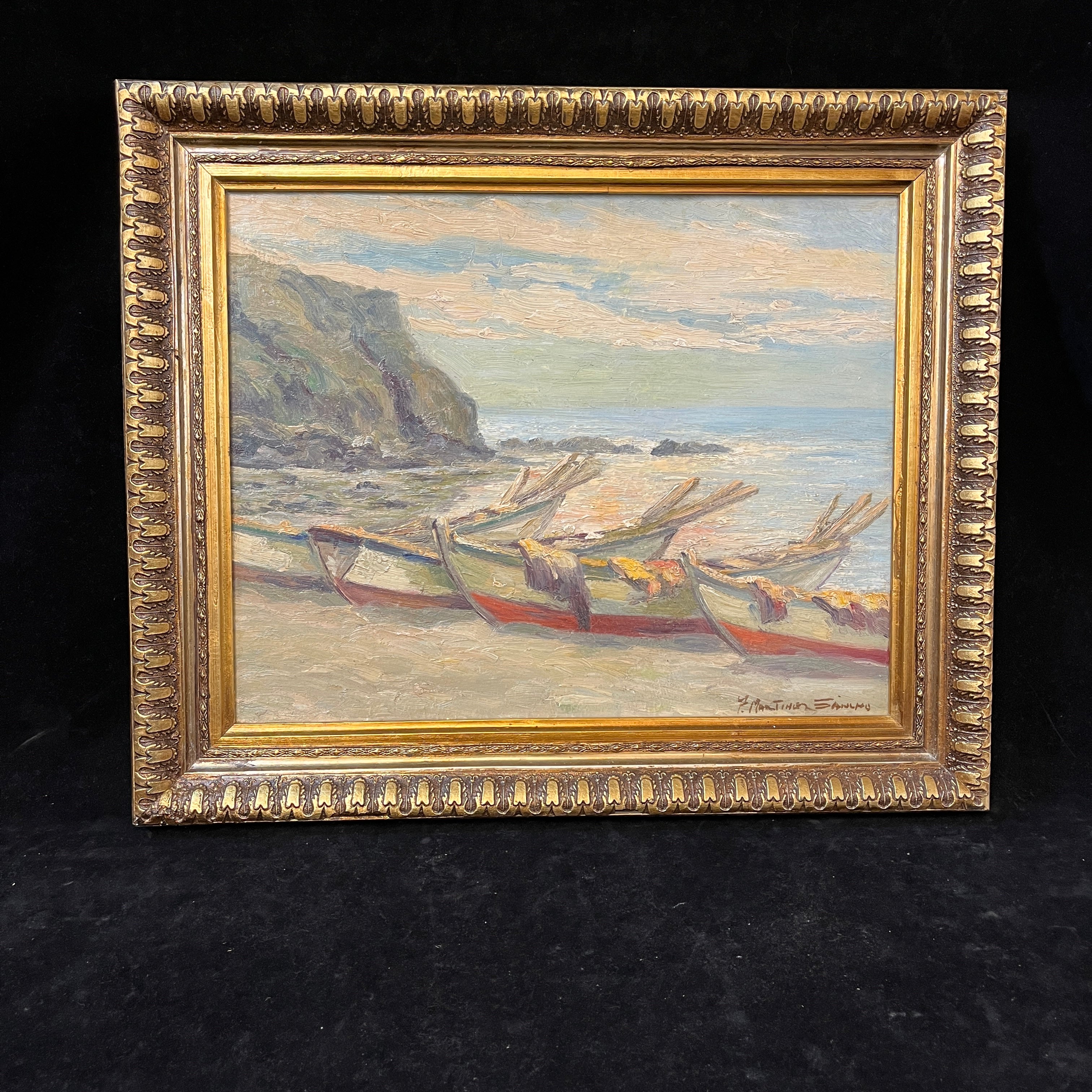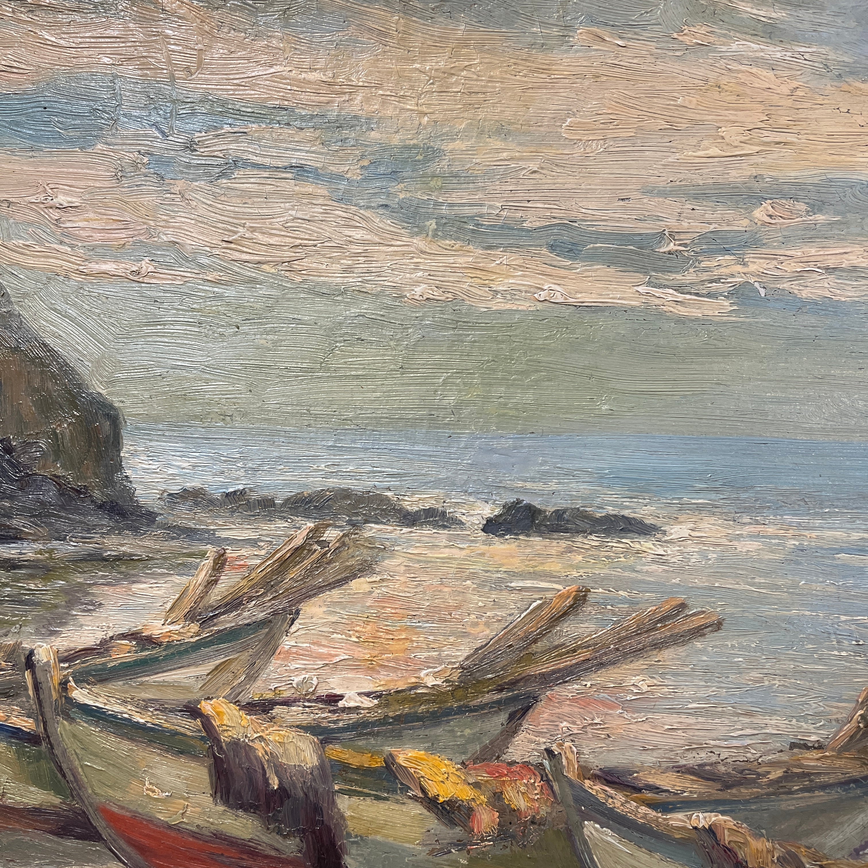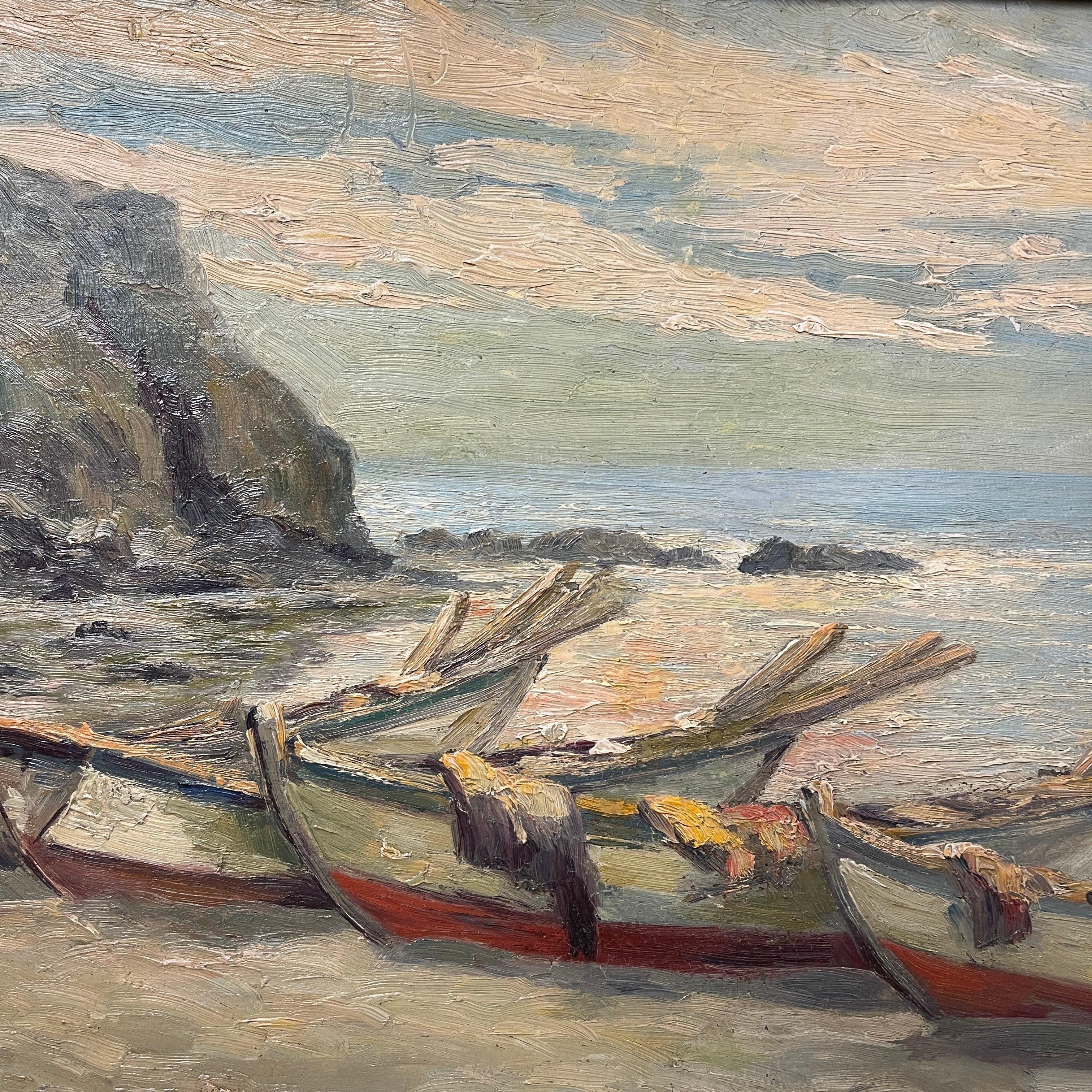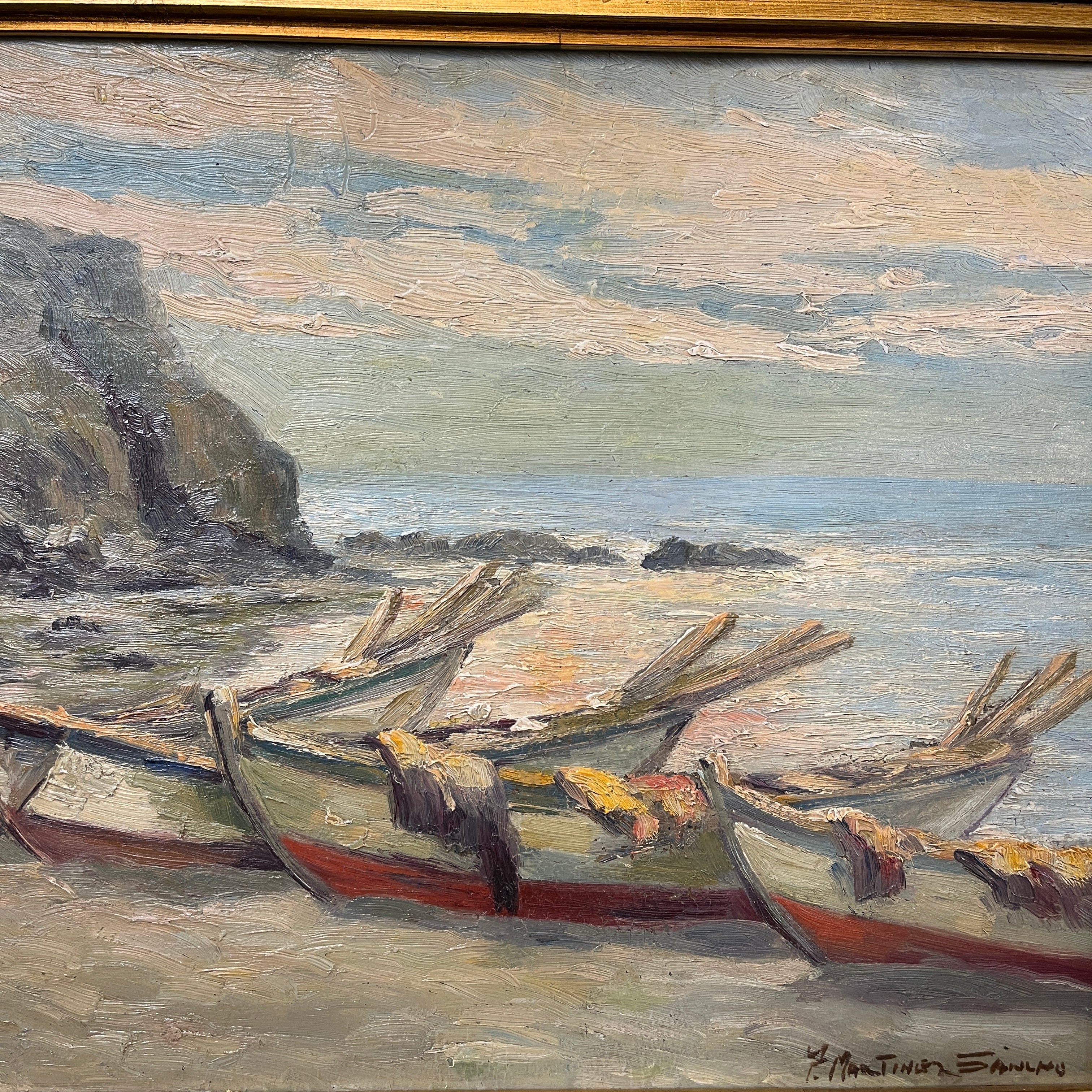 Apacible pintura con motivo costero del reconocido pintor chileno Pedro Martínez Sancho, que son muestra cinco botes pesqueros varados en la arena, con un acotada silueta de rocas en el fondo.