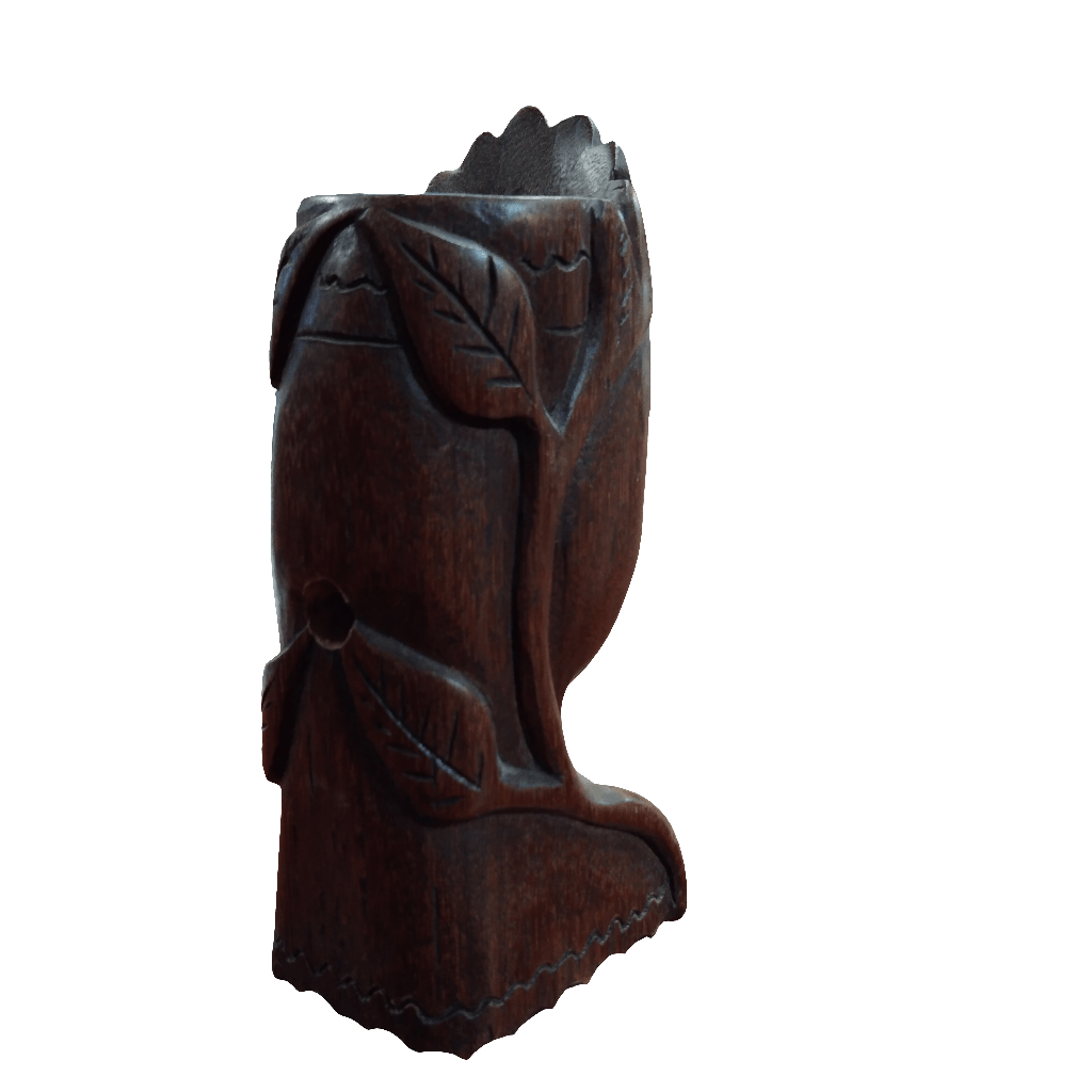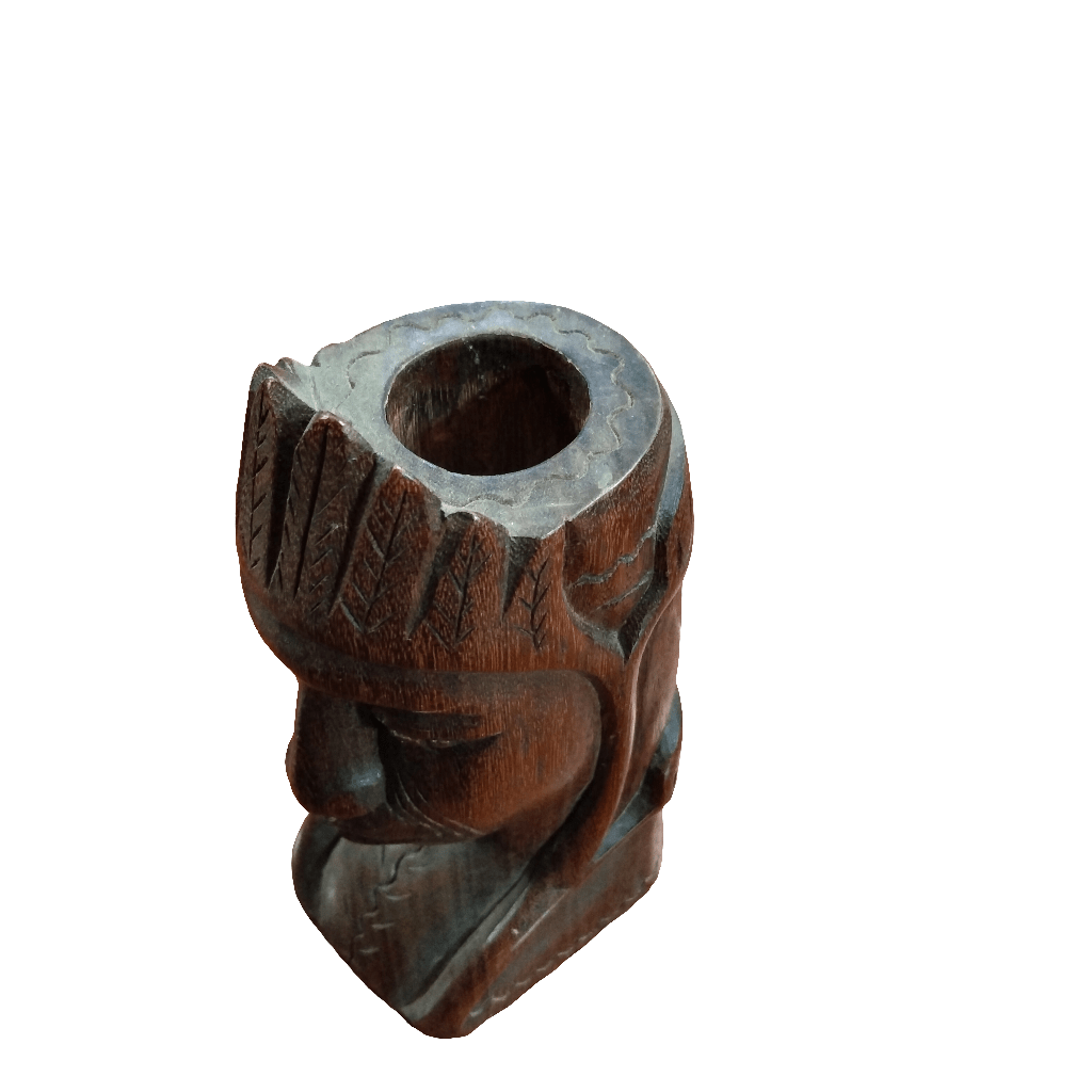 Llamativa escultura en madera tallada a mano, representando el rostro de un hombre nativo americano', rodeado de ramas. La escultura presenta un hueco en su parte superior y está firmada por Pedro R, en el 2012.