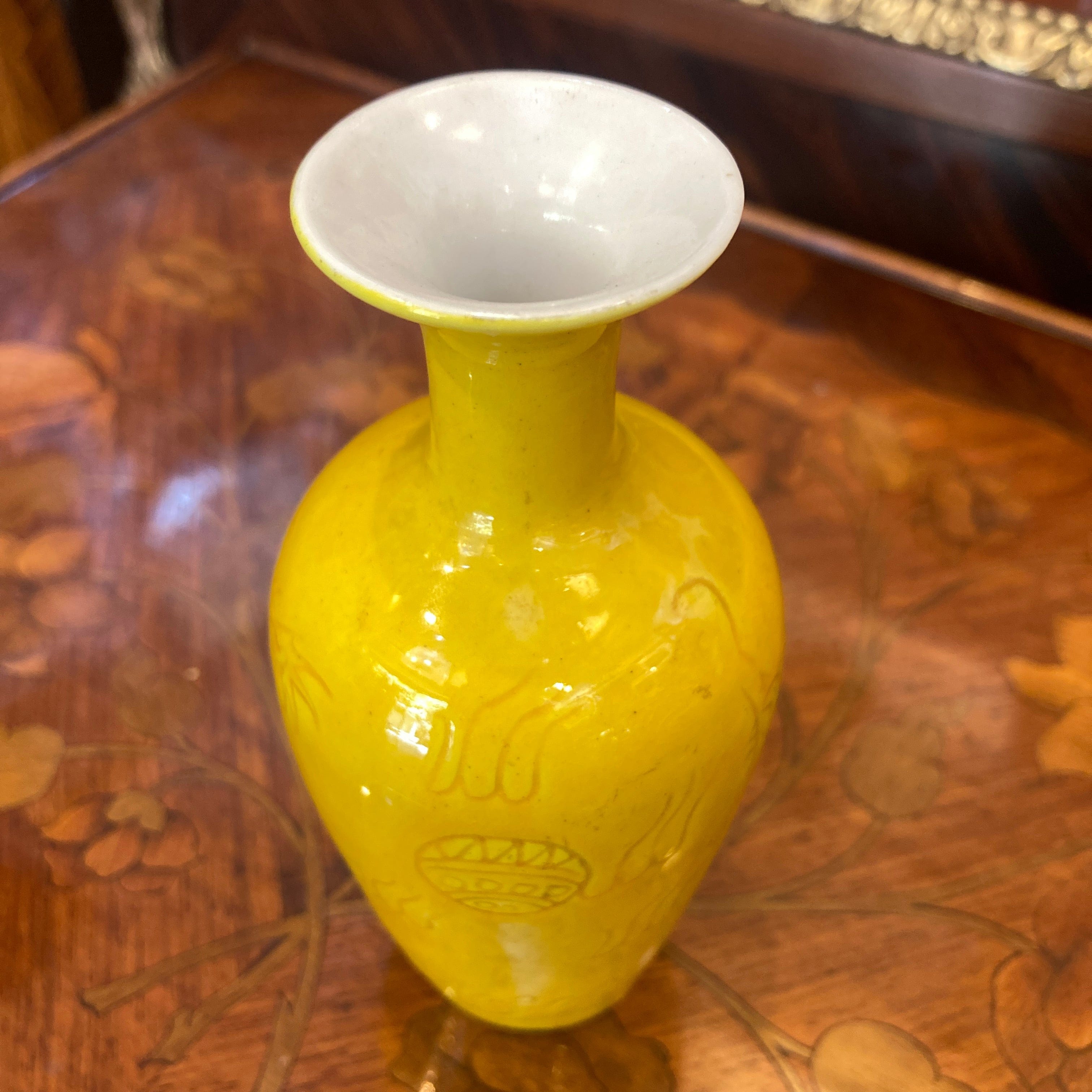 Bello jarroncito de porcelana amarilla, con sutil diseño tallado en su contorno.