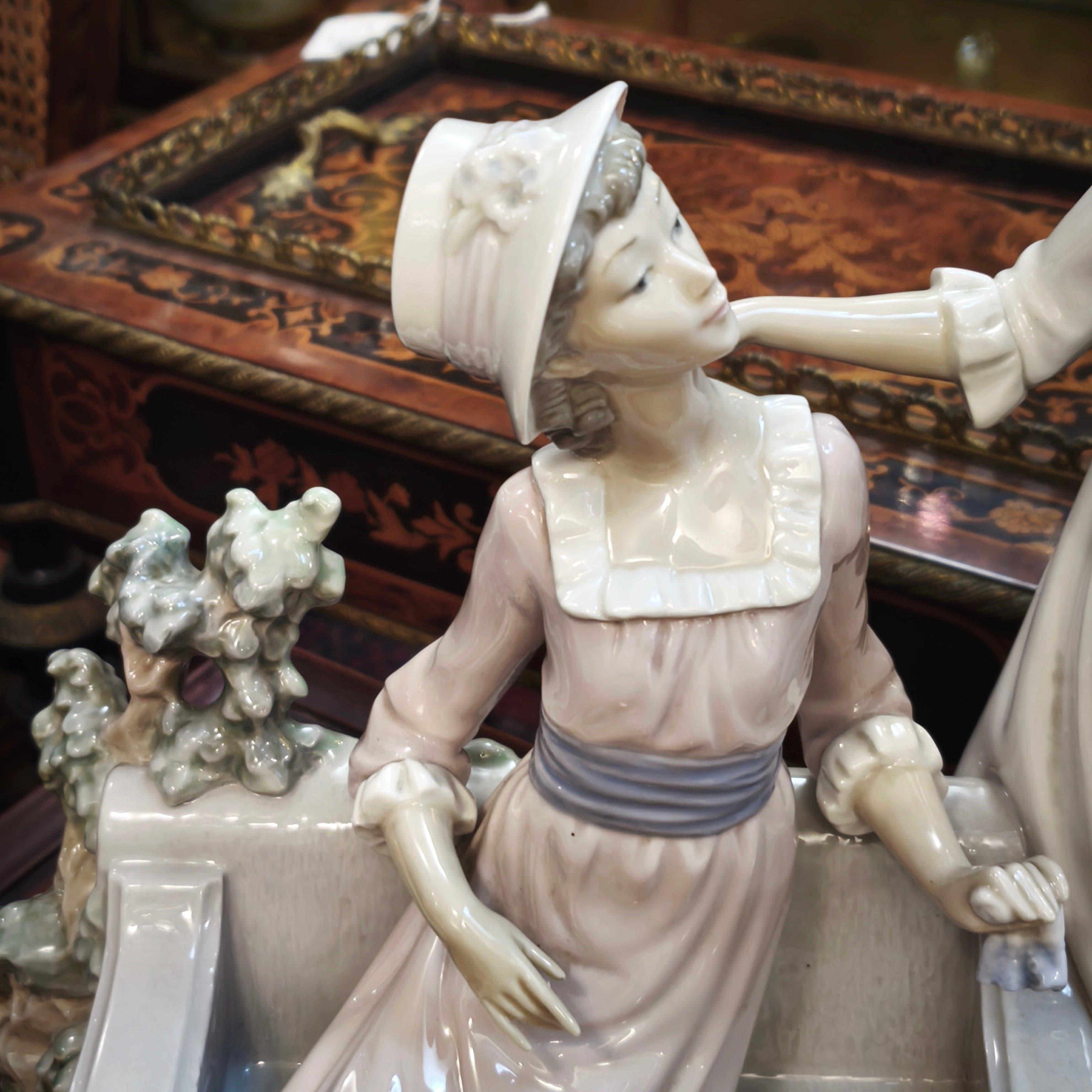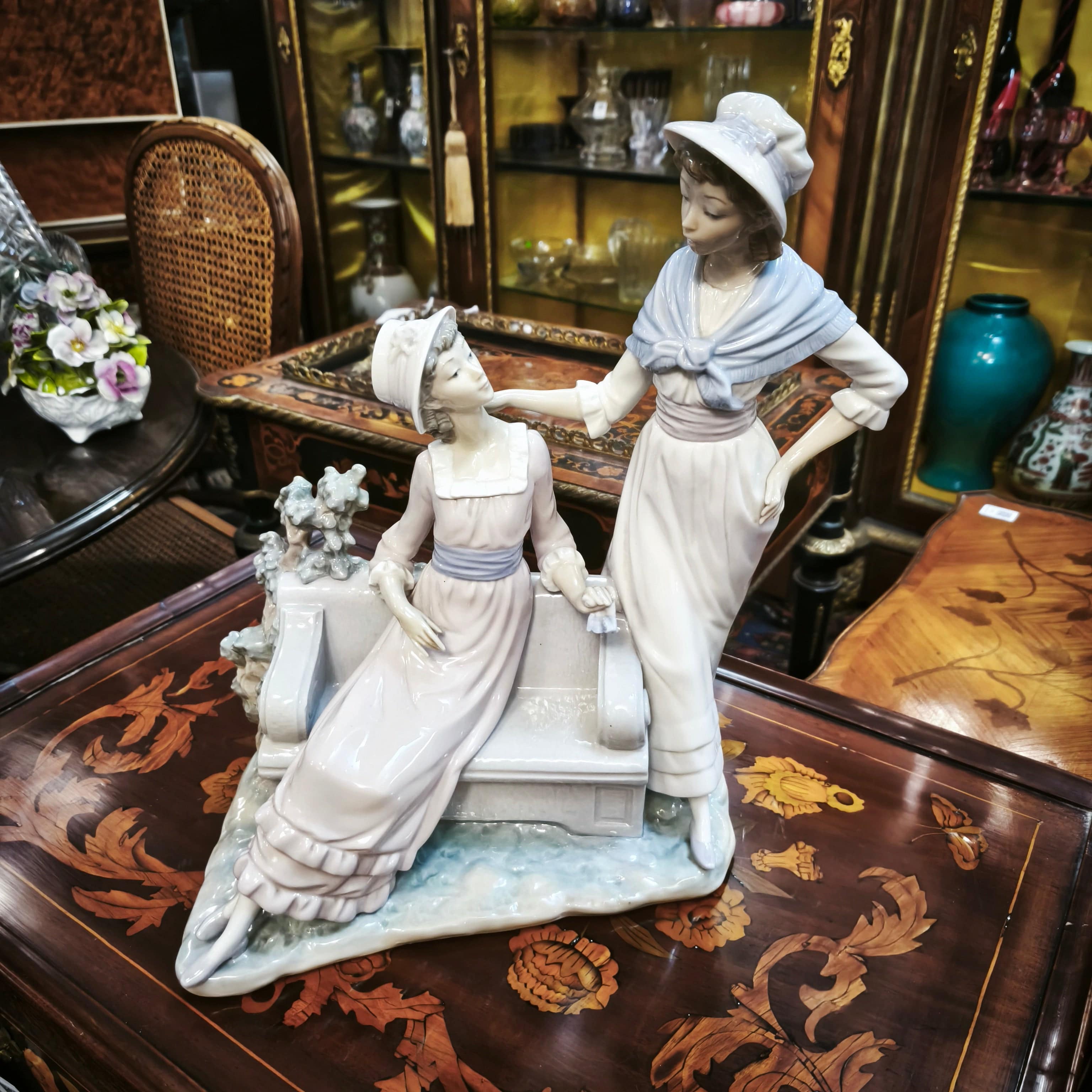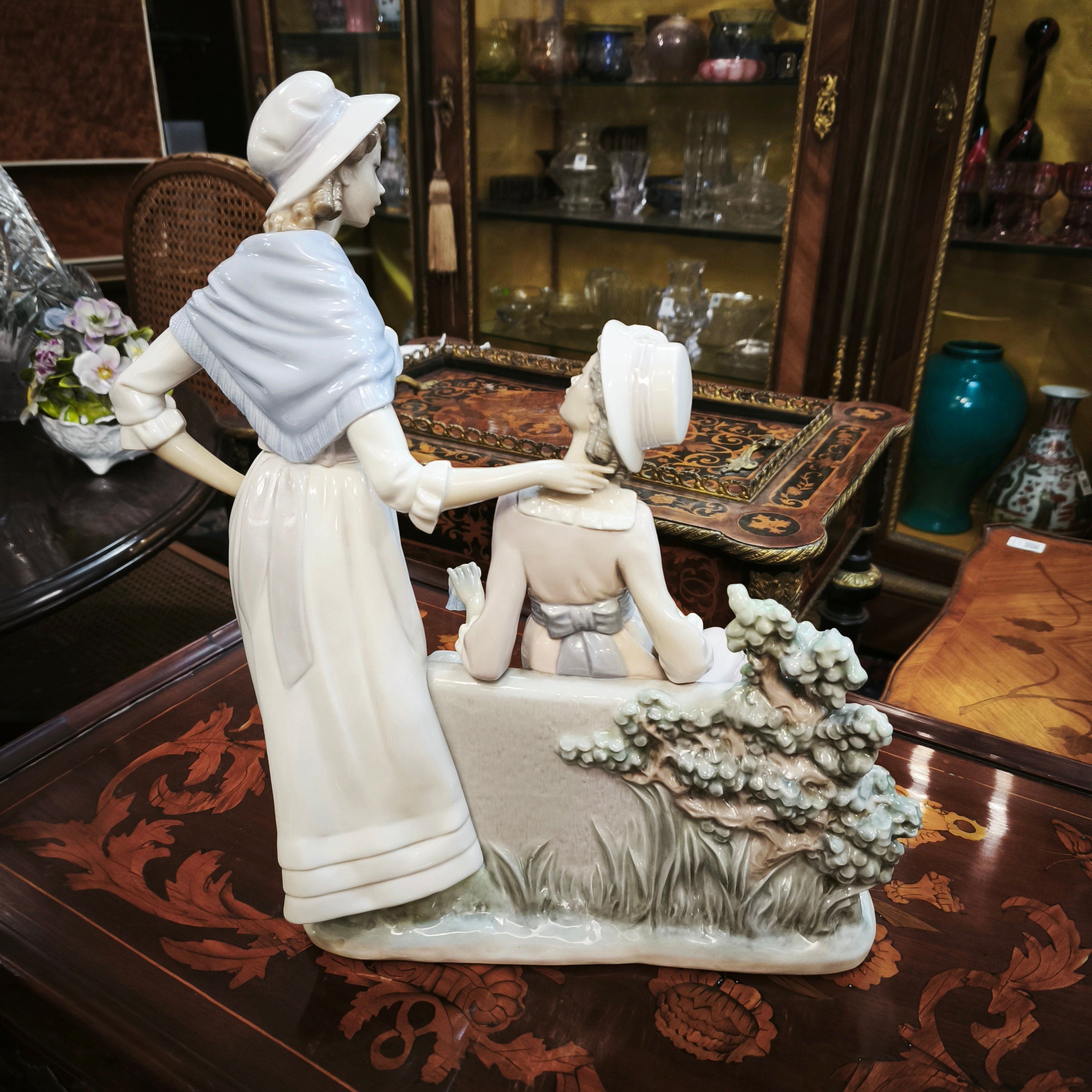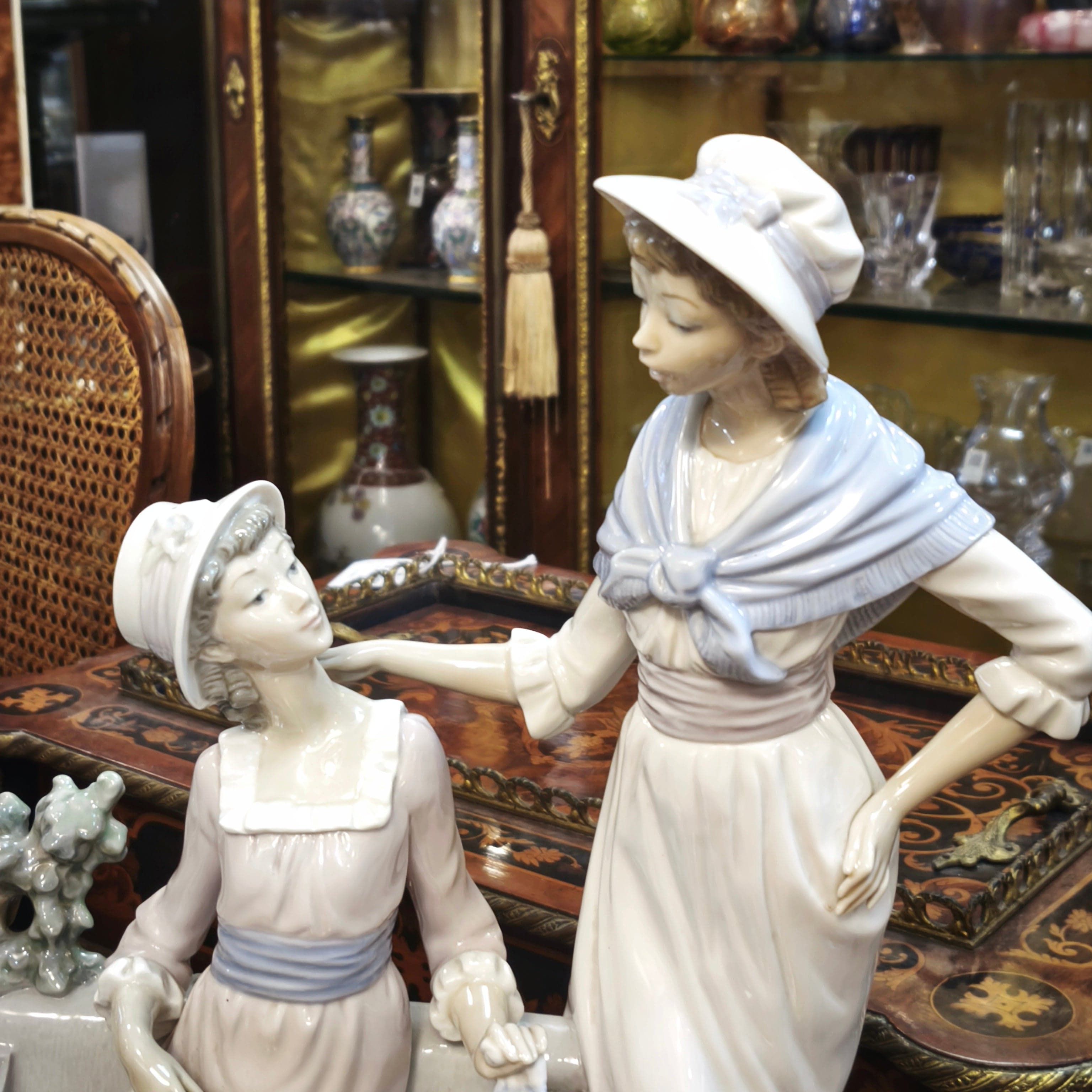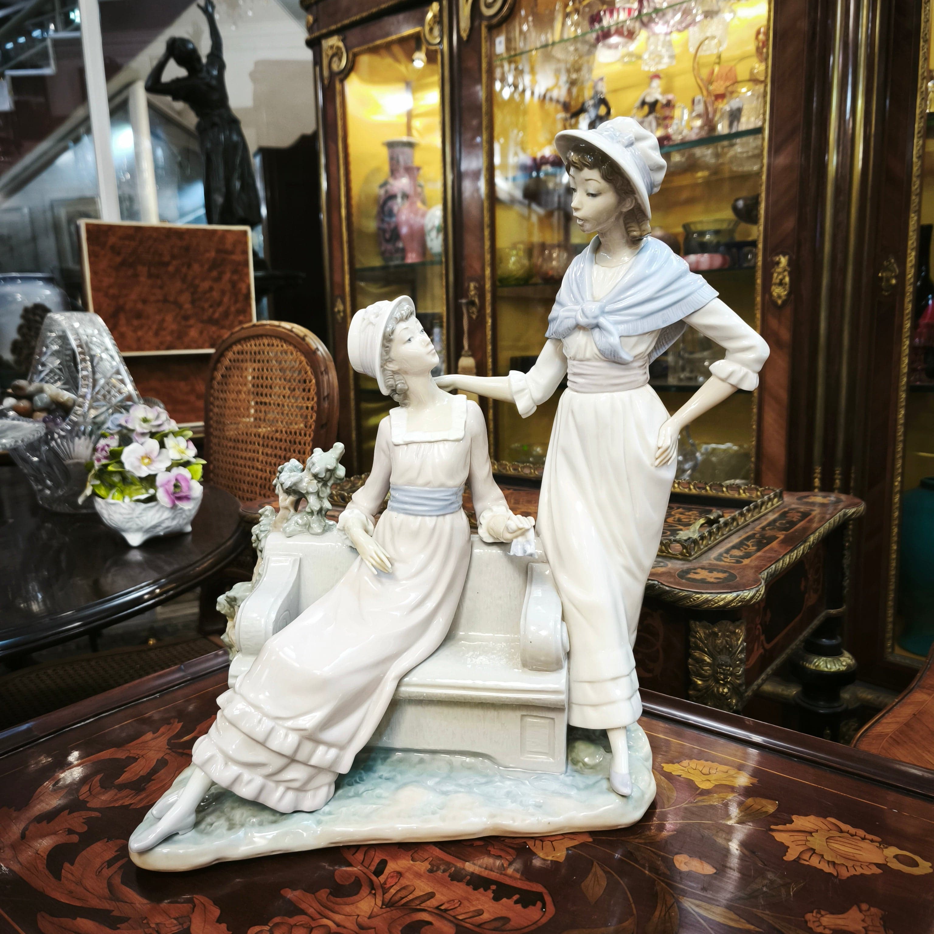 Bella figura de porcelana de la marca española Lladró, en la cual podemos ver dos mujeres que parecieran que conversan, una está sentada en la banca y la otra al costado.