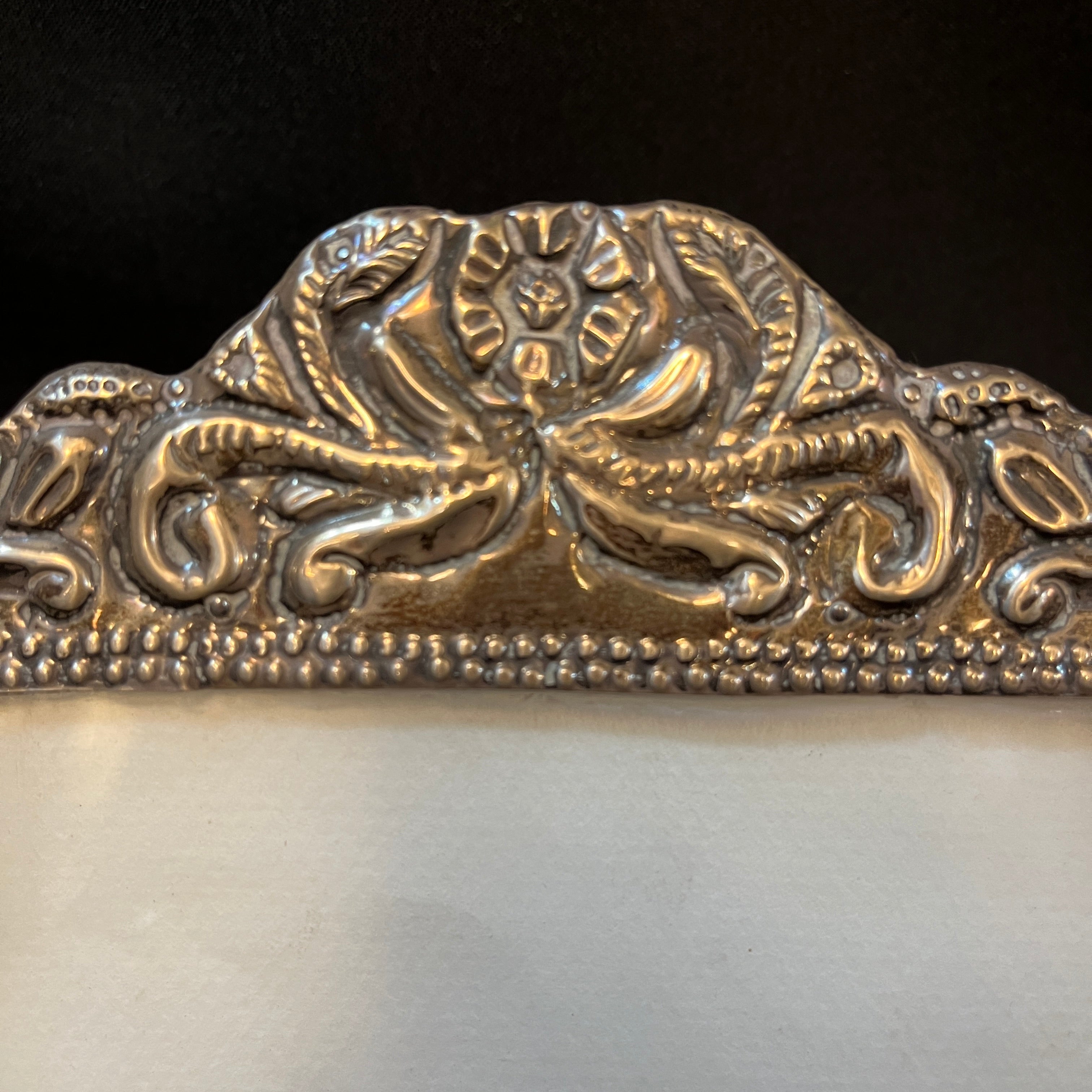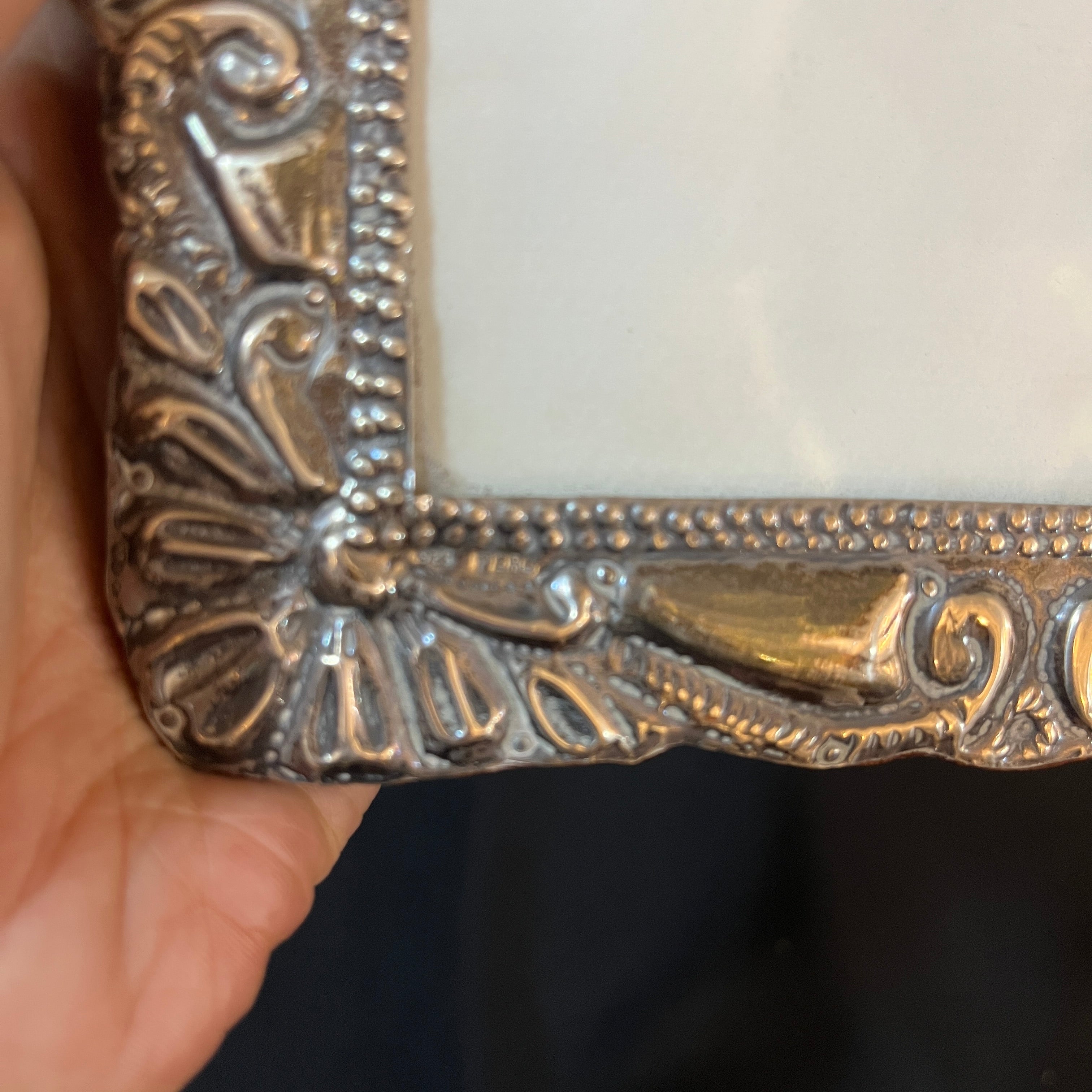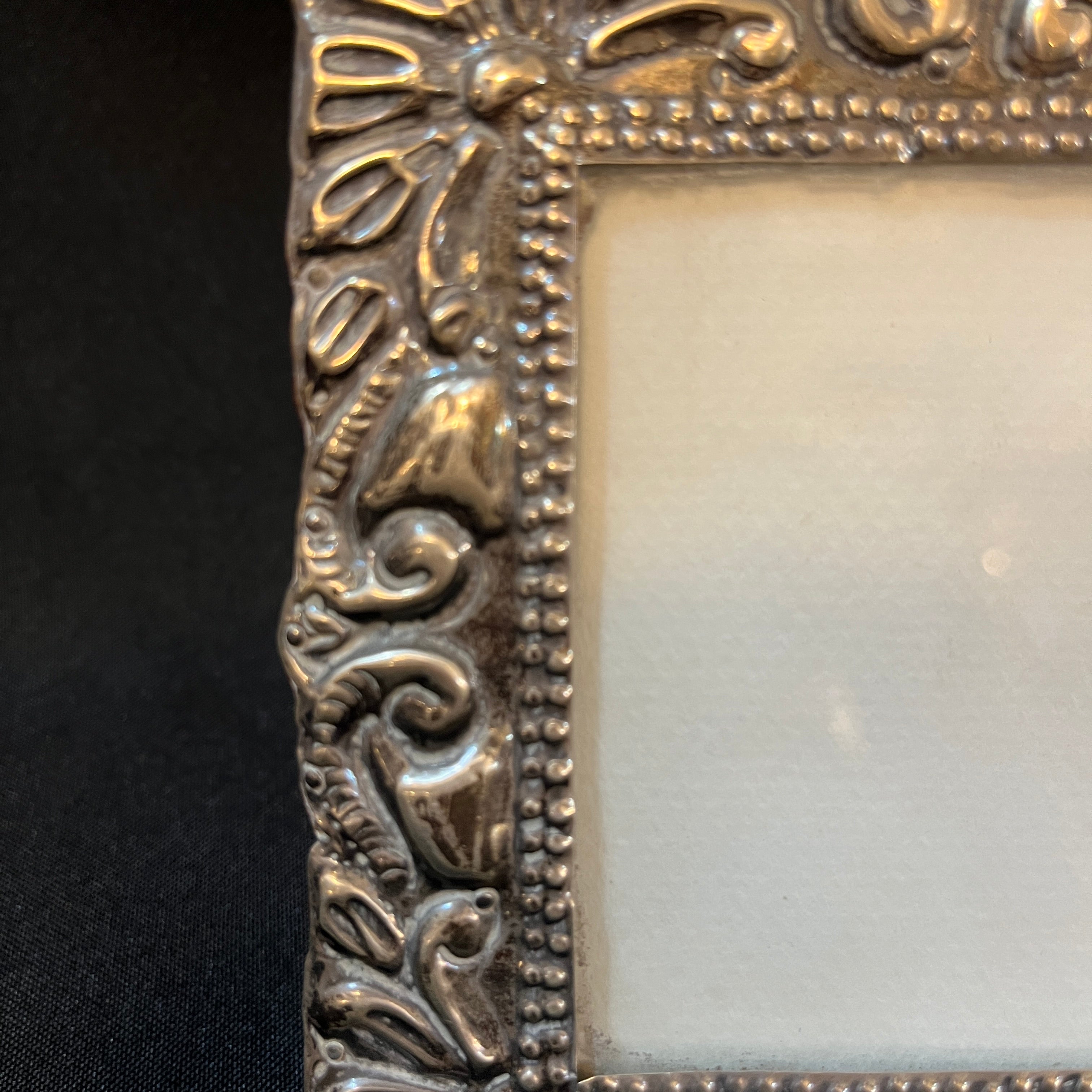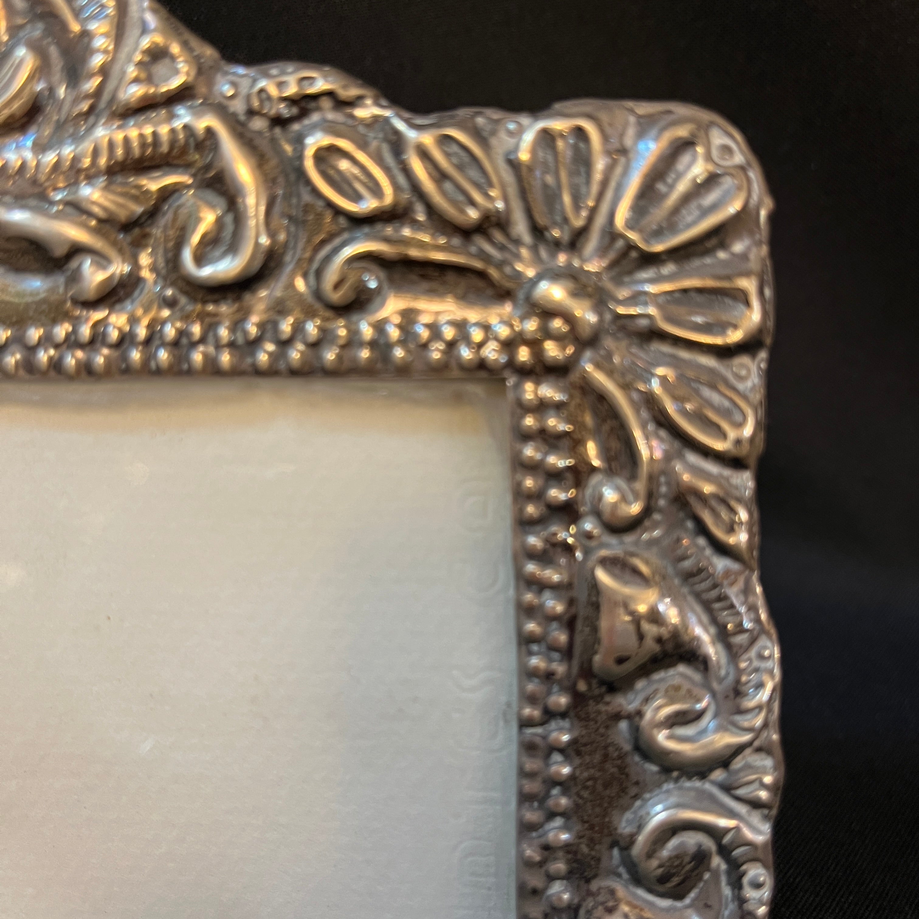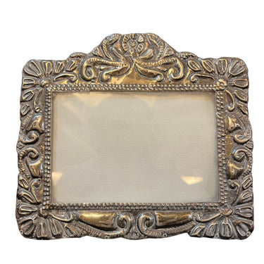 Delicado portarretrato horizontal hecho a mano, de madera con lámina de plata peruana con delicada ornamentación de flores grandes talladas en las esquinas y una gran flor en el centro. En el centro del marco tiene una bella corona con doble cuentas de plata, que otorga más profundidad. Se puede apreciar el sello de la plata en una de las esquinas inferiores del marco y también en una de las fotografías.