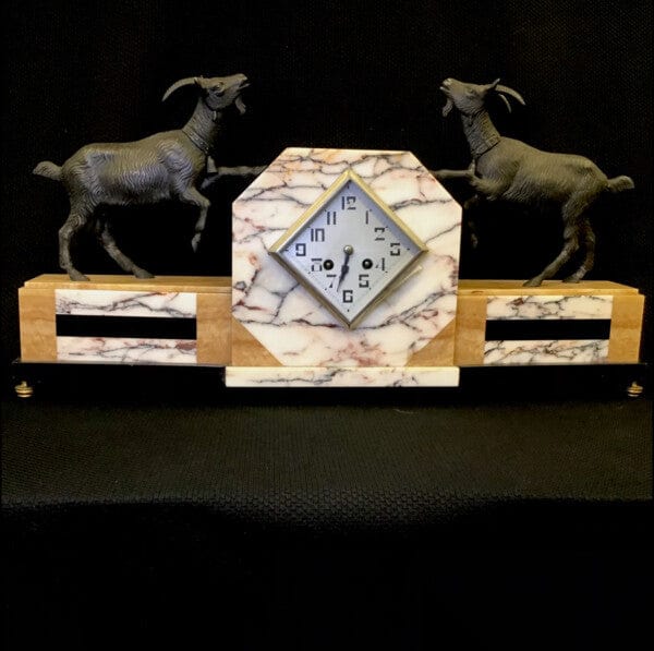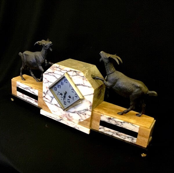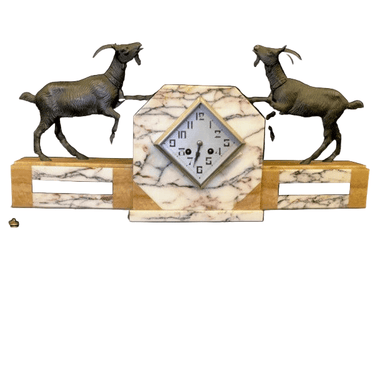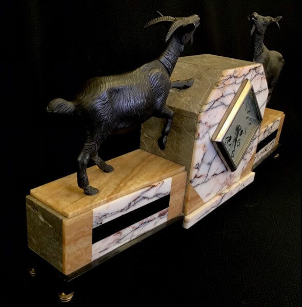 Reloj estilo Art decó. Base en distintos tipos de mármol, y figuras de cabras o chivos en peltre a cada costado del reloj.