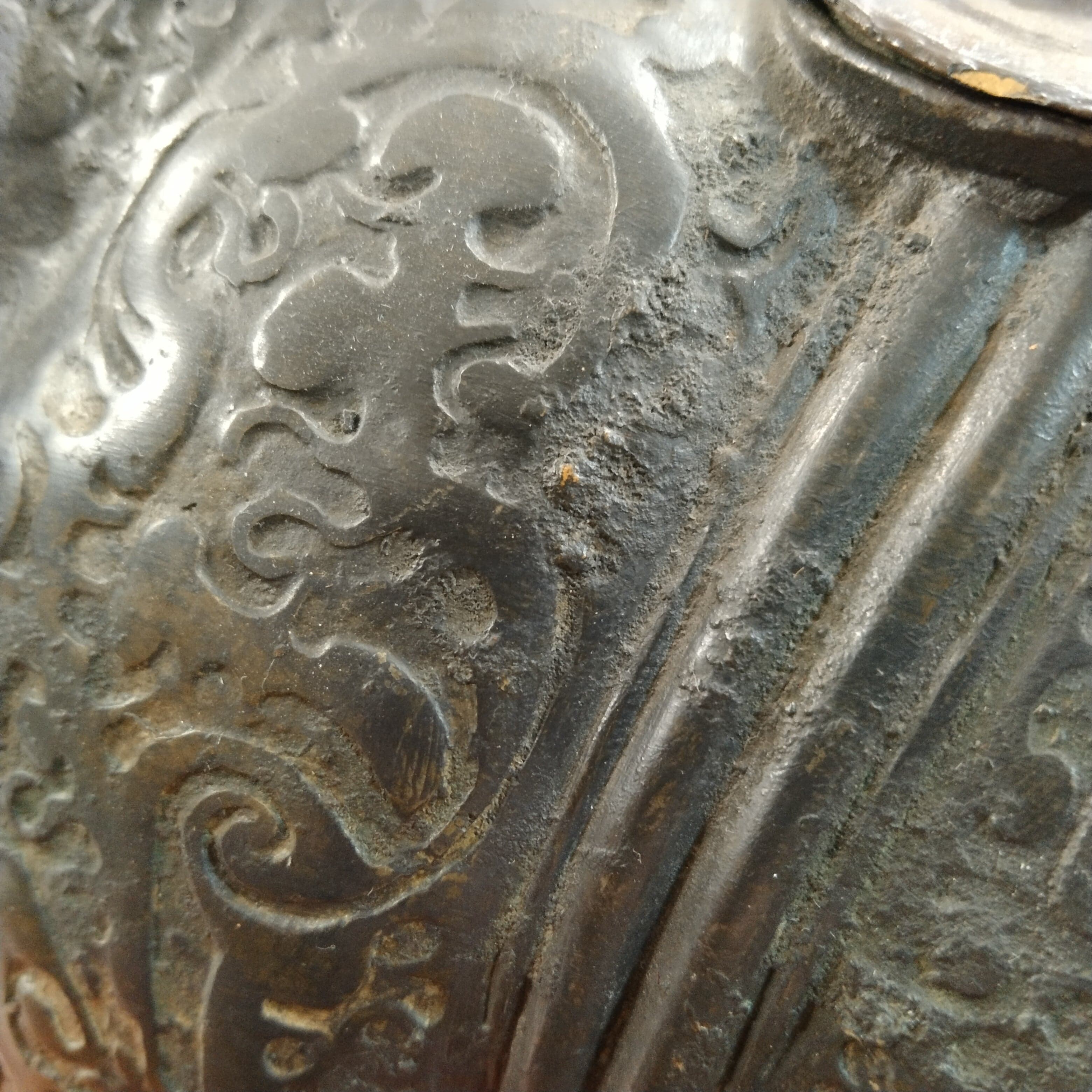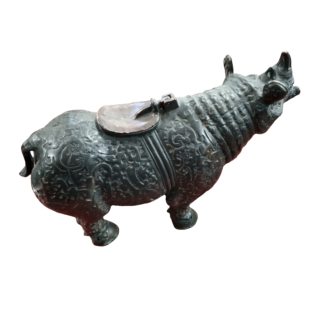 Particular figura en bronce, de origen chino, representando a un magnífico rinoceronte gris, tradicional de esta zona de Asia, con detallados relieves tallados en su cuerpo. La pieza tiene una tapa de bronce en su lomo, haciendo que se utilice como sahumador.