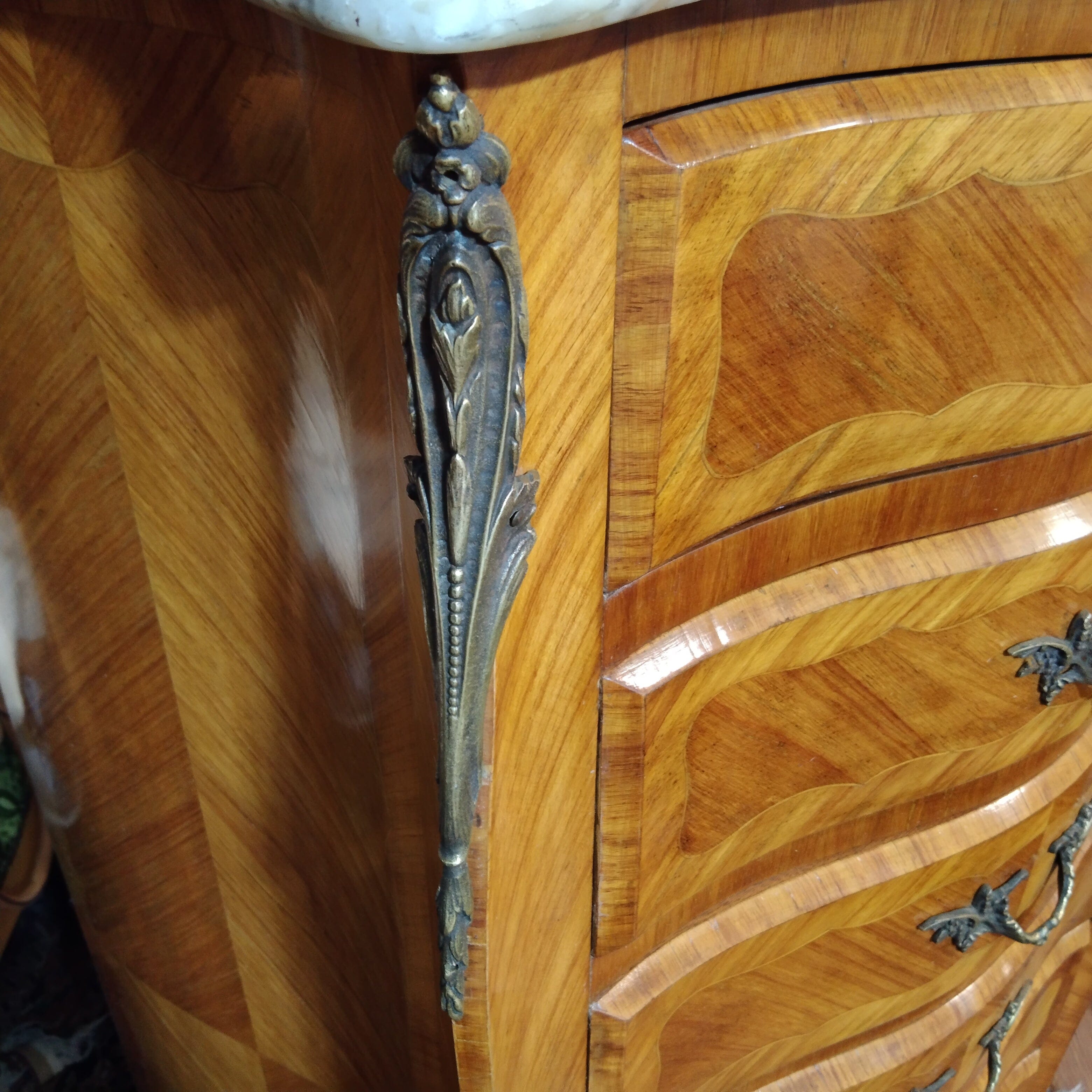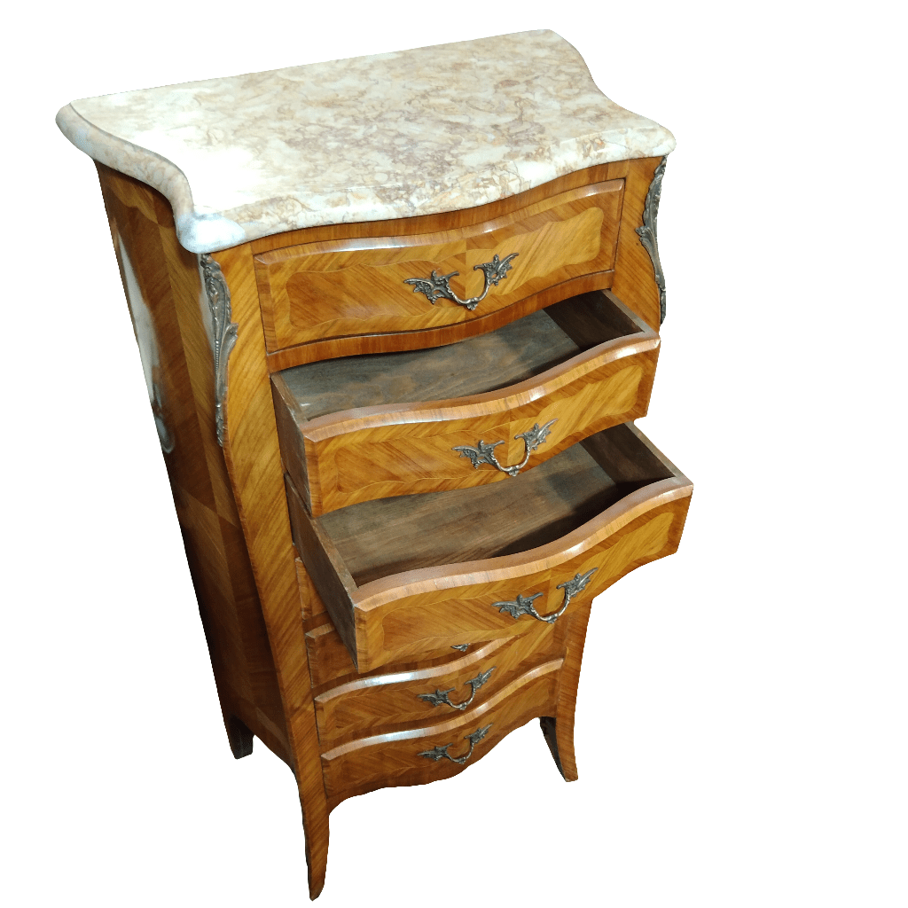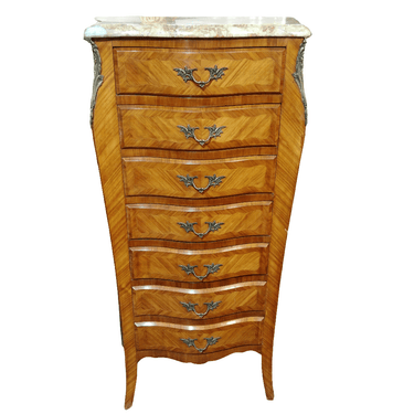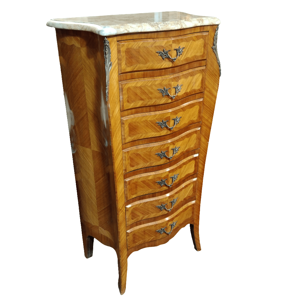 Espectacular semainier bombé estilo Luis XIV, de origen francés, en palisandro, con aplicaciones y tiradores en bronce, y una cubierta de mármol en tonos arena y rosa.