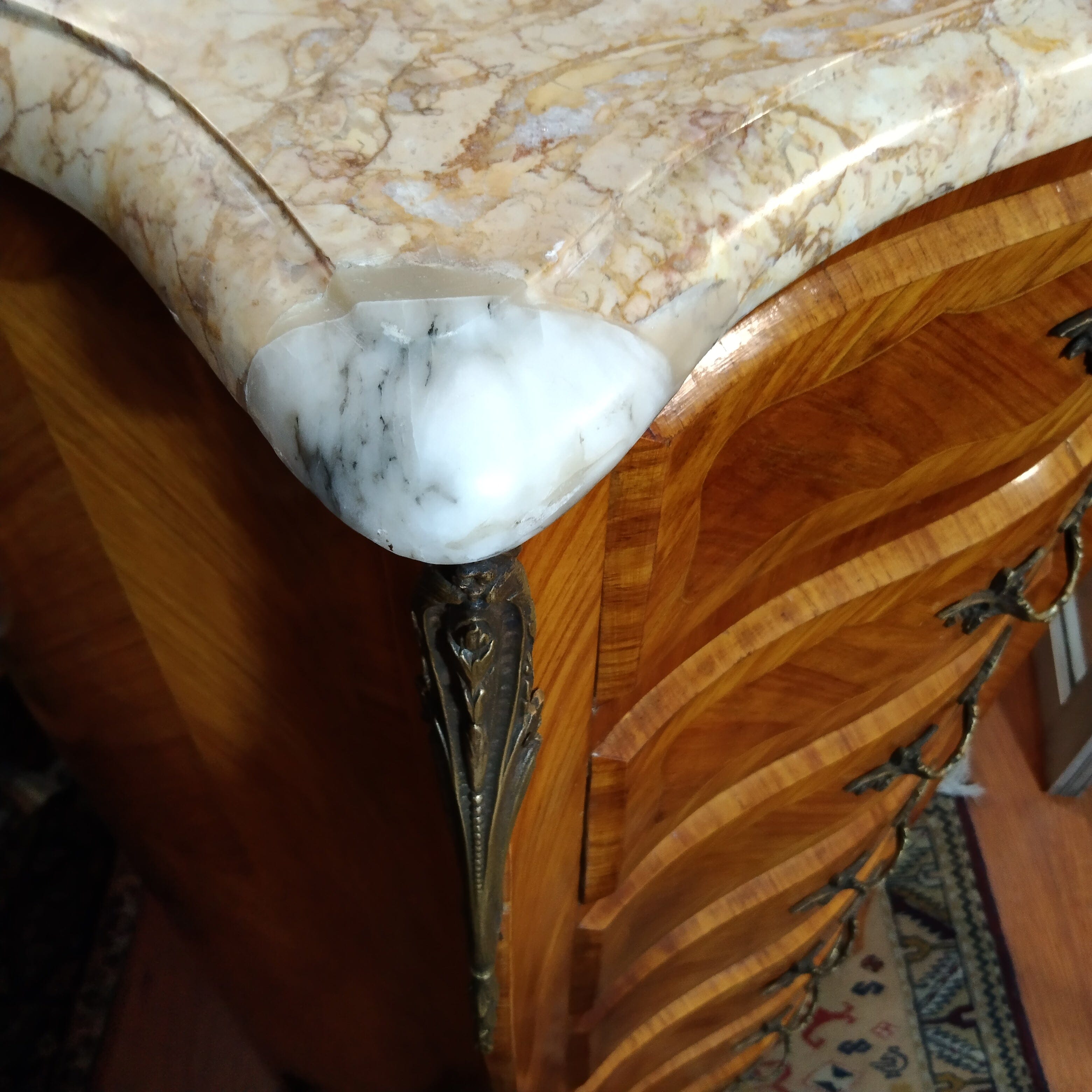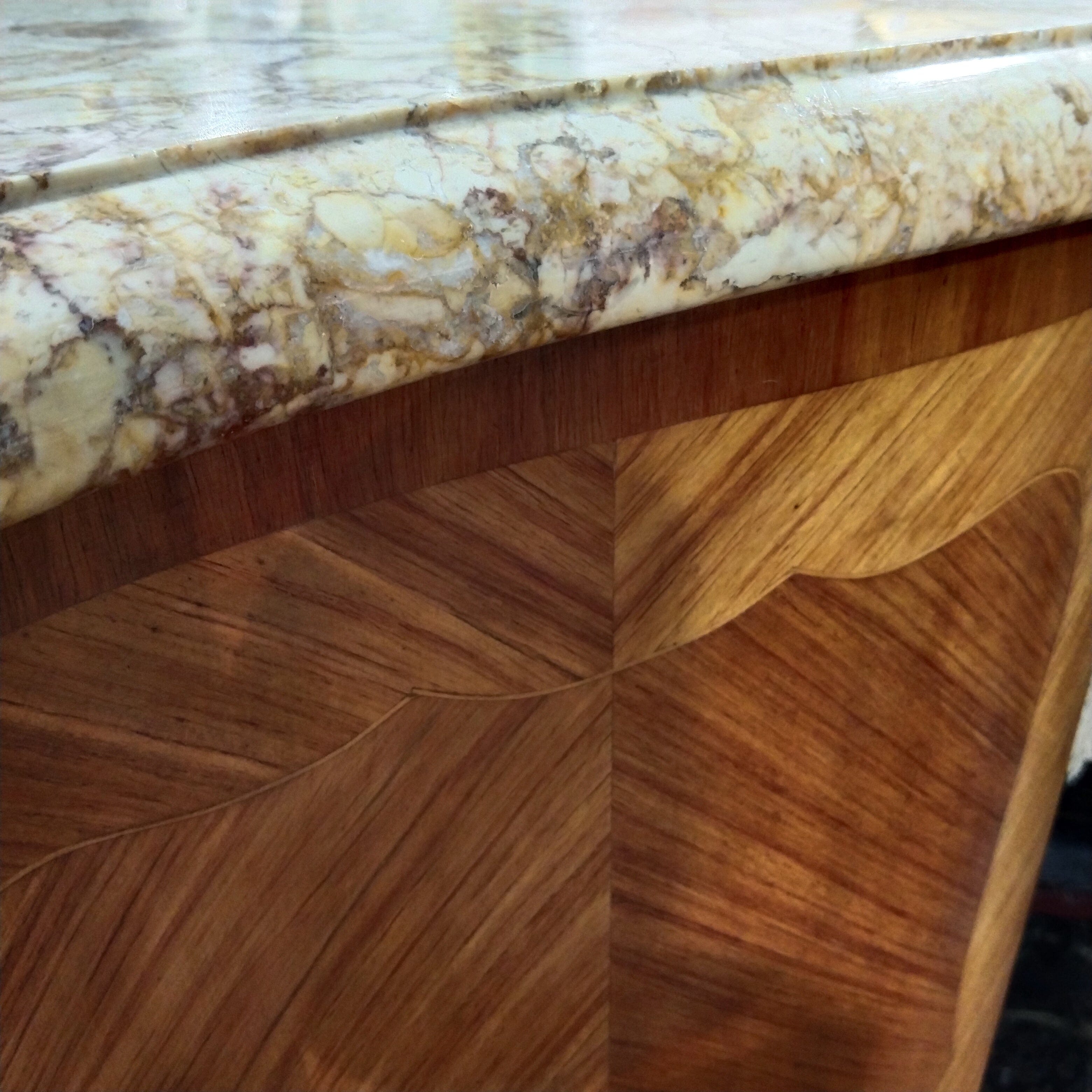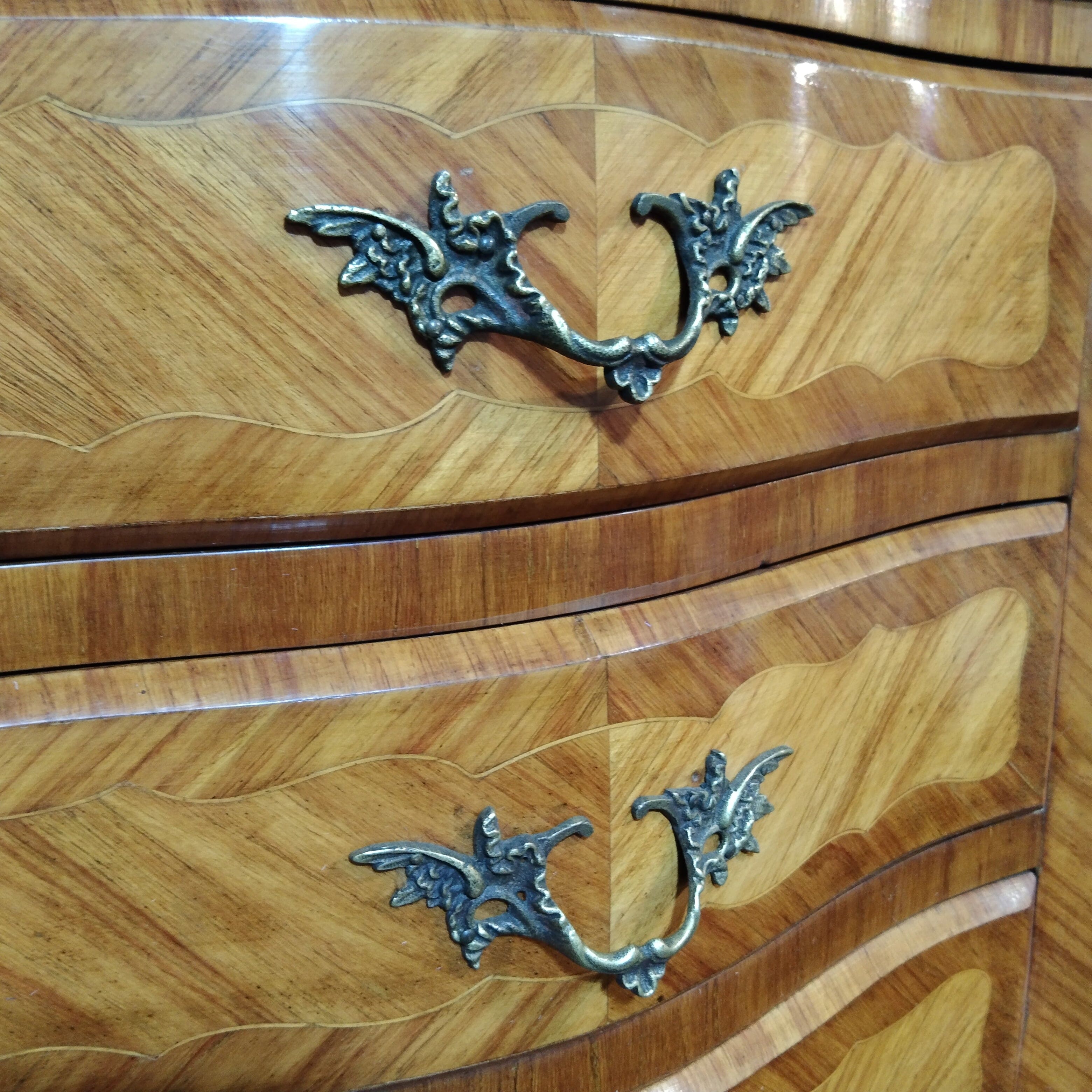 Espectacular semainier bombé estilo Luis XIV, de origen francés, en palisandro, con aplicaciones y tiradores en bronce, y una cubierta de mármol en tonos arena y rosa.