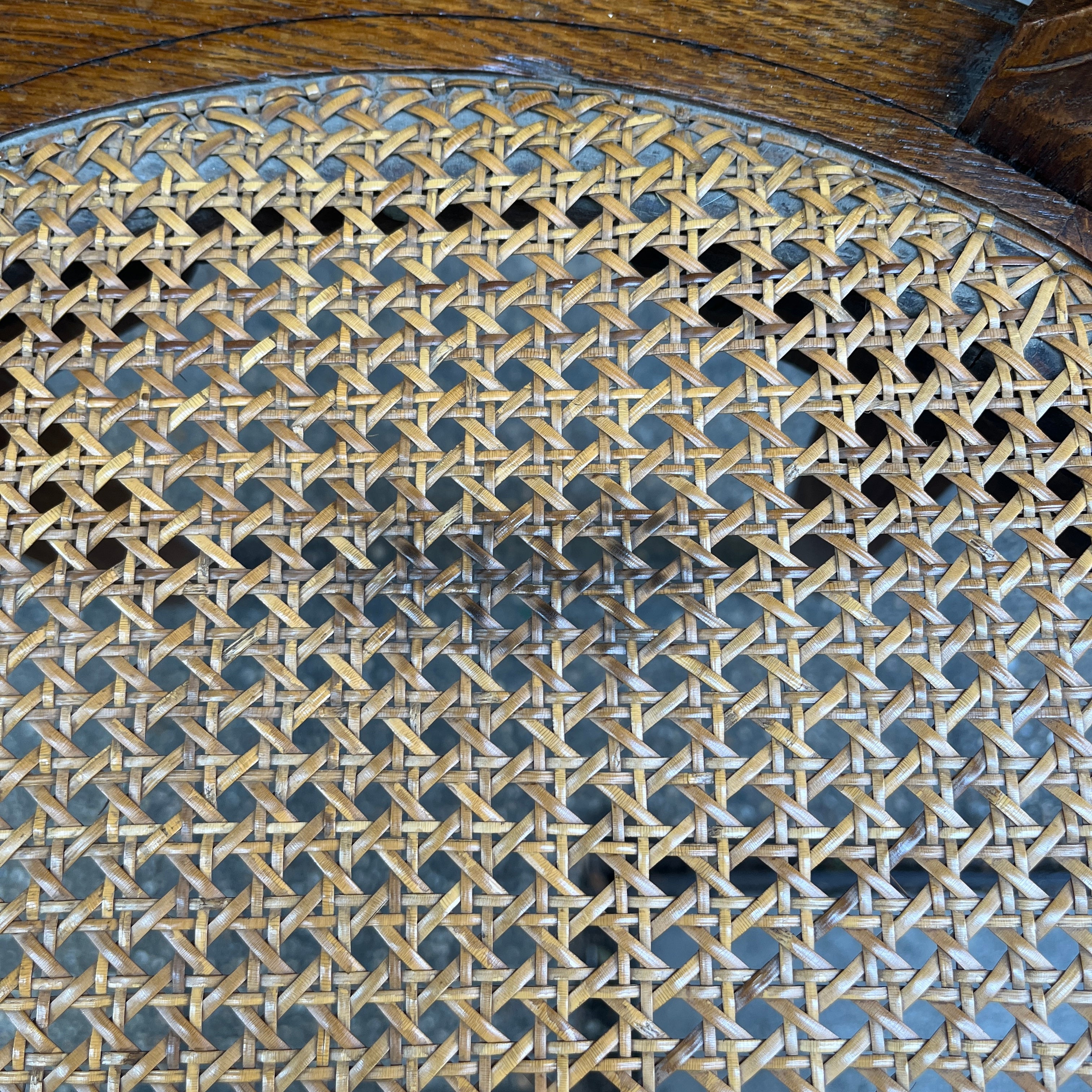 Hermosa silla francesa estilo XVI de roble americano con su enjuncado original. Es un modelo con pequeñas sutilezas que la vuelven una silla muy especial, como es un discreto tallado floral en sus patas delante que juega con las curvas superficiales los reglones horizontales de su frontis. Es una silla que se encuentra en perfectas condiciones ideal para tener un dormitorio, escritorio o incluso combinarla con otras sillas en un comedor más ecléctico. Su data se presume entre los años 1920 y 1930.