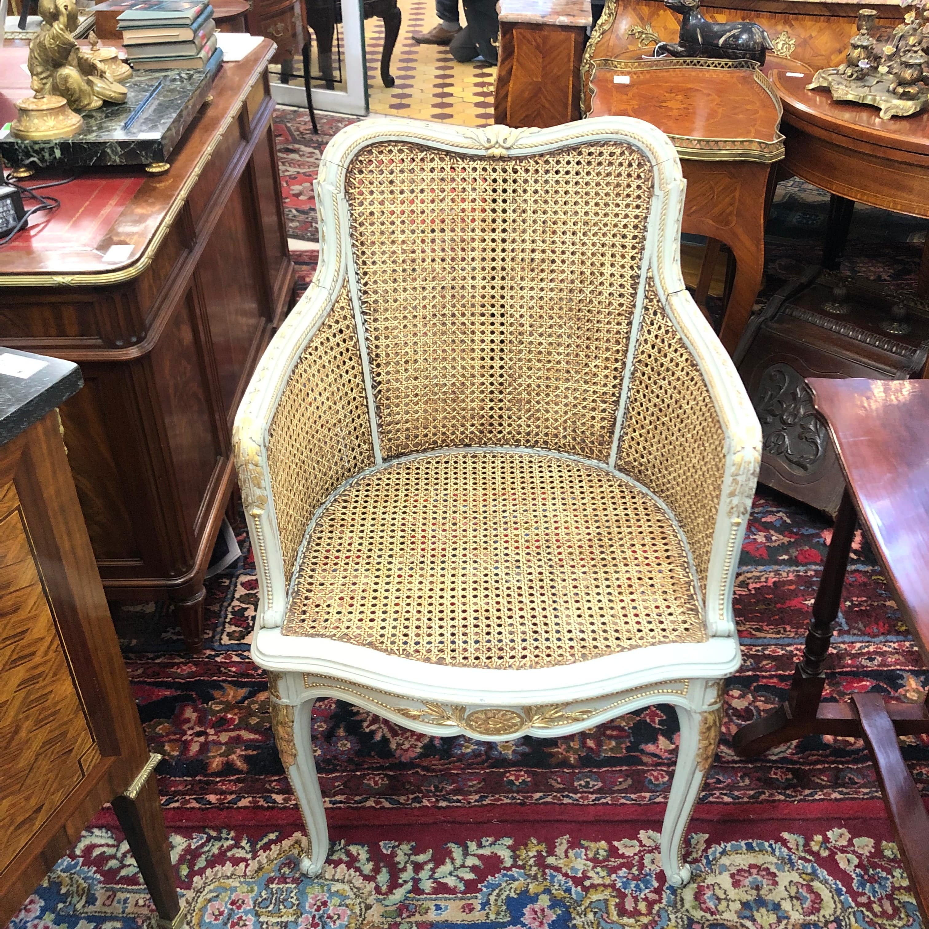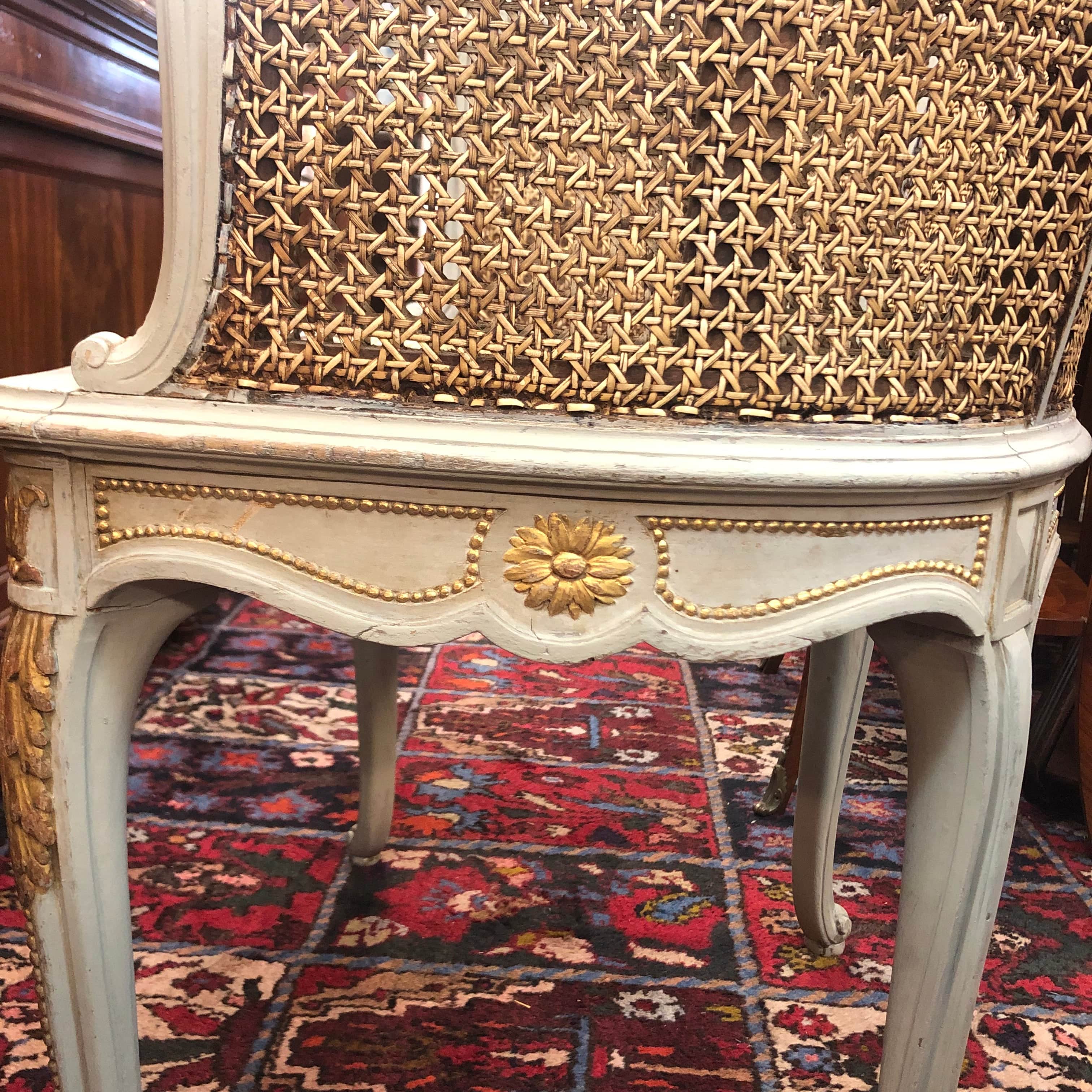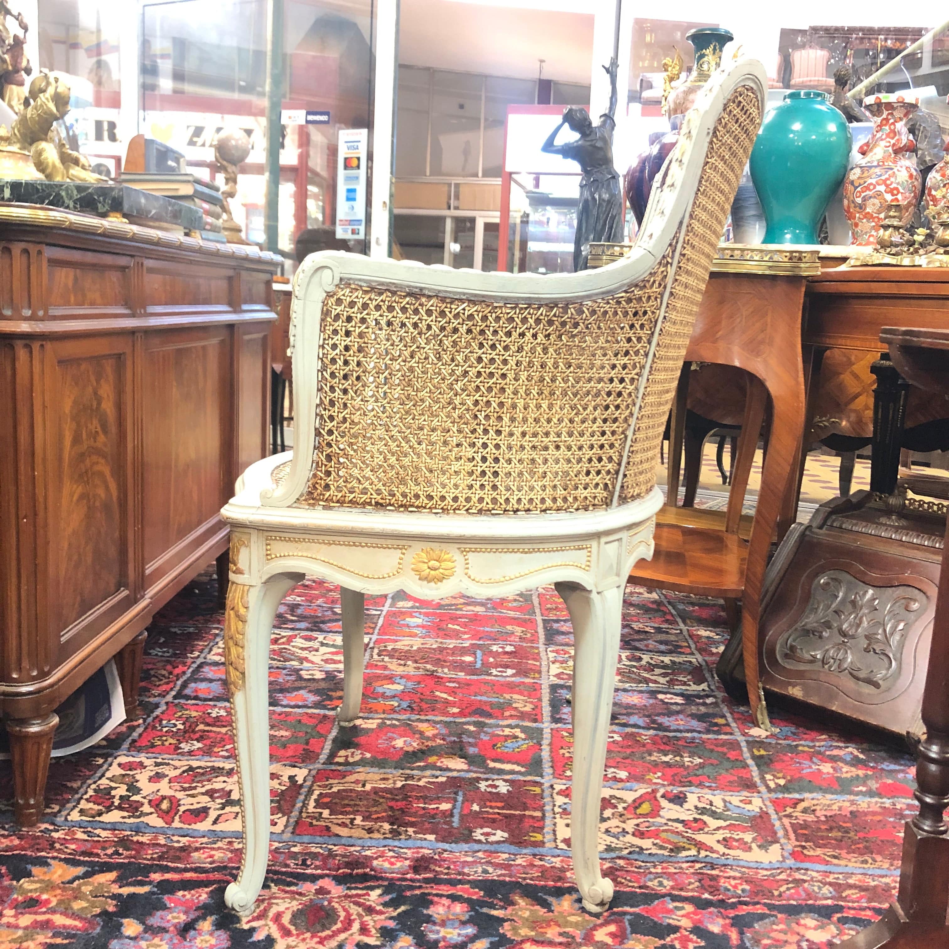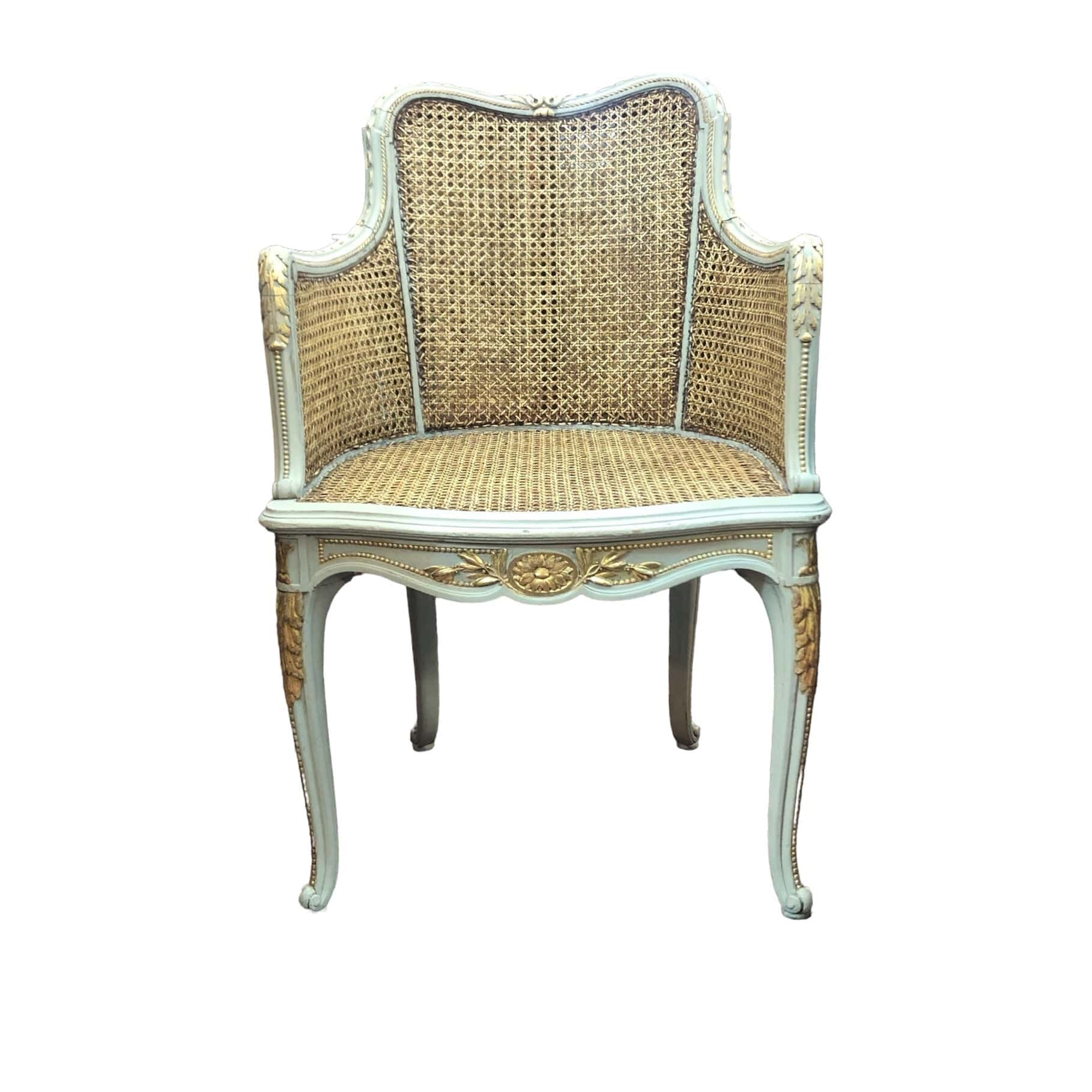Sillón estilo Luis XV con doble enjuncado en respaldo y asiento, color celeste con dorado y hermoso tallado de flores.