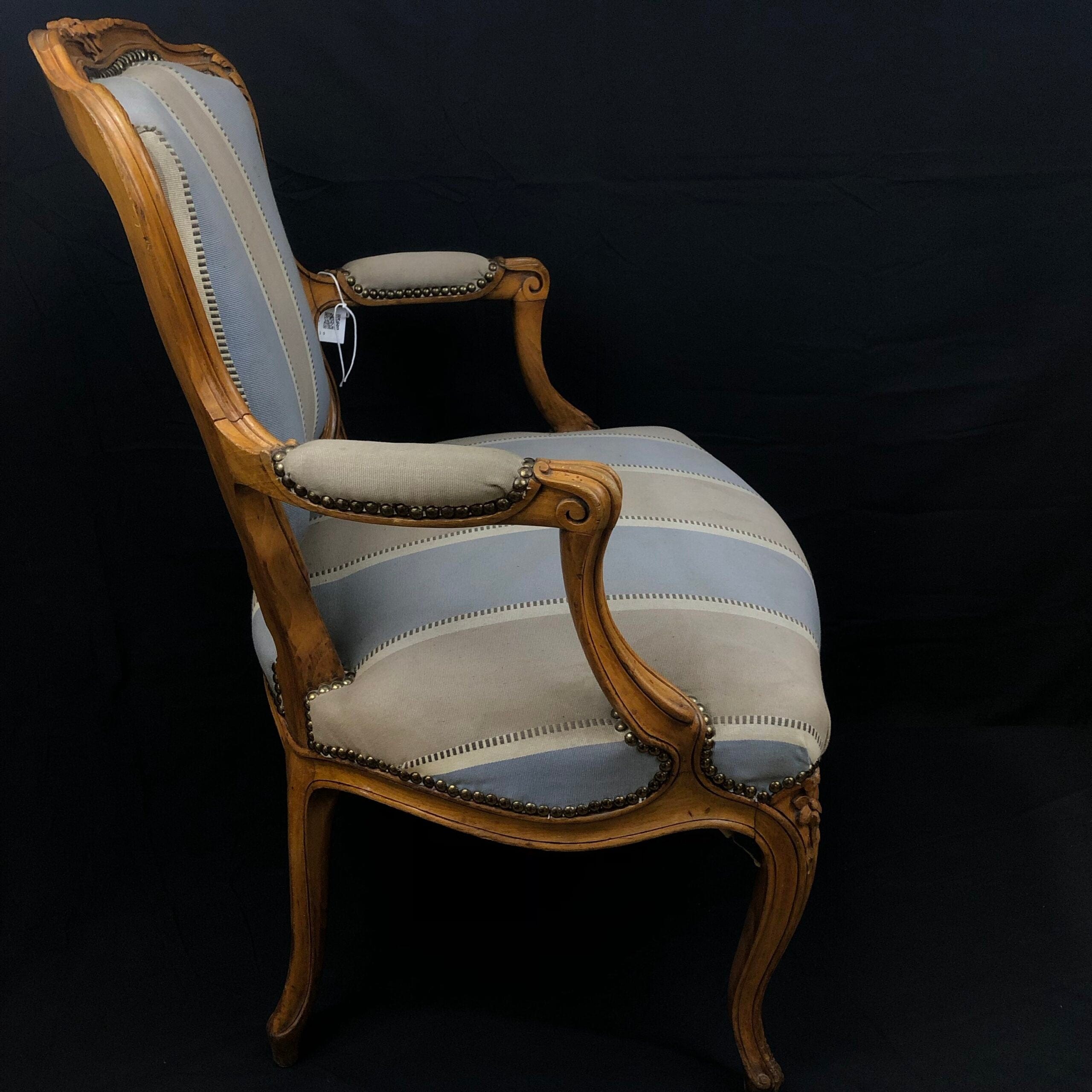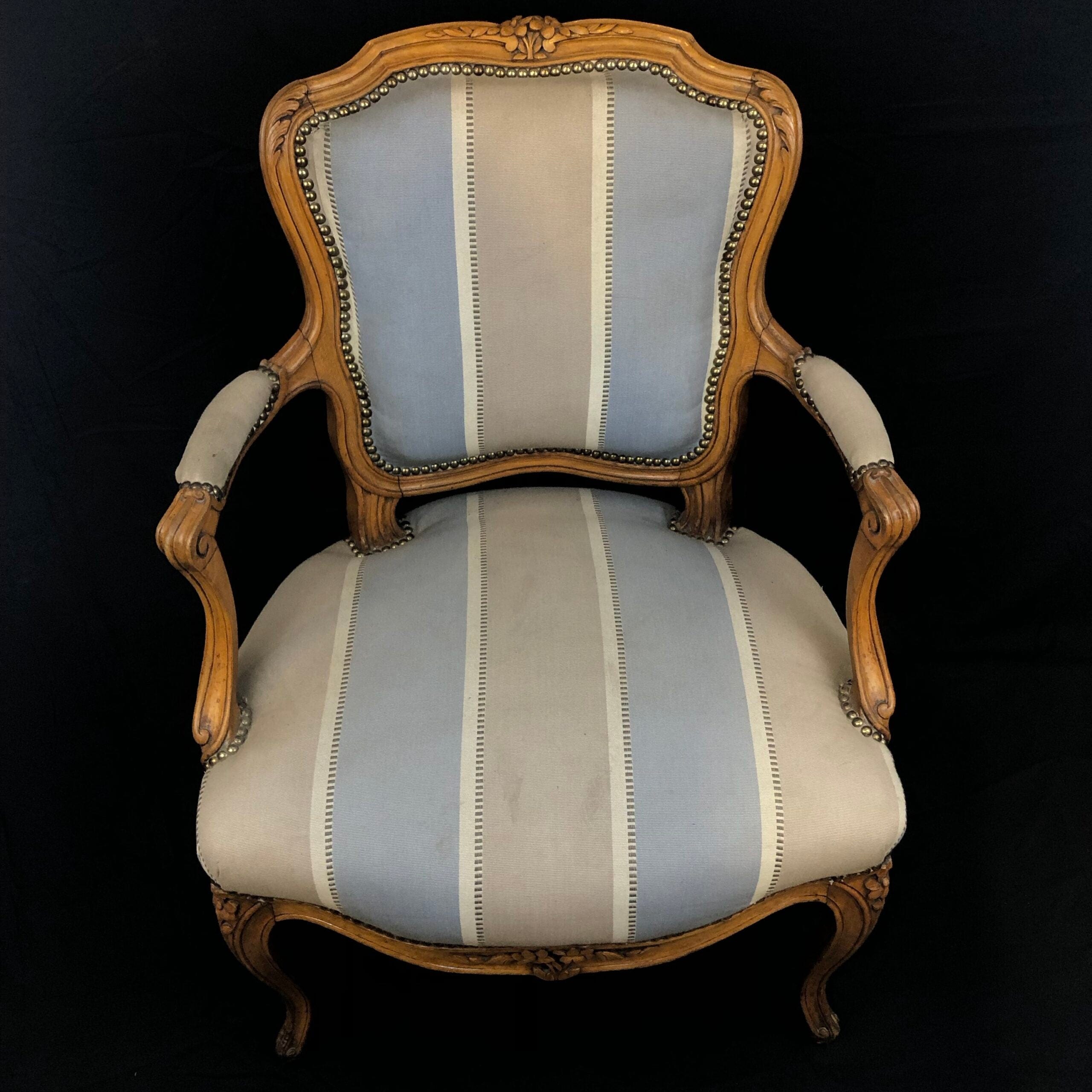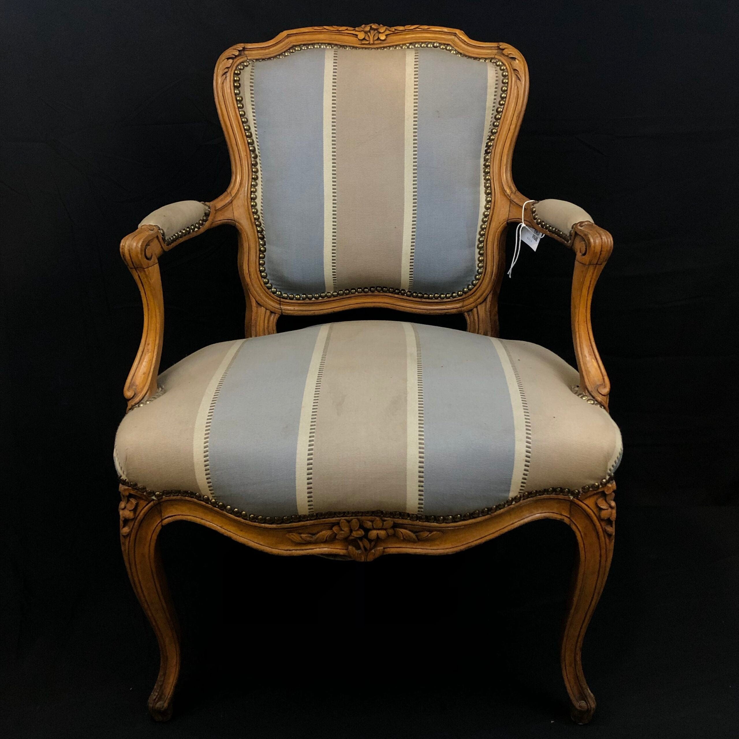 Elegante sillón francés en madera de nogal, con finos tallados efectuados a mano, extraordinaria comodidad en su asiento gracias al perfecto ensamble de resortes y huinchas, también por su respaldo por su curvatura y orilla de morcillón. Bello cordón de tachuelas tapiceras bronceadas en todo su contorno .
