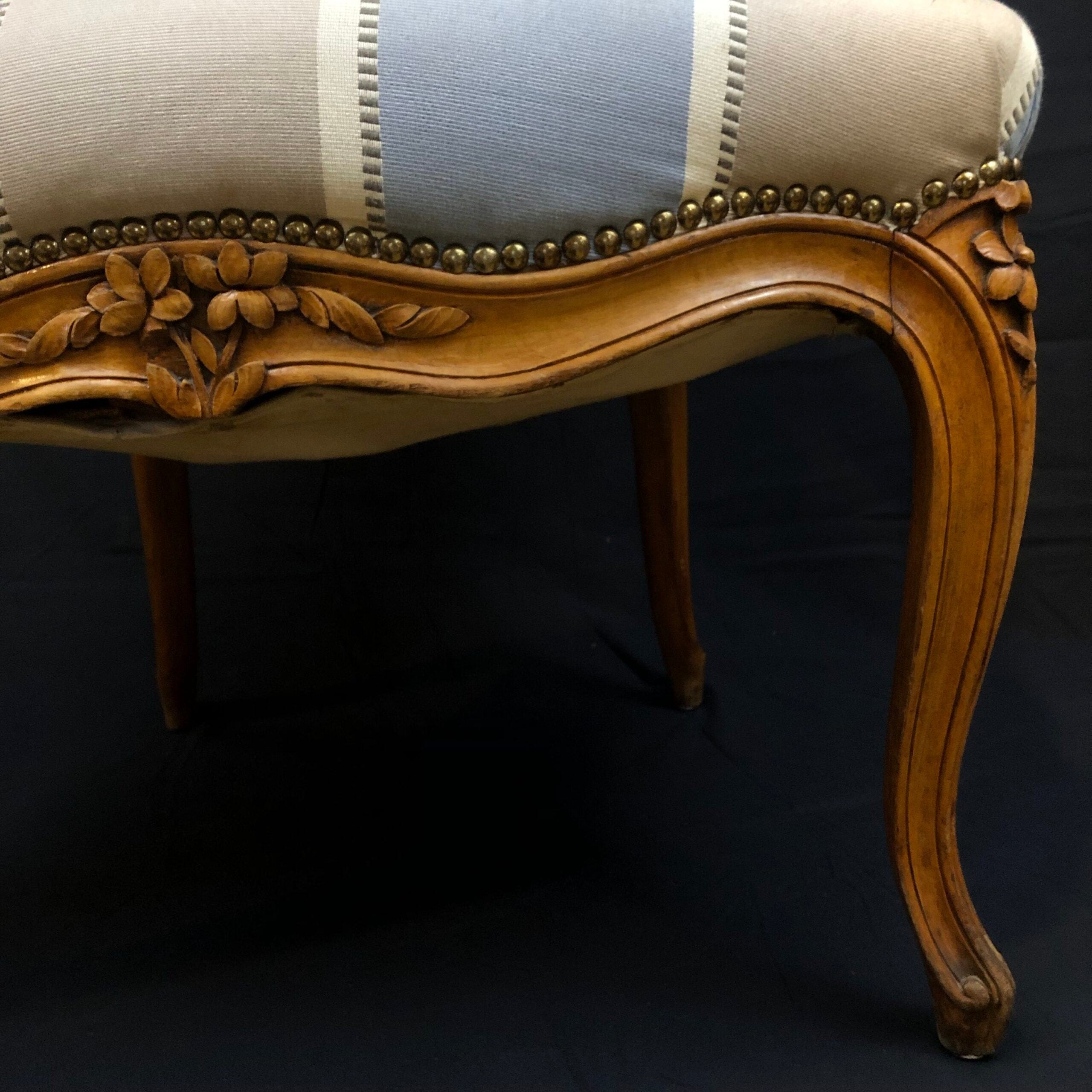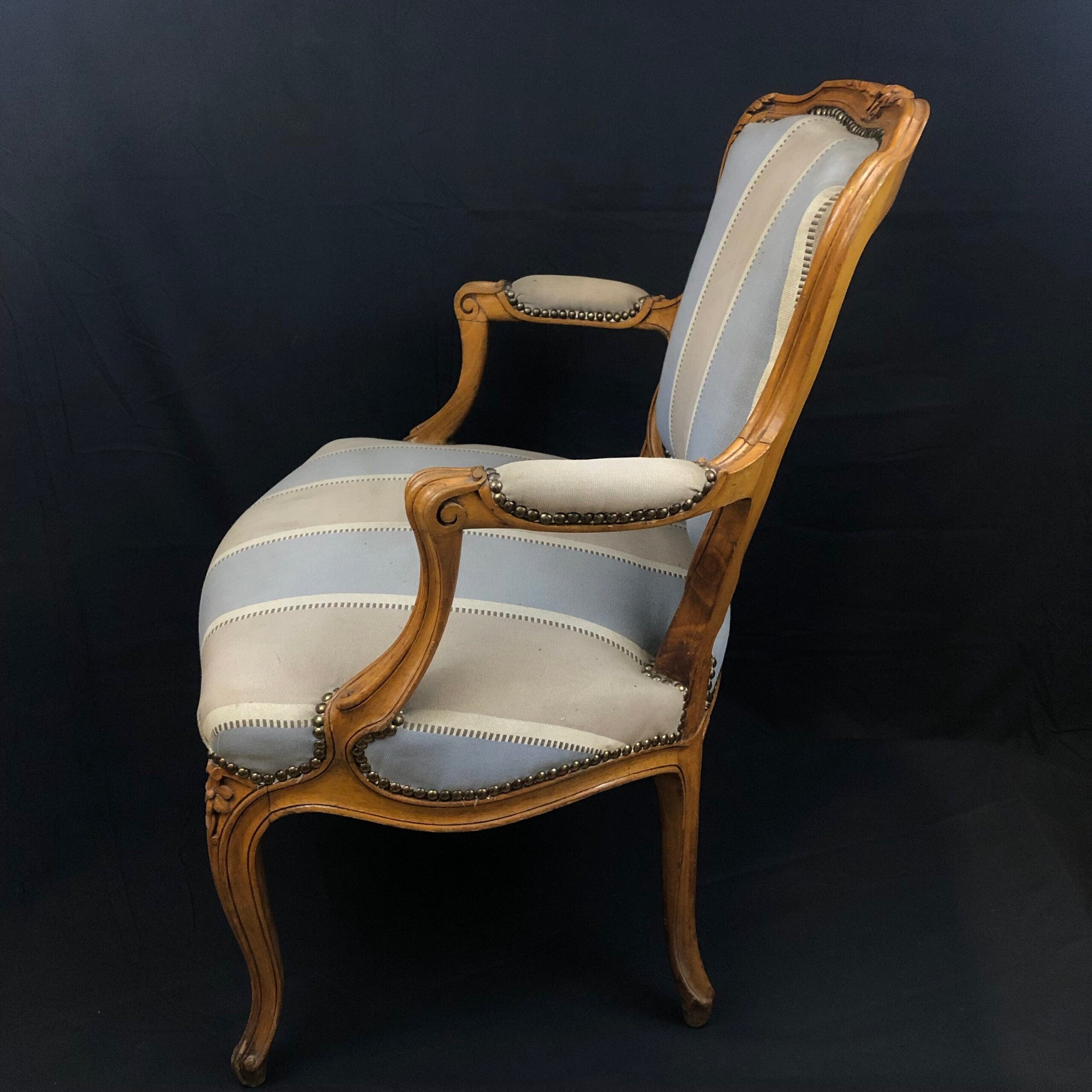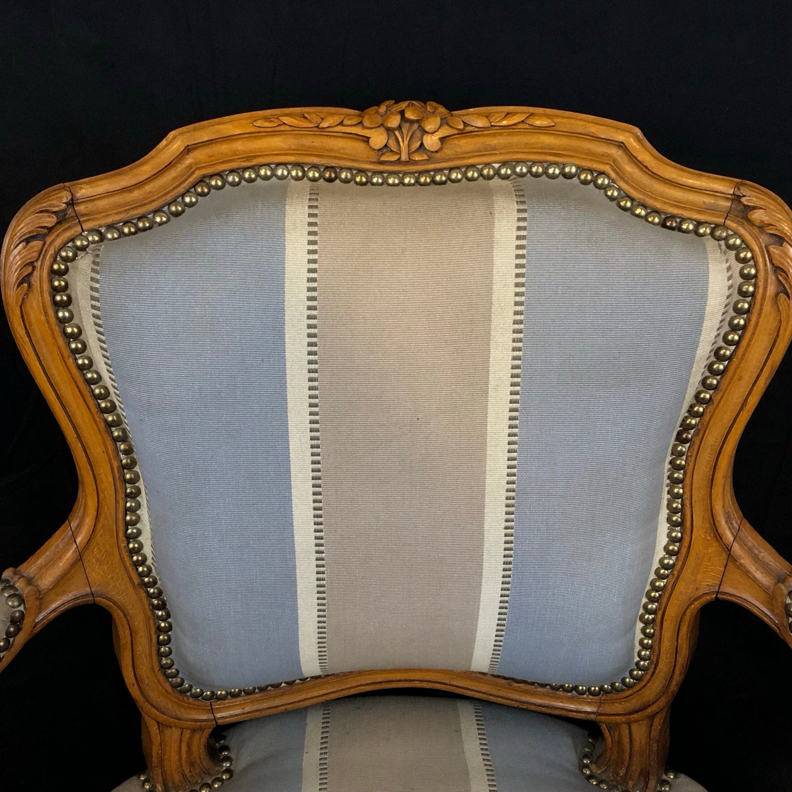 Elegante sillón francés en madera de nogal, con finos tallados efectuados a mano, extraordinaria comodidad en su asiento gracias al perfecto ensamble de resortes y huinchas, también por su respaldo por su curvatura y orilla de morcillón. Bello cordón de tachuelas tapiceras bronceadas en todo su contorno .