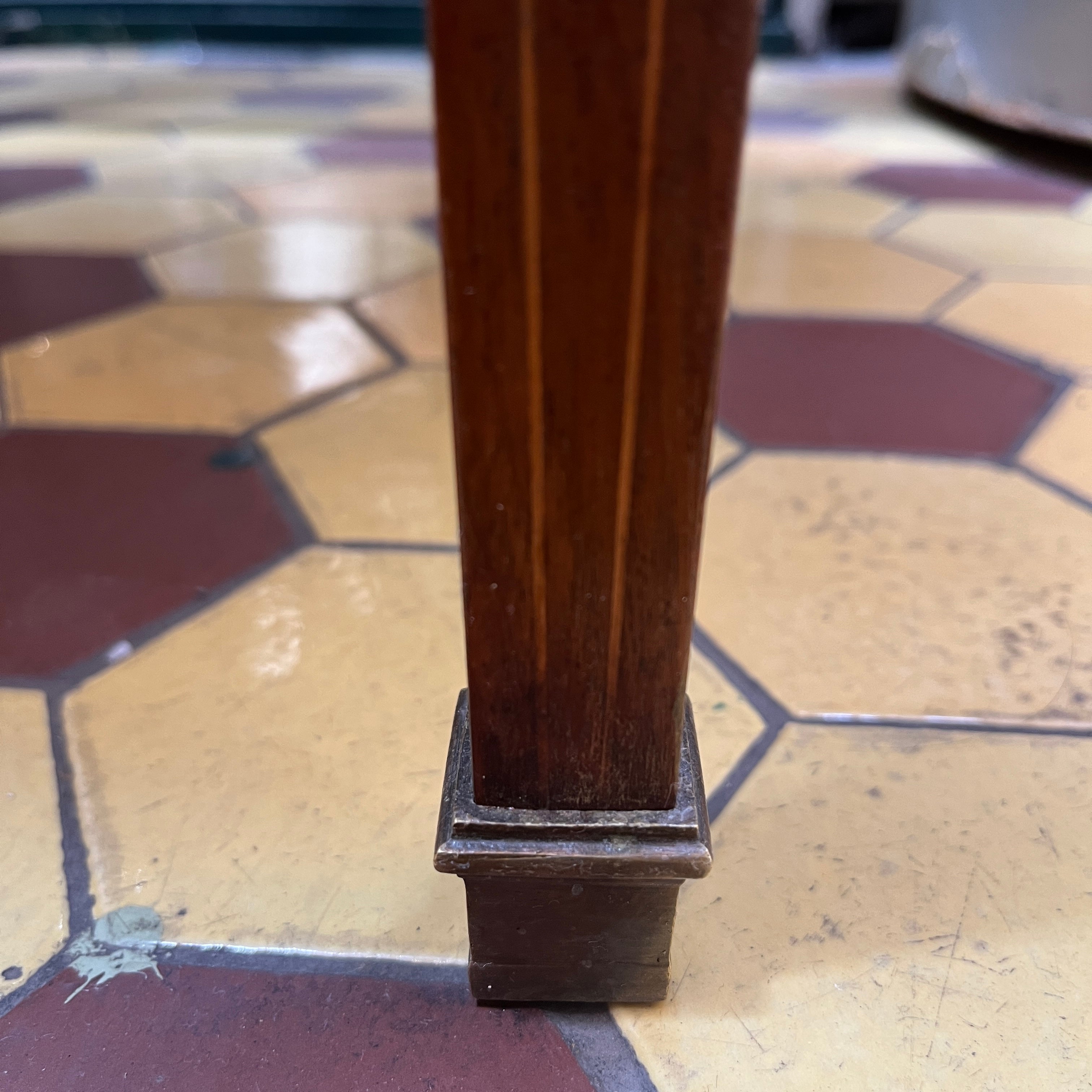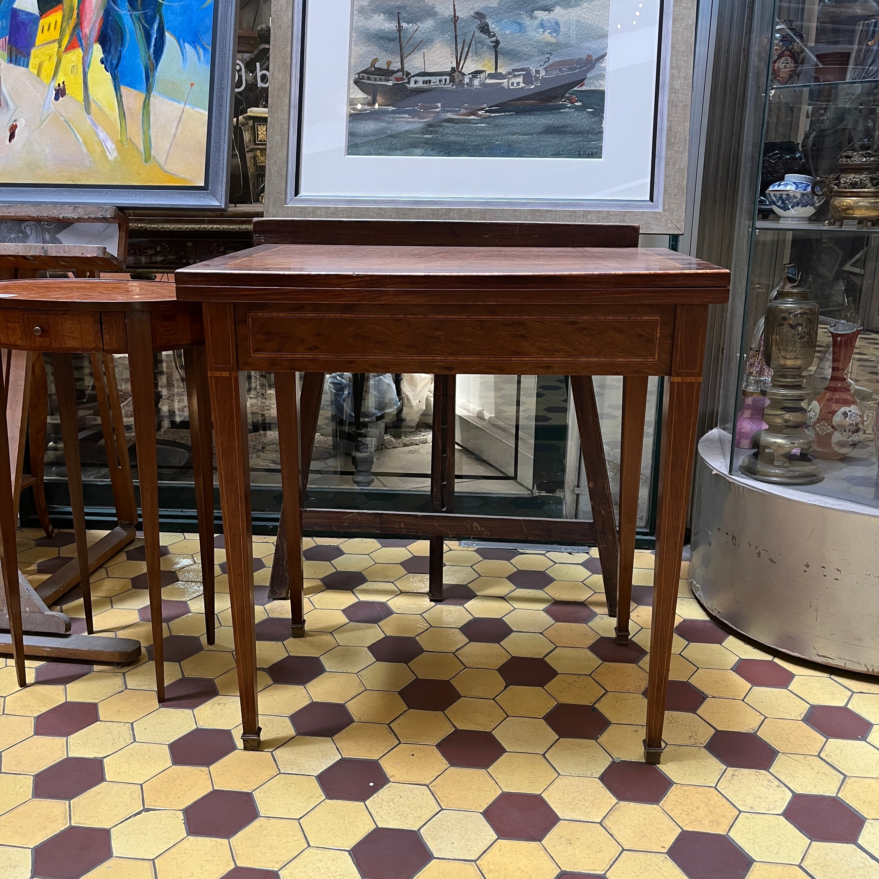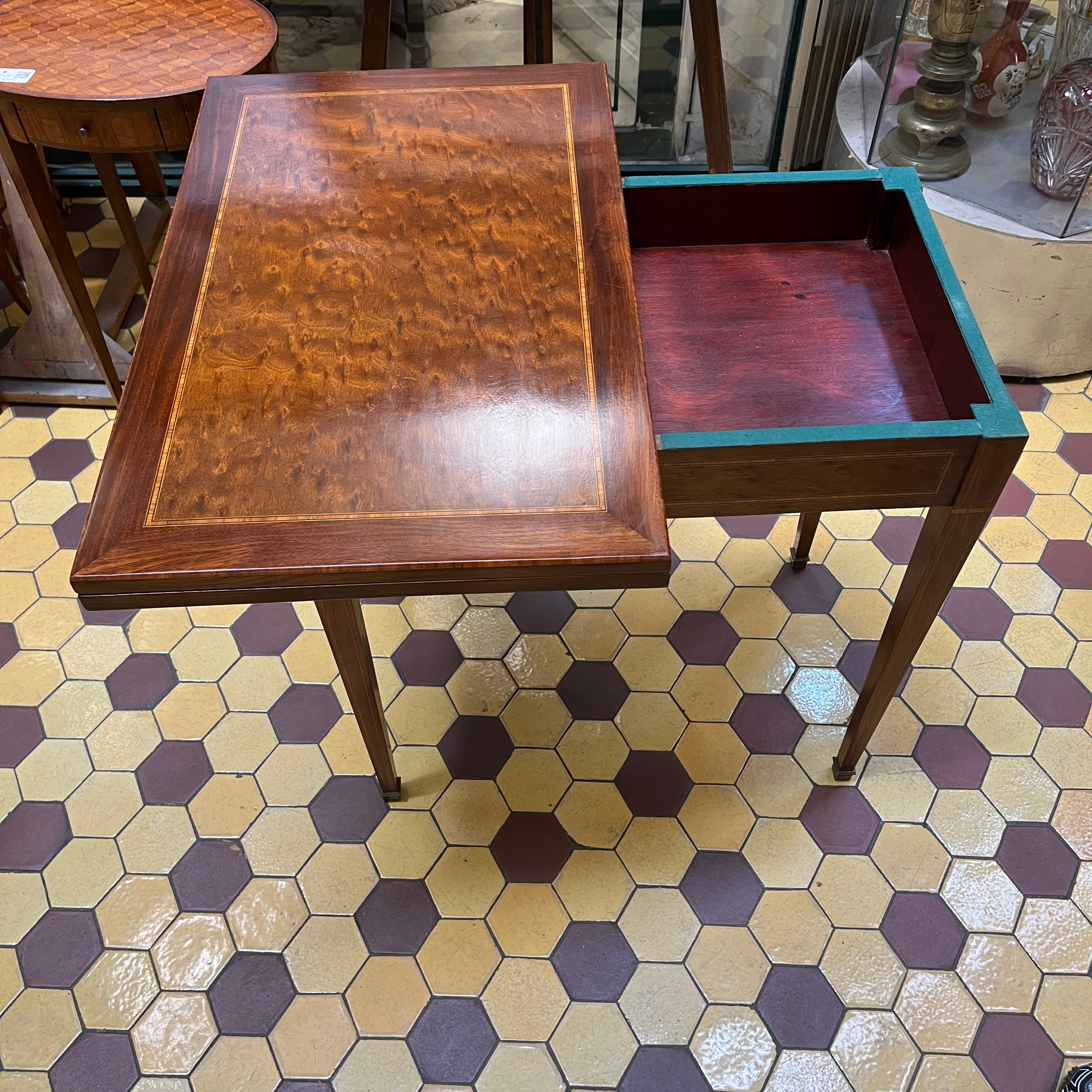 Elegante mesa de juegos francesa estilo Luis XVI en caoba y filetes enchapados en raíz de nogal. La mesa tiene un sistema desplegable, con un paño verde de juego con un bellísimo detalle de cenefa dorada en filigrana en su interior.