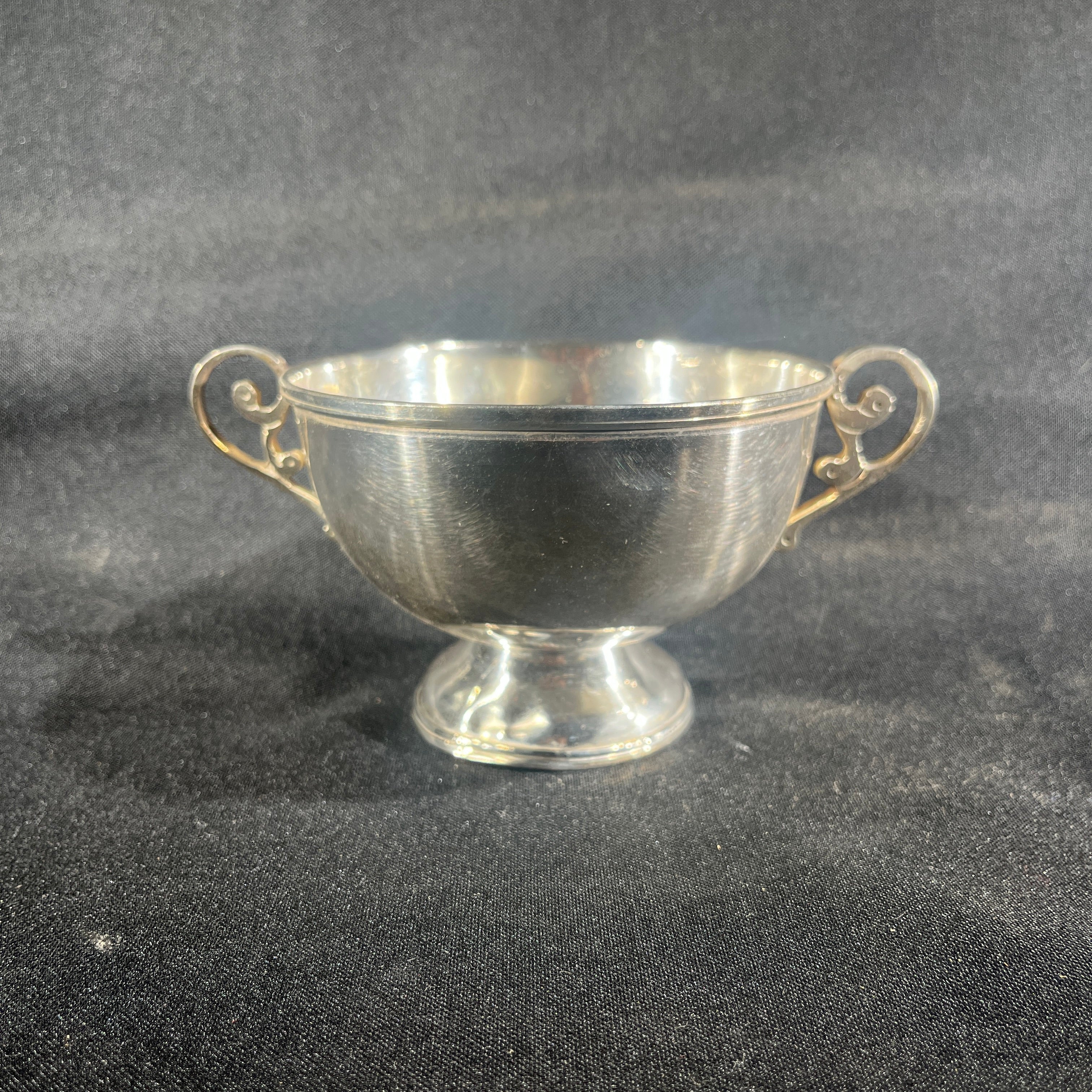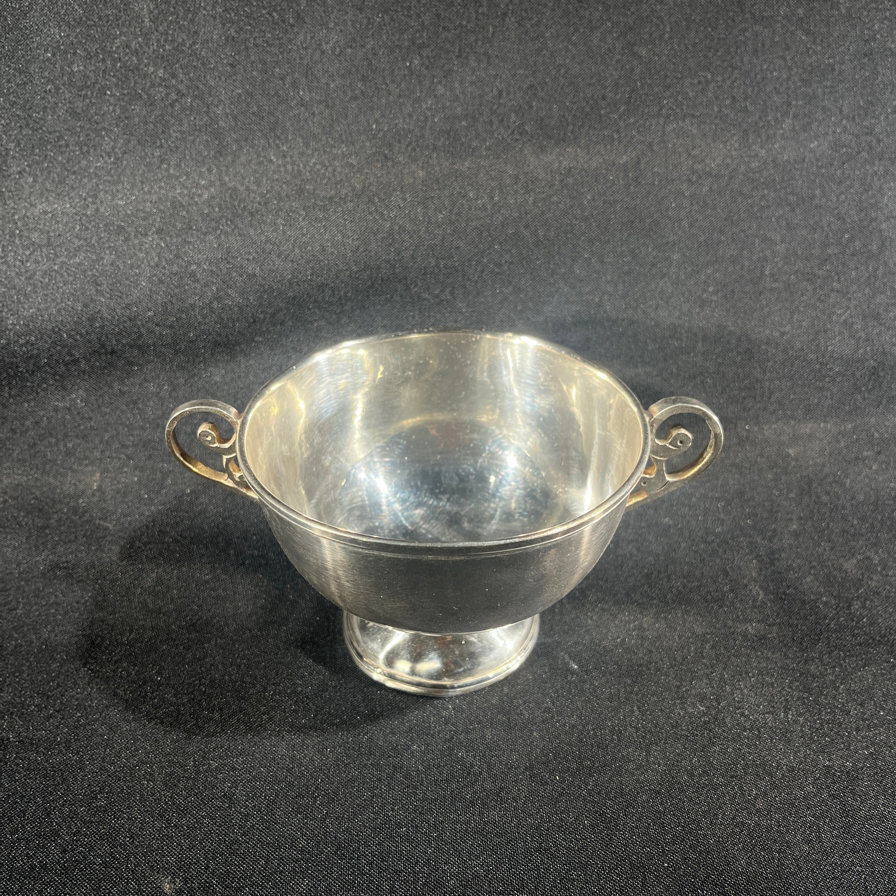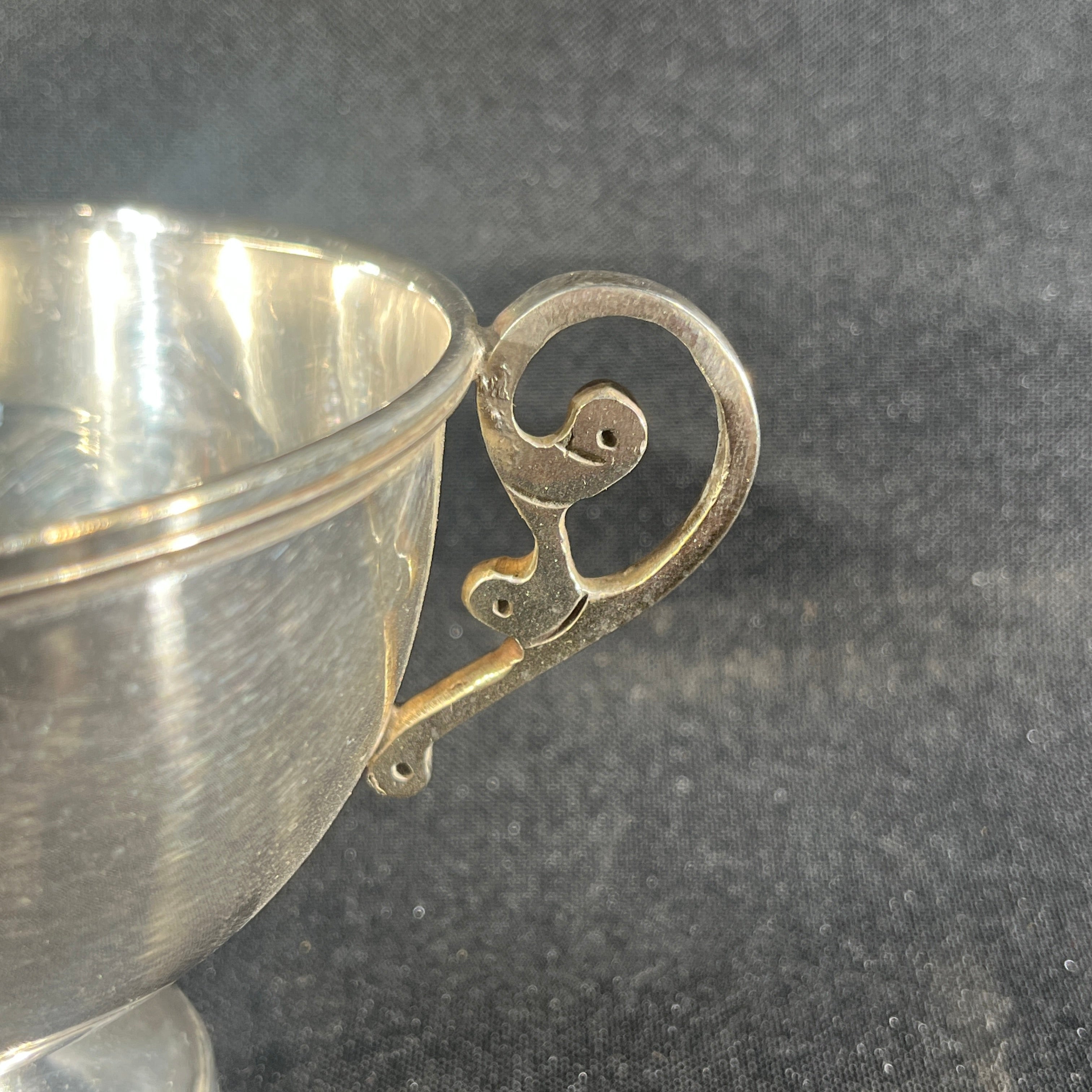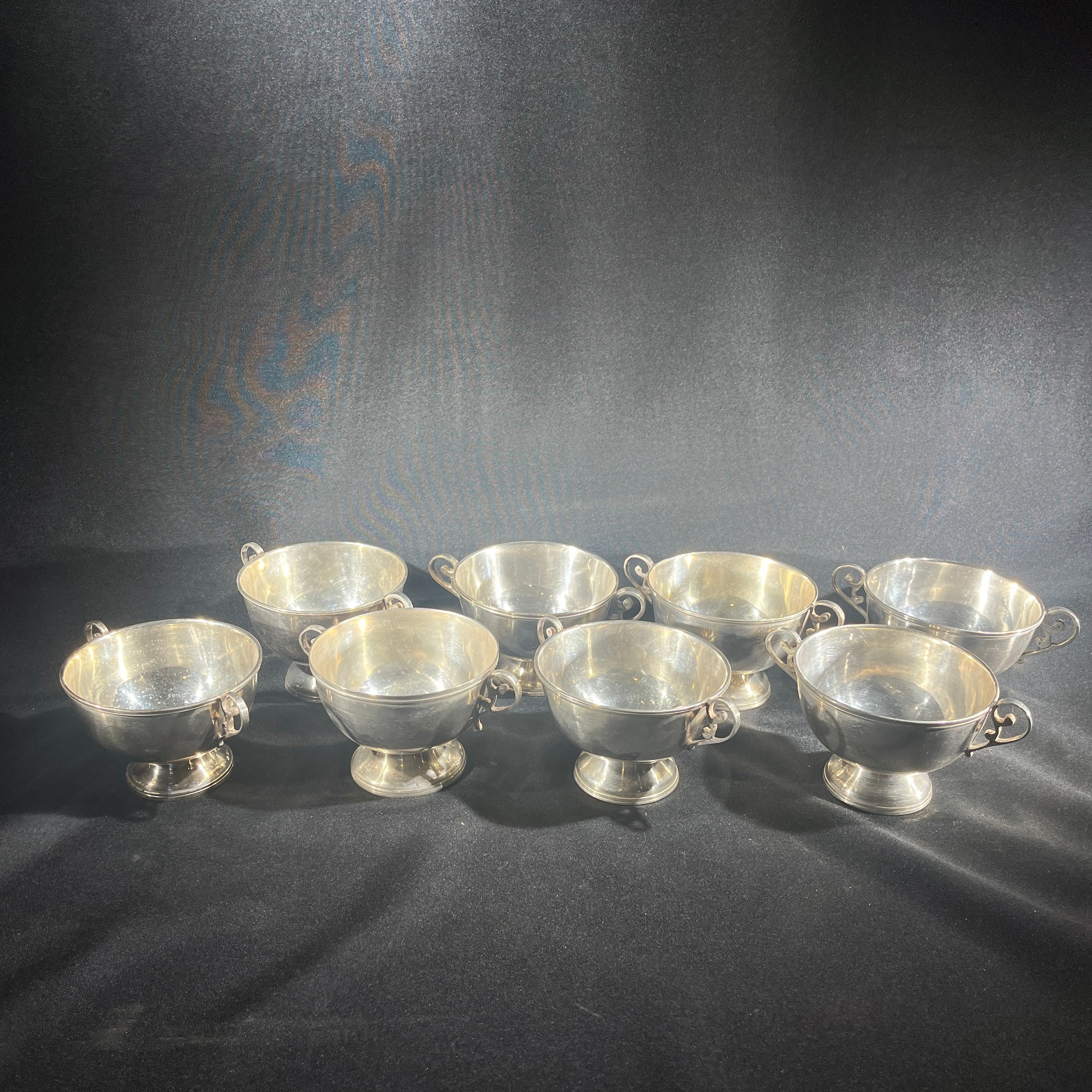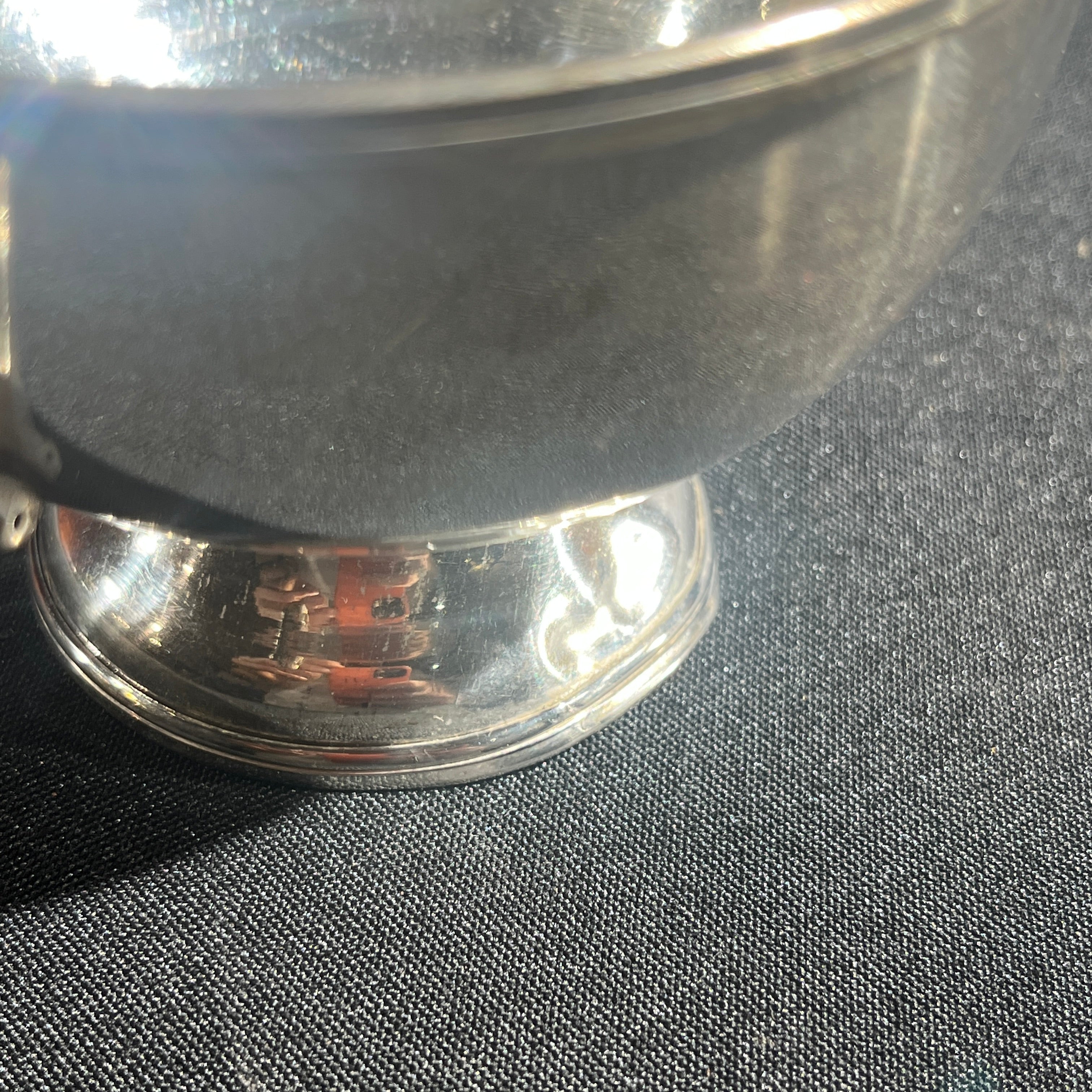 Elegante juego de calderas de plaqué para 8 personas en su caja original, forrada de un llamativo terciopelo rojo. Las piezas tienen un diseño de asas curvas.