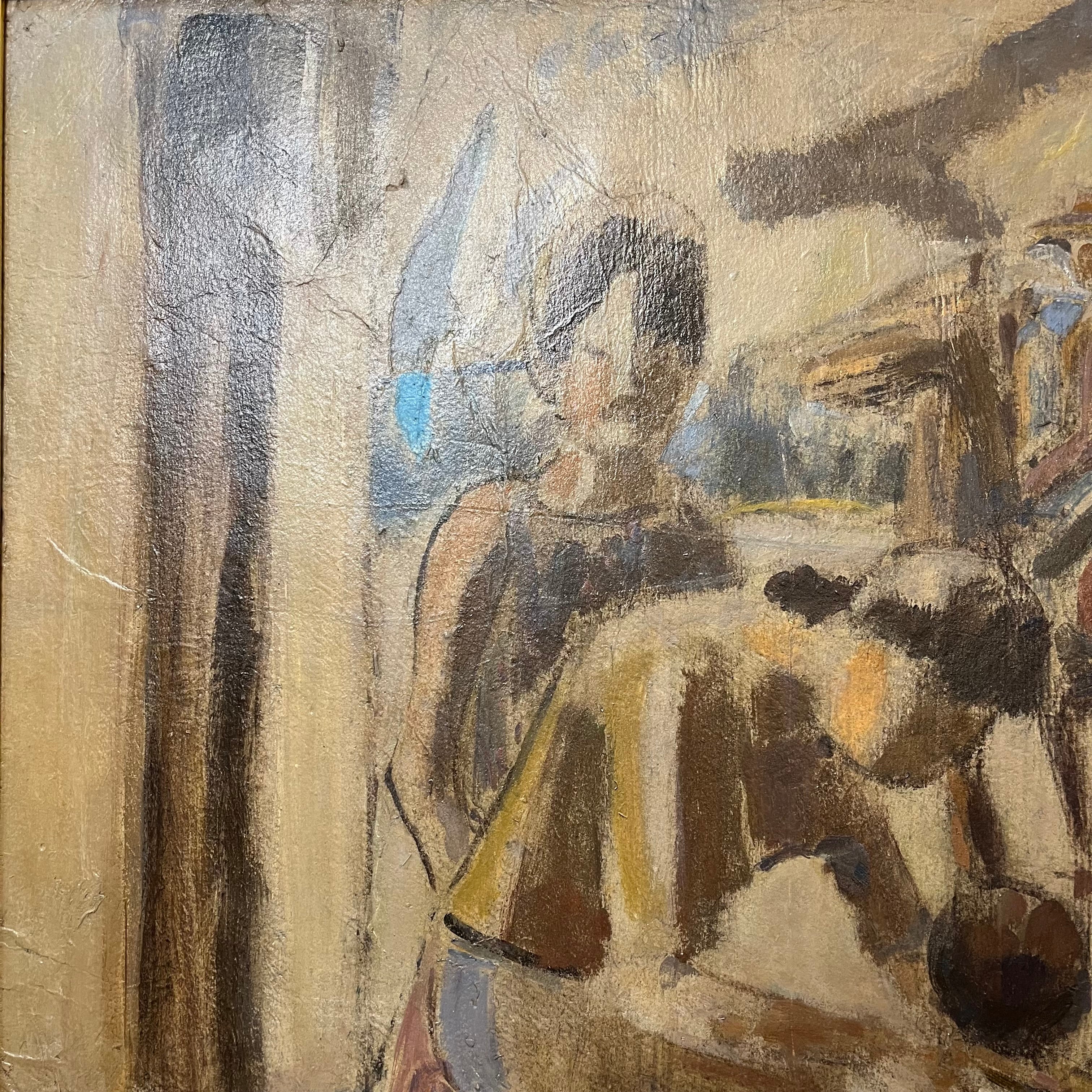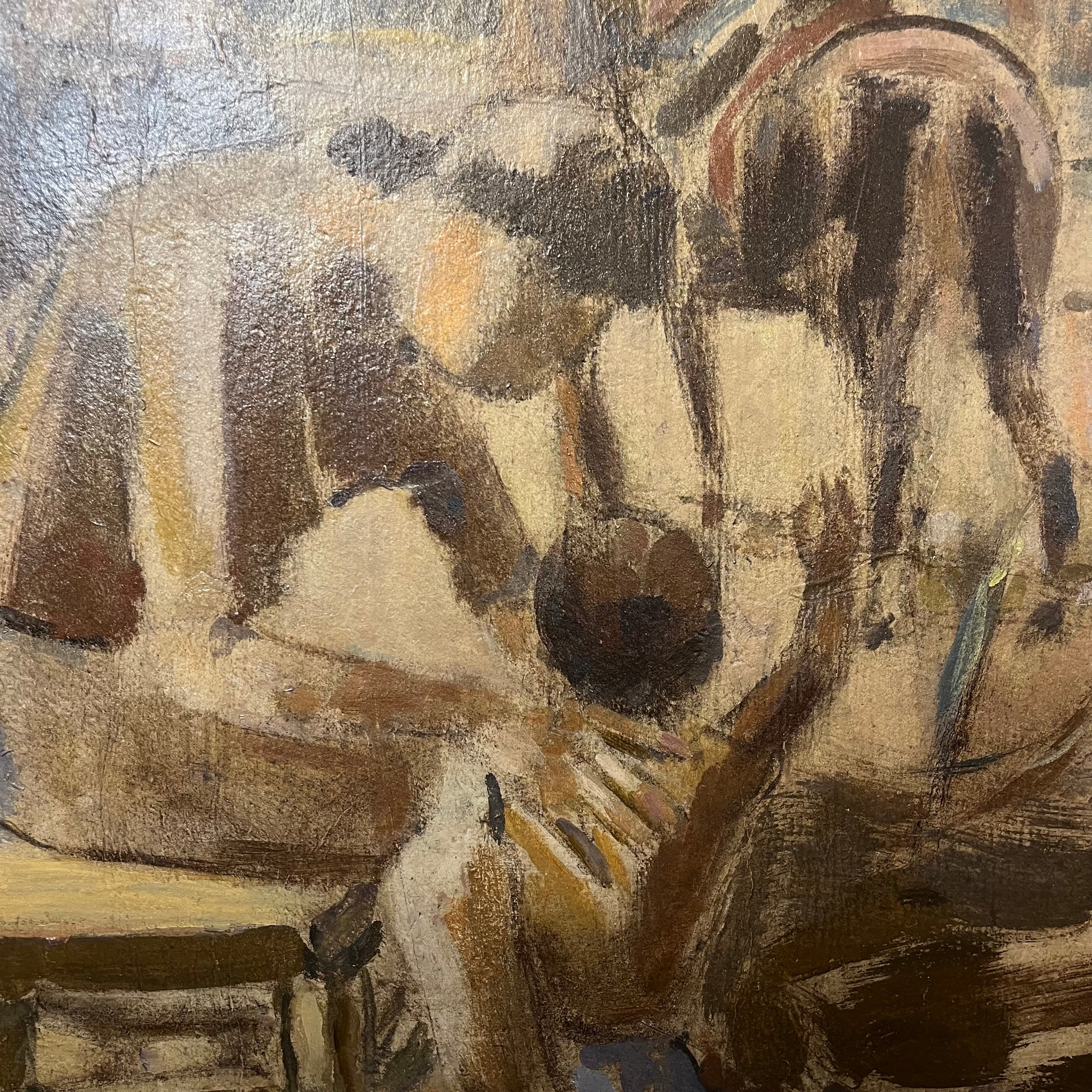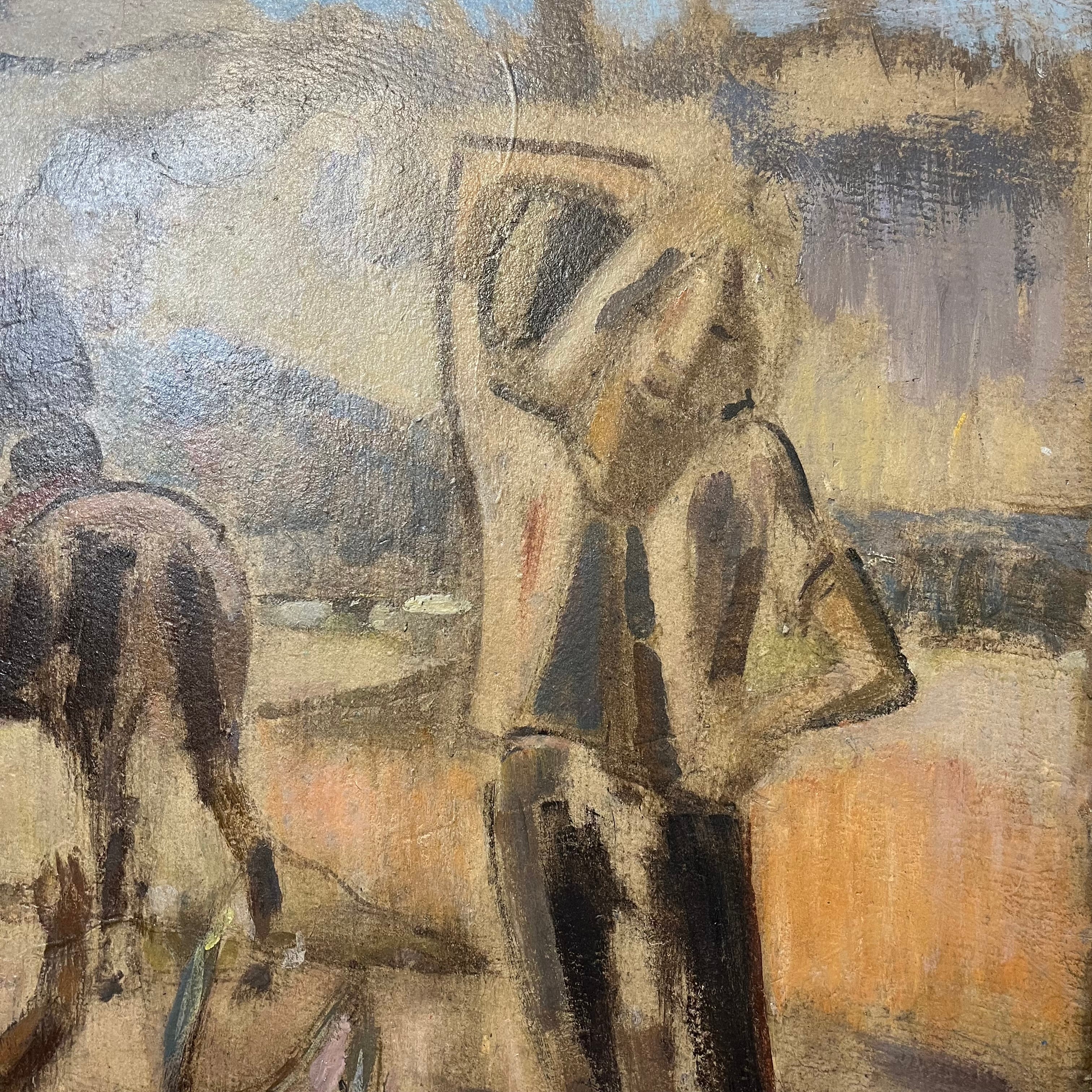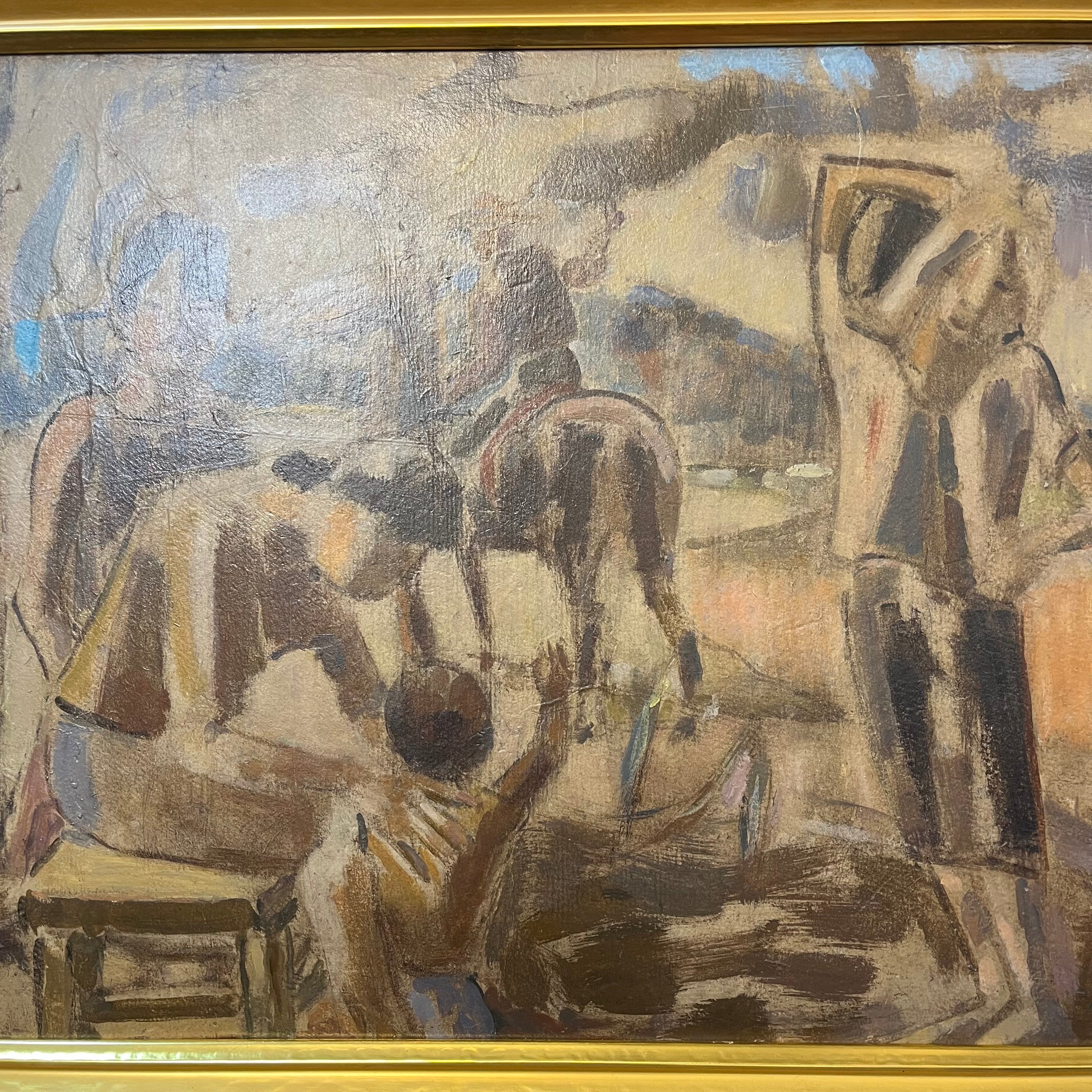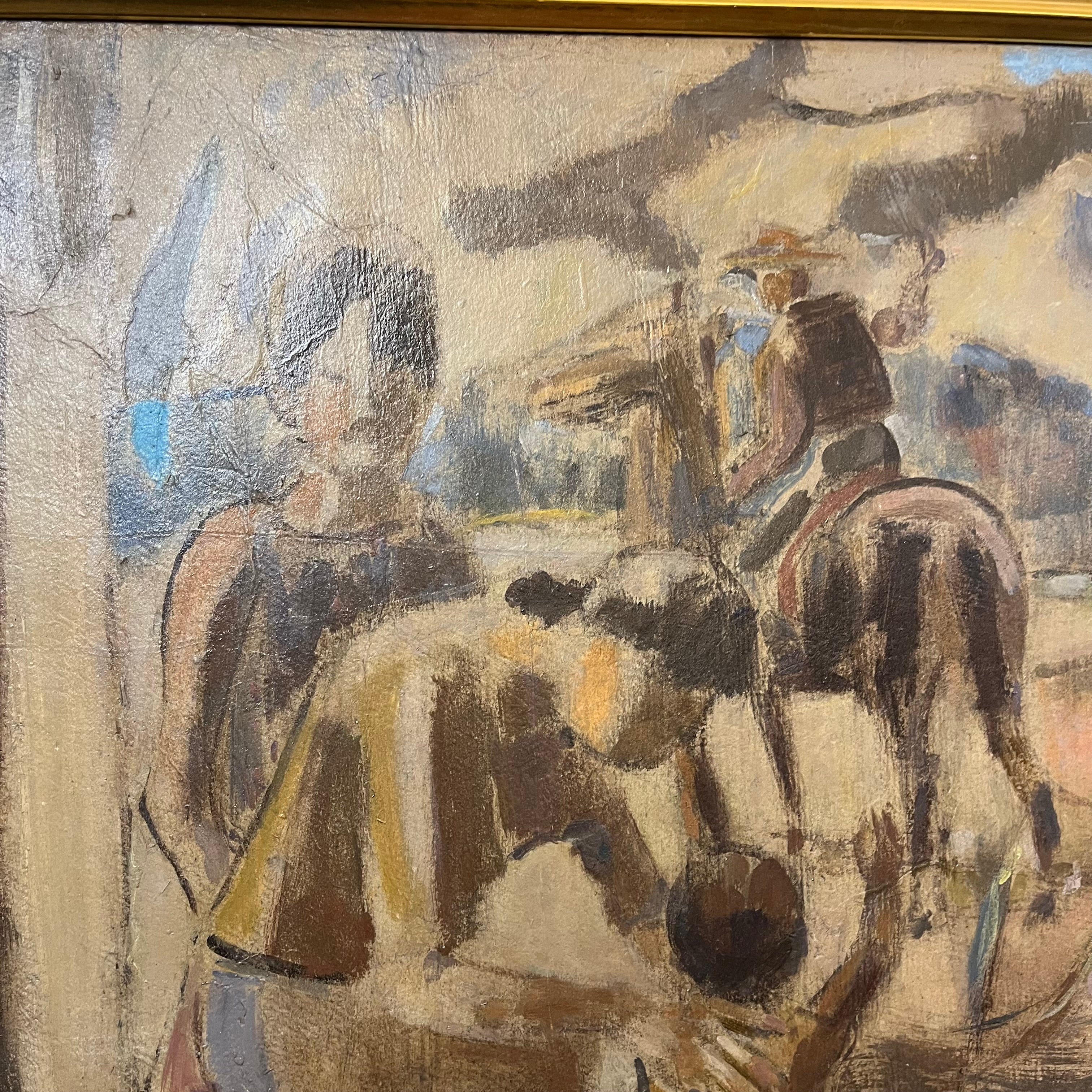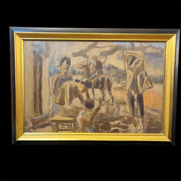 Conmovedor cuadro del pintor chileno Augusto Eguiluz (1893-1969), que retrata una escena clásica del campo con distintos personajes interactuando entre si. Podemos ver hombres mujeres y un niño. El cuadro destaca por sus tonos y una técnica muy particular que otorga movimiento a la escena.
