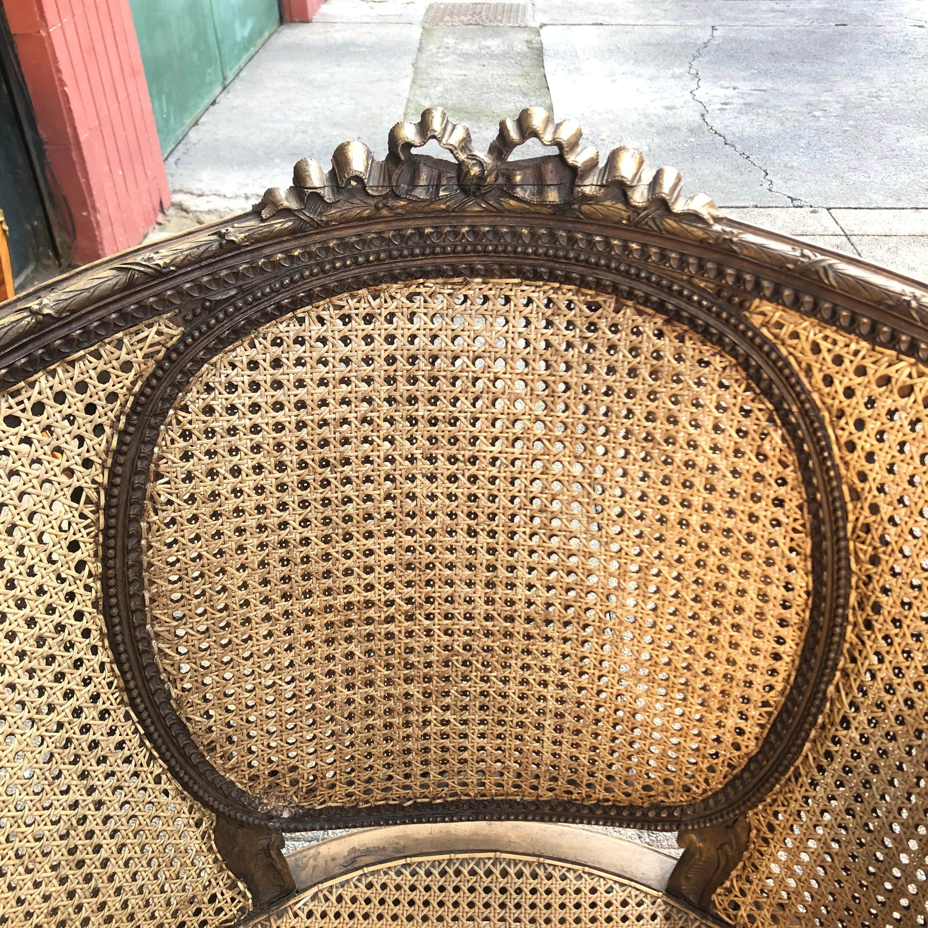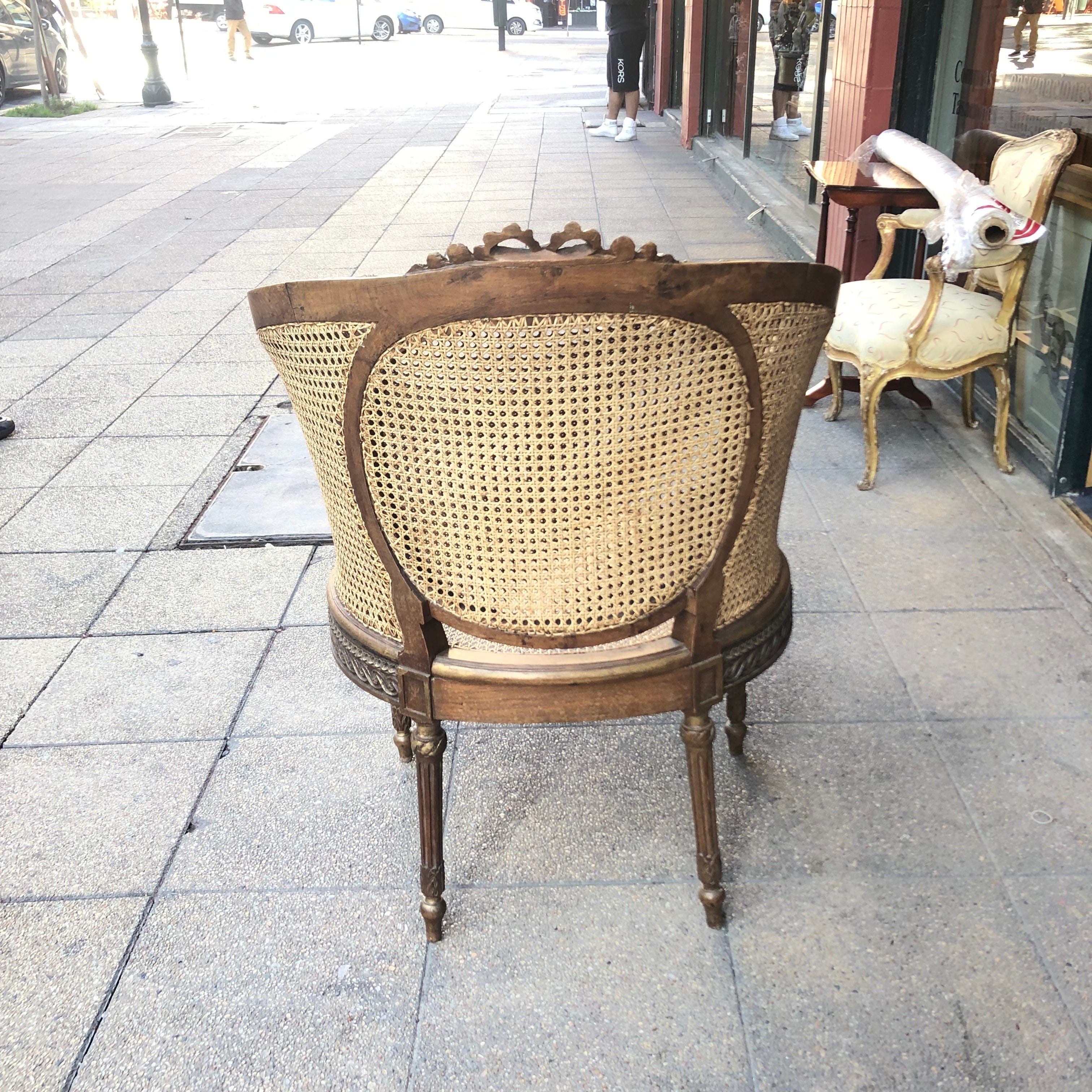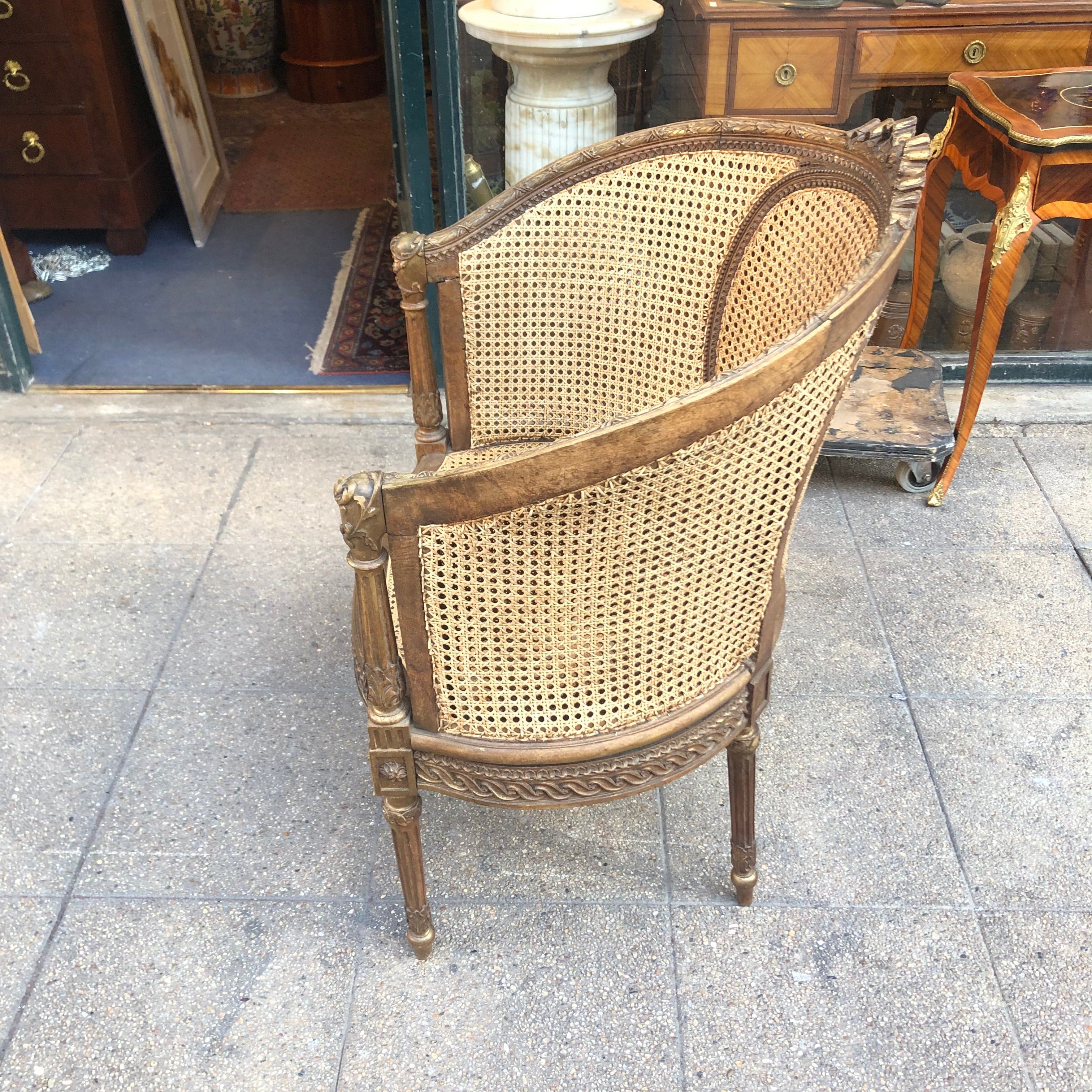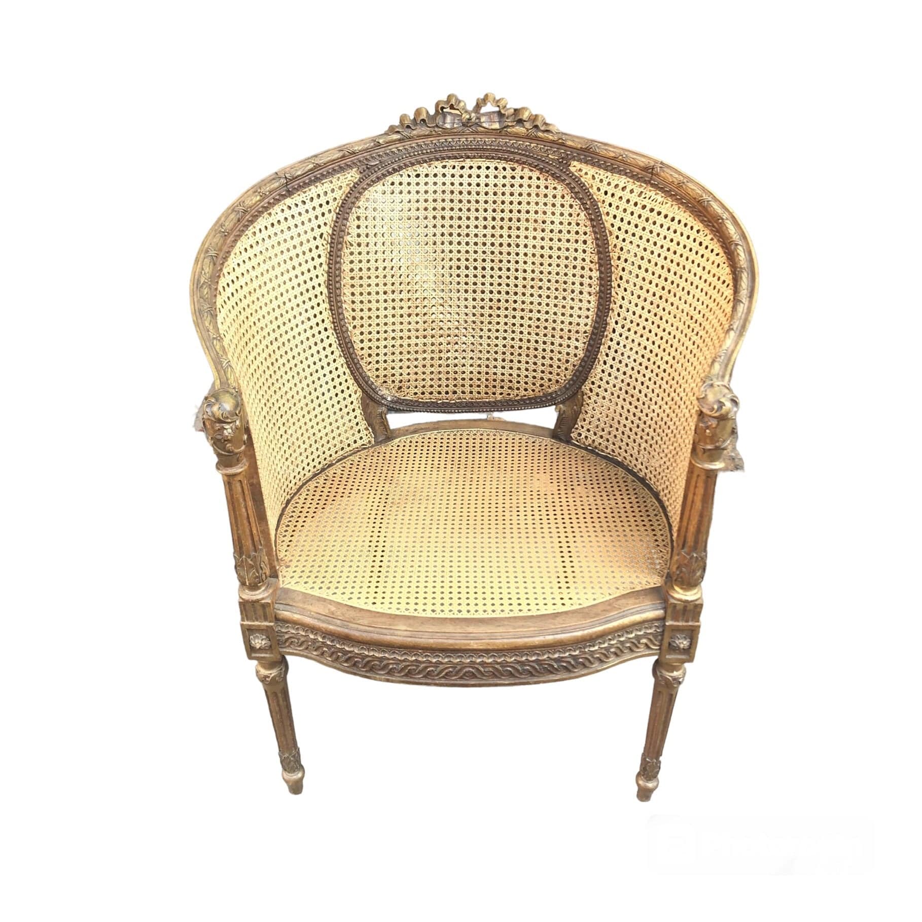 Bello sitial modelo Bergere, estilo Luis XVI, cuenta con enjuncado doble en su respaldo y hermosos tallados.
