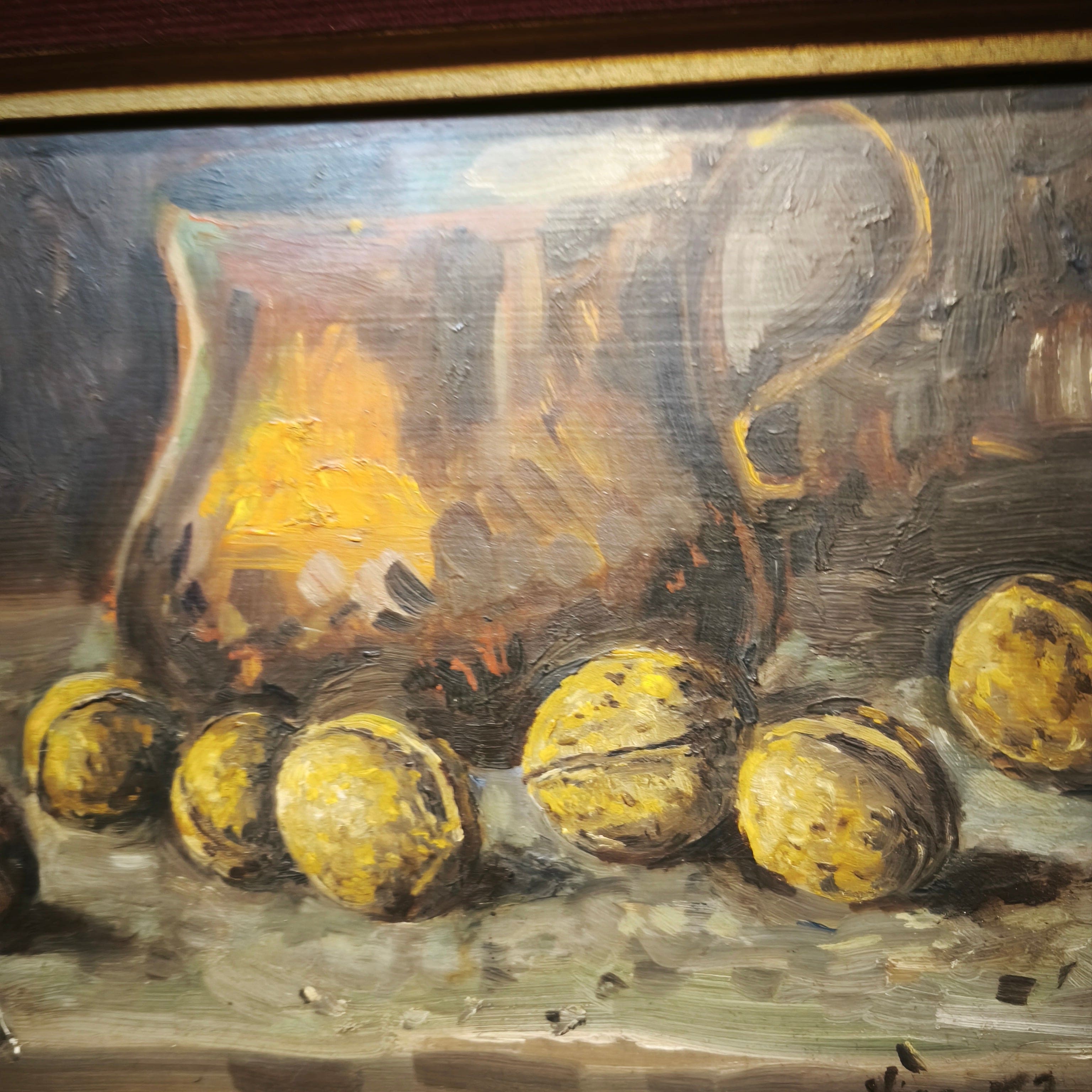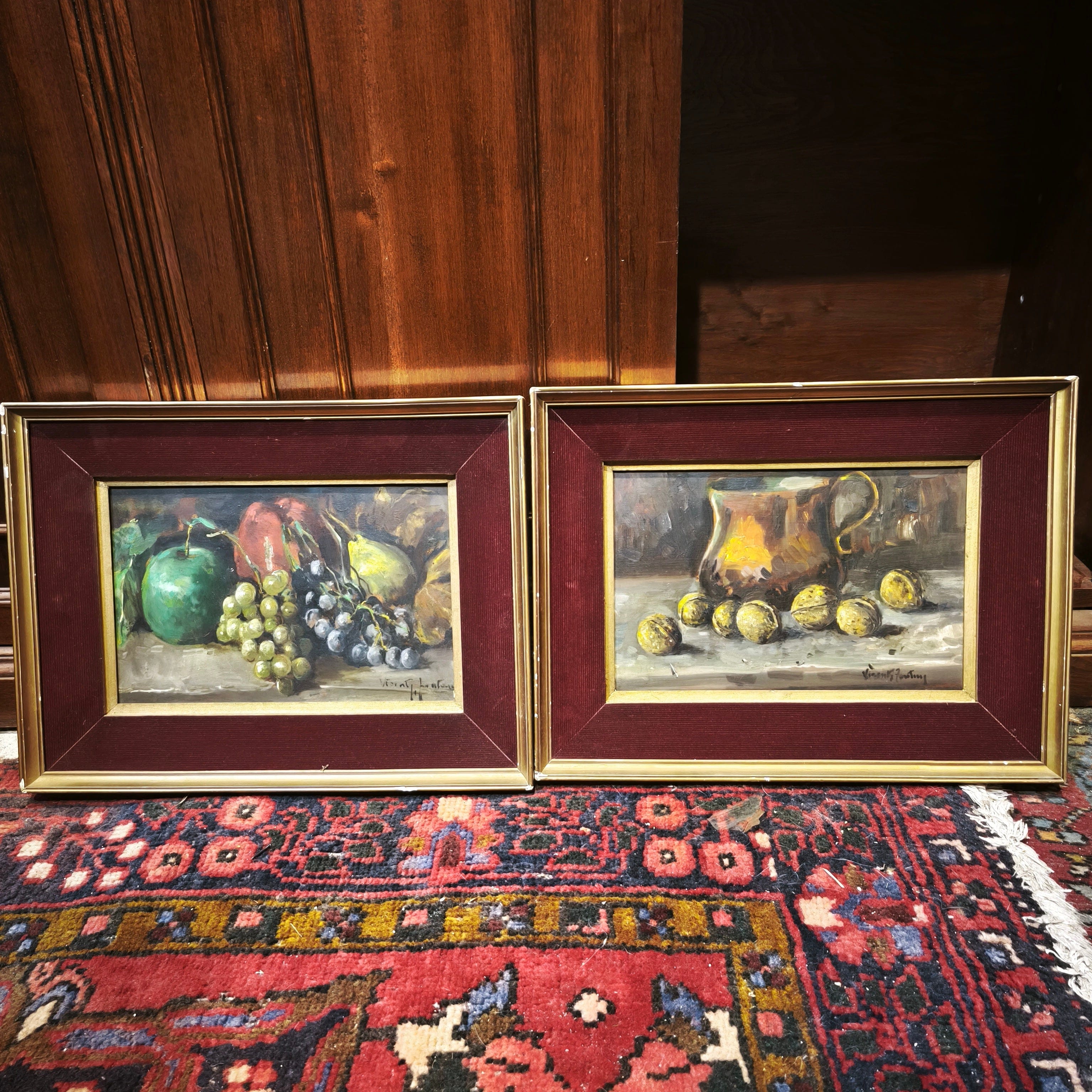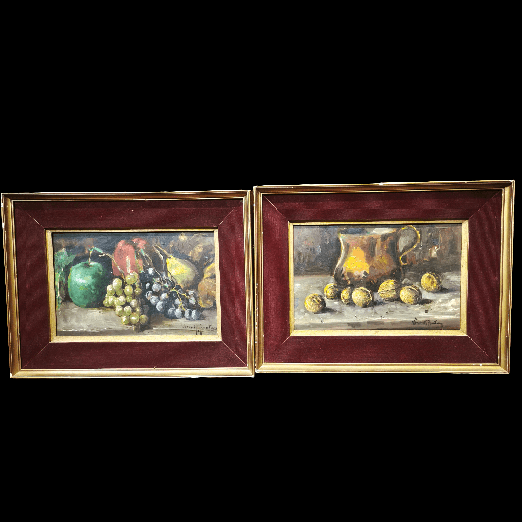 Pandam de óleos sobre trupán del artista Vicente Fortuni, representando dos bodegones, uno con frutas y otro con una jarra de agua y unas nueces. Cada obra está enmarcada en madera pintada de dorado y un elegante paspartú de terciopelo rojo.