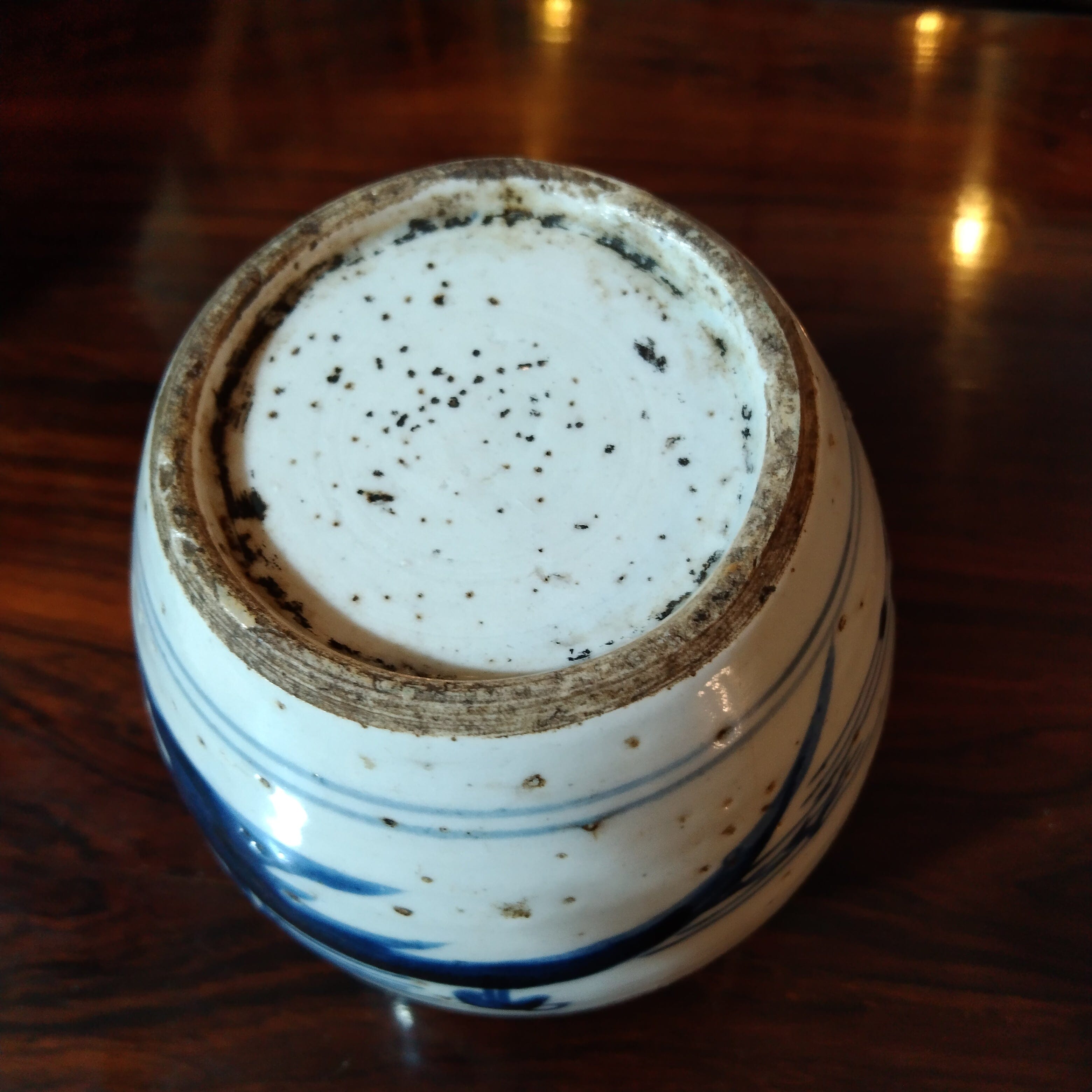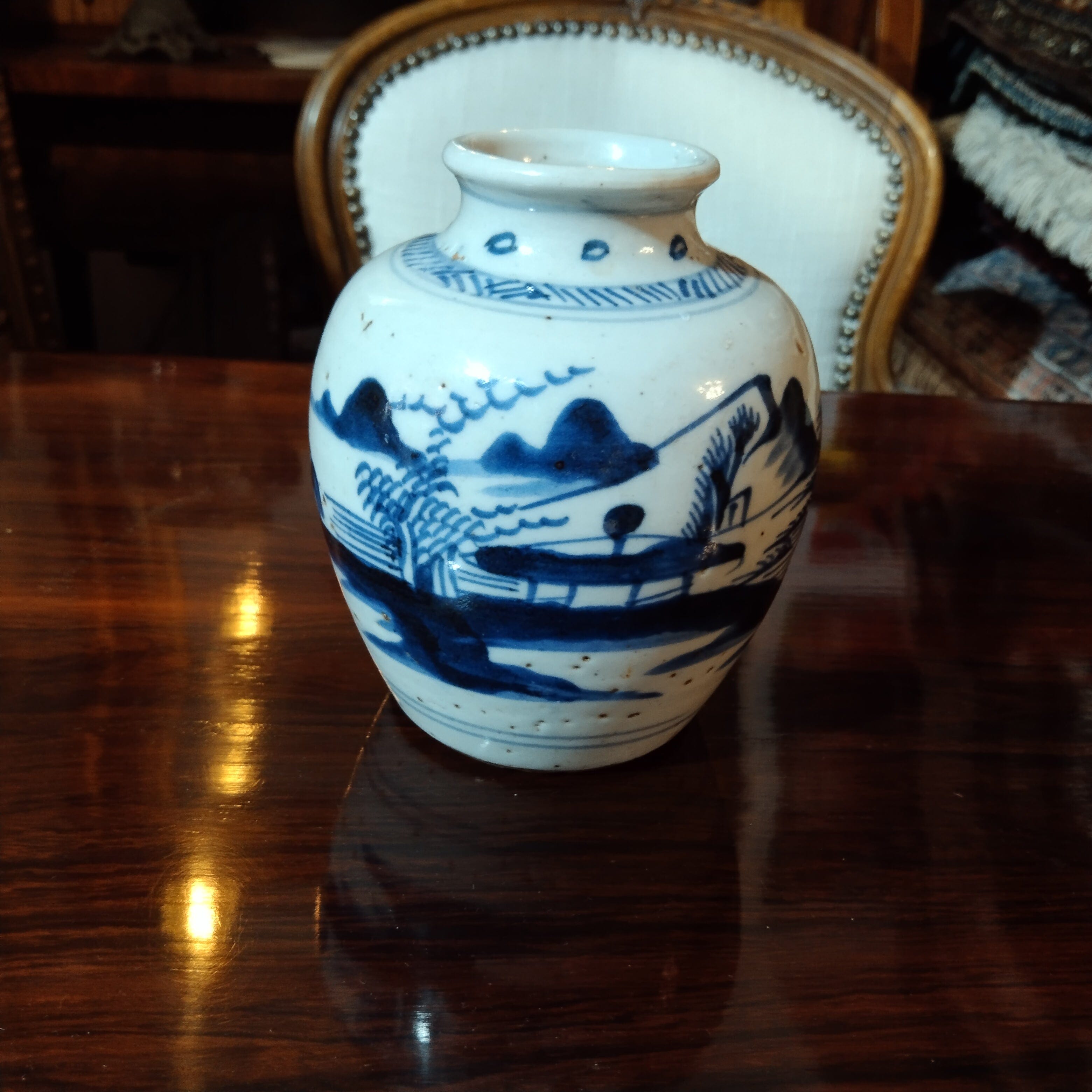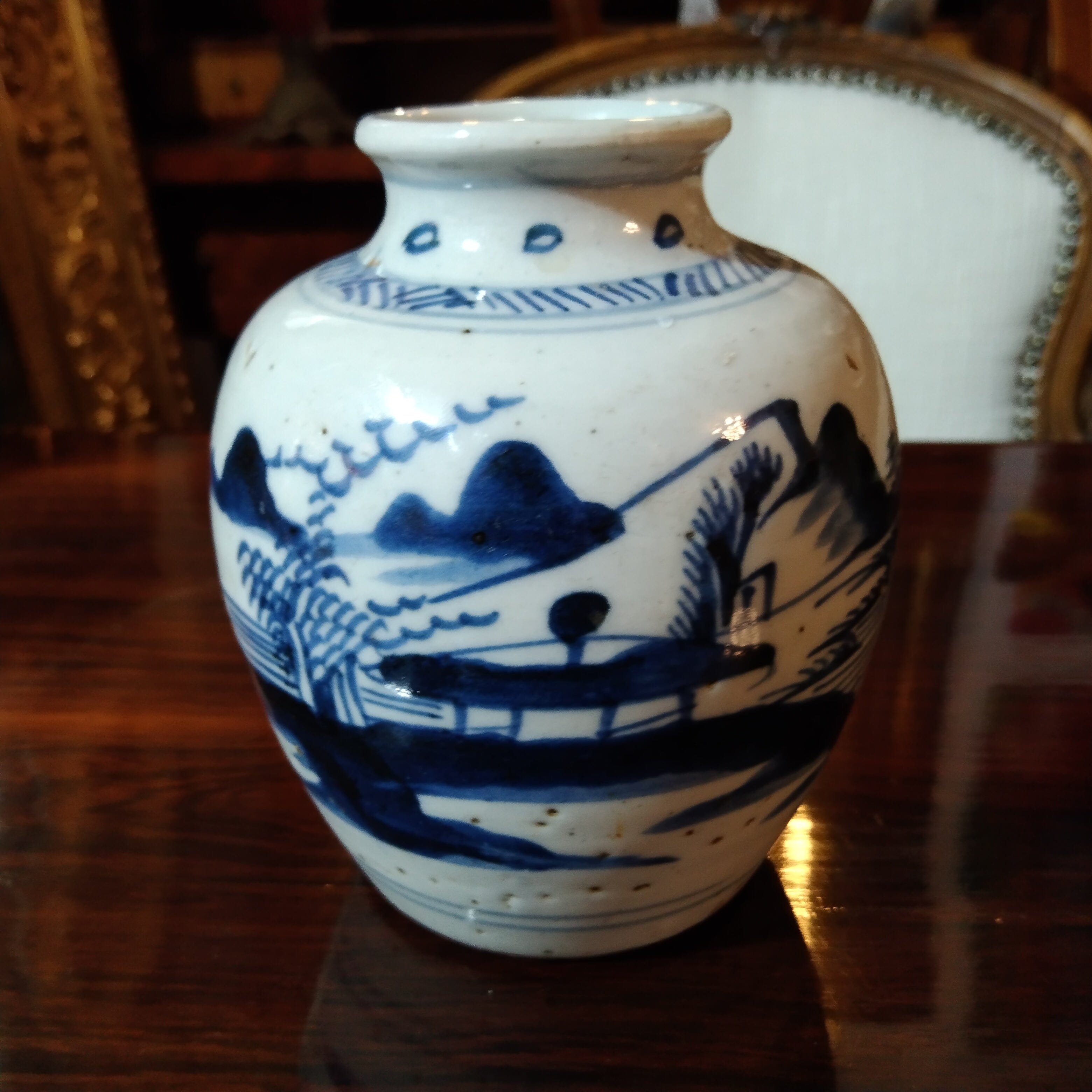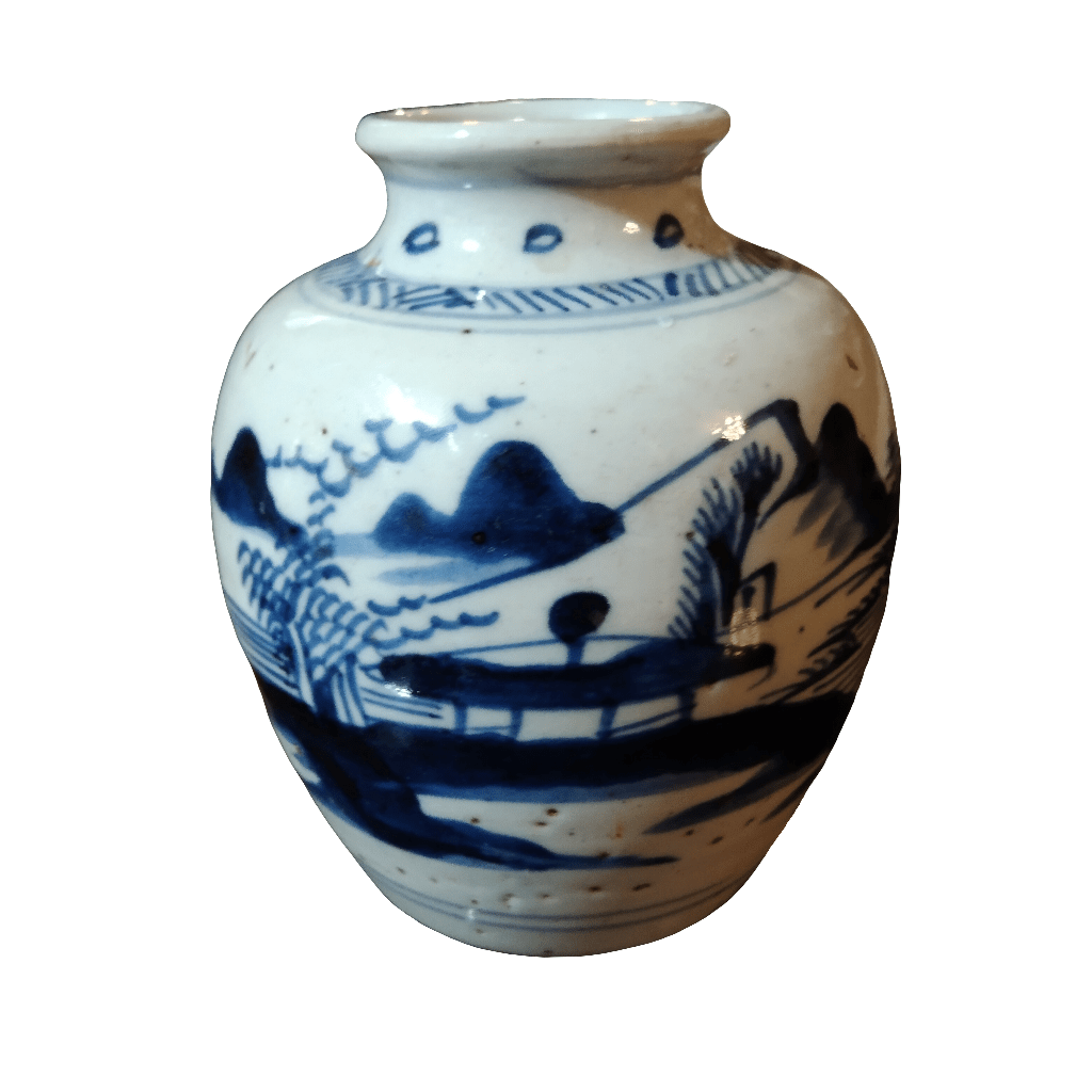 Bello violetero de cerámica china antigua pintado a mano en el tradicional color azul, típico de este estilo de cerámicas. La pieza a muestra un paisaj costero, en el que una figura trabaja la tierra.