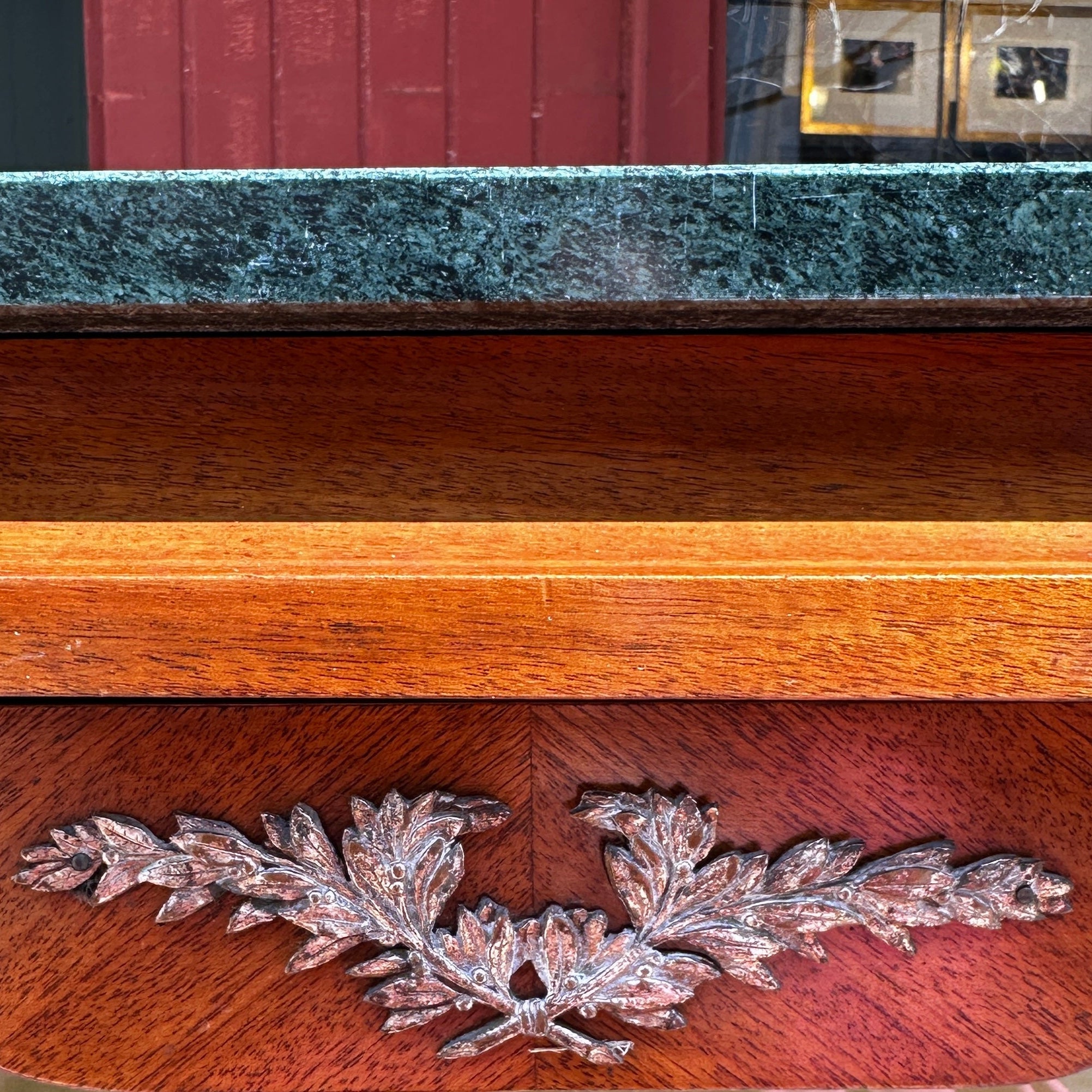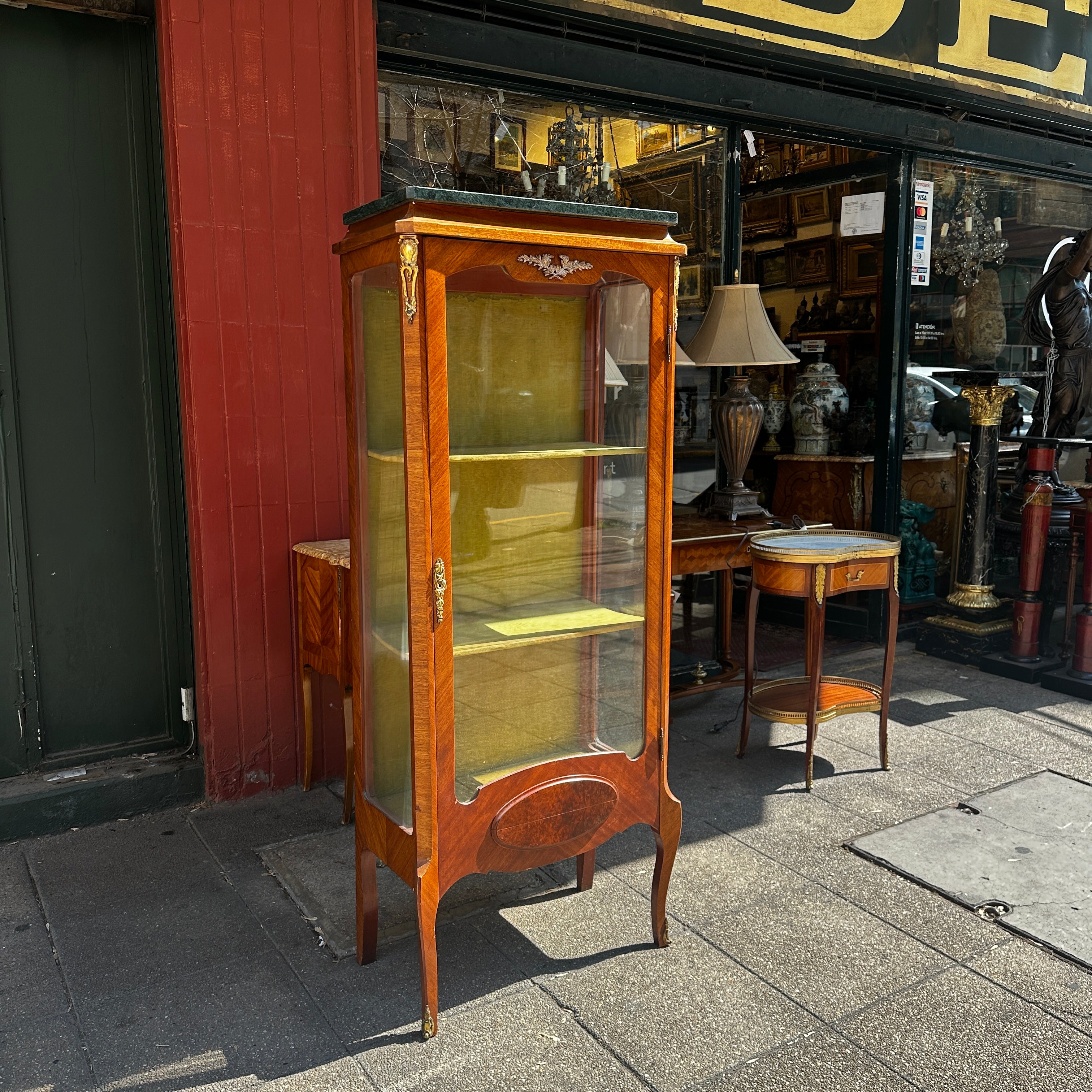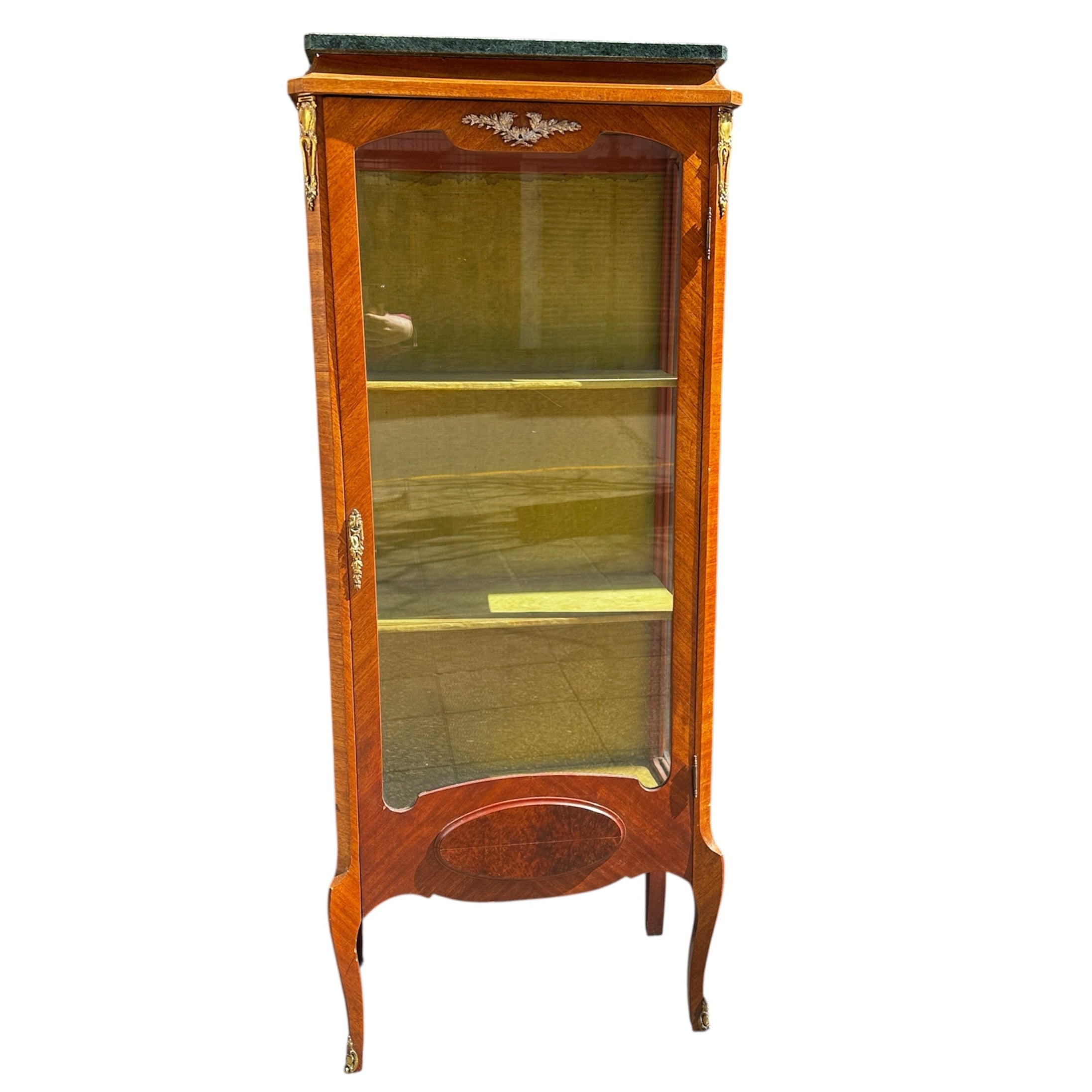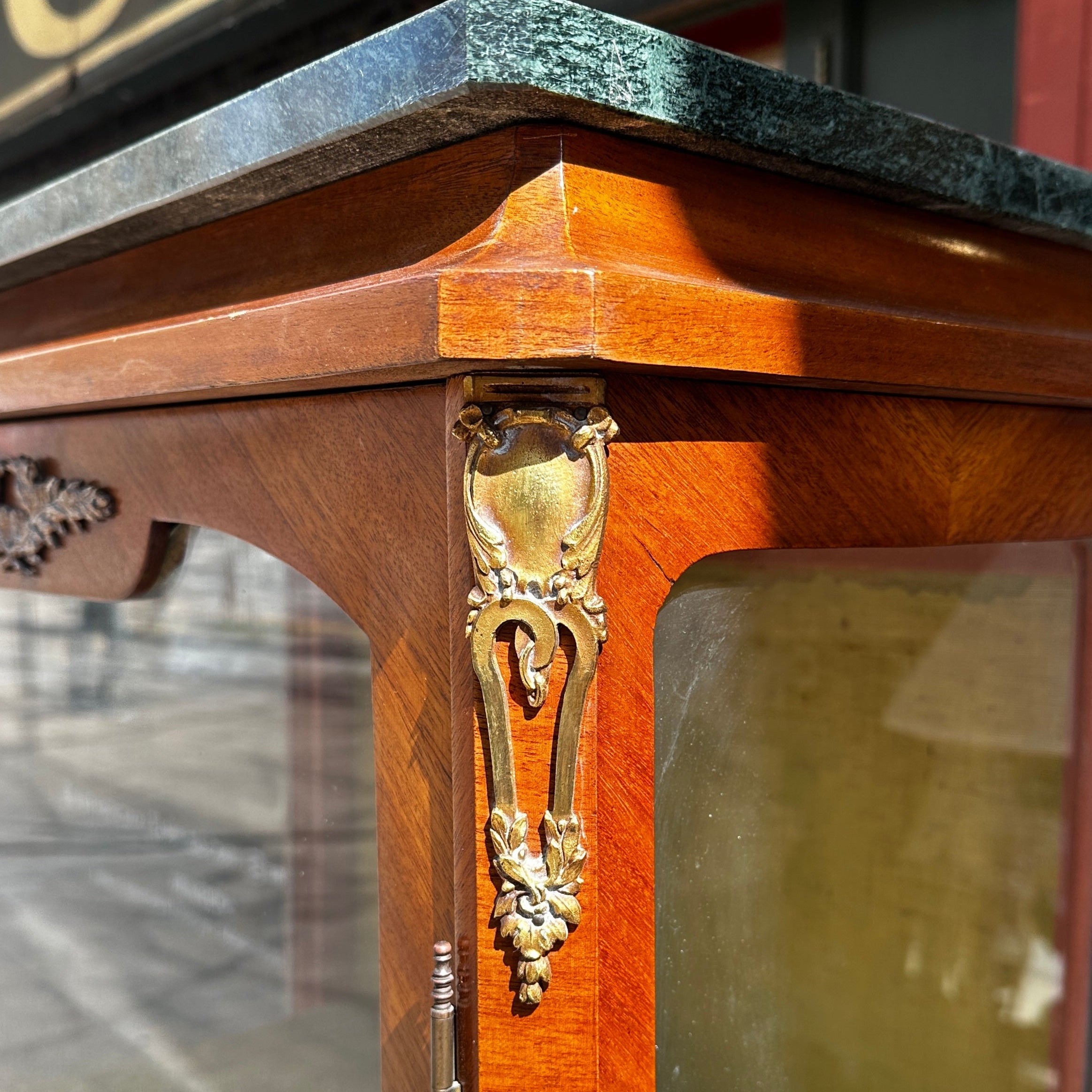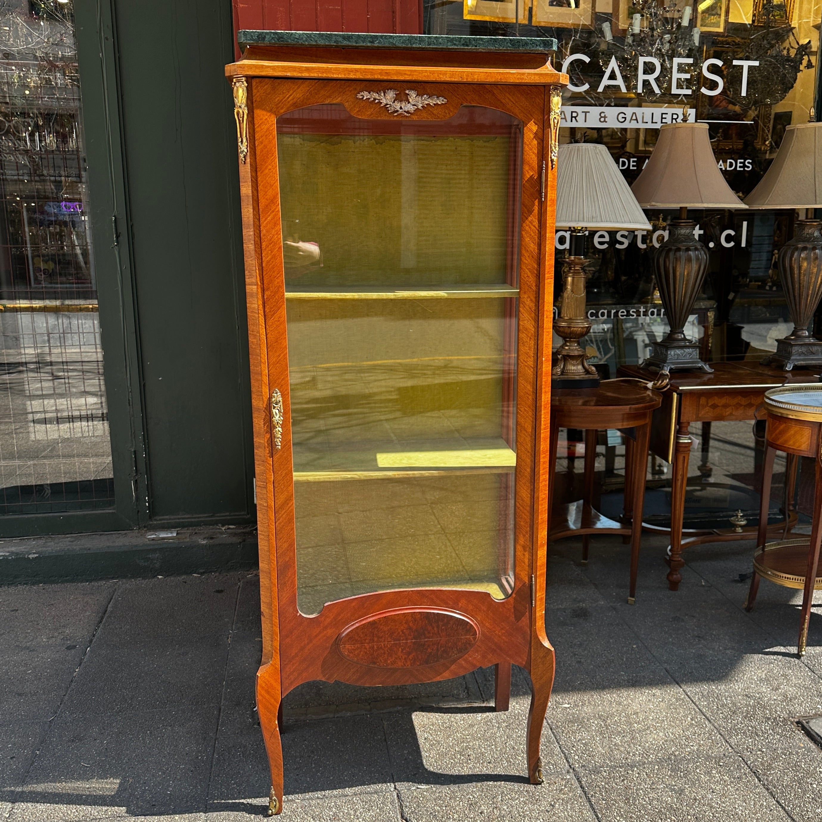 Hermosa vitrina en madera enchapada y cubierta de mármol verde oscuro estilo Luis XVI. Su interior está tapizado en un suave color verde y cuenta con dos repisas y un espacio para guardar cosas. Posee bellos detalles de bronce en las esquinas superiores, en el centro superior y en sus dos patas delanteras.