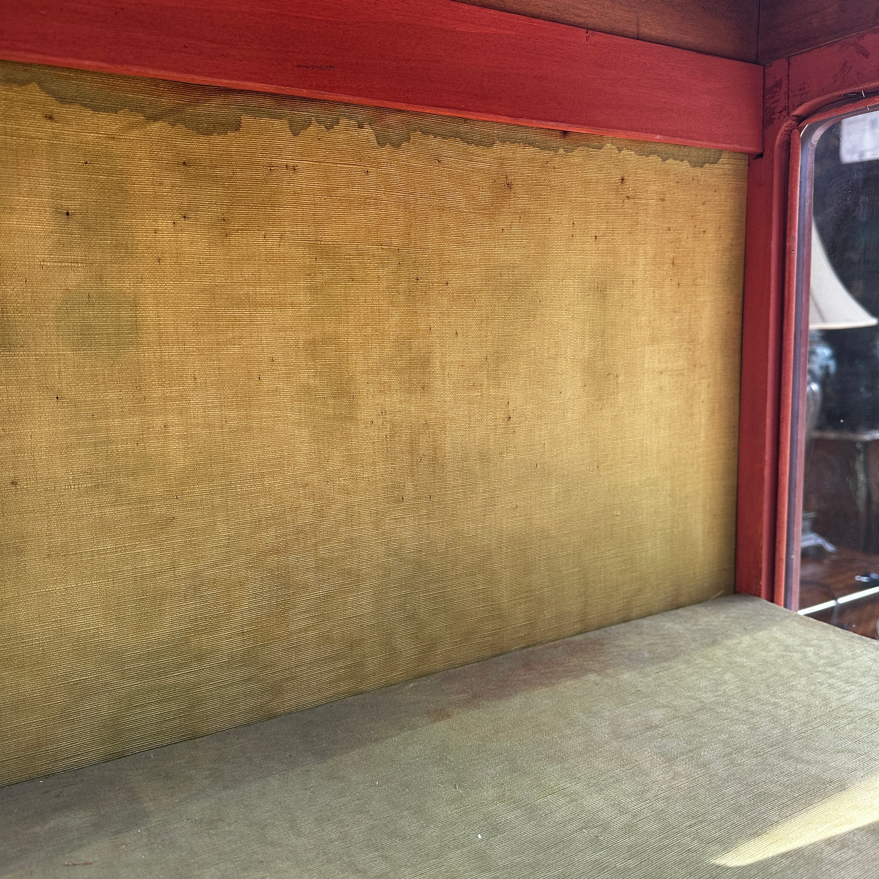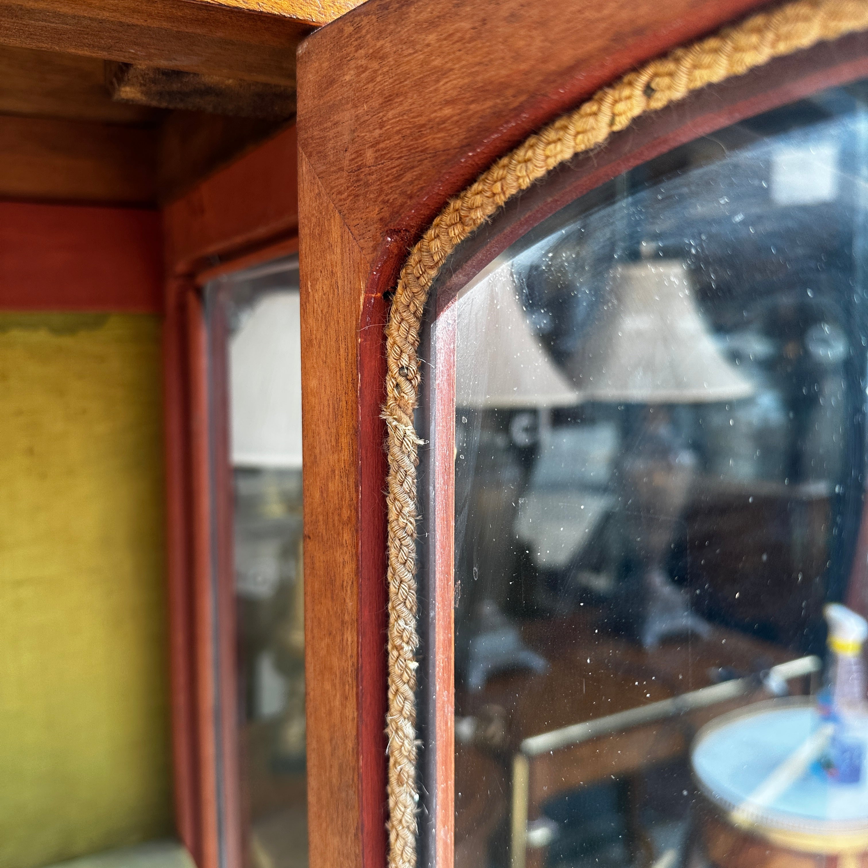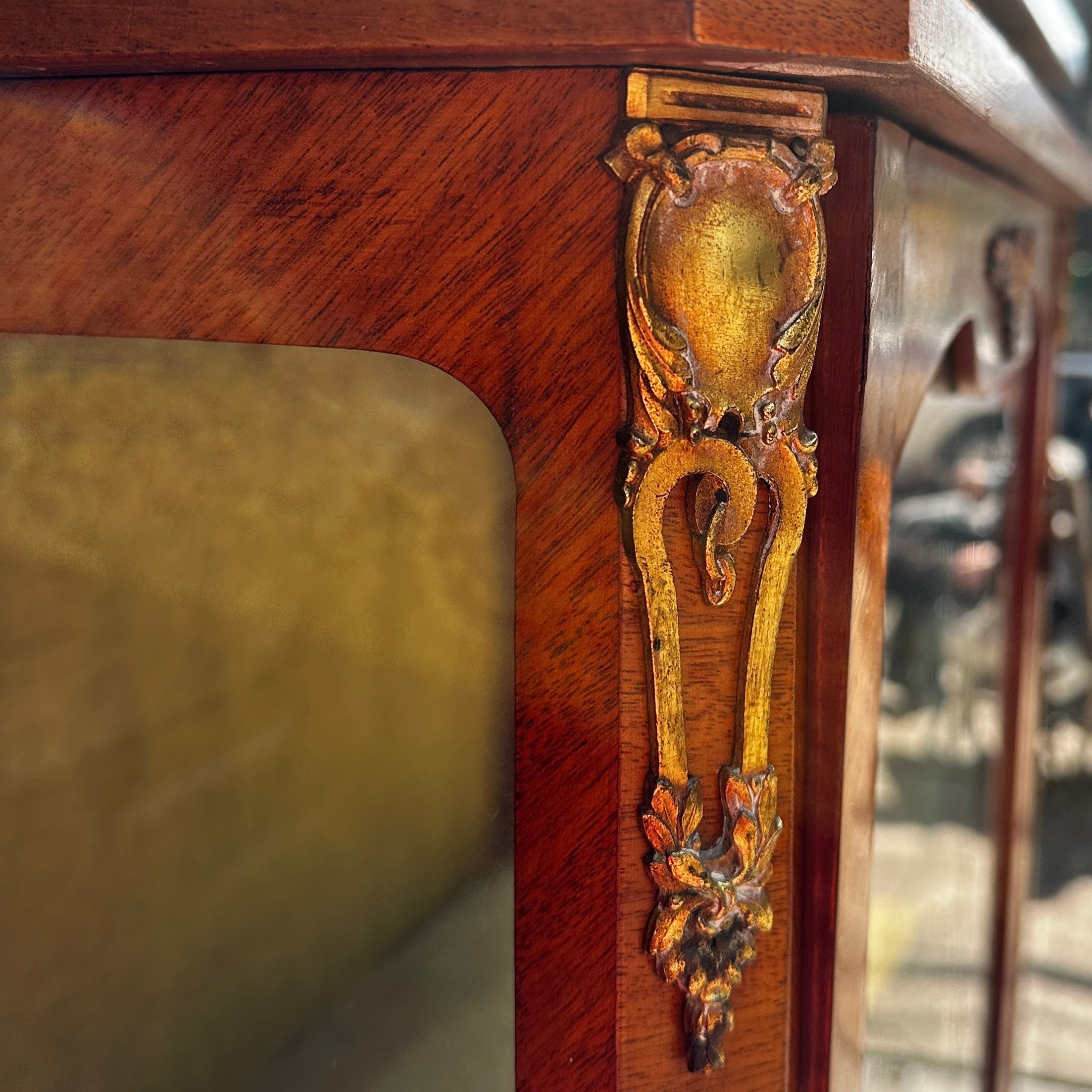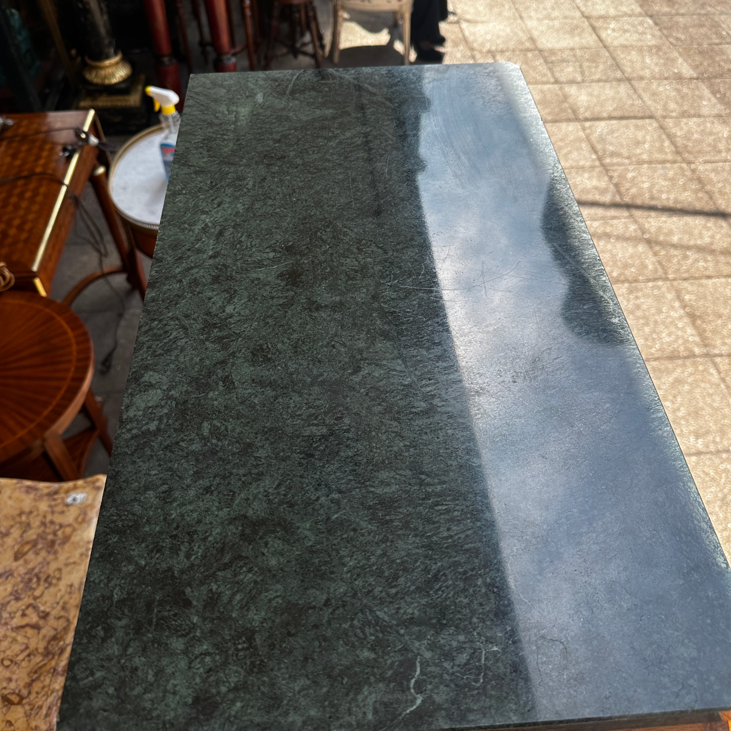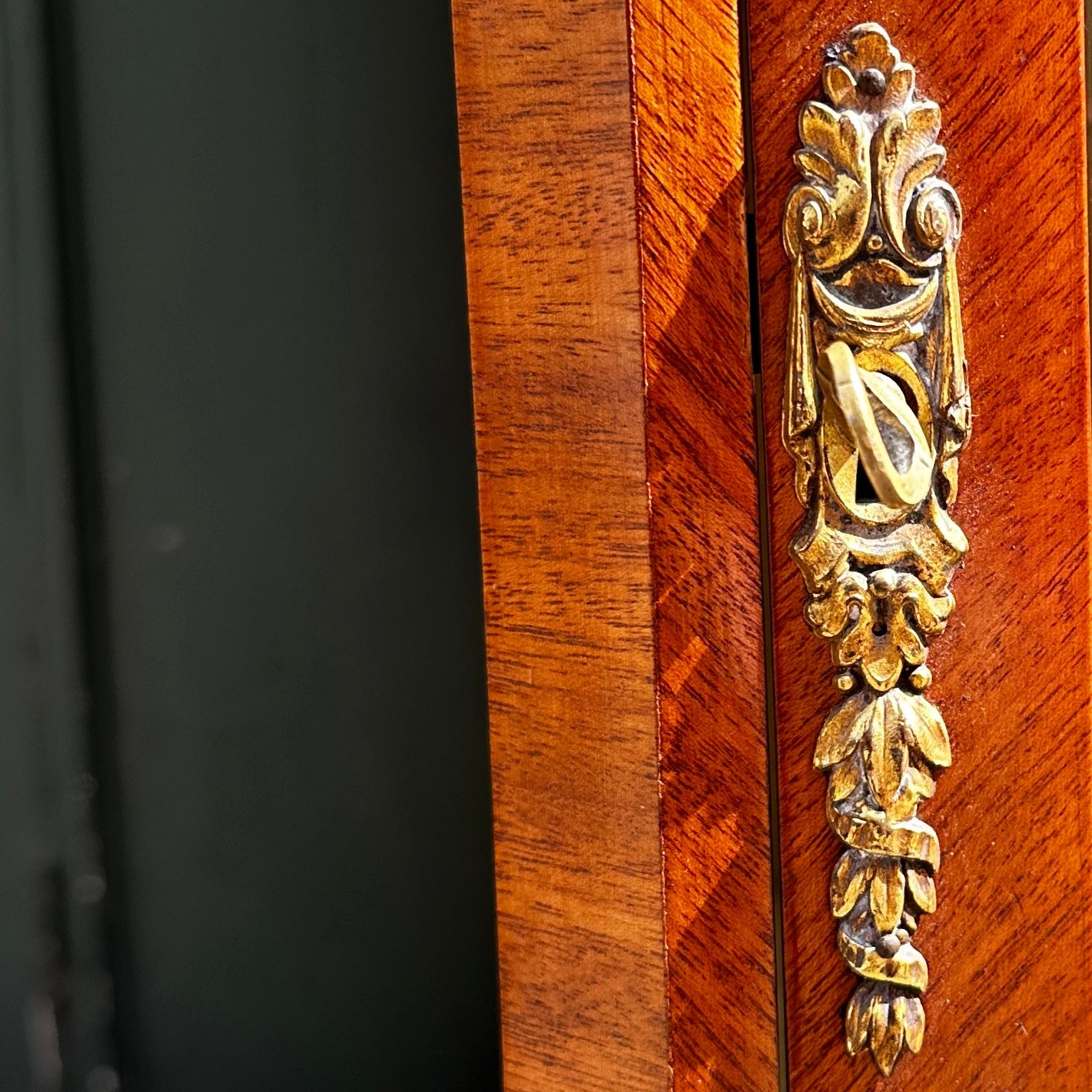 Hermosa vitrina en madera enchapada y cubierta de mármol verde oscuro estilo Luis XVI. Su interior está tapizado en un suave color verde y cuenta con dos repisas y un espacio para guardar cosas. Posee bellos detalles de bronce en las esquinas superiores, en el centro superior y en sus dos patas delanteras.