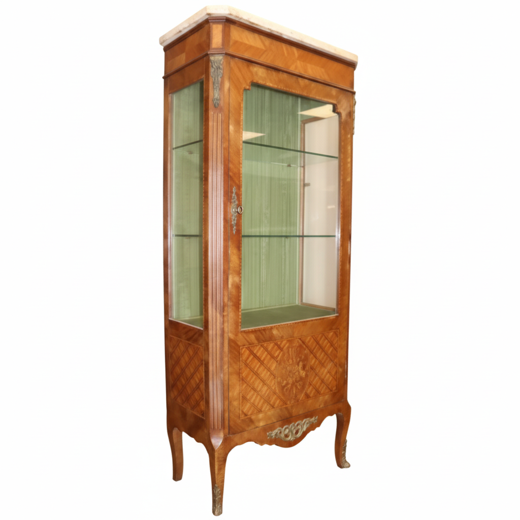 Vitrina enchapada en caoba y palo de rosa, con filetes e incrustaciones marqueteadas representando una alegoría de la música. Decorada con caneluras, rejillas cruzadas y ornamentos de latón (chutes, cerradura, cul‑de‑lampe y zócalos). Tapa de mármol blanco veteado. Estilo Luis XVI circa 1900.