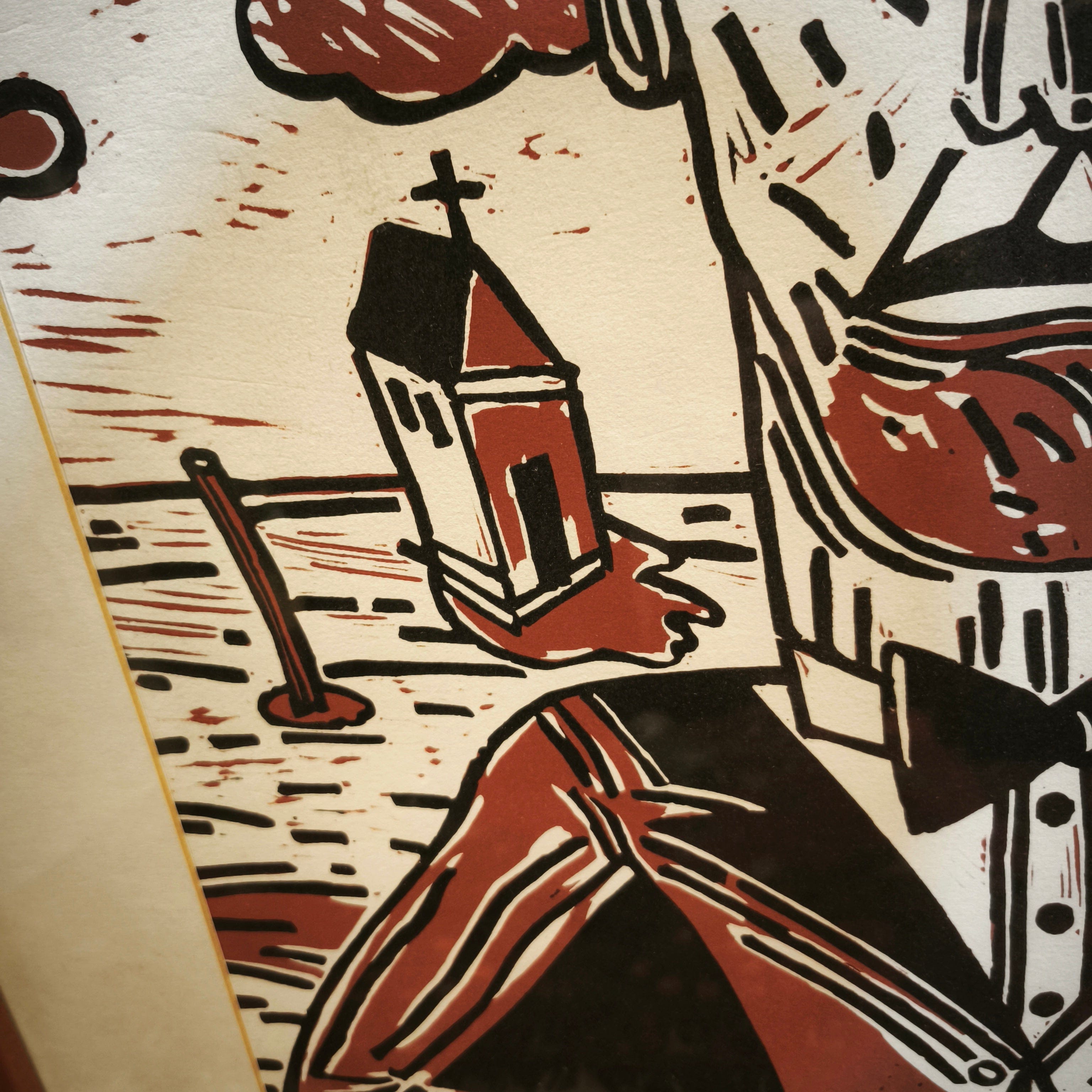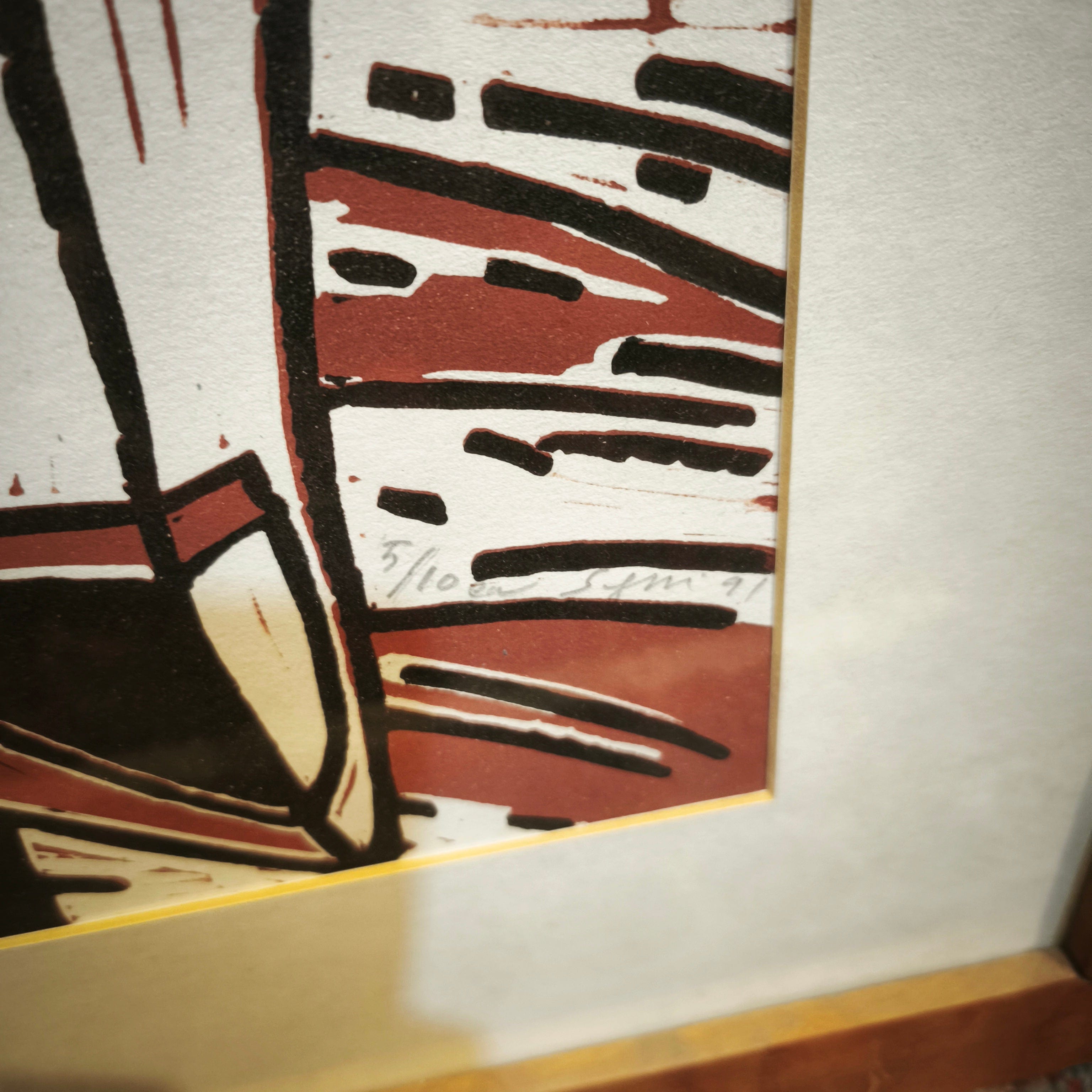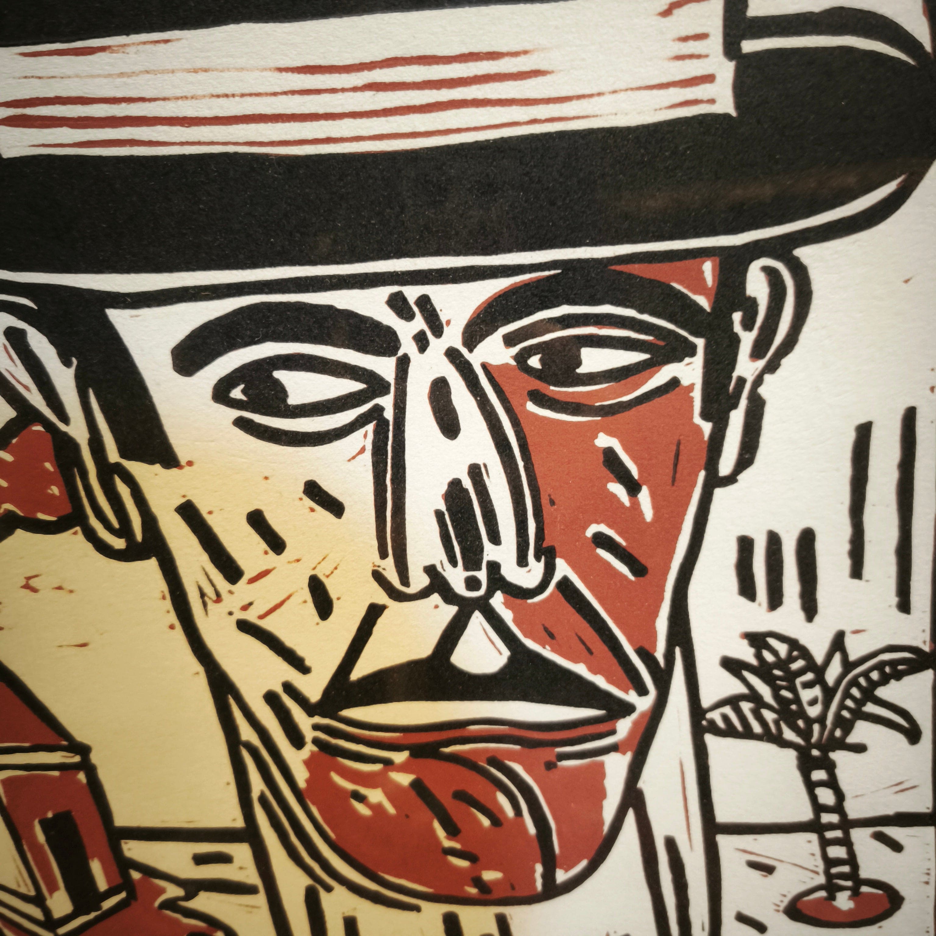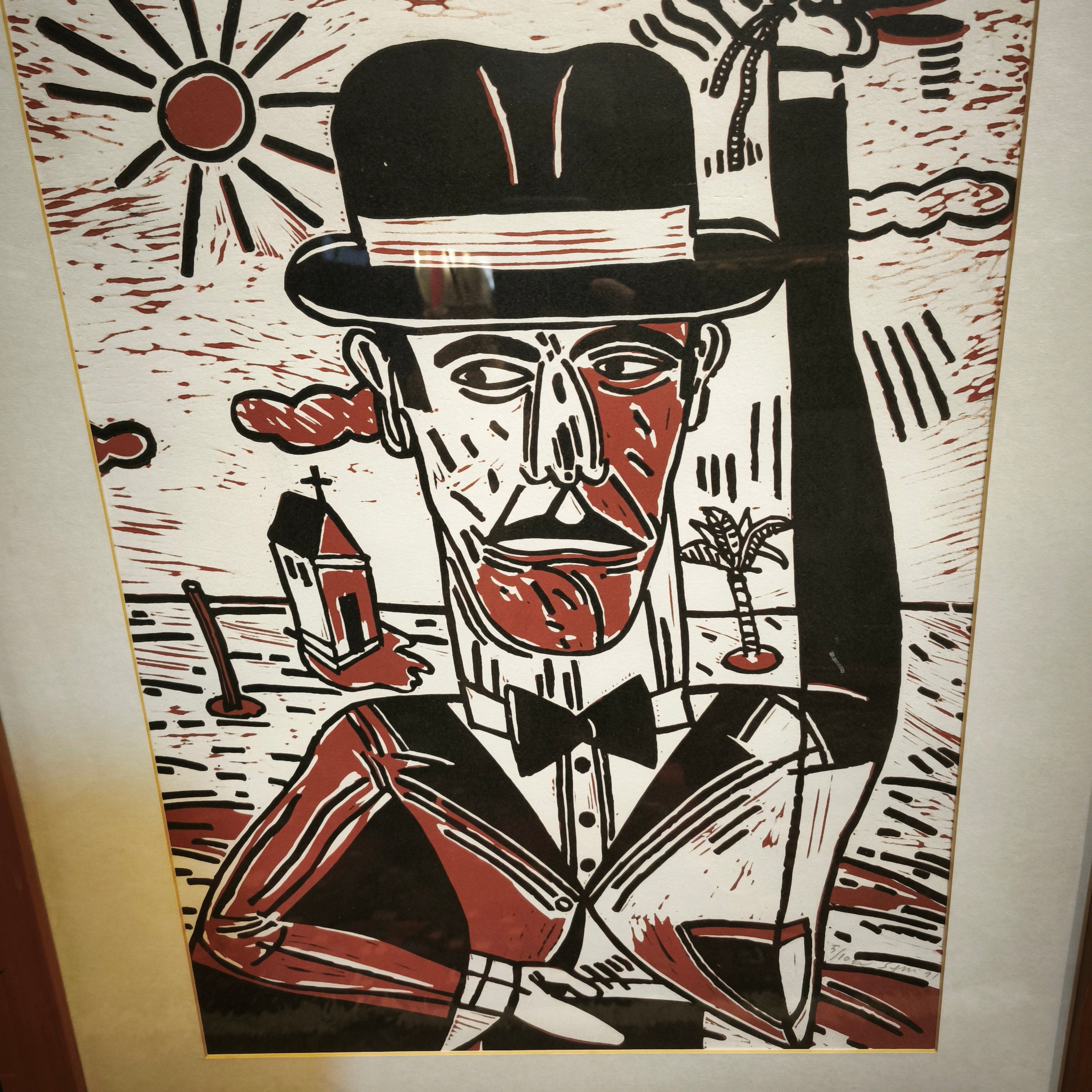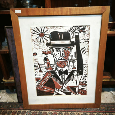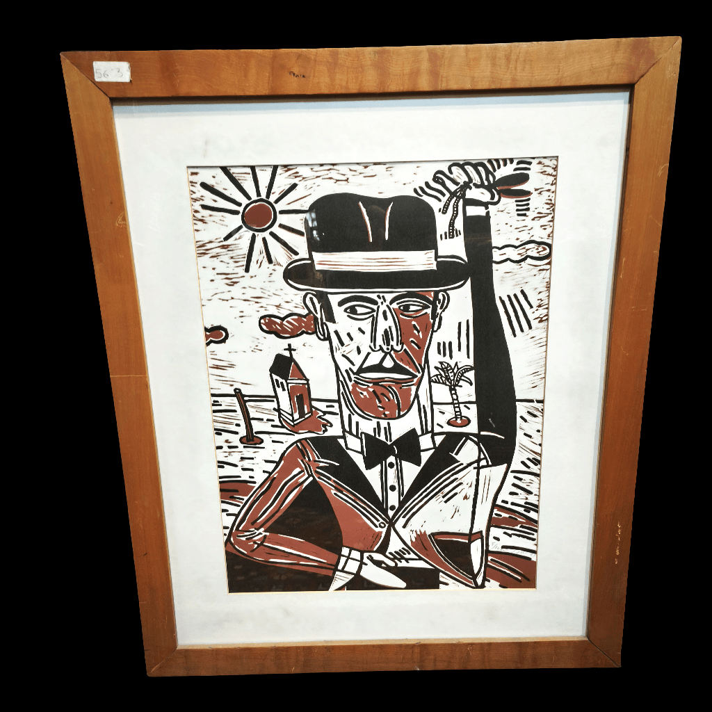 Serigrafía seriada y firmada, realizada por el artista argentino Antonio Seguí en 1991, representando a un hombre vestido de traje y sombrero en un paisaje con elementos inconexis que sugieren un contexto playero o tropical. La obra juega con las luces y sombras, mezclando el blanco, negro y el rojo ladrillo. La obra está enmarcada en sobria madera.