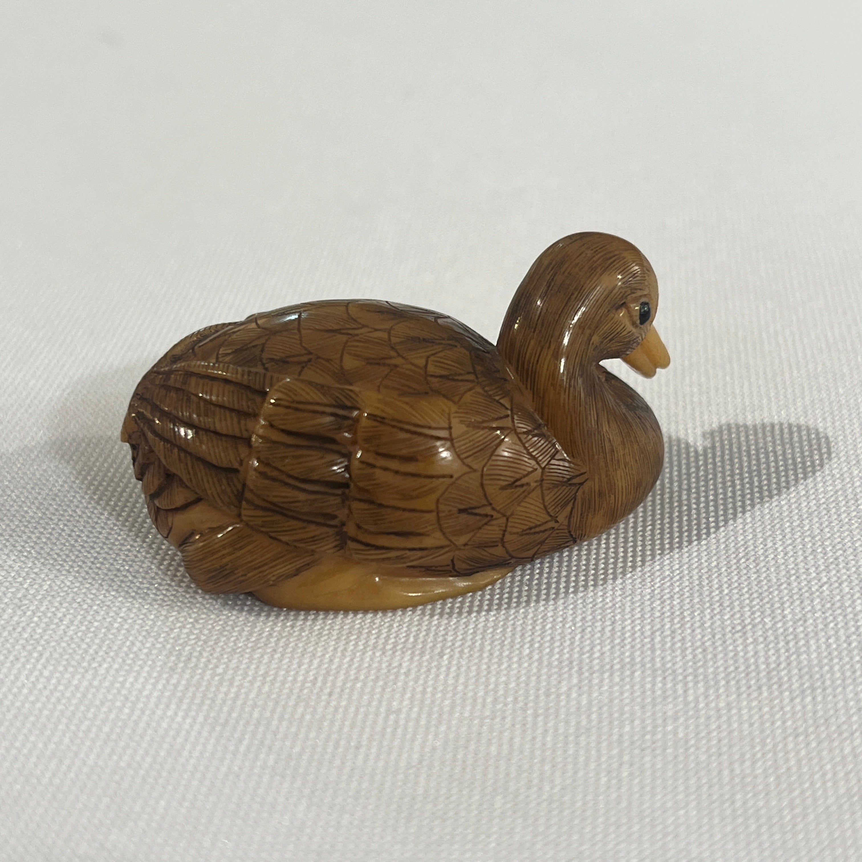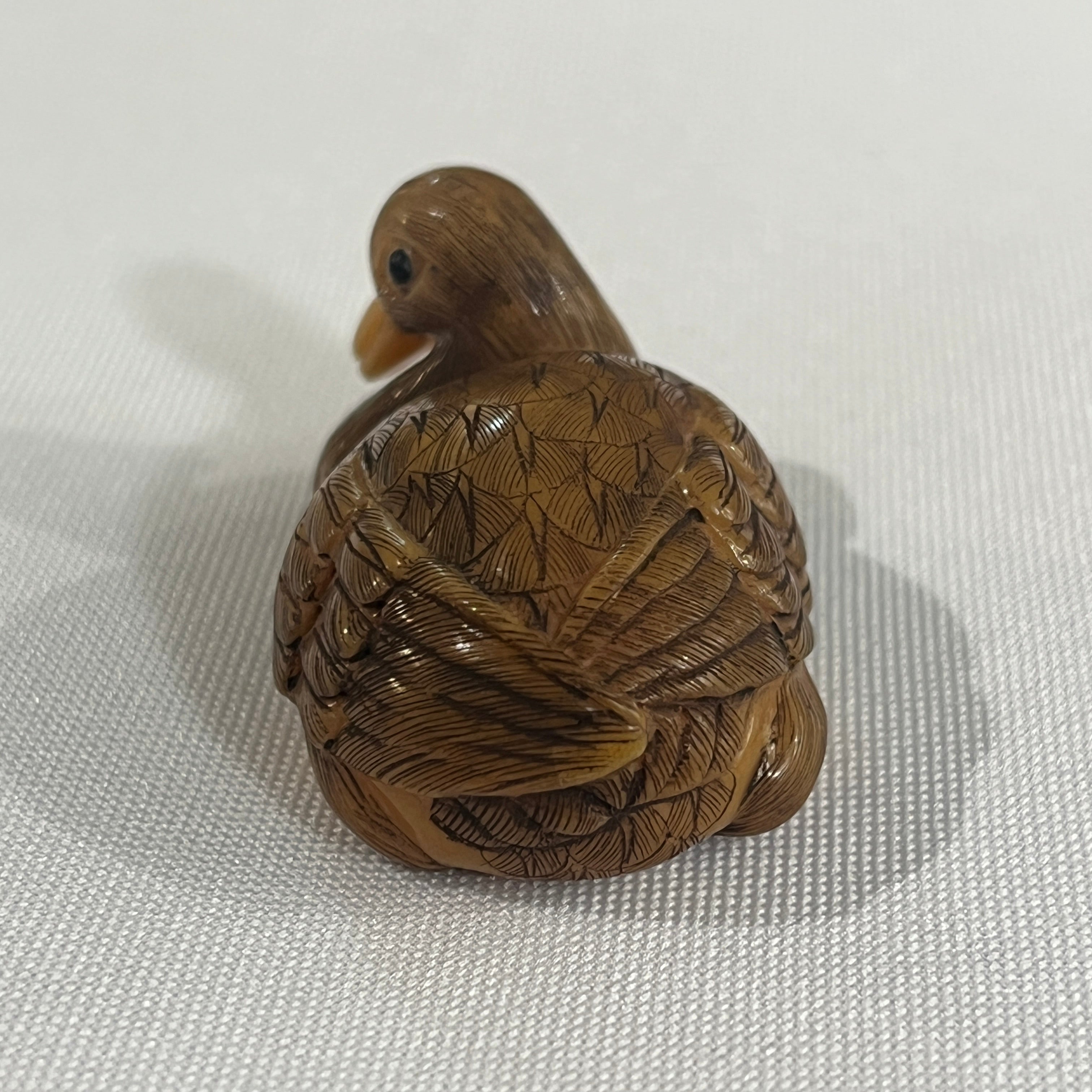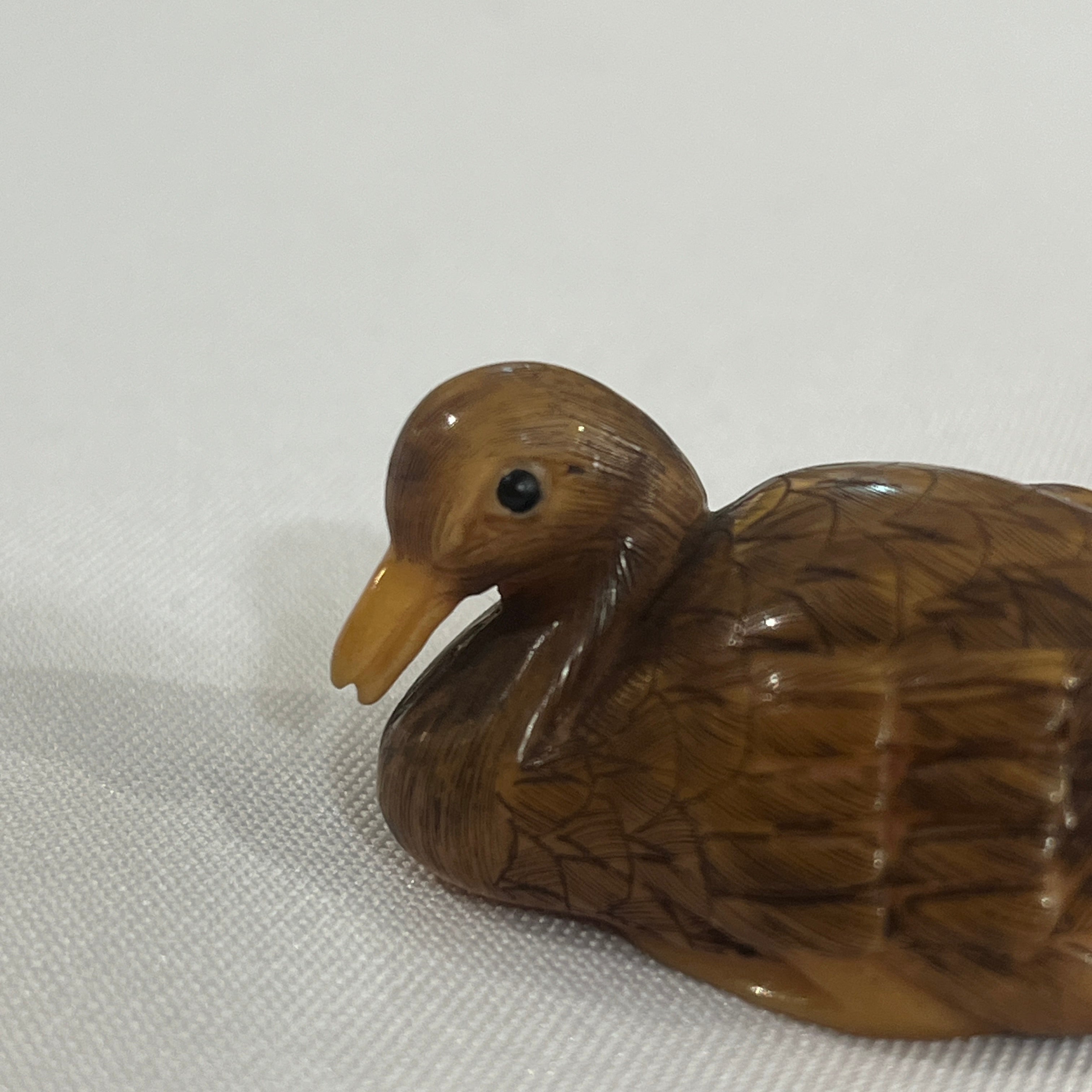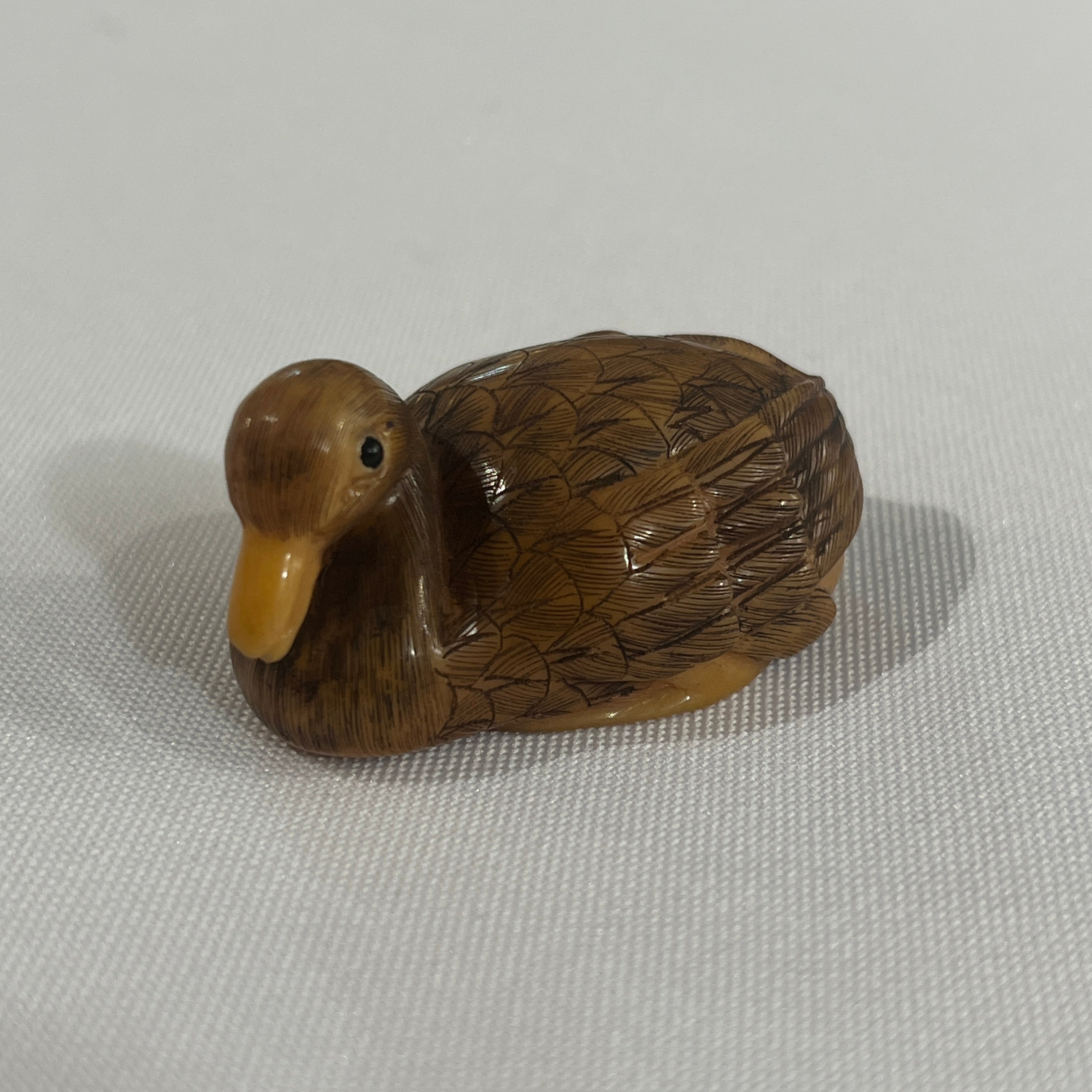 Preciosa figura Netsuke en madera, representando un pato La pieza está tallada detalladamente y tiene las características tradicionales de este singular objeto de la cultura japonesa, cómo su inscripción, aunque no tiene sus huecos para amarrar al kimono, haciendo de esta una pieza decorativa. En su base trae una inscripción que dice '