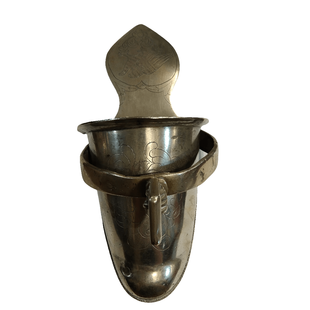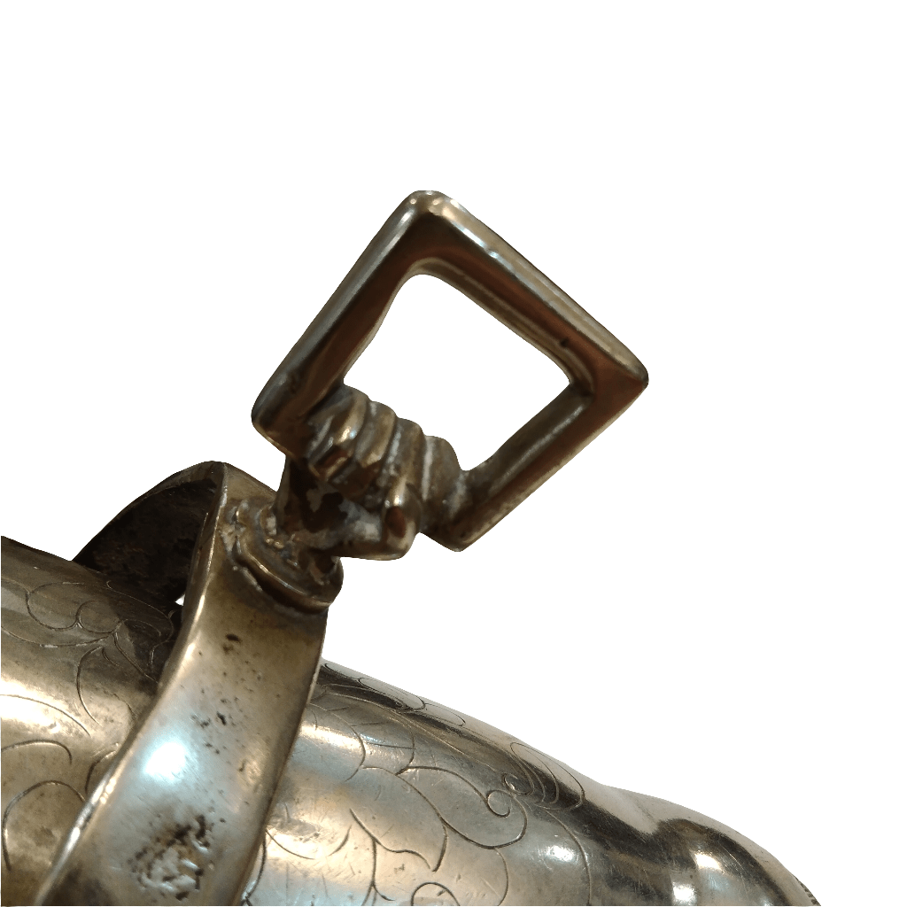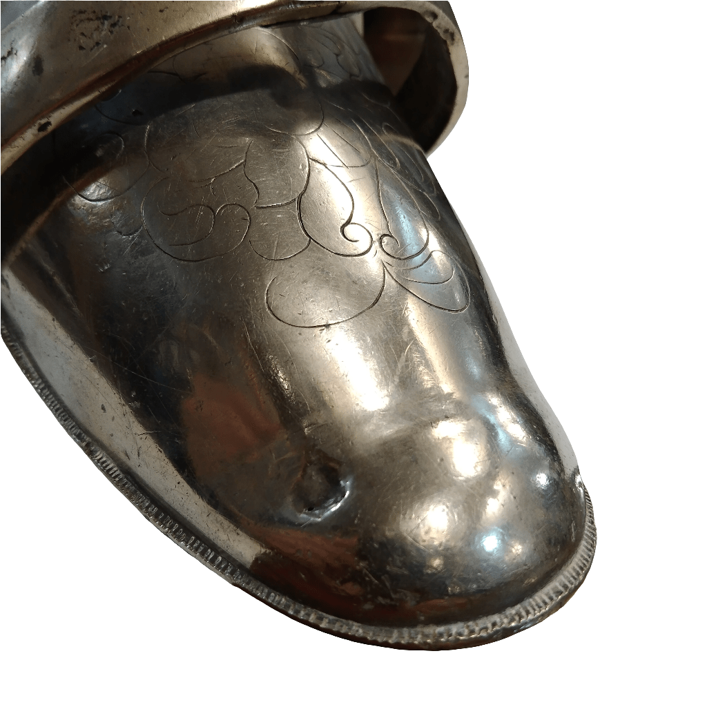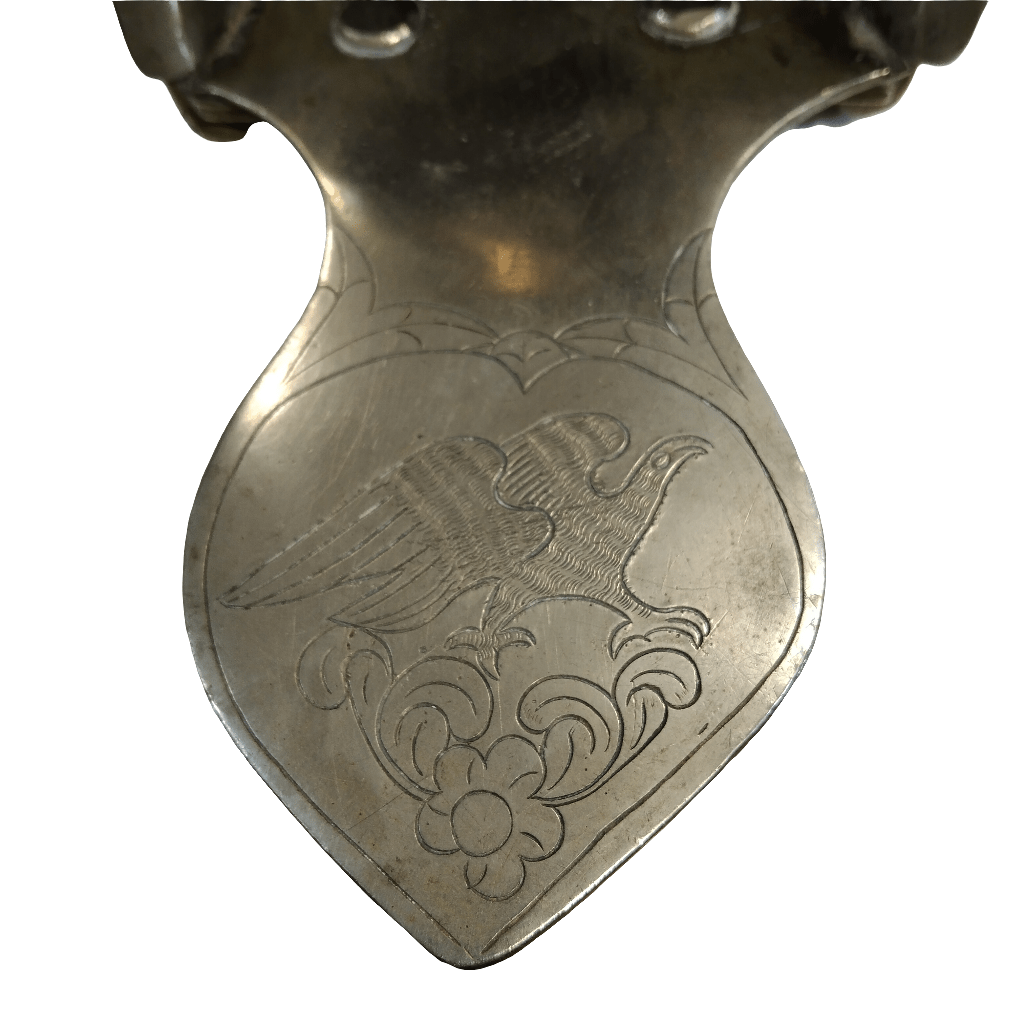 Increíble estribo antiguo, hecho de plata, con un bello y sobrio diseño, con tallados a mano, representando un águila y motivos florales, y una hebilla con forma de puño.