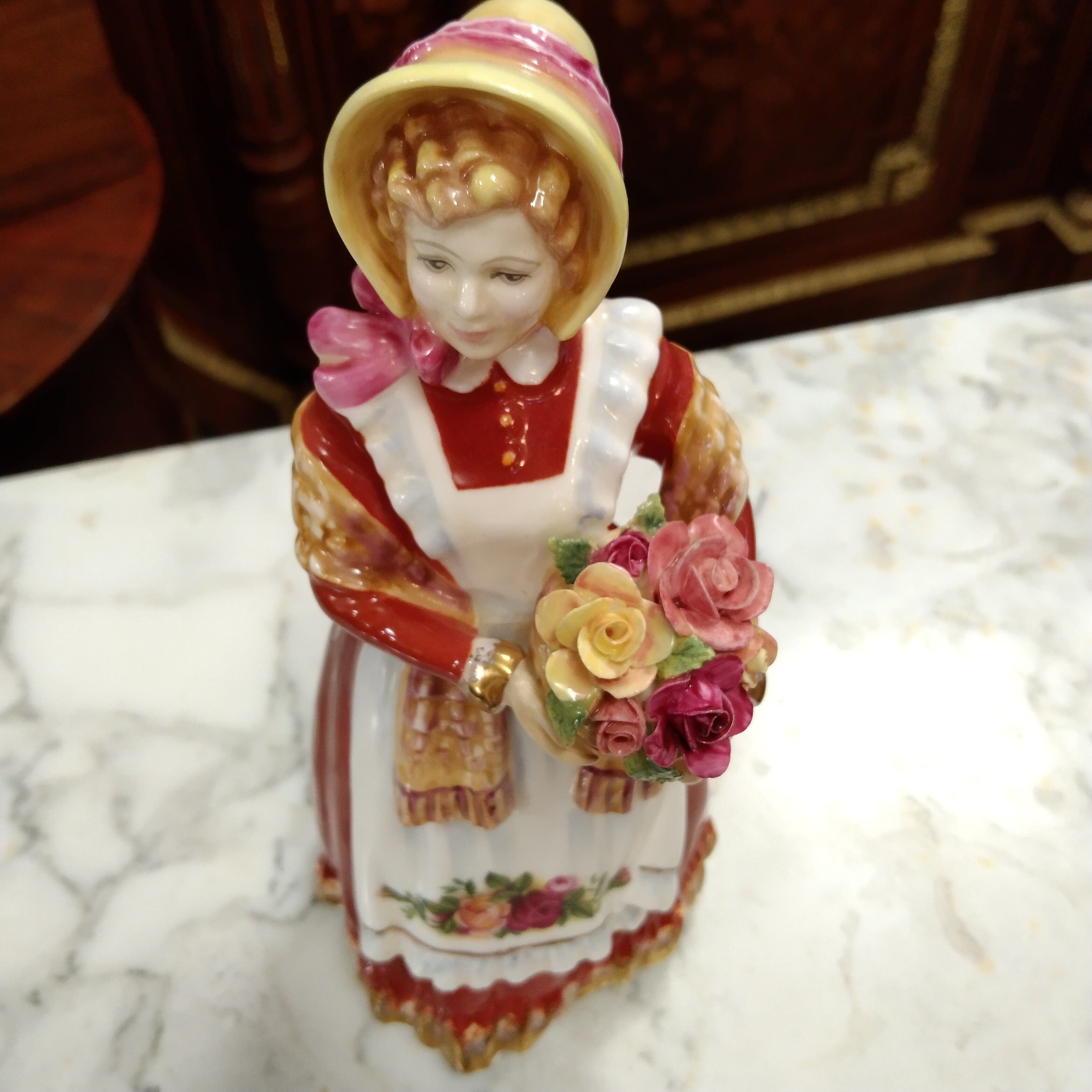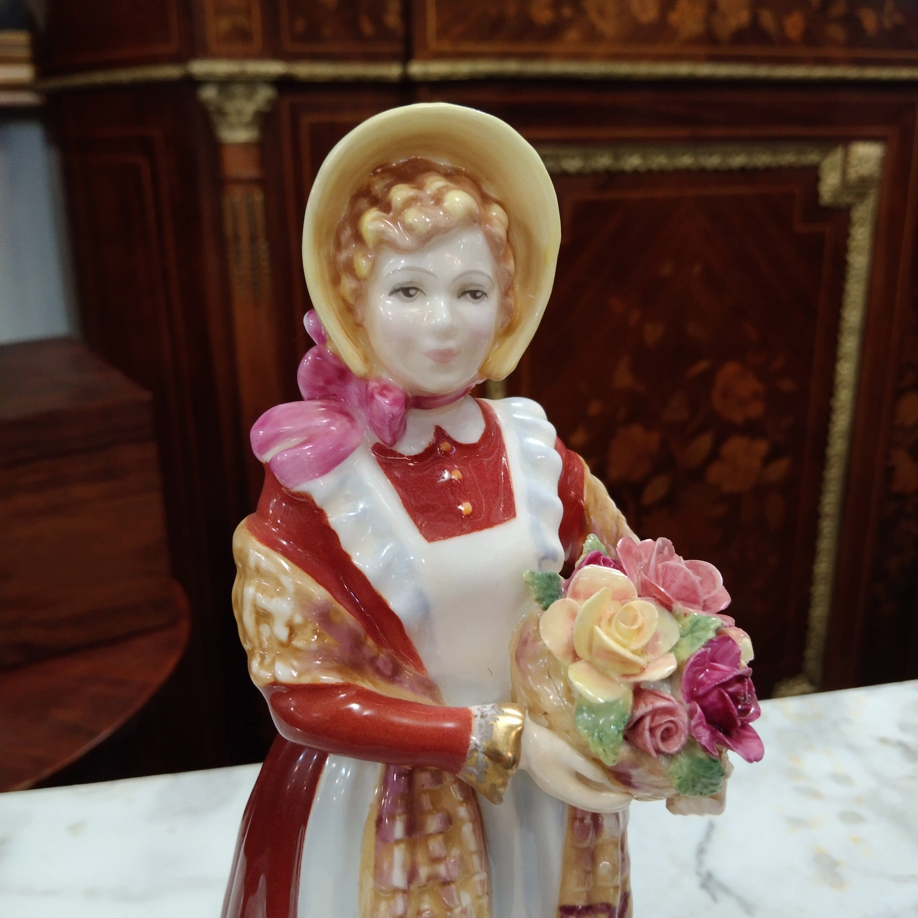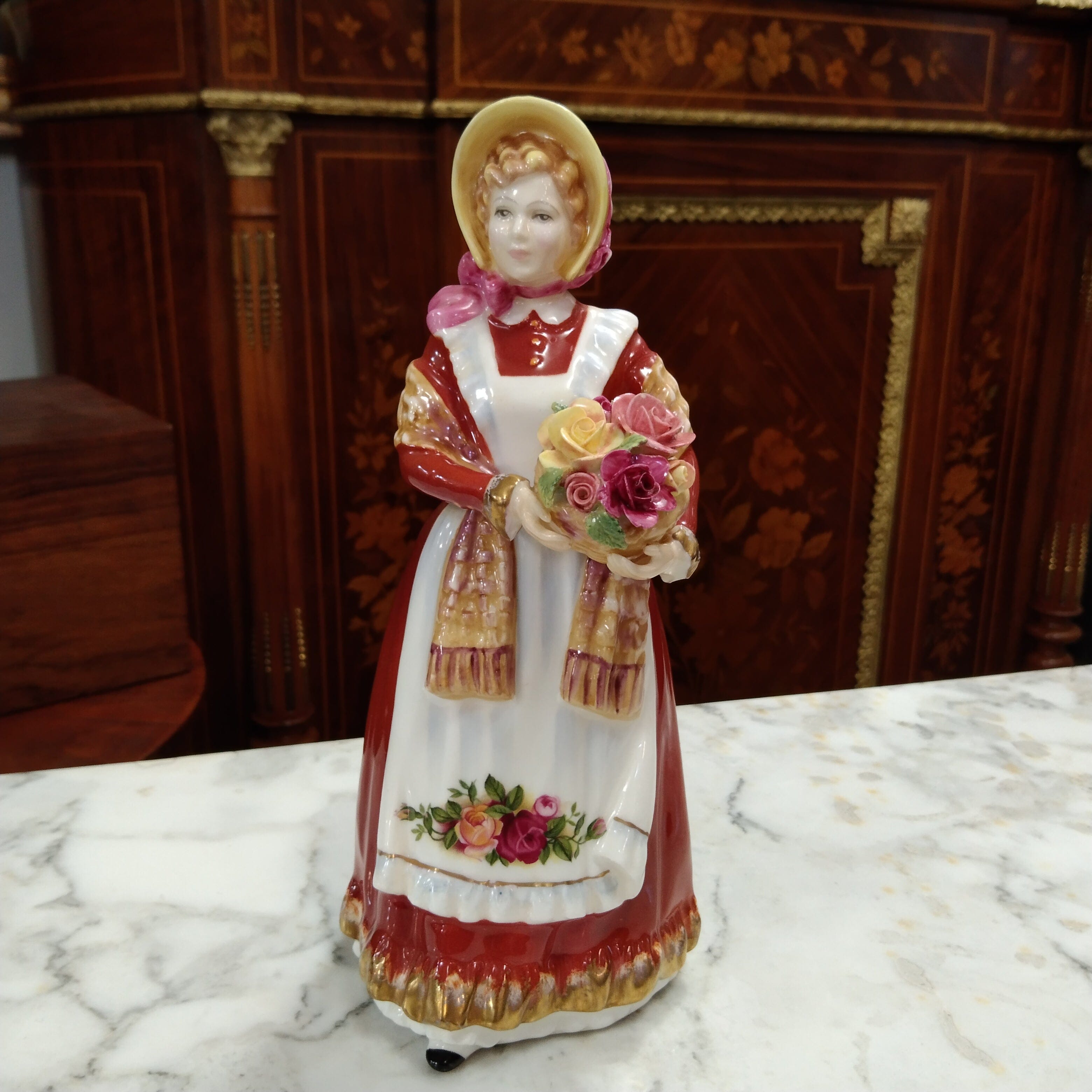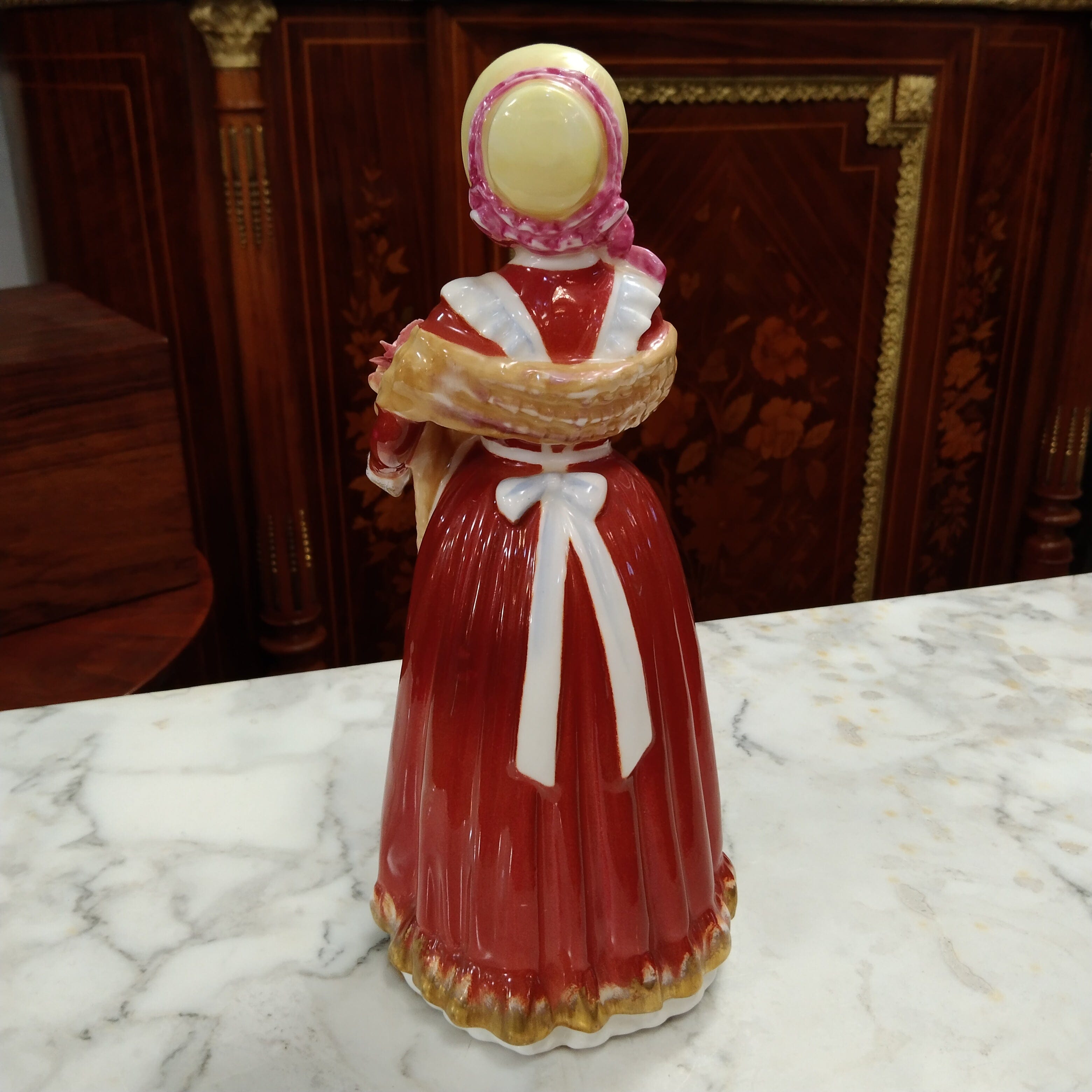 Bella figura de porcelana de la reconocida marca inglesa Royal Doulton, fabricada y pibtada a mano en 1995. La pieza representa a una mujer con un bello vestido rojo y dorado, delantal con flores, un sombrero con un lazo rosado y una canasta con flores en sus manos.