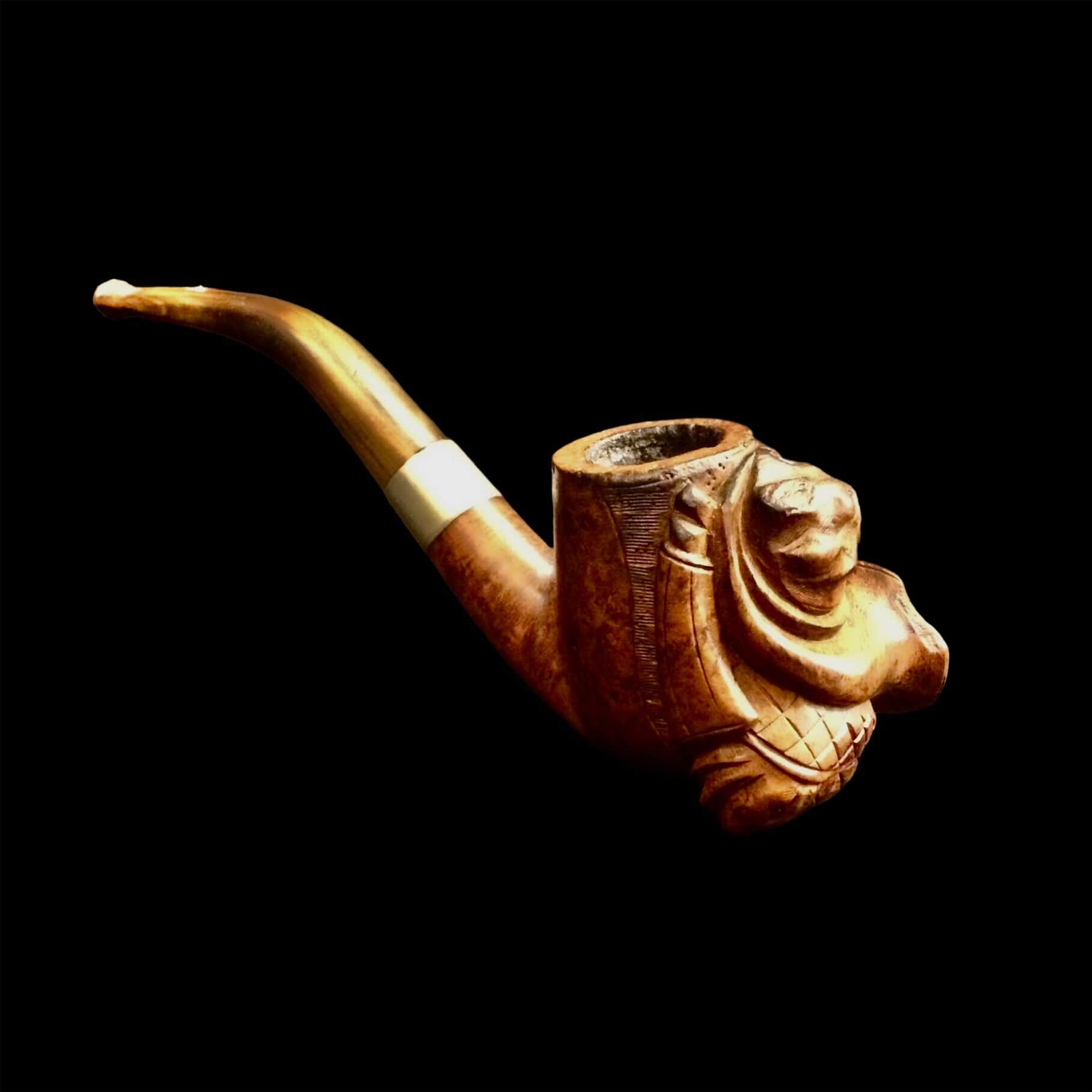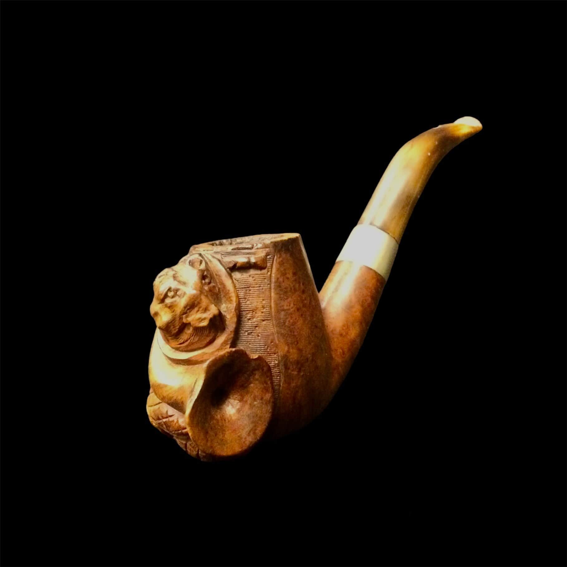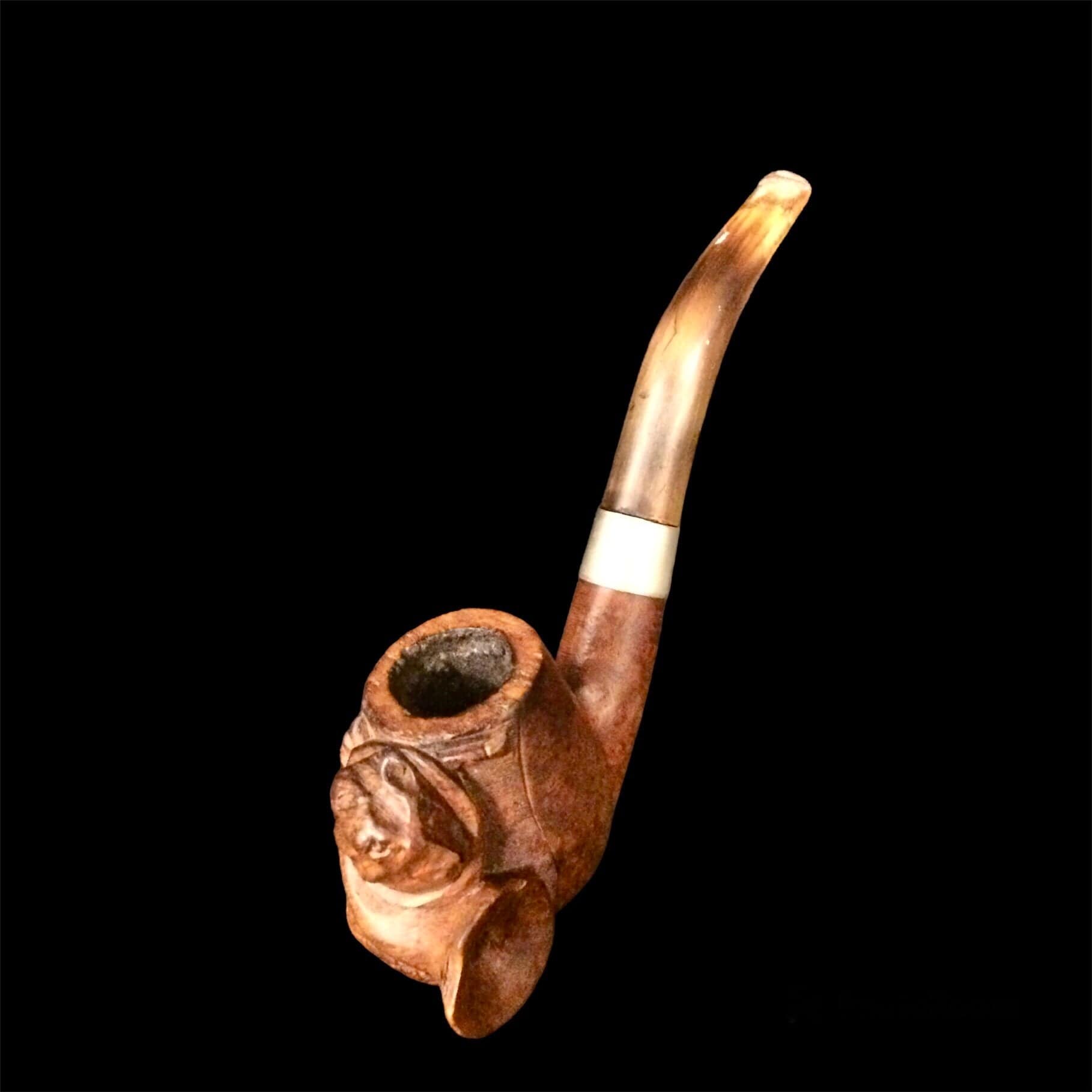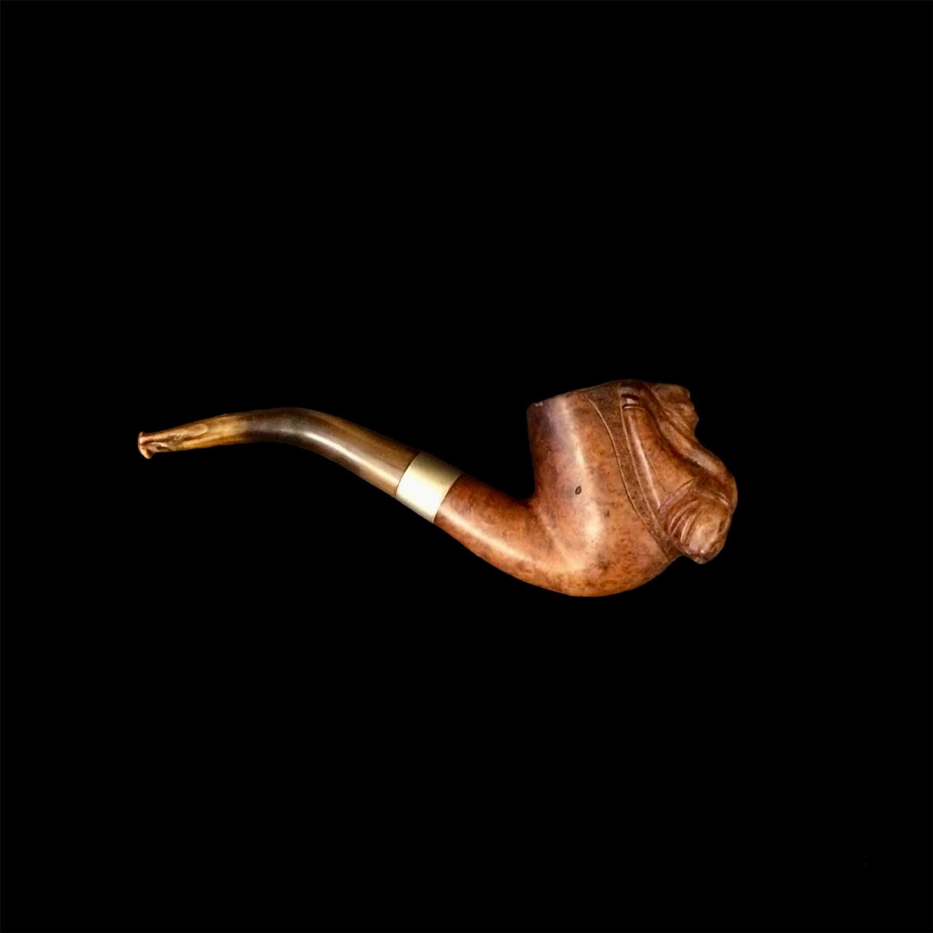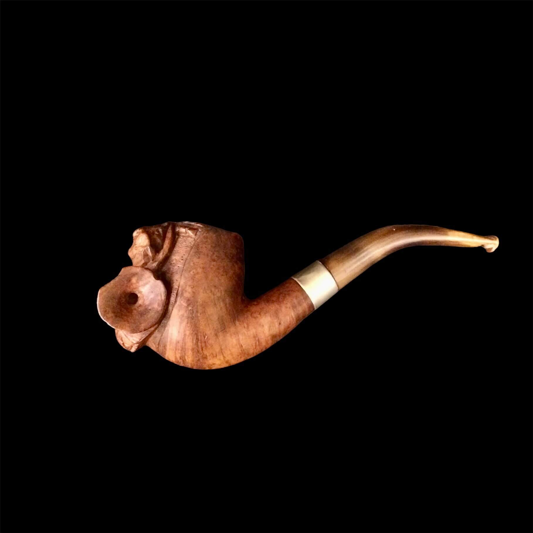 Pipa de madera con instrumento de viento y animales tallados. La boquilla es de cornamenta y la unión entre el cuerpo y la boquilla es de bronce.