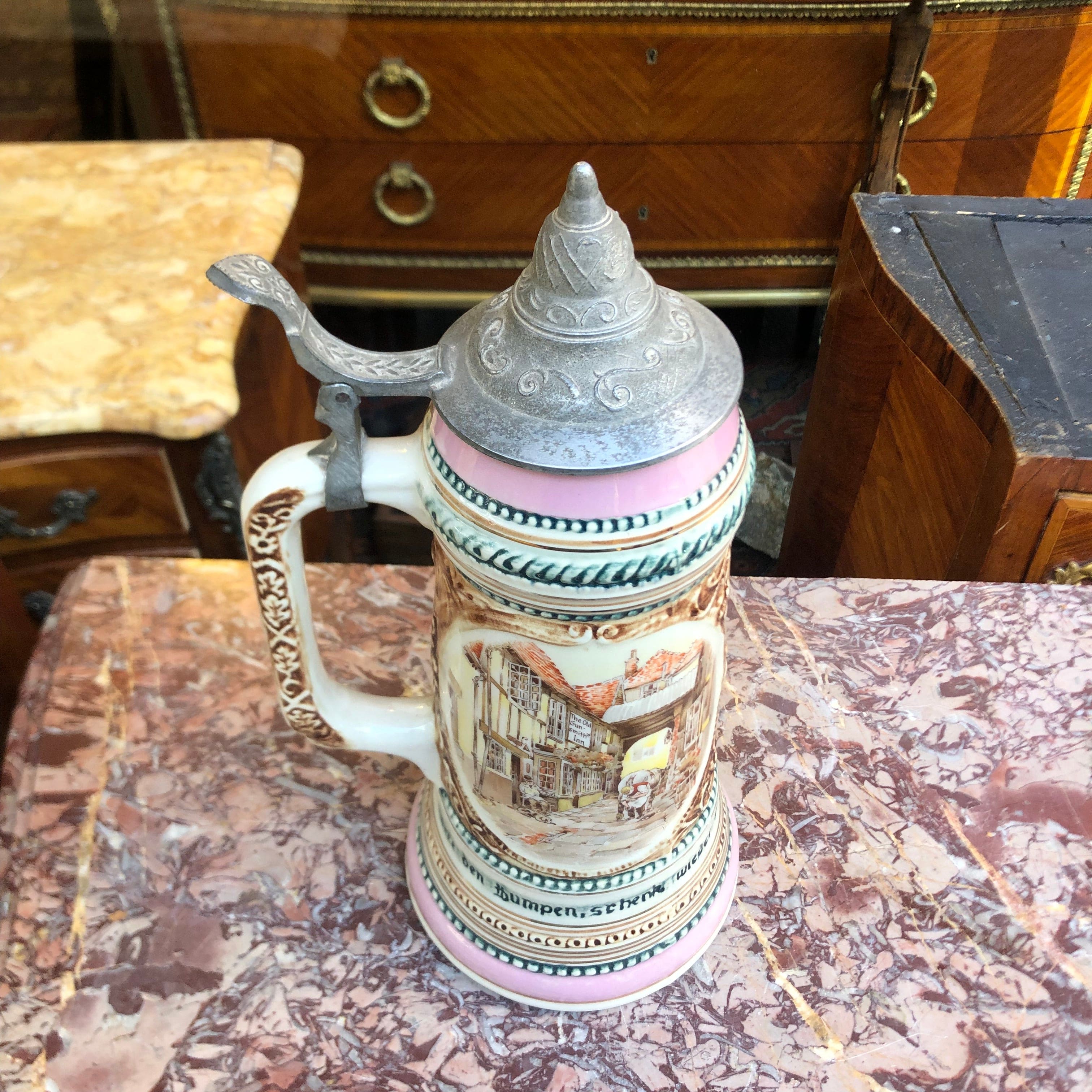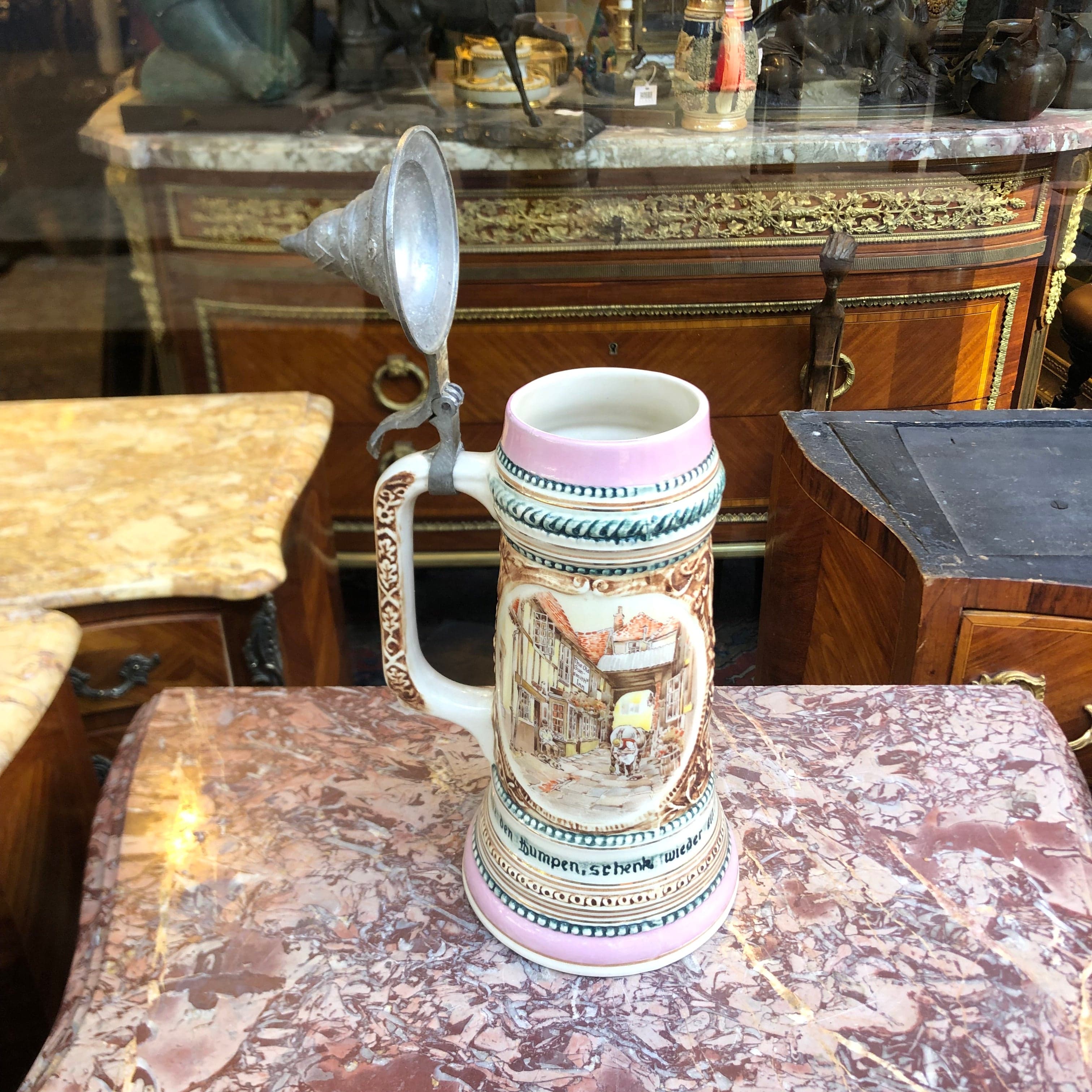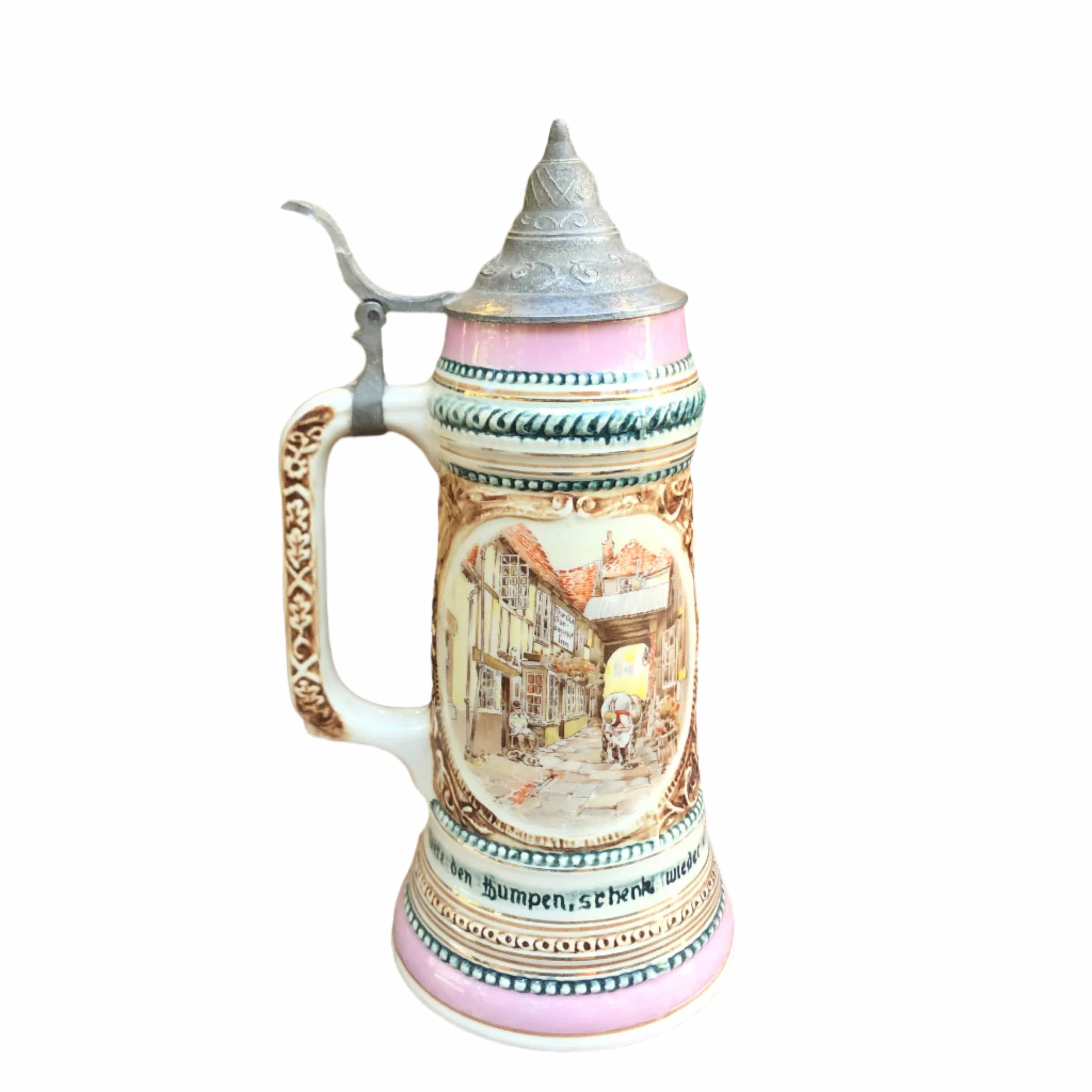 Bello Shopero de gran tamaño de origen Aleman, con tapa de peltre. En su diseño podemos ver unas casas y una pequeña calle de lo que podria ser una calle en alguna localidad alemana.